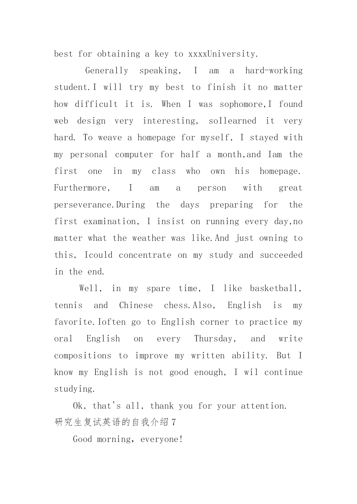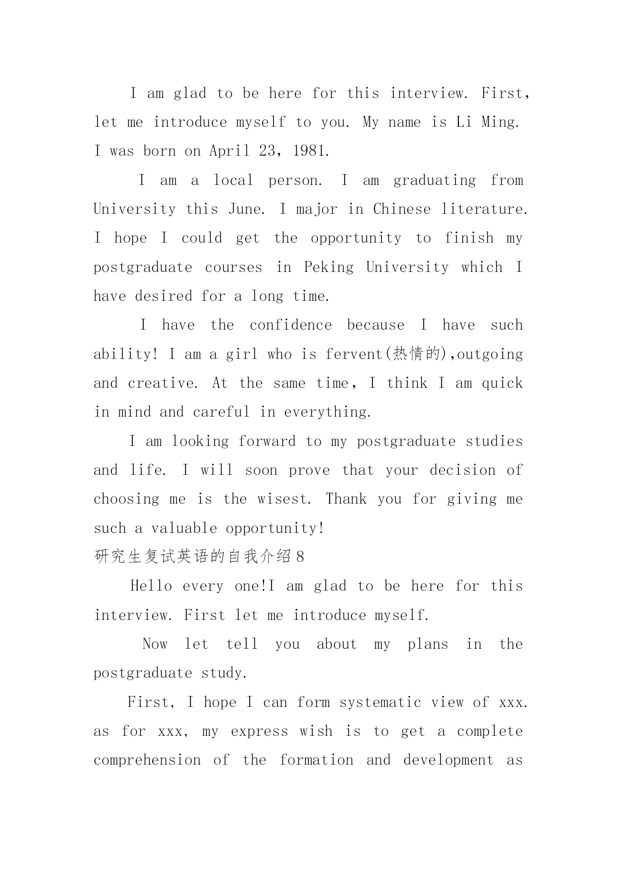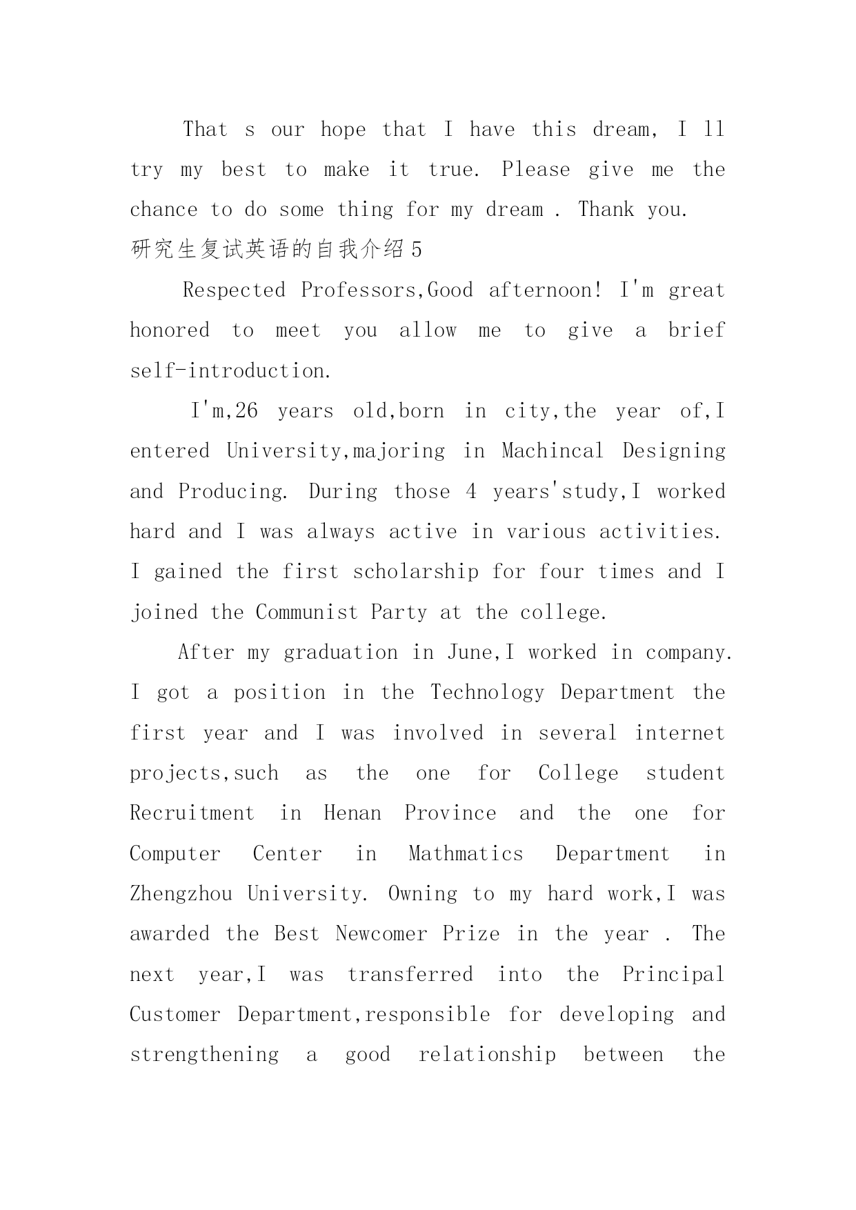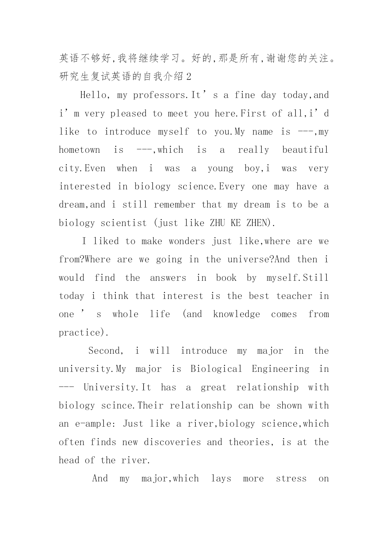 研究生复试英语的自我介绍研究生复试英语的自我介绍当来到的一个陌生的地方时,我们就有可能用到自我介绍,通过自我介绍可以得到他人的认可。那么你真的会写自我介绍吗?下面是小编为大家整理的研究生复试英语的自我介绍,希望能够帮助到大家。研究生复试英语的自我介绍1Goodmorning/afternoon,mydearteachers。Iamverygladtobehereforyourinterview.MynameisamXXXyearsold.IcomefromXXXXXXX,averybeautifulcity.MyundergraduateperiodwillbeaccomplishedinXXXXXXXuniversityinJuly,20xx.Andnow,IamtryingmybestforobtainingakeytoXXXXXXXXUniversity.Generallyspeaking,Iamahard-workingstudent.Iwilltrymybesttofinishitnomatterhowdifficultitis.WhenIwassophomore,Ifoundwebdesignveryinteresting,soIlearneditveryhard.Toweaveahomepageformyself,Istayedwithmypersonalcomputerforhalfamonth,andIamthefirstoneinmyclasswhoownhishomepage.Furthermore,Iamapersonwithgreatperseverance.Duringthedayspreparingforthefirstexamination,Iinsistonrunningeveryday,nomatterwhattheweatherwaslike.Andjustowningtothis,Icouldconcentrateonmystudyandsucceededintheend.Well,inmysparetime,Ilikebasketball,tennisandChinesechess.Also,Englishismyfavorite.IoftengotoEnglishcornertopracticemyoralEnglishoneveryThursday,andwritecompositionstoimprovemywrittenability.ButIknowmyEnglishisnotgoodenough,Iwillcontinuestudying.Ok,that‘sall,thankyouforyourattention.上午好/下午好,我亲爱的老师。我很高兴在这里为你的面试。我的名字叫XXX。我已经年了。我来自XXXX,一个非常美丽的城市。我的本科阶段将完成XXXXXXXuniversity7月,20xx年。现在,我在我最好的获取的关键在大学。一般来说,我是一个刻苦的学生。不管有多难,我都要尽力去完成它。我大二的时候,我发现网页设计很有趣,所以我学到的是非常困难的。为自己编织一个主页,我和我的个人电脑呆了半个月,我是第一个在我的课上他自己的主页。此外,我是一个有毅力的`人。第一天准备考试期间,我坚持每天跑步,不管天气是什么样子。就拥有,我可以专注于我的学习和成功。嗯,在我的业余时间,我喜欢篮球、网球和中国象棋。此外,英语是我的最爱。我经常去英语角练习我的英语口语在每个星期四,和写作文要提高我的书写能力。但我知道我的英语不够好,我将继续学习。好的,那是所有,谢谢您的关注。研究生复试英语的自我介绍2Hello,myprofessors.It’safinedaytoday,andi’mverypleasedtomeetyouhere.Firstofall,i’dliketointroducemyselftoyou.Mynameis---,myhometownis---,whichisareallybeautifulcity.Evenwheniwasayoungboy,iwasveryinterestedinbiologyscience.Everyonemayhaveadream,andistillrememberthatmydreamistobeabiologyscientist(justlikeZHUKEZHEN).Ilikedtomakewondersjustlike,wherearewefrom?Wherearewegoingintheuniverse?Andtheniwouldfindtheanswersinbookbymyself.Stilltodayithinkthat