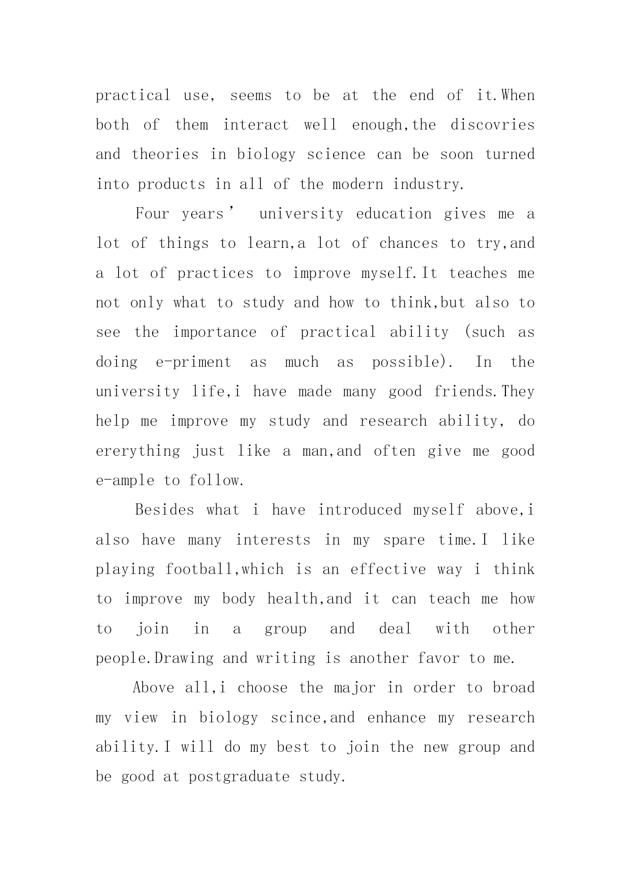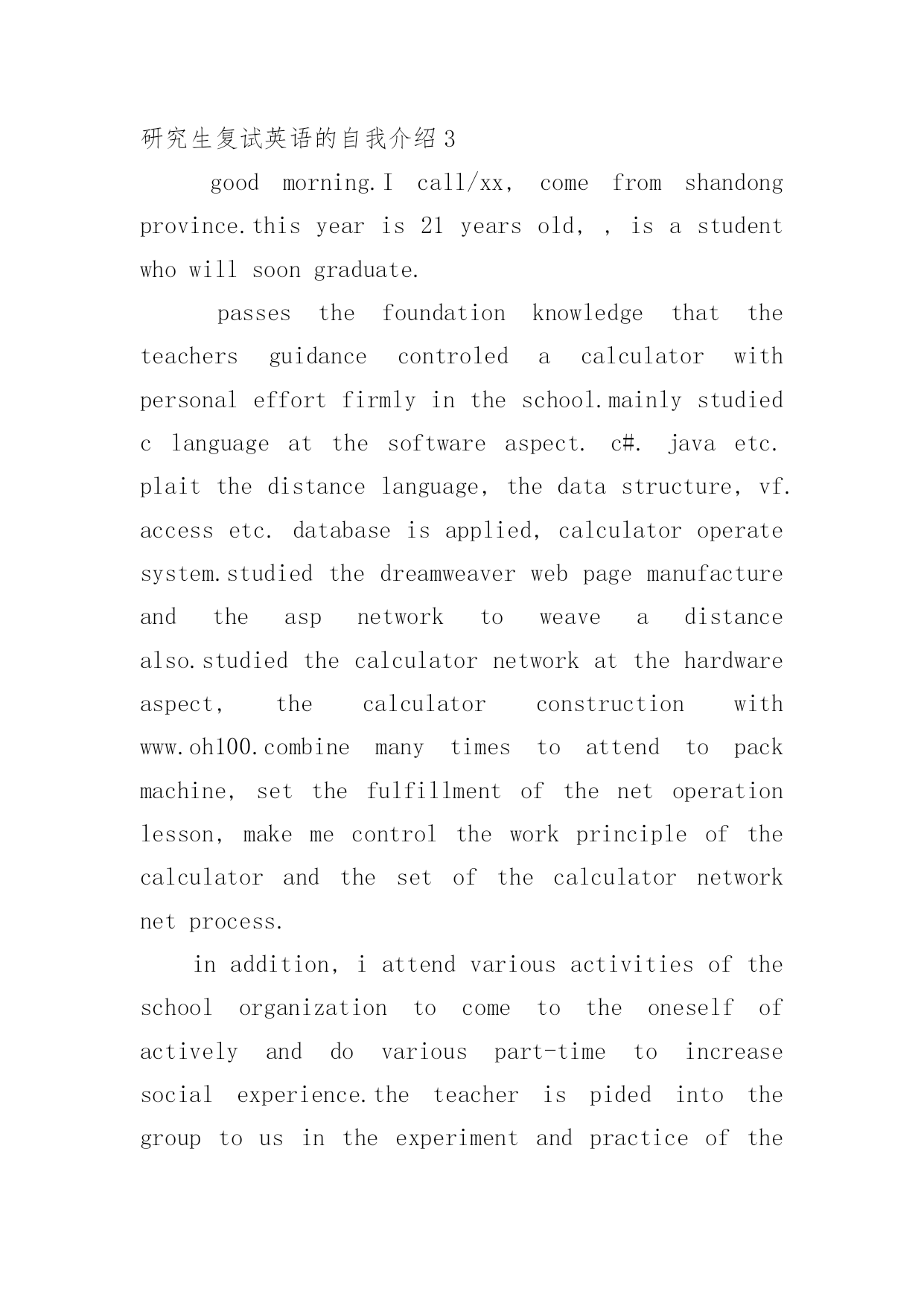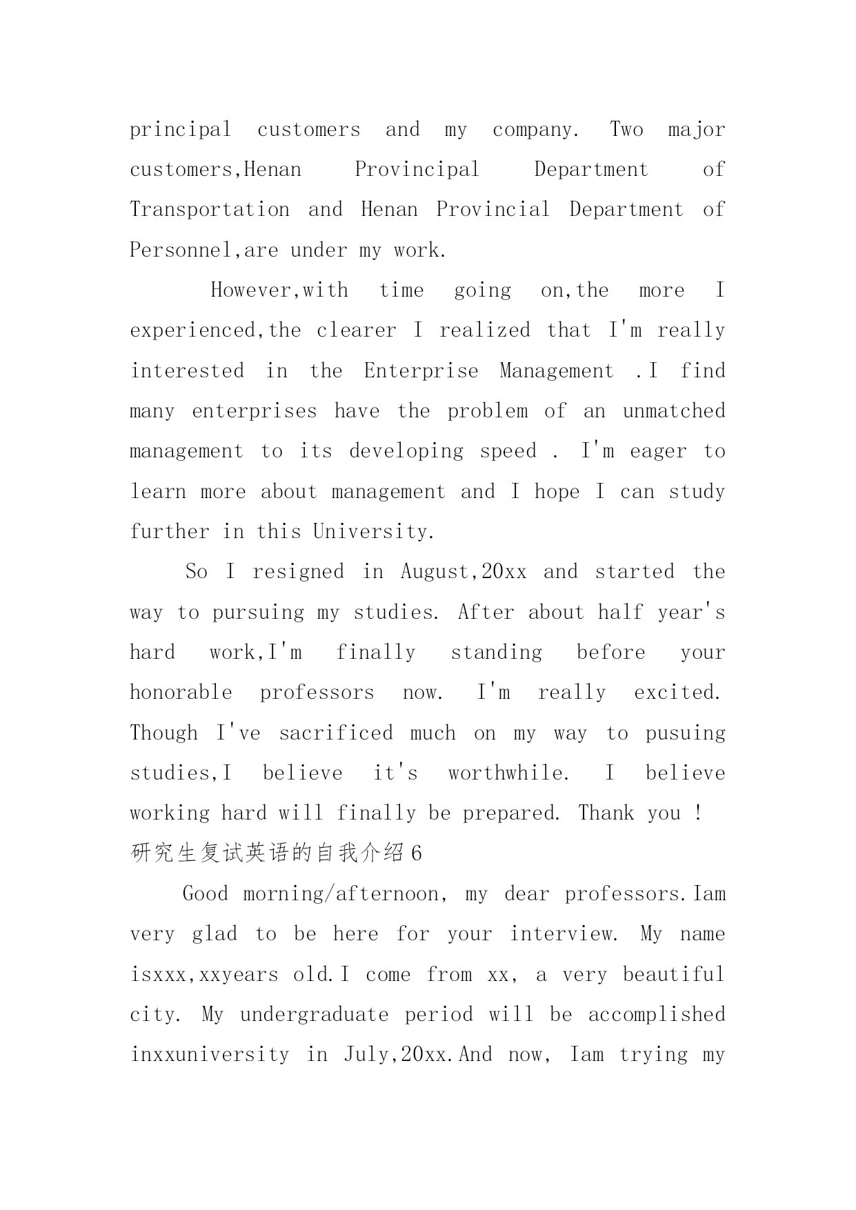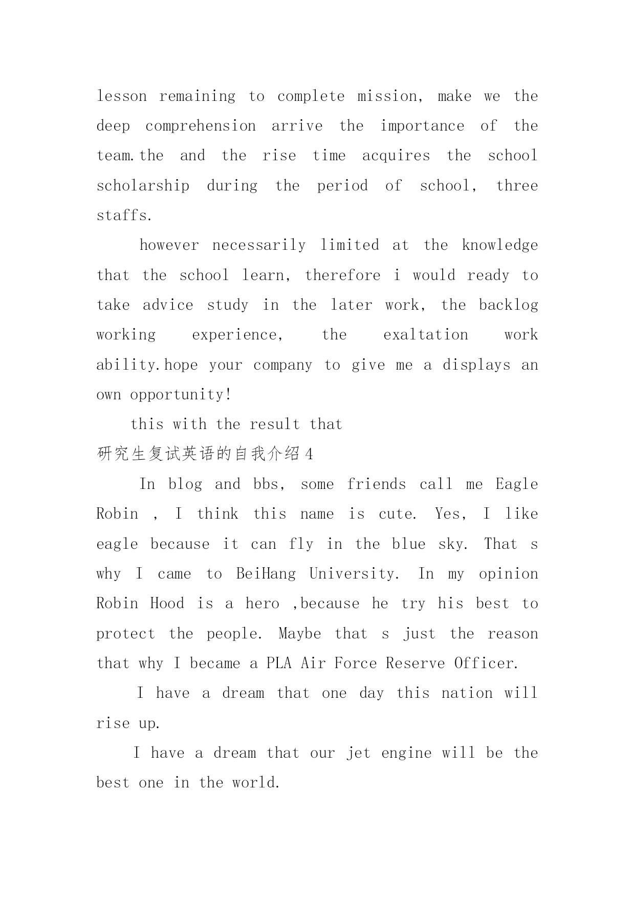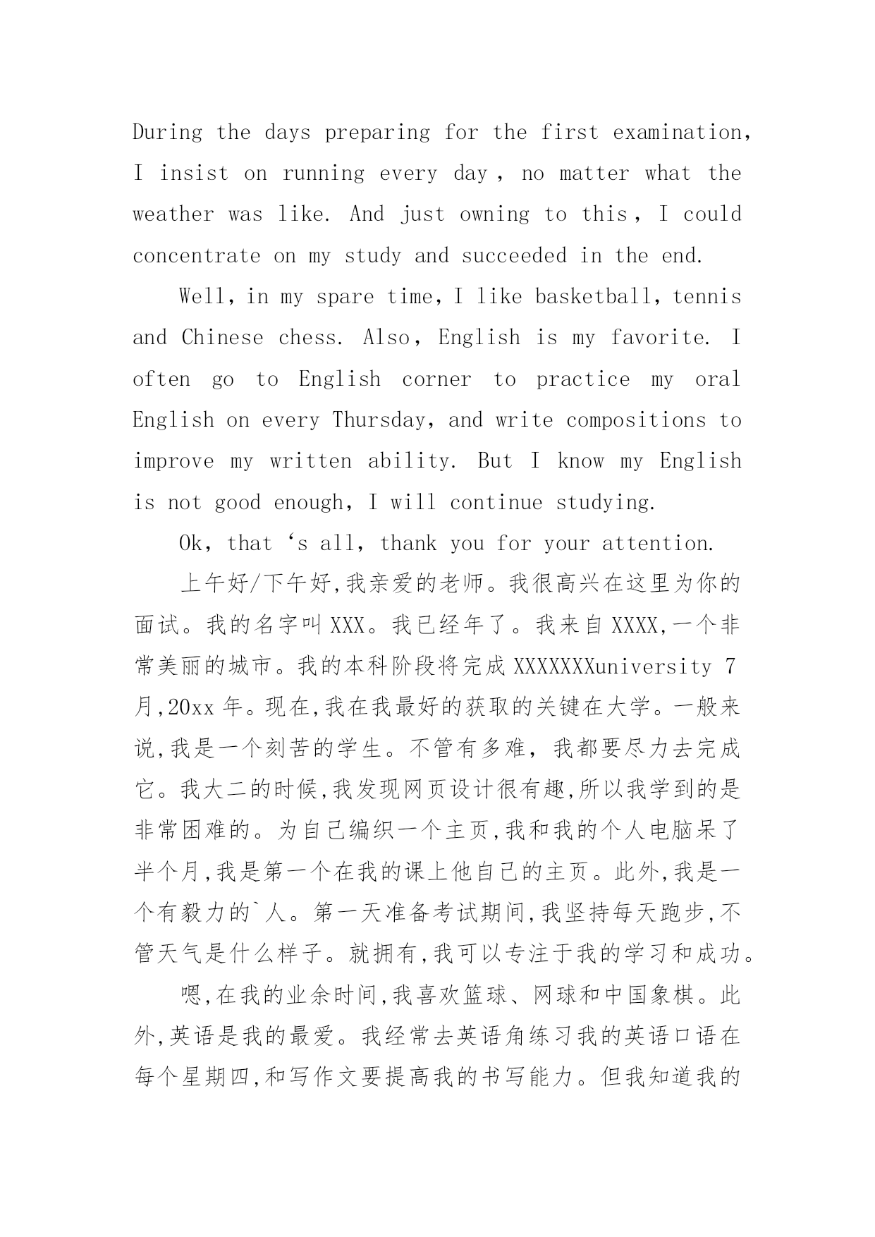 研究生复试英语的自我介绍研究生复试英语的自我介绍当来到的一个陌生的地方时,我们就有可能用到自我介绍,通过自我介绍可以得到他人的认可。那么你真的会写自我介绍吗?下面是小编为大家整理的研究生复试英语的自我介绍,希望能够帮助到大家。研究生复试英语的自我介绍1Goodmorning/afternoon,mydearteachers。Iamverygladtobehereforyourinterview.MynameisamXXXyearsold.IcomefromXXXXXXX,averybeautifulcity.MyundergraduateperiodwillbeaccomplishedinXXXXXXXuniversityinJuly,20xx.Andnow,IamtryingmybestforobtainingakeytoXXXXXXXXUniversity.Generallyspeaking,Iamahard-workingstudent.Iwilltrymybesttofinishitnomatterhowdifficultitis.WhenIwassophomore,Ifoundwebdesignveryinteresting,soIlearneditveryhard.Toweaveahomepageformyself,Istayedwithmypersonalcomputerforhalfamonth,andIamthefirstoneinmyclasswhoownhishomepage.Furthermore,Iamapersonwithgreatperseverance.Duringthedayspreparingforthefirstexamination,Iinsistonrunningeveryday,nomatterwhattheweatherwaslike.Andjustowningtothis,Icouldconcentrateonmystudyandsucceededintheend.Well,inmysparetime,Ilikebasketball,tennisandChinesechess.Also,Englishismyfavorite.IoftengotoEnglishcornertopracticemyoralEnglishoneveryThursday,andwritecompositionstoimprovemywrittenability.ButIknowmyEnglishisnotgoodenough,Iwillcontinuestudying.Ok,that‘sall,thankyouforyourattention.上午好/下午好,我亲爱的老师。我很高兴在这里为你的面试。我的名字叫XXX。我已经年了。我来自XXXX,一个非常美丽的城市。我的本科阶段将完成XXXXXXXuniversity7月,20xx年。现在,我在我最好的获取的关键在大学。一般来说,我是一个刻苦的学生。不管有多难,我都要尽力去完成它。我大二的时候,我发现网页设计很有趣,所以我学到的是非常困难的。为自己编织一个主页,我和我的个人电脑呆了半个月,我是第一个在我的课上他自己的主页。此外,我是一个有毅力的`人。第一天准备考试期间,我坚持每天跑步,不管天气是什么样子。就拥有,我可以专注于我的学习和成功。嗯,在我的业余时间,我喜欢篮球、网球和中国象棋。此外,英语是我的最爱。我经常去英语角练习我的英语口语在每个星期四,和写作文要提高我的书写能力。但我知道我的英语不够好,我将继续学习。好的,那是所有,谢谢您的关注。研究生复试英语的自我介绍2Hello,myprofessors.It’safinedaytoday,andi’mverypleasedtomeetyouhere.Firstofall,i’dliketointroducemyselftoyou.Mynameis---,myhometownis---,whichisareallybeautifulcity.Evenwheniwasayoungboy,iwasveryinterestedinbiologyscience.Everyonemayhaveadream,andistillrememberthatmydreamistobeabiologyscientist(justlikeZHUKEZHEN).Ilikedtomakewondersjustlike,wherearewefrom?Wherearewegoingintheuniverse?Andtheniwouldfindtheanswersinbookbymyself.Stilltodayithinkthat