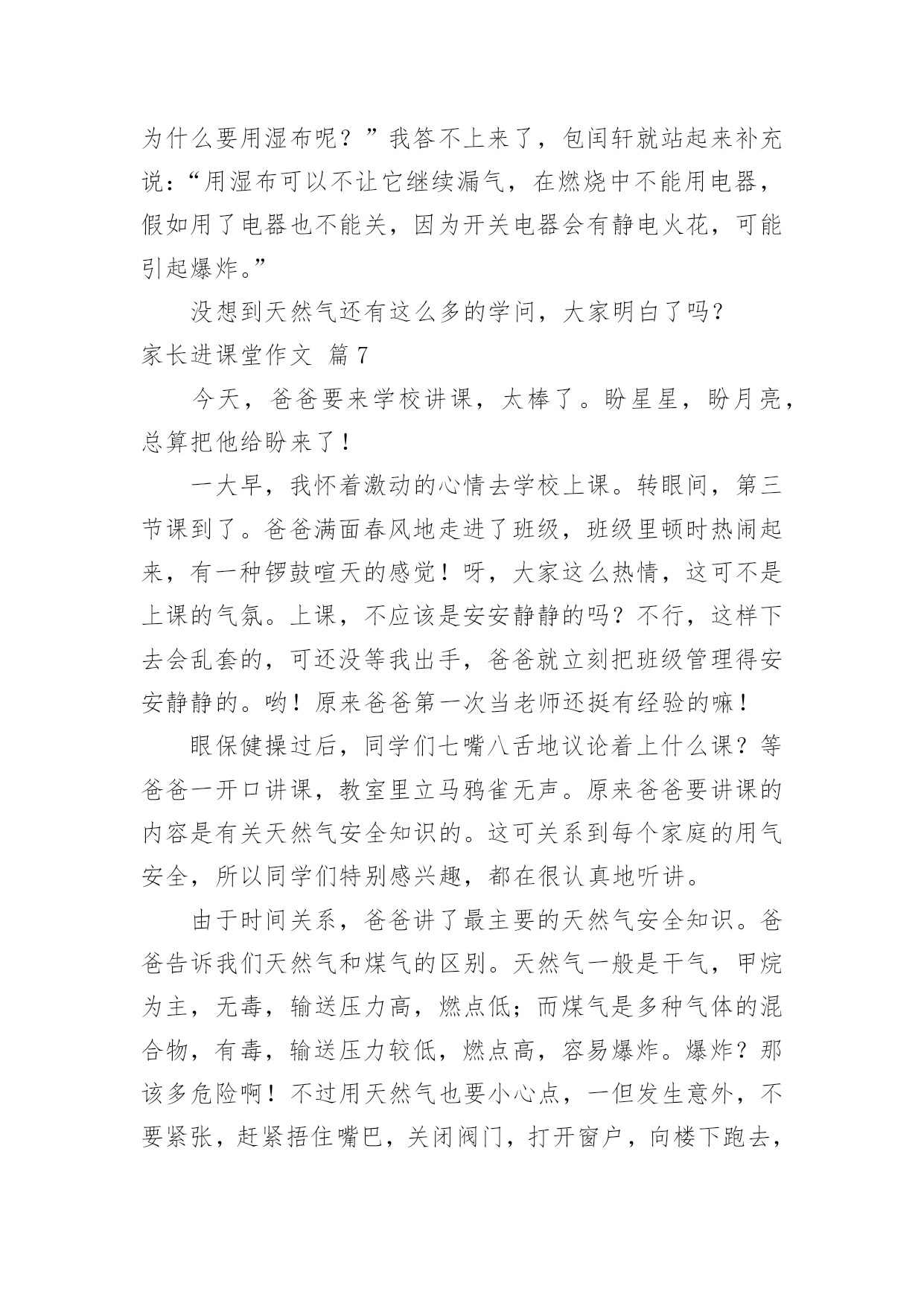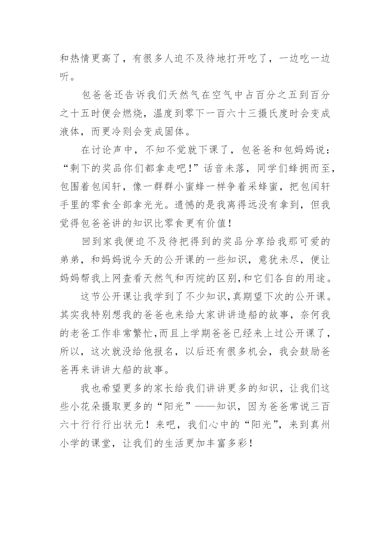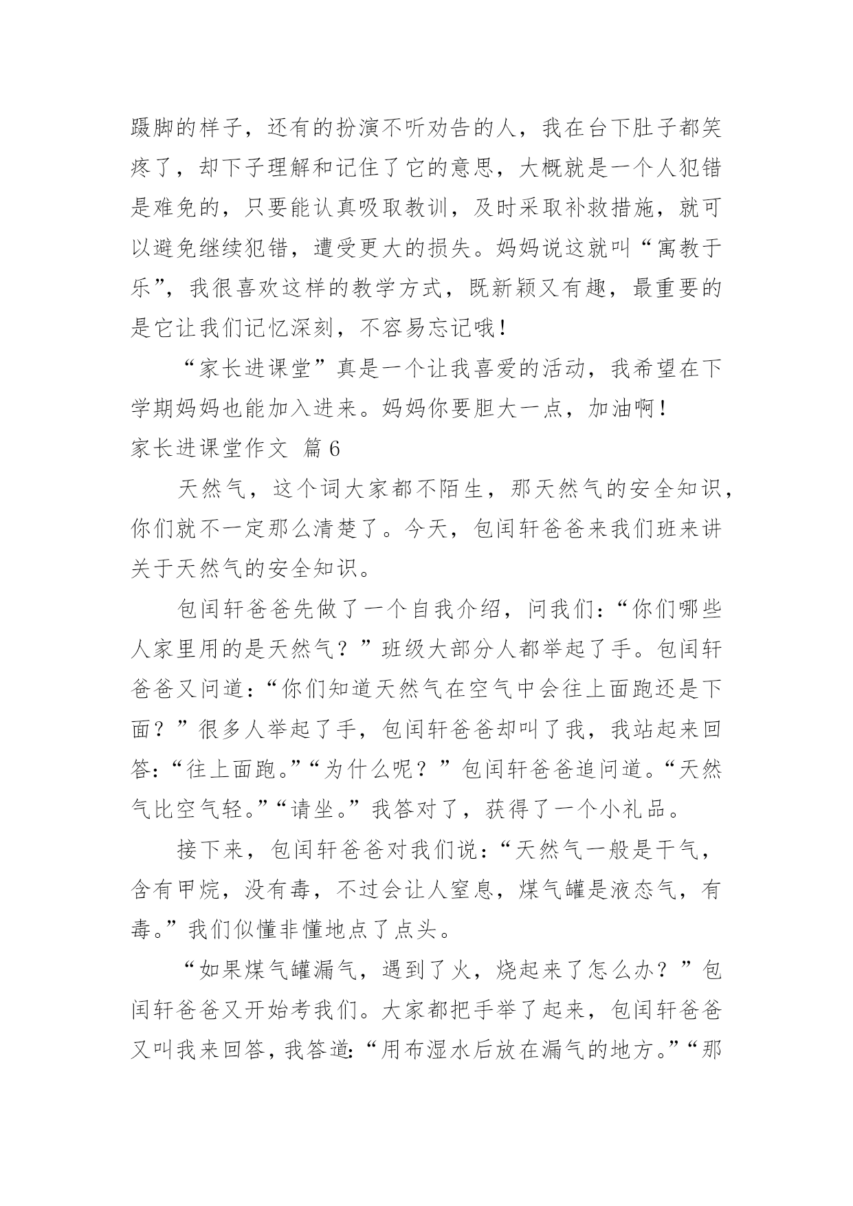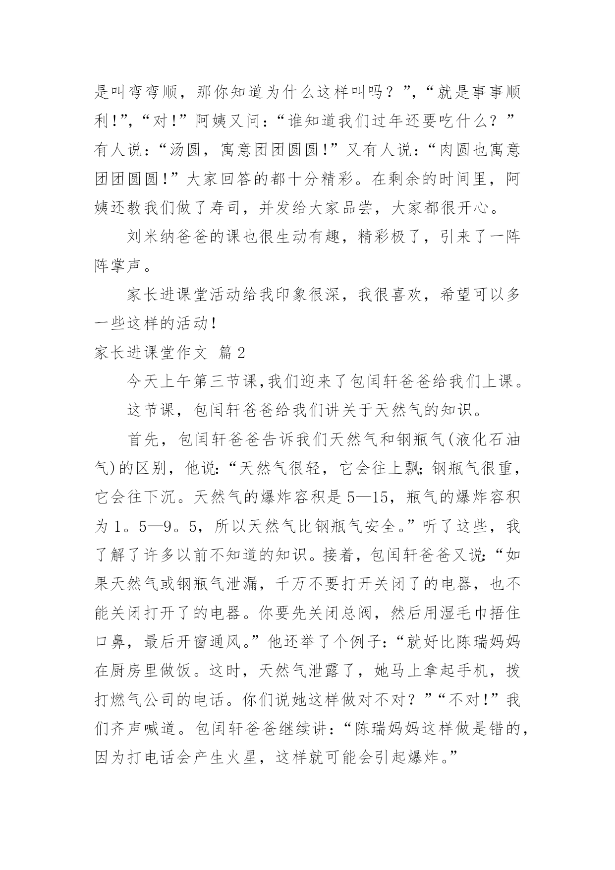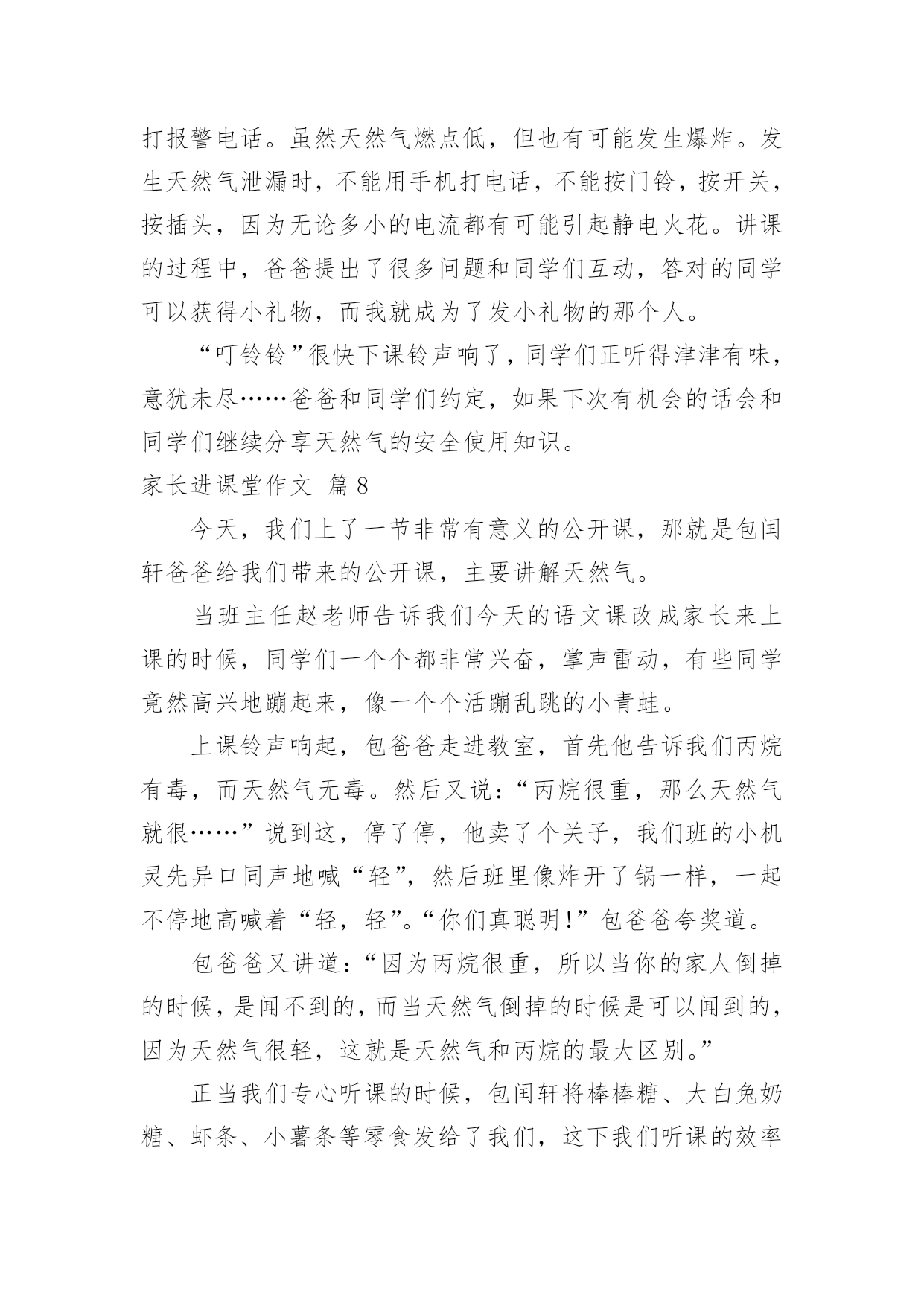 家长进课堂作文家长进课堂作文合集八篇无论在学习、工作或是生活中,许多人都有过写作文的经历,对作文都不陌生吧,作文可分为小学作文、中学作文、大学作文(论文)。你知道作文怎样才能写的好吗?以下是小编整理的家长进课堂作文8篇,希望对大家有所帮助。家长进课堂作文篇1星期五,我们班迎来了两位家长——王妈妈和刘米纳爸爸。同学们都十分兴奋,早早的就画好了精致的黑板画,打扫了教室,坐的端端正正等待家长的到来。不一会儿,王的妈妈来了,她笑盈盈地说:“大家好,我是王妈妈!”。大家立刻鼓掌,并表示欢迎:“阿姨好!”。王妈妈放下手中的盒子,把U盘插到电脑上,打开了她精心准备的PPT。“哇!”同学们发出惊讶的声音,图文并茂的PPT向我们展示了我们中国传统节日。其中,给我印象最深的是阿姨说的中秋节。她是这样说的:“我们小时候,没有卖的月饼吃,月饼都是自己家包的,有芝麻馅的、红豆馅的…..,好几种,外面用面粉做的皮儿,上面还可以做上一朵花,很好看,我们把里面的馅吃了,外面的皮儿都留给父母吃!”,阿姨笑了起来。多么快乐的童年回忆呀!讲着讲着,阿姨突然问:“谁知道我们过年时候吃的饺子有个特别名字,是叫什么?”有人说叫元宝,有人说叫交子,阿姨都摇了摇头。这时袁艺菱站起来说:“弯弯顺!”阿姨点点头:“对,是叫弯弯顺,那你知道为什么这样叫吗?”,“就是事事顺利!”,“对!”阿姨又问:“谁知道我们过年还要吃什么?”有人说:“汤圆,寓意团团圆圆!”又有人说:“肉圆也寓意团团圆圆!”大家回答的都十分精彩。在剩余的时间里,阿姨还教我们做了寿司,并发给大家品尝,大家都很开心。刘米纳爸爸的课也很生动有趣,精彩极了,引来了一阵阵掌声。家长进课堂活动给我印象很深,我很喜欢,希望可以多一些这样的活动!家长进课堂作文篇2今天上午第三节课,我们迎来了包闰轩爸爸给我们上课。这节课,包闰轩爸爸给我们讲关于天然气的知识。首先,包闰轩爸爸告诉我们天然气和钢瓶气(液化石油气)的区别,他说:“天然气很轻,它会往上飘;钢瓶气很重,它会往下沉。天然气的爆炸容积是5—15,瓶气的爆炸容积为1。5—9。5,所以天然气比钢瓶气安全。”听了这些,我了解了许多以前不知道的知识。接着,包闰轩爸爸又说:“如果天然气或钢瓶气泄漏,千万不要打开关闭了的电器,也不能关闭打开了的电器。你要先关闭总阀,然后用湿毛巾捂住口鼻,最后开窗通风。”他还举了个例子:“就好比陈瑞妈妈在厨房里做饭。这时,天然气泄露了,她马上拿起手机,拨打燃气公司的电话。你们说她这样做对不对?”“不对!”我们齐声喊道。包闰轩爸爸继续讲:“陈瑞妈妈这样做是错的,因为打电话会产生火星,这样就可能会引起爆炸。”最后,包闰轩爸爸说:"如果张琳心奶奶在家煮粥,她自己去菜场买菜了。这时,粥从锅里流了出来,扑灭了火。如果是安全灶具的话,它会怎么样?”“自动熄火!”我抢着说道。包闰轩爸爸说:“对了,所以我们在买灶具时要选择安全灶具。”通过这节课的学习,我明白了很多关于天然气的知识,学到了天然气和钢瓶气的区别,还知道天然气或钢瓶气泄漏了该如何处理,也知道了买灶具时要选择绿色灶具等。这节课的收获真大啊!家长进课堂作文篇3我们的学校在每周四都会开展家长进课堂活动,这周四终于轮到了我的爸爸妈妈进课堂了!爸爸妈妈为了这难得的进课堂与同学们共同学习的机会,早在一周前就已经把资料准备好了。今天下午四年三十分的时候,我的爸爸妈妈来到了学校。开始讲课前爸爸妈妈先做了自我介绍,还把给我们准备的小奖品也摆在了讲台上,鼓励大家要积极回答问题。开始讲课了,妈妈上了讲台,爸爸在讲台下维护课堂秩序。妈妈今天讲课的主题是“智能手机的利弊”。首先妈妈准备了一个谜语让大家猜,大家很快就猜出了谜底,各个儿都争先恐后的回答,第一个猜出答案的是贾正阳,他拿到礼品后得意的回到座位,同学们都对他投去了羡慕的眼光。课堂气氛一下就活跃起来了,大家都积极投入到和妈妈的.课堂互动中,认真听讲,争先恐后地回答问题。妈妈给我们讲了过度使用手机的危害,也给我们讲了怎样合理使用手机的知识,从中我们认识到了手机对我们生活的影响无处不在。尤其对我们青少年来说,过度使用手机除了会影响视力,手机辐射还可能影响我们的大脑发育,严重的会诱发脑瘤,所以我们一定要合理利用手机,而不能沉溺其中。这堂课同学们都听得非常认真,课堂气氛非常活跃,中间爸爸还给我们讲了专业且深奥的网络知识,让同学们学到了从未接触过的知识,我感觉我的爸爸好厉害。时间过得真快,一转眼这一堂有趣又深奥的课就结束了,最后妈妈告诉我们“世界很美,诱惑很多。学会克制,学会舍弃”。希望我们都能自觉抵制手机的诱惑,早日成才,前程美好。!家长进课堂作文篇4本周地方课程的讲课者是嘉雯的爸爸胡老师。嘉雯的爸爸是一名普通的职工,为了准备今天的课确实也费了不少功夫。胡爸爸讲课的内容是《安全用电》。在