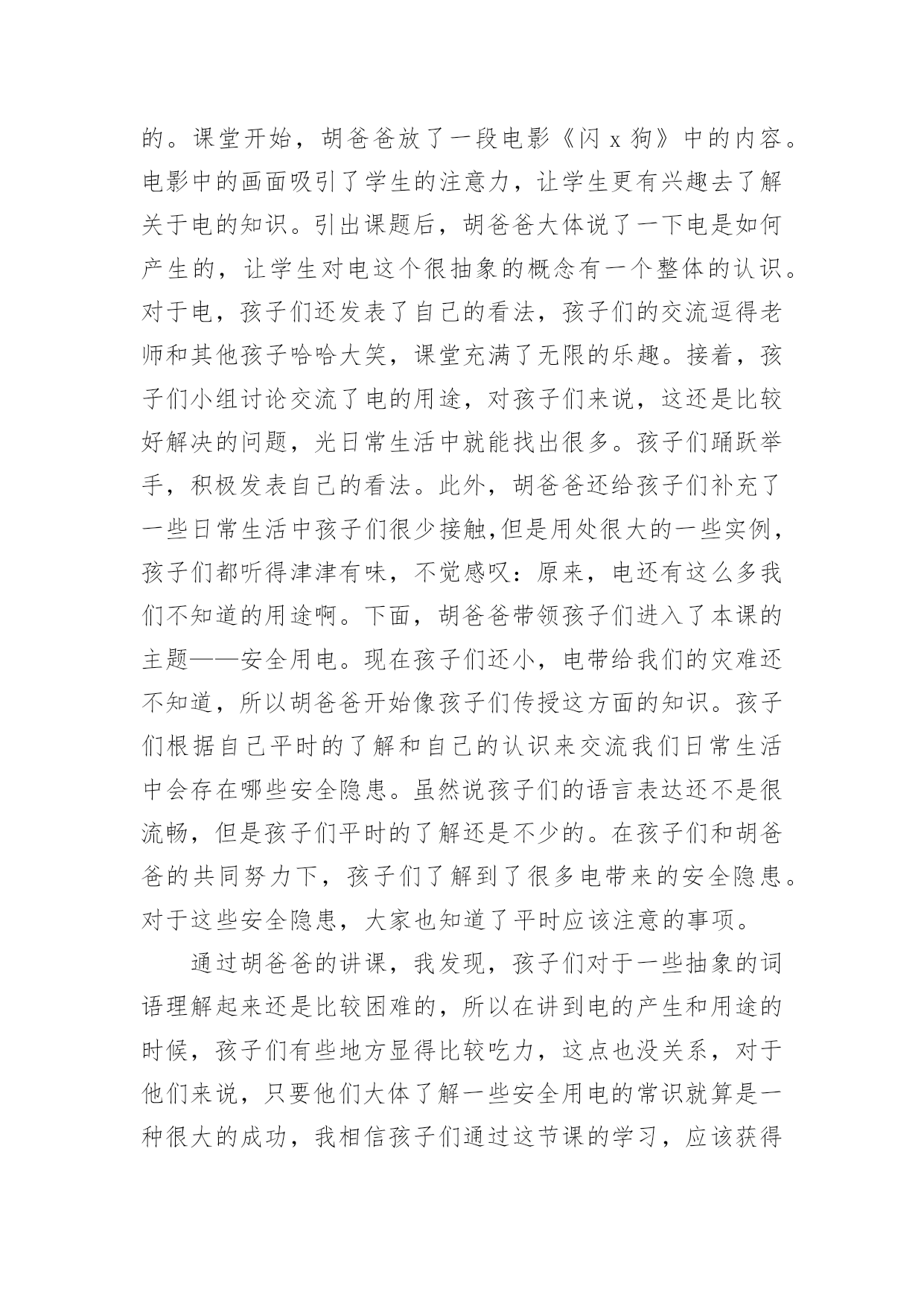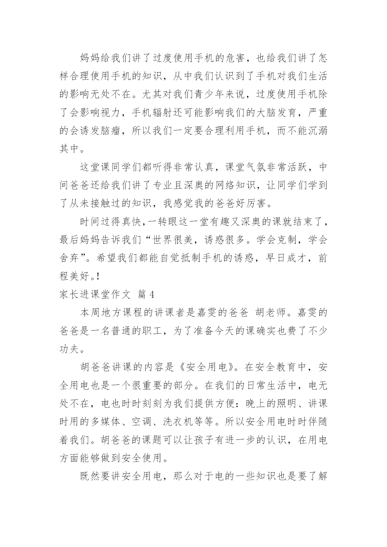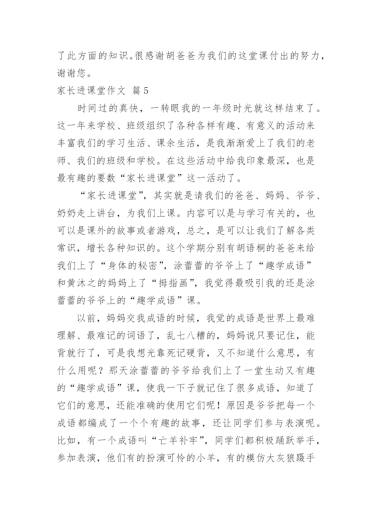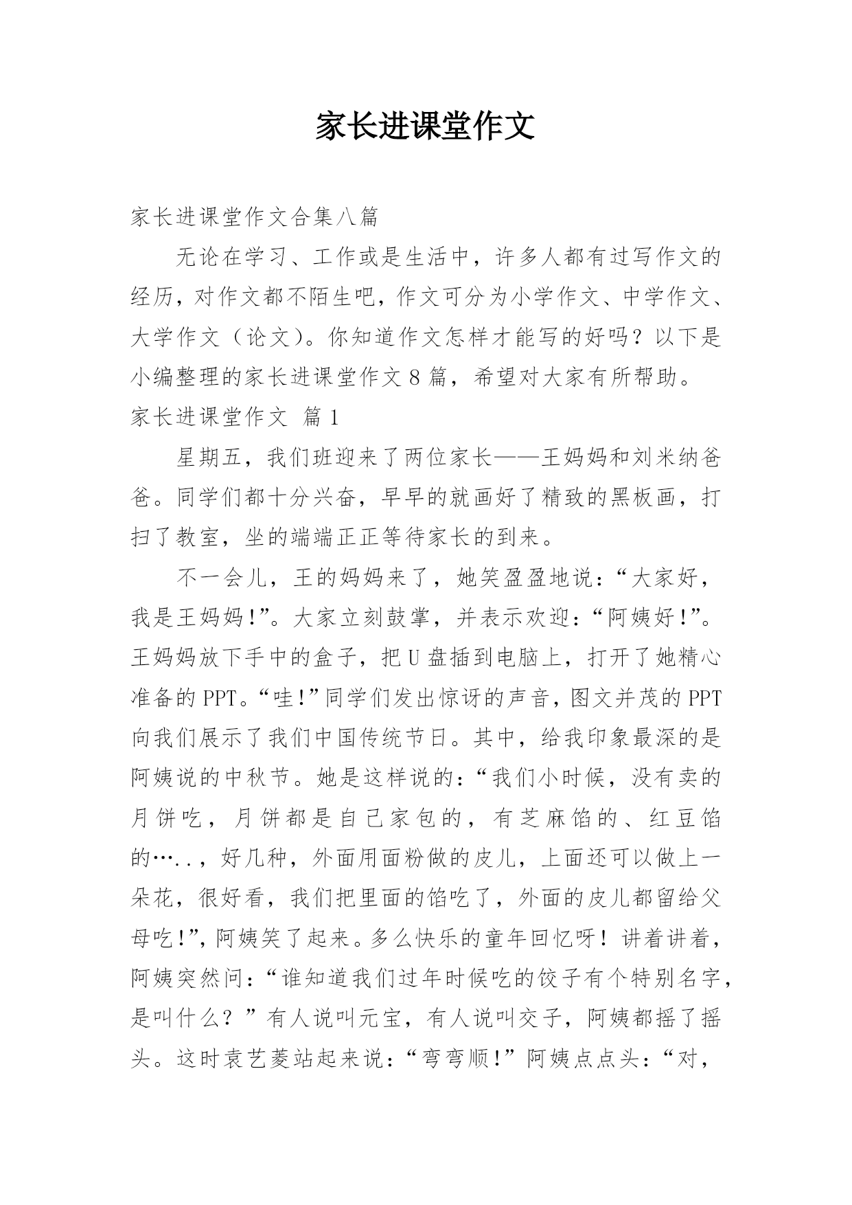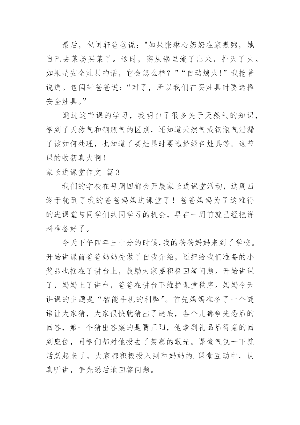 家长进课堂作文家长进课堂作文合集八篇无论在学习、工作或是生活中,许多人都有过写作文的经历,对作文都不陌生吧,作文可分为小学作文、中学作文、大学作文(论文)。你知道作文怎样才能写的好吗?以下是小编整理的家长进课堂作文8篇,希望对大家有所帮助。家长进课堂作文篇1星期五,我们班迎来了两位家长——王妈妈和刘米纳爸爸。同学们都十分兴奋,早早的就画好了精致的黑板画,打扫了教室,坐的端端正正等待家长的到来。不一会儿,王的妈妈来了,她笑盈盈地说:“大家好,我是王妈妈!”。大家立刻鼓掌,并表示欢迎:“阿姨好!”。王妈妈放下手中的盒子,把U盘插到电脑上,打开了她精心准备的PPT。“哇!”同学们发出惊讶的声音,图文并茂的PPT向我们展示了我们中国传统节日。其中,给我印象最深的是阿姨说的中秋节。她是这样说的:“我们小时候,没有卖的月饼吃,月饼都是自己家包的,有芝麻馅的、红豆馅的…..,好几种,外面用面粉做的皮儿,上面还可以做上一朵花,很好看,我们把里面的馅吃了,外面的皮儿都留给父母吃!”,阿姨笑了起来。多么快乐的童年回忆呀!讲着讲着,阿姨突然问:“谁知道我们过年时候吃的饺子有个特别名字,是叫什么?”有人说叫元宝,有人说叫交子,阿姨都摇了摇头。这时袁艺菱站起来说:“弯弯顺!”阿姨点点头:“对,是叫弯弯顺,那你知道为什么这样叫吗?”,“就是事事顺利!”,“对!”阿姨又问:“谁知道我们过年还要吃什么?”有人说:“汤圆,寓意团团圆圆!”又有人说:“肉圆也寓意团团圆圆!”大家回答的都十分精彩。在剩余的时间里,阿姨还教我们做了寿司,并发给大家品尝,大家都很开心。刘米纳爸爸的课也很生动有趣,精彩极了,引来了一阵阵掌声。家长进课堂活动给我印象很深,我很喜欢,希望可以多一些这样的活动!家长进课堂作文篇2今天上午第三节课,我们迎来了包闰轩爸爸给我们上课。这节课,包闰轩爸爸给我们讲关于天然气的知识。首先,包闰轩爸爸告诉我们天然气和钢瓶气(液化石油气)的区别,他说:“天然气很轻,它会往上飘;钢瓶气很重,它会往下沉。天然气的爆炸容积是5—15,瓶气的爆炸容积为1。5—9。5,所以天然气比钢瓶气安全。”听了这些,我了解了许多以前不知道的知识。接着,包闰轩爸爸又说:“如果天然气或钢瓶气泄漏,千万不要打开关闭了的电器,也不能关闭打开了的电器。你要先关闭总阀,然后用湿毛巾捂住口鼻,最后开窗通风。”他还举了个例子:“就好比陈瑞妈妈在厨房里做饭。这时,天然气泄露了,她马上拿起手机,拨打燃气公司的电话。你们说她这样做对不对?”“不对!”我们齐声喊道。包闰轩爸爸继续讲:“陈瑞妈妈这样做是错的,因为打电话会产生火星,这样就可能会引起爆炸。”最后,包闰轩爸爸说:"如果张琳心奶奶在家煮粥,她自己去菜场买菜了。这时,粥从锅里流了出来,扑灭了火。如果是安全灶具的话,它会怎么样?”“自动熄火!”我抢着说道。包闰轩爸爸说:“对了,所以我们在买灶具时要选择安全灶具。”通过这节课的学习,我明白了很多关于天然气的知识,学到了天然气和钢瓶气的区别,还知道天然气或钢瓶气泄漏了该如何处理,也知道了买灶具时要选择绿色灶具等。这节课的收获真大啊!家长进课堂作文篇3我们的学校在每周四都会开展家长进课堂活动,这周四终于轮到了我的爸爸妈妈进课堂了!爸爸妈妈为了这难得的进课堂与同学们共同学习的机会,早在一周前就已经把资料准备好了。今天下午四年三十分的时候,我的爸爸妈妈来到了学校。开始讲课前爸爸妈妈先做了自我介绍,还把给我们准备的小奖品也摆在了讲台上,鼓励大家要积极回答问题。开始讲课了,妈妈上了讲台,爸爸在讲台下维护课堂秩序。妈妈今天讲课的主题是“智能手机的利弊”。首先妈妈准备了一个谜语让大家猜,大家很快就猜出了谜底,各个儿都争先恐后的回答,第一个猜出答案的是贾正阳,他拿到礼品后得意的回到座位,同学们都对他投去了羡慕的眼光。课堂气氛一下就活跃起来了,大家都积极投入到和妈妈的.课堂互动中,认真听讲,争先恐后地回答问题。妈妈给我们讲了过度使用手机的危害,也给我们讲了怎样合理使用手机的知识,从中我们认识到了手机对我们生活的影响无处不在。尤其对我们青少年来说,过度使用手机除了会影响视力,手机辐射还可能影响我们的大脑发育,严重的会诱发脑瘤,所以我们一定要合理利用手机,而不能沉溺其中。这堂课同学们都听得非常认真,课堂气氛非常活跃,中间爸爸还给我们讲了专业且深奥的网络知识,让同学们学到了从未接触过的知识,我感觉我的爸爸好厉害。时间过得真快,一转眼这一堂有趣又深奥的课就结束了,最后妈妈告诉我们“世界很美,诱惑很多。学会克制,学会舍弃”。希望我们都能自觉抵制手机的诱惑,早日成才,前程美好。!家长进课堂作文篇4本周地方课程的讲课者是嘉雯的爸爸胡老师。嘉雯的爸爸是一名普通的职工,为了准备今天的课确实也费了不少功夫。胡爸爸讲课的内容是《安全用电》。在