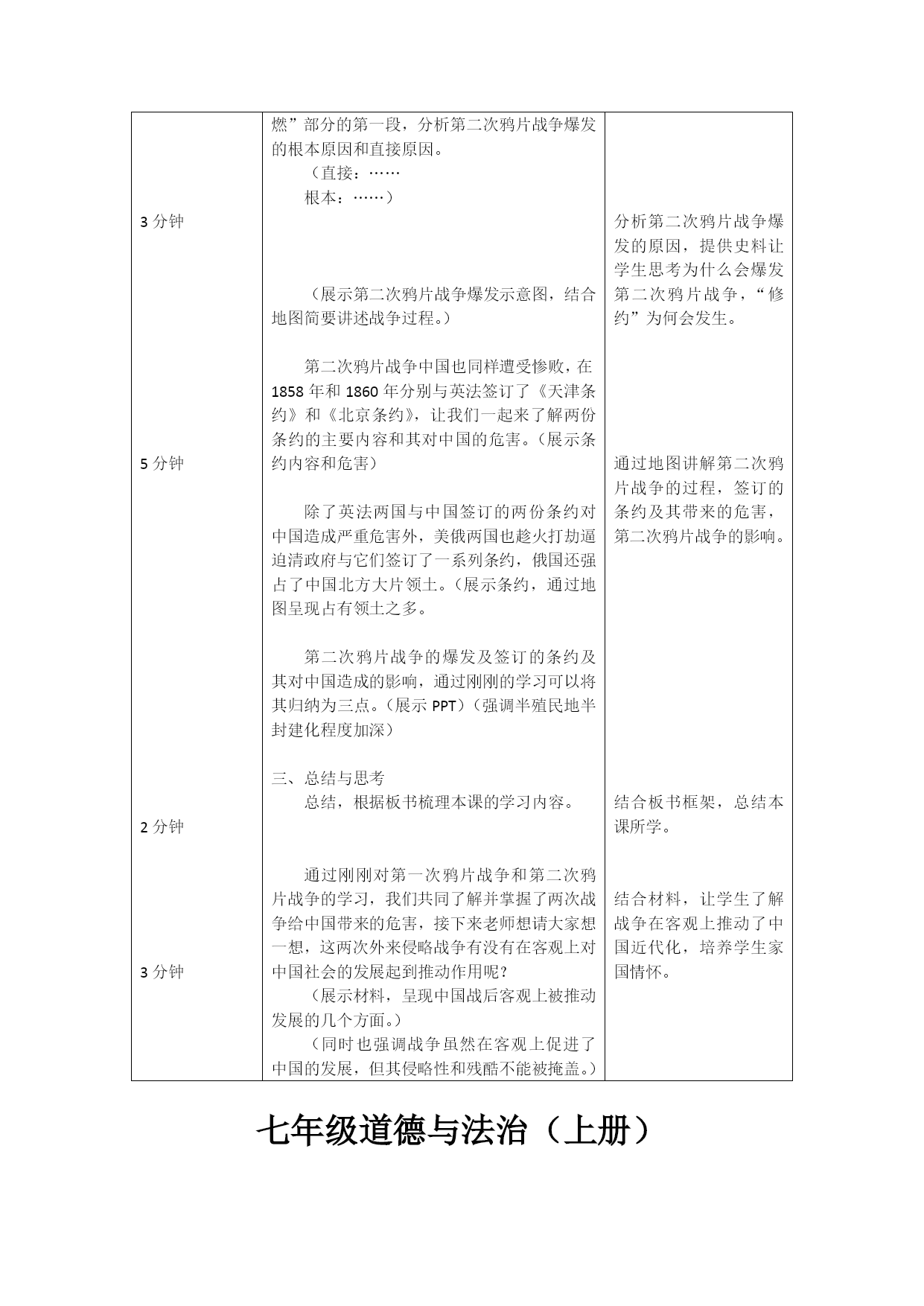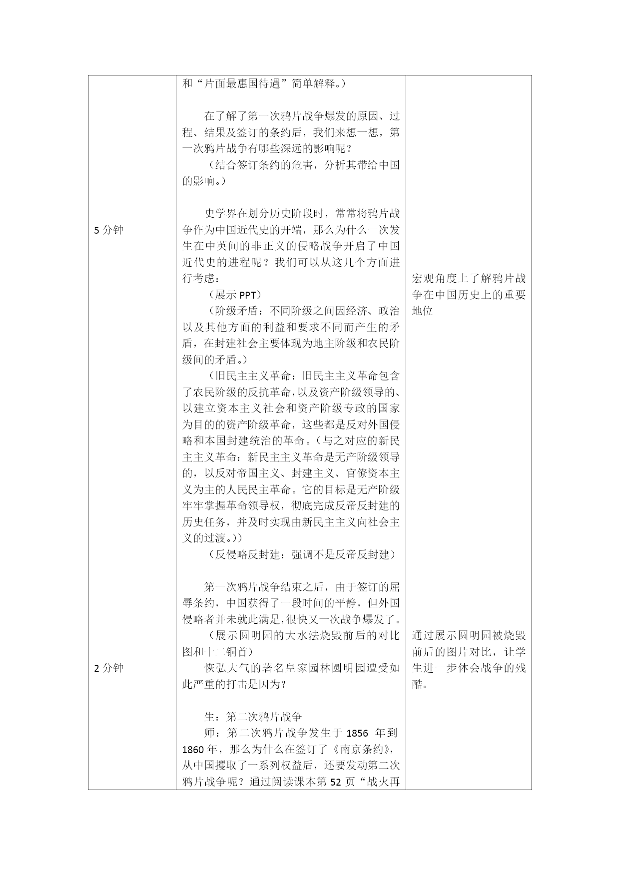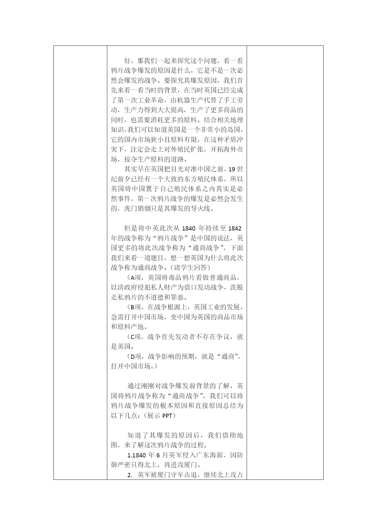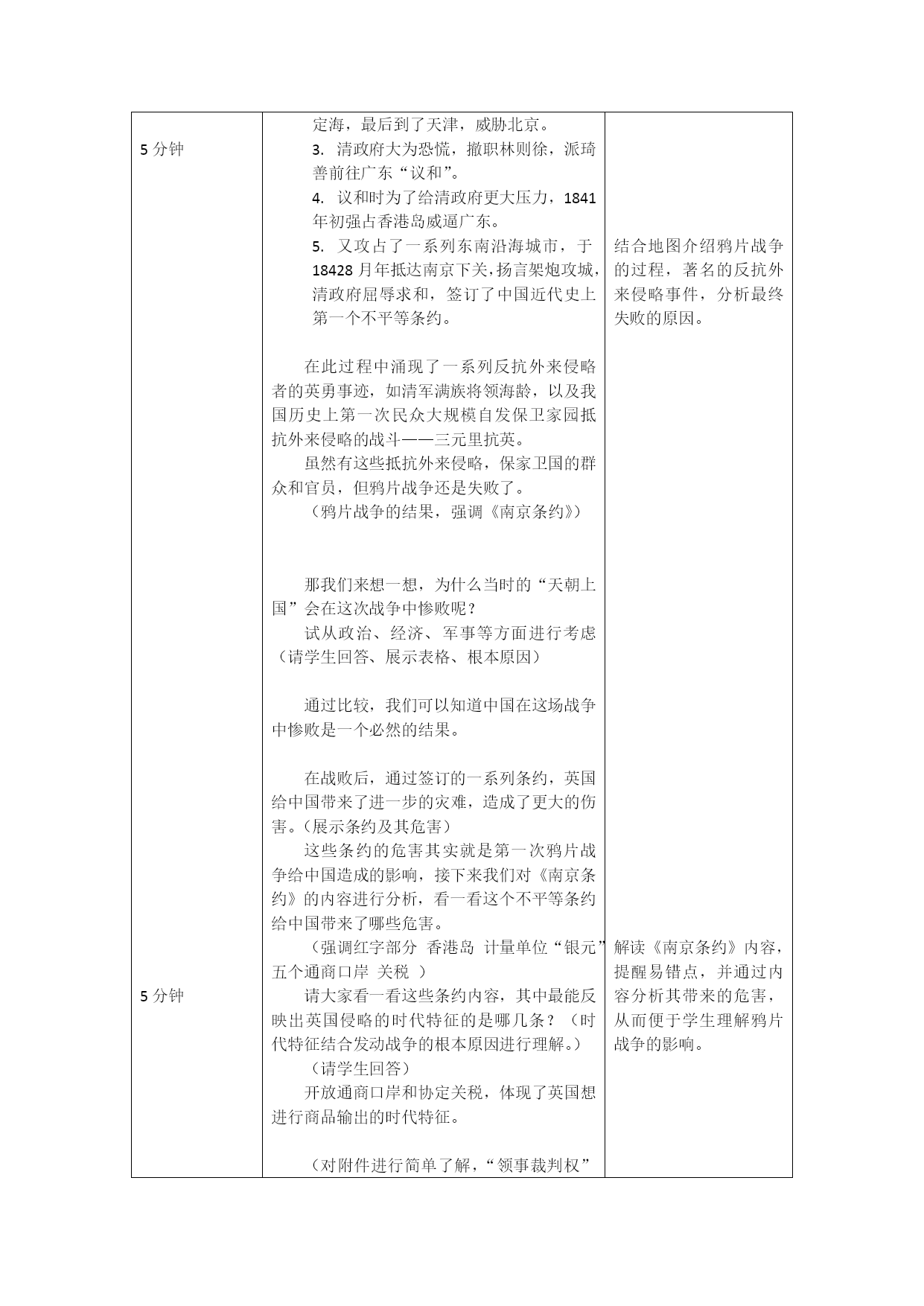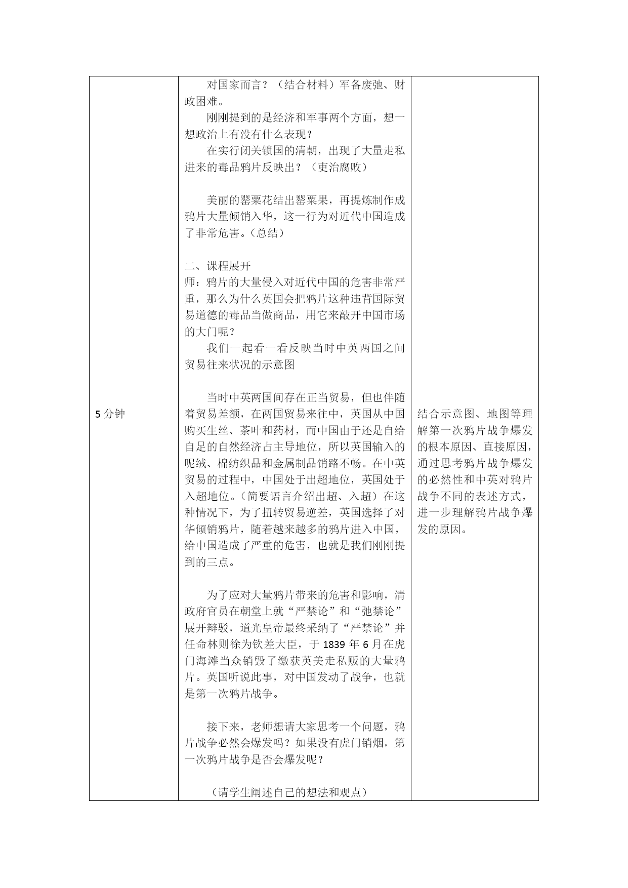 《鸦片战争》教学设计课程题目《鸦片战争》教学目的了解鸦片战争的历史背景,两次鸦片战争的爆发,《南京条约》《北京条约》《天津条约》的内容,掌握两次鸦片战争的影响。学会分析一个事件发生的原因及其各方面的影响。掌握两次鸦片战争期间中国人民反抗斗争的事迹,体会中华民族不屈不挠的斗争精神,培养家国情怀。教学重难点重:两次鸦片战争的背景、原因难:两次鸦片战争的影响及主要条约课程类型与课程模式、方法新授课讲授法、分析法、讨论法教学用具与媒体多媒体课件教学过程与时间分配教学设计与教学内容教学设计意图2分钟3分钟5分钟5分钟5分钟5分钟2分钟3分钟5分钟2分钟3分钟一、导入师:同学们好,今天让我们把目光从前几节课所学的西方政治制度转移到中国国内,来看一看十九世纪中后期近代中国反侵略和求民主的潮流。想一想,西方确立了先进的资本主义制度与中国在二十世纪中后期所遭受的一系列侵略是否有关联。那么这一节课就让我们带着这个问题,从鸦片战争入手,一起了解近代中国遭遇的侵略战争与当时来自百姓、官员和军人们是如何抗击侵略的。说到鸦片战争,通过初中的学习,已经有了一定的基础知识,我们知道鸦片战争包含了第一次鸦片战争和第二次鸦片战争,那么提到第一次鸦片战争,大家首先会想到什么?生:林则徐虎门销烟师:1839年林则徐虎门销烟,销毁了大量从英国走私而来的鸦片,接下来老师给大家出示几组材料,通过阅读这些材料,想一想它们反映出鸦片的大量侵入给中国带来了哪些危害?(展示图片,简单介绍)师:根据以上的材料,鸦片的危害有哪些呢?我们可以从对个人和对国家两个方面来进行思考。(学生回答)师:嗯,对个人而言?(损害身心健康)对国家而言?(结合材料)军备废弛、财政困难。刚刚提到的是经济和军事两个方面,想一想政治上有没有什么表现?在实行闭关锁国的清朝,出现了大量走私进来的毒品鸦片反映出?(吏治腐败)美丽的罂粟花结出罂粟果,再提炼制作成鸦片大量倾销入华,这一行为对近代中国造成了非常危害。(总结)二、课程展开师:鸦片的大量侵入对近代中国的危害非常严重,那么为什么英国会把鸦片这种违背国际贸易道德的毒品当做商品,用它来敲开中国市场的大门呢?我们一起看一看反映当时中英两国之间贸易往来状况的示意图当时中英两国间存在正当贸易,但也伴随着贸易差额,在两国贸易来往中,英国从中国购买生丝、茶叶和药材,而中国由于还是自给自足的自然经济占主导地位,所以英国输入的呢绒、棉纺织品和金属制品销路不畅。在中英贸易的过程中,中国处于出超地位,英国处于入超地位。(简要语言介绍出超、入超)在这种情况下,为了扭转贸易逆差,英国选择了对华倾销鸦片,随着越来越多的鸦片进入中国,给中国造成了严重的危害,也就是我们刚刚提到的三点。为了应对大量鸦片带来的危害和影响,清政府官员在朝堂上就“严禁论”和“弛禁论”展开辩驳,道光皇帝最终采纳了“严禁论”并任命林则徐为钦差大臣,于1839年6月在虎门海滩当众销毁了缴获英美走私贩的大量鸦片。英国听说此事,对中国发动了战争,也就是第一次鸦片战争。接下来,老师想请大家思考一个问题,鸦片战争必然会爆发吗?如果没有虎门销烟,第一次鸦片战争是否会爆发呢?(请学生阐述自己的想法和观点)好,那我们一起来探究这个问题,看一看鸦片战争爆发的原因是什么,它是不是一次必然会爆发的战争。要探究其爆发原因,我们首先来看一看当时的背景,在当时英国已经完成了第一次工业革命,由机器生产代替了手工劳动,生产力得到大大提高,生产了更多商品的同时,也需要消耗更多的原料。结合相关地理知识,我们可以知道英国是一个非常小的岛国,它的国内市场狭小且原料有限,在这种矛盾冲突下,注定会走上对外殖民扩张,开拓海外市场,掠夺生产原料的道路。其实早在英国把目光对准中国之前,19世纪前夕已经有一个大致的东方殖民体系,所以英国将中国置于自己殖民体系之内其实是必然事件,第一次鸦片战争的爆发是必然会发生的,虎门销烟只是其爆发的导火线。但是将中英此次从1840年持续至1842年的战争称为“鸦片战争”是中国的说法,英国更多的将此次战争称为“通商战争”,下面我们来看一道题目,想一想英国为什么将此次战争称为通商战争