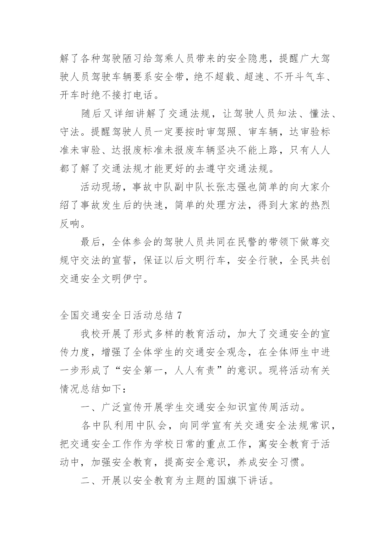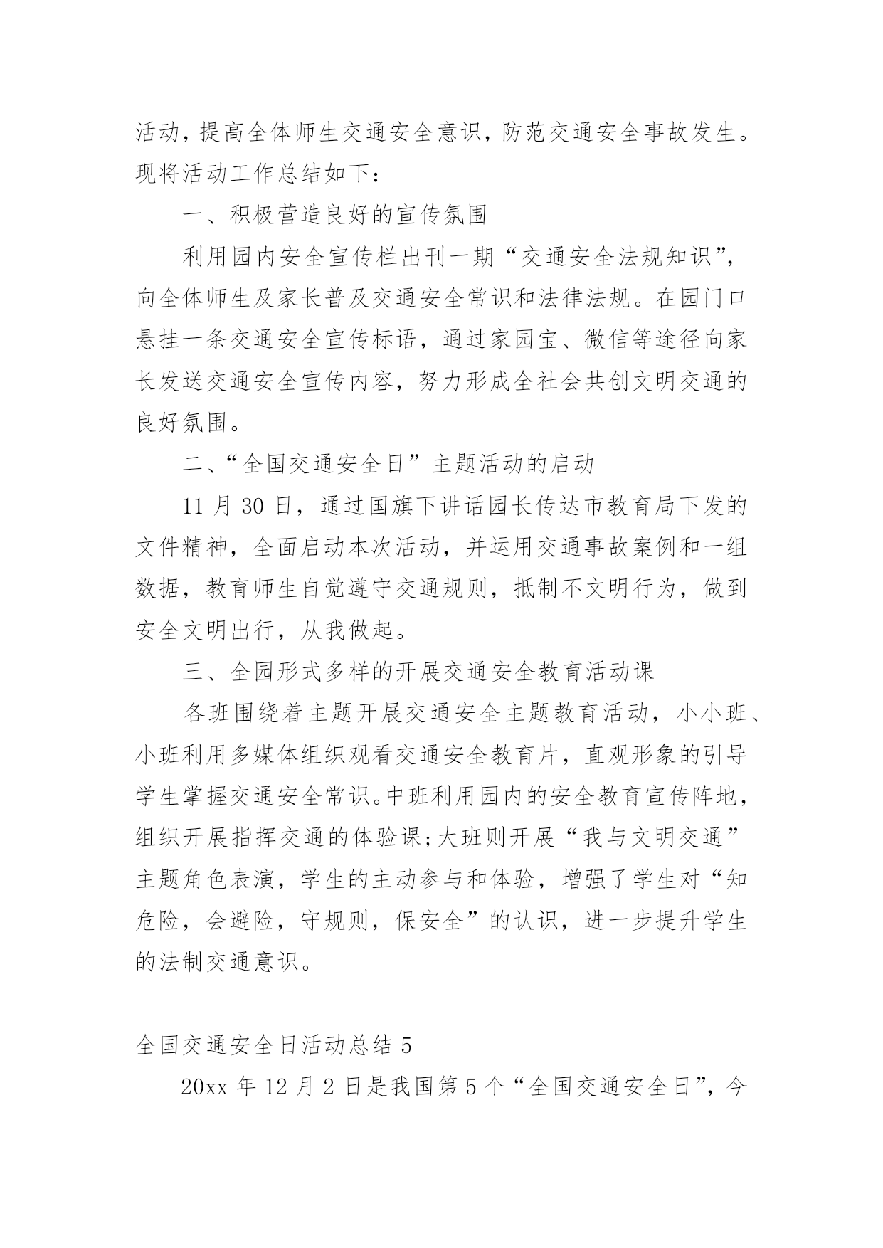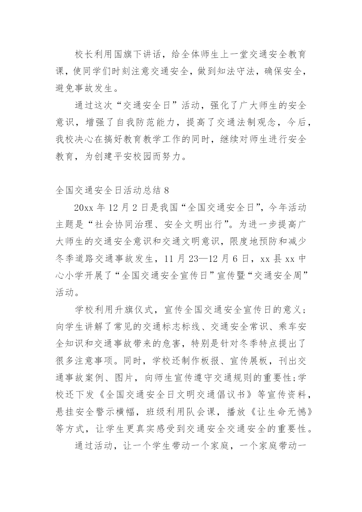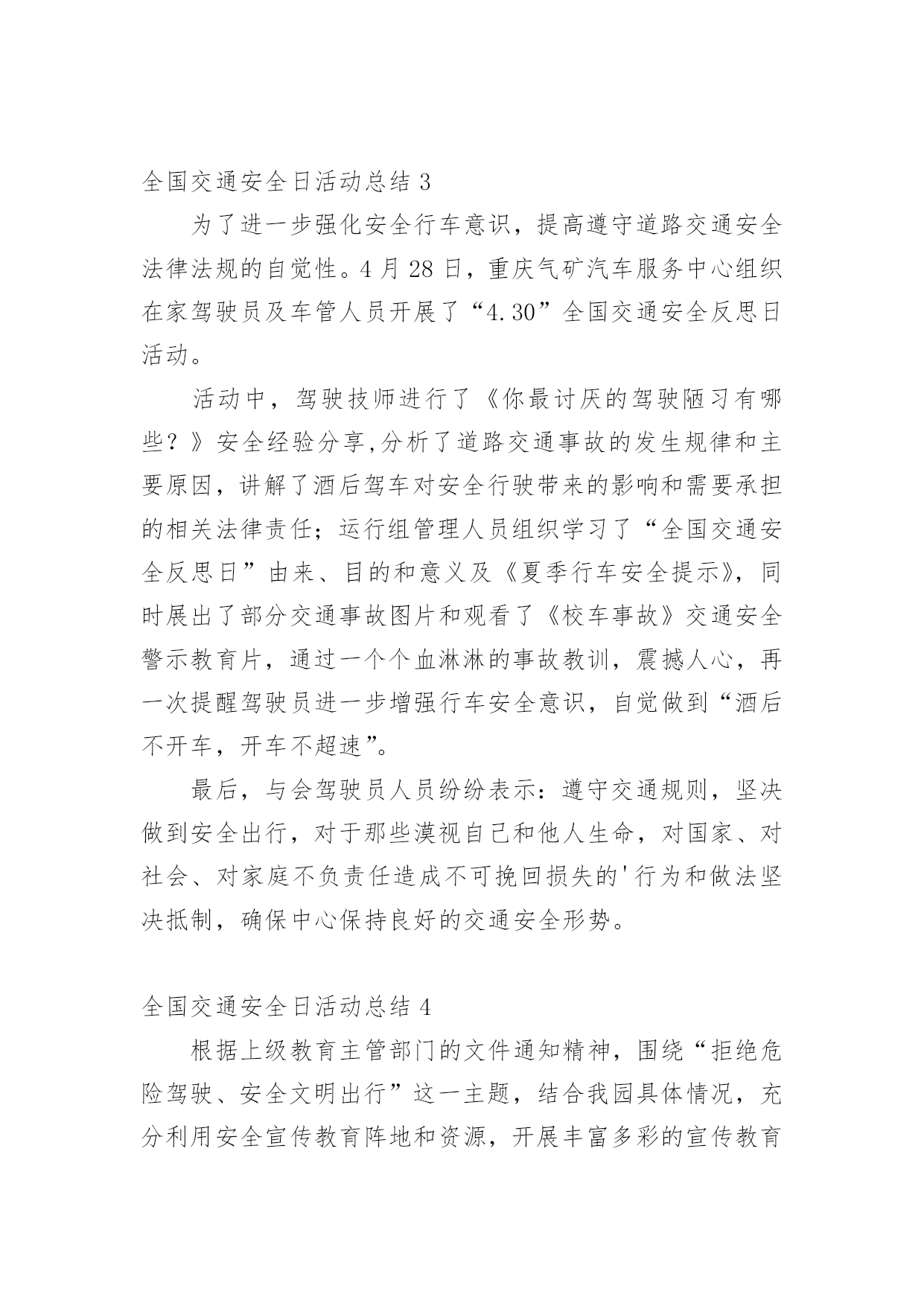 全国交通安全日活动总结全国交通安全日活动总结15篇总结是对某一特定时间段内的学习和工作生活等表现情况加以回顾和分析的一种书面材料,它能帮我们理顺知识结构,突出重点,突破难点,因此,让我们写一份总结吧。那么总结有什么格式呢?下面是小编收集整理的全国交通安全日活动总结,欢迎阅读与收藏。全国交通安全日活动总结120__年12月2日是我国第__个“全国交通安全日”。为进一步提高广大师生的交通安全意识和交通文明意识,最大限度地预防和减少冬季道路交通事故发生,11月23—12月6日,__县__中心小学开展了“全国交通安全宣传日”宣传暨“交通安全周”活动。学校利用升旗仪式,宣传全国交通安全宣传日的意义;向学生讲解了常见的交通标志标线、交通安全常识、乘车安全知识和交通事故带来的危害,特别是针对冬季特点提出了很多注意事项。同时,学校还制作板报、宣传展板,刊出交通事故案例、图片,向师生宣传遵守交通规则的重要性;学校还下发《全国交通安全日文明交通》等宣传资料,悬挂安全警示横幅,班级利用队会课,播放《让生命无憾》(122国民交通安全系列公益宣传教育片)等方式,让学生更真实感受到交通安全交通安全的重要性。通过活动,让一个学生带动一个家庭,一个家庭带动一个社区,起到“小手拉大手”的效果,真正做到人人关注交通安全,人人遵守交通法规,高高兴兴上学,平平安安回家。全国交通安全日活动总结2我校严格执行全国“交通安全日”通知精神,开展形式多样的教育活动,加大了交通安全的宣传力度,增强了全体学生的交通安全观念,牢固树立了“遵守交通信号、安全文明出行”的主题思想。现把活动情况汇报如下:一、加强领导,落实责任我校成立“学校交通安全日活动领导小组”,负责组织和安排学校的交通安全教育工作,把学生的交通安全列入重要的议事日程。校长在教职工会议上部署工作,开展全校性的教育活动,通过国旗下讲话宣传的同时,班主任签订交通安全日宣传责任书等。二、加强宣传,增强意识精心组织开展交通安全知识的宣传教育活动。(一)校外,亲身感受,培养学生的自护能力。为开展交通安全日实践活动,锻炼学生的实际能力,组织学生维护校门口道路秩序,感受交通存在的潜在危险,身临其境,让学生感受“遵守交通信号、安全文明出行”的重要性。同时,班主任对学生进行交通法规等方面知识的教育。让学生掌握了有关交通安全法规常识,对维护学校秩序,疏导交通,宣传交通法规起到了积极而有效的作用。(二)校内,轰轰烈烈开展学生交通安全知识宣传周活动。1、交通安全知识教育课。我们利用班会课,使全校师生受教育率达100%,实现了交通安全教育进学校的目的,交通安全知识讲座使全体学生深受教育。2、组织学生观看《珍爱生命,安全第一》等宣传片,通过媒体中一些场景感染学生,并通过写观后感提升安全意识.3、利用各种载体,广泛开展“文通安全周”活动。具体做好以下工作:各班黑板报出“交通安全专版”进行宣传;利用校园宣传栏设置了交通安全教育手抄报和宣传画。4、加强对学校师生自行车、送子车的管理,教育师生严格做到“安全行车、规范停车”,通过教育、检查等形式制约师生遵守交通法规以及校纪校规。5、通过将《致学生家长的一封信》下发至学生,每生人手一份等形式,对家长进行交通安全教育。要求家长配合学校对子女进行必要的走路和行车安全提醒,要严格遵守交通法规,并要求家长接送孩子上下学或出行时遵守交通法规,保障孩子安全,这样,不仅提高了学生的交通安全意识,而且辐射到家长,规范了家长的交通行为。6、各班召开了以“遵守交通信号、安全文明出行”为主题的主题班会,通过主题班会深化主题教育的防范意识与事故发生的急救措施的落实,提高学生自救自护能力。全国交通安全日活动总结3为了进一步强化安全行车意识,提高遵守道路交通安全法律法规的自觉性。4月28日,重庆气矿汽车服务中心组织在家驾驶员及车管人员开展了“4.30”全国交通安全反思日活动。活动中,驾驶技师进行了《你最讨厌的驾驶陋习有哪些?》安全经验分享,分析了道路交通事故的发生规律和主要原因,讲解了酒后驾车对安全行驶带来的影响和需要承担的相关法律责任;运行组管理人员组织学习了“全国交通安全反思日”由来、目的和意义及《夏季行车安全提示》,同时展出了部分交通事故图片和观看了《校车事故》交通安全警示教育片,通过一个个血淋淋的事故教训,震撼人心,再一次提醒驾驶员进一步增强行车安全意识,自觉做到“酒后不开车,开车不超速”。最后,与会驾驶员人员纷纷表示:遵守交通规则,坚决做到安全出行,对于那些漠视自己和他人生命,对国家、对社会、对家庭不负责任造成不可挽回损失的'行为和做法坚决抵制,确保中心保持良好的交通安全形势。全国交通安全日活动总结4根据上级教育主管部门的文件通知精神,围绕“拒绝危险驾驶、安全文明出行”这一主题,结合我园具体情况,充分利用安全宣传教育阵地