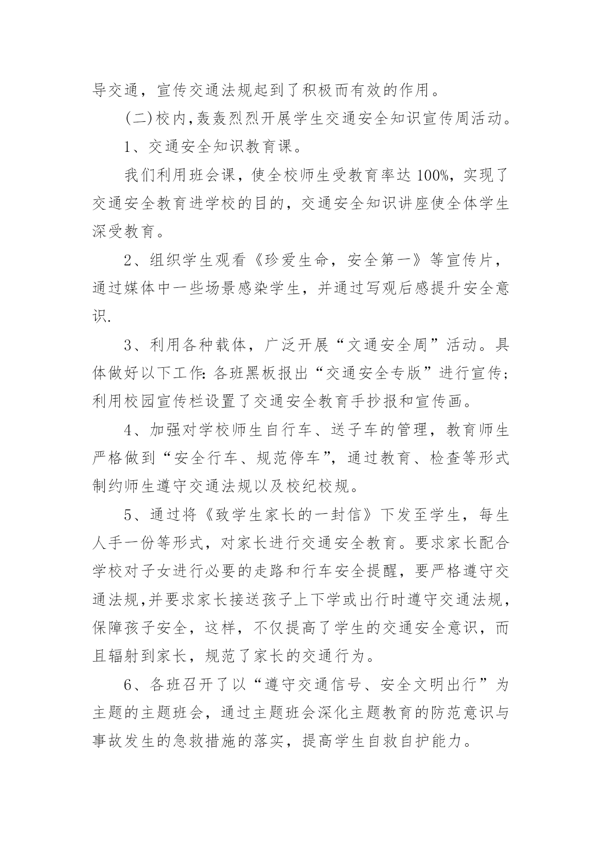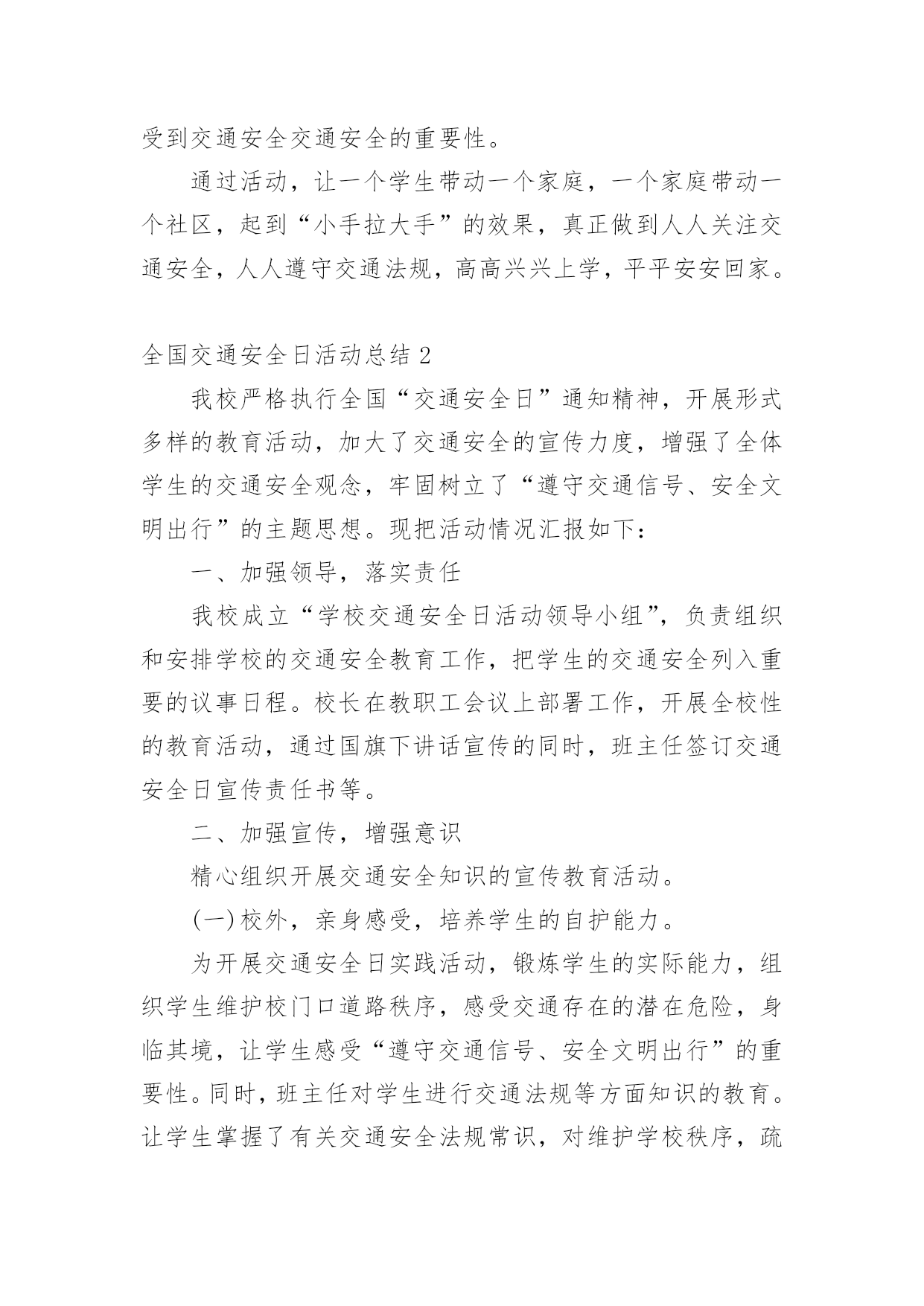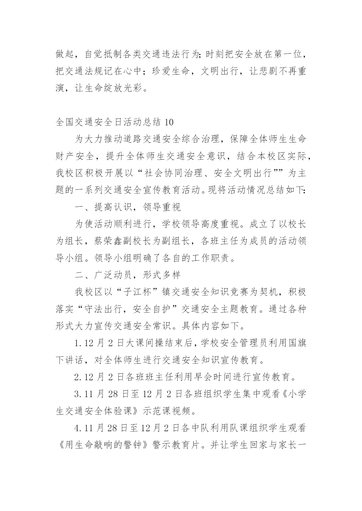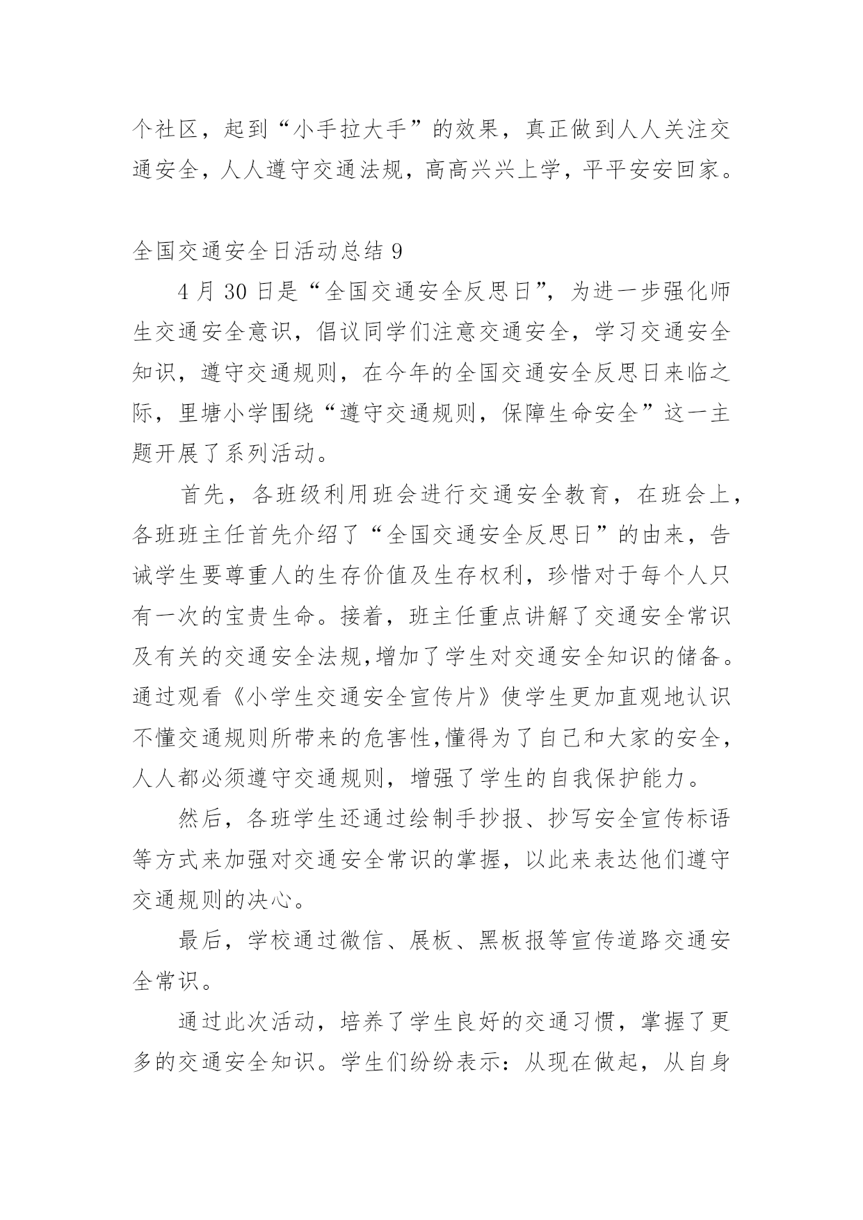 全国交通安全日活动总结全国交通安全日活动总结15篇总结是对某一特定时间段内的学习和工作生活等表现情况加以回顾和分析的一种书面材料,它能帮我们理顺知识结构,突出重点,突破难点,因此,让我们写一份总结吧。那么总结有什么格式呢?下面是小编收集整理的全国交通安全日活动总结,欢迎阅读与收藏。全国交通安全日活动总结120__年12月2日是我国第__个“全国交通安全日”。为进一步提高广大师生的交通安全意识和交通文明意识,最大限度地预防和减少冬季道路交通事故发生,11月23—12月6日,__县__中心小学开展了“全国交通安全宣传日”宣传暨“交通安全周”活动。学校利用升旗仪式,宣传全国交通安全宣传日的意义;向学生讲解了常见的交通标志标线、交通安全常识、乘车安全知识和交通事故带来的危害,特别是针对冬季特点提出了很多注意事项。同时,学校还制作板报、宣传展板,刊出交通事故案例、图片,向师生宣传遵守交通规则的重要性;学校还下发《全国交通安全日文明交通》等宣传资料,悬挂安全警示横幅,班级利用队会课,播放《让生命无憾》(122国民交通安全系列公益宣传教育片)等方式,让学生更真实感受到交通安全交通安全的重要性。通过活动,让一个学生带动一个家庭,一个家庭带动一个社区,起到“小手拉大手”的效果,真正做到人人关注交通安全,人人遵守交通法规,高高兴兴上学,平平安安回家。全国交通安全日活动总结2我校严格执行全国“交通安全日”通知精神,开展形式多样的教育活动,加大了交通安全的宣传力度,增强了全体学生的交通安全观念,牢固树立了“遵守交通信号、安全文明出行”的主题思想。现把活动情况汇报如下:一、加强领导,落实责任我校成立“学校交通安全日活动领导小组”,负责组织和安排学校的交通安全教育工作,把学生的交通安全列入重要的议事日程。校长在教职工会议上部署工作,开展全校性的教育活动,通过国旗下讲话宣传的同时,班主任签订交通安全日宣传责任书等。二、加强宣传,增强意识精心组织开展交通安全知识的宣传教育活动。(一)校外,亲身感受,培养学生的自护能力。为开展交通安全日实践活动,锻炼学生的实际能力,组织学生维护校门口道路秩序,感受交通存在的潜在危险,身临其境,让学生感受“遵守交通信号、安全文明出行”的重要性。同时,班主任对学生进行交通法规等方面知识的教育。让学生掌握了有关交通安全法规常识,对维护学校秩序,疏导交通,宣传交通法规起到了积极而有效的作用。(二)校内,轰轰烈烈开展学生交通安全知识宣传周活动。1、交通安全知识教育课。我们利用班会课,使全校师生受教育率达100%,实现了交通安全教育进学校的目的,交通安全知识讲座使全体学生深受教育。2、组织学生观看《珍爱生命,安全第一》等宣传片,通过媒体中一些场景感染学生,并通过写观后感提升安全意识.3、利用各种载体,广泛开展“文通安全周”活动。具体做好以下工作:各班黑板报出“交通安全专版”进行宣传;利用校园宣传栏设置了交通安全教育手抄报和宣传画。4、加强对学校师生自行车、送子车的管理,教育师生严格做到“安全行车、规范停车”,通过教育、检查等形式制约师生遵守交通法规以及校纪校规。5、通过将《致学生家长的一封信》下发至学生,每生人手一份等形式,对家长进行交通安全教育。要求家长配合学校对子女进行必要的走路和行车安全提醒,要严格遵守交通法规,并要求家长接送孩子上下学或出行时遵守交通法规,保障孩子安全,这样,不仅提高了学生的交通安全意识,而且辐射到家长,规范了家长的交通行为。6、各班召开了以“遵守交通信号、安全文明出行”为主题的主题班会,通过主题班会深化主题教育的防范意识与事故发生的急救措施的落实,提高学生自救自护能力。全国交通安全日活动总结3为了进一步强化安全行车意识,提高遵守道路交通安全法律法规的自觉性。4月28日,重庆气矿汽车服务中心组织在家驾驶员及车管人员开展了“4.30”全国交通安全反思日活动。活动中,驾驶技师进行了《你最讨厌的驾驶陋习有哪些?》安全经验分享,分析了道路交通事故的发生规律和主要原因,讲解了酒后驾车对安全行驶带来的影响和需要承担的相关法律责任;运行组管理人员组织学习了“全国交通安全反思日”由来、目的和意义及《夏季行车安全提示》,同时展出了部分交通事故图片和观看了《校车事故》交通安全警示教育片,通过一个个血淋淋的事故教训,震撼人心,再一次提醒驾驶员进一步增强行车安全意识,自觉做到“酒后不开车,开车不超速”。最后,与会驾驶员人员纷纷表示:遵守交通规则,坚决做到安全出行,对于那些漠视自己和他人生命,对国家、对社会、对家庭不负责任造成不可挽回损失的'行为和做法坚决抵制,确保中心保持良好的交通安全形势。全国交通安全日活动总结4根据上级教育主管部门的文件通知精神,围绕“拒绝危险驾驶、安全文明出行”这一主题,结合我园具体情况,充分利用安全宣传教育阵地