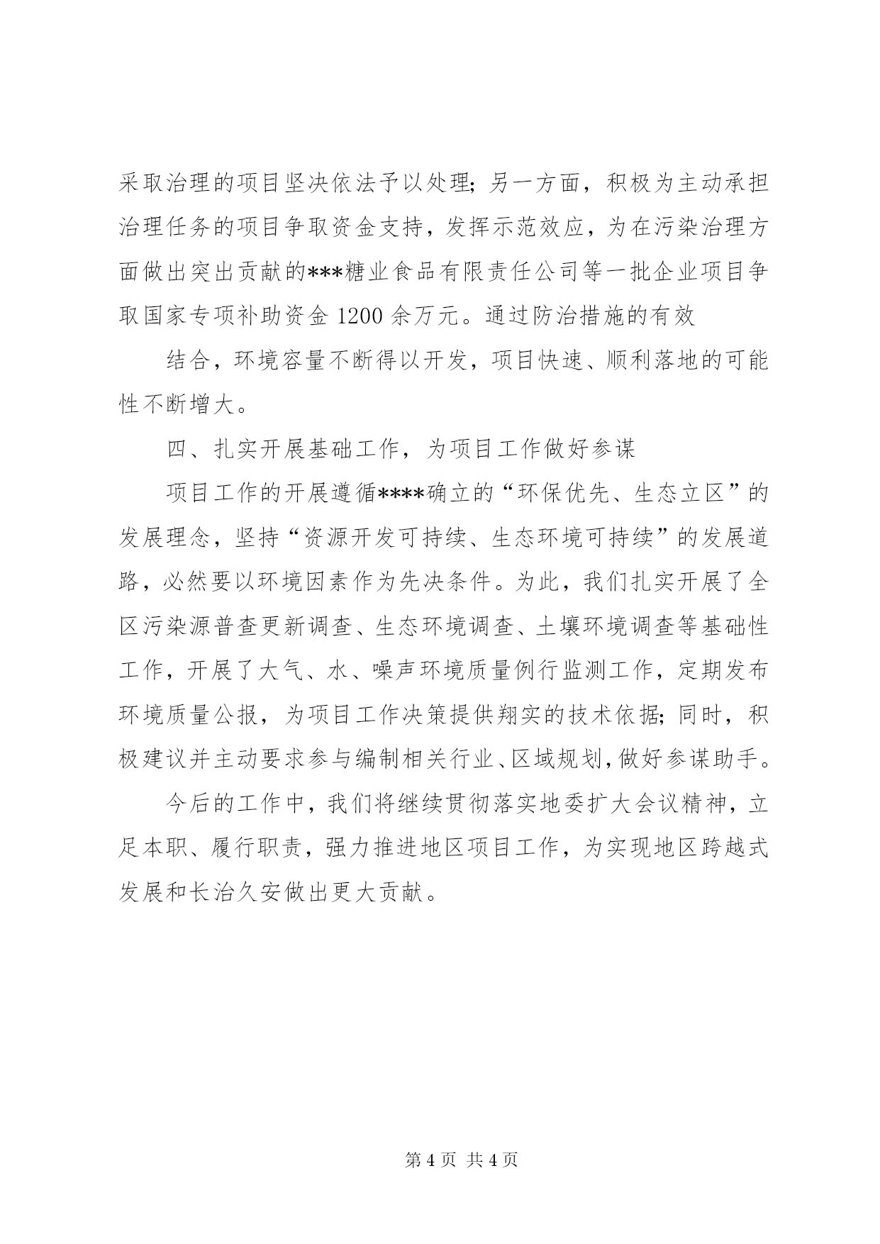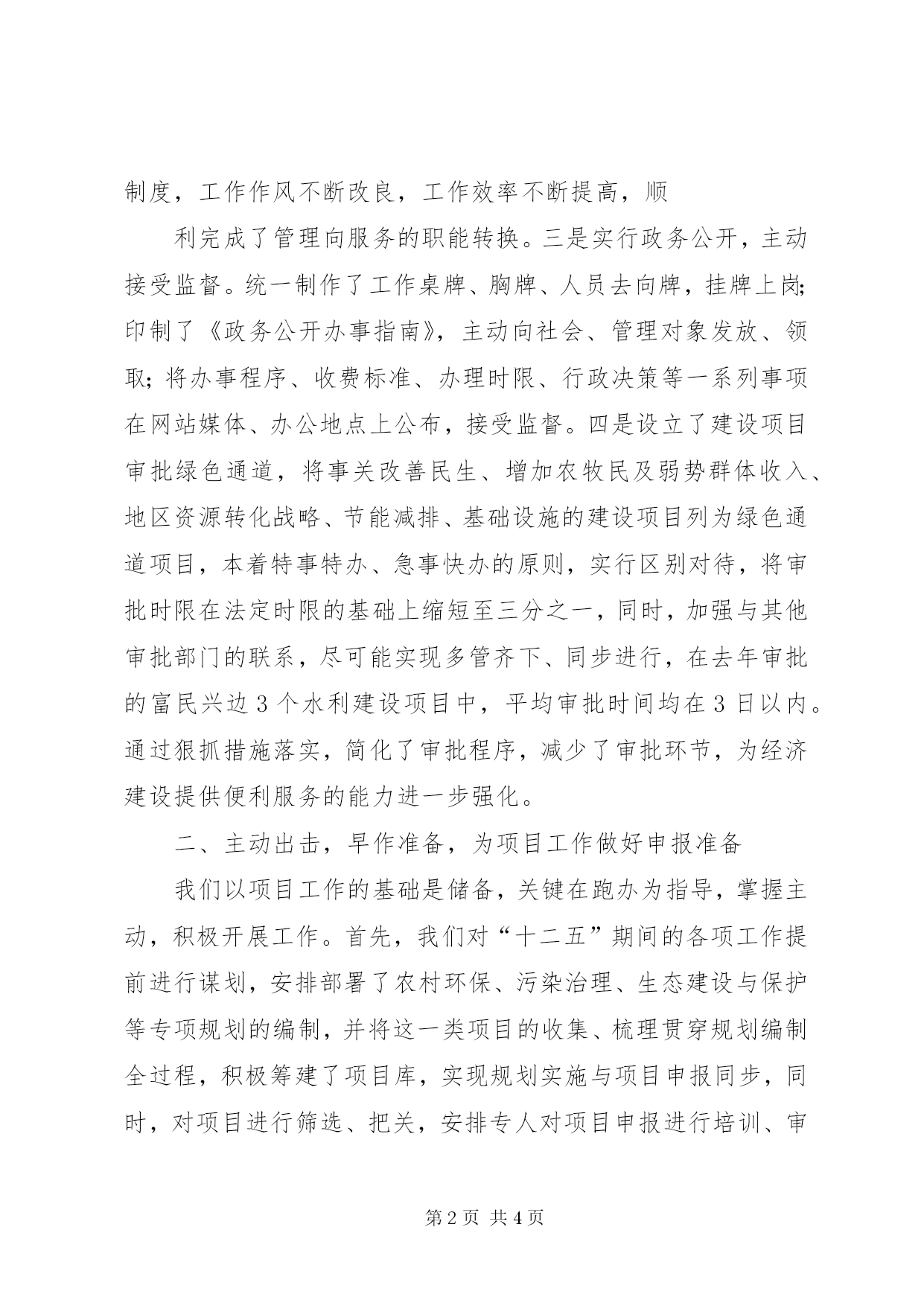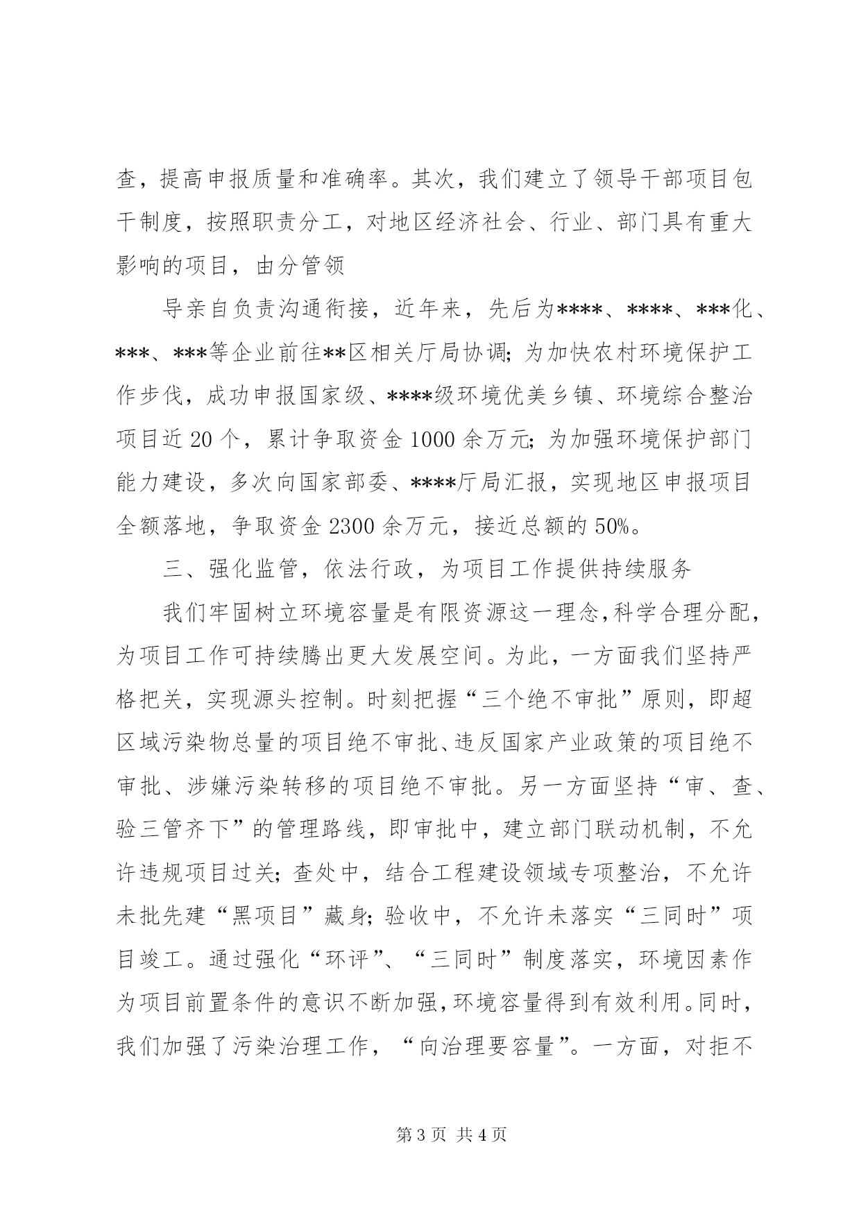 第PAGE\*Arabic\*MERGEFORMAT4页共NUMPAGES\*MERGEFORMAT4页环保工作服务项目建设履行职责,强力助推地区项目工作2010年,中央******政策的确定,为***经济社会发展提供了重大历史发展机遇。如何从环保工作出发助力经济社会发展提到了重要议事日程,我们将环境保护工作定位于“转变观念,创新工作,积极为经济建设提供优质服务,努力实现经济社会发展与环境保护相互协调”。今年以来,特别是地委扩大会议召开以后,我们进一步理清思路、明确目标,将项目的环境管理工作作为着力点,在实现环境保护事业发展的同时,为地区经济社会发展做好服务。我们的具体做法是:一、规范程序,提升效能,为项目工作顺畅审批渠道我们始终坚持为经济建设中心工作服务,立足部门职责,完善工作机制,强化制度措施。一是先后就建设项目环境管理工作两次下达文件,结合新时期环保工作的具体要求,对工作流程进行拾遗补漏;出台了《****建设项目环境管理办法》、《****建设项目环境影响评价文件分级审批规定》,确定审批权限;制定了重大建设项目局务会审批、一般建设项目分级把关集中审批制度,使审批趋向科学、合理化。二是改变工作作风,转换工作职能。在上报地区绩效办的部门绩效考核细则基础上,进一步细化内容,制定了机关内部考核细则,量化指标,责任到人;补充完善了《****环保局督查督办工作制度》、《首问负责制》、《限时办结制》等内部管理制度,工作作风不断改良,工作效率不断提高,顺利完成了管理向服务的职能转换。三是实行政务公开,主动接受监督。统一制作了工作桌牌、胸牌、人员去向牌,挂牌上岗;印制了《政务公开办事指南》,主动向社会、管理对象发放、领取;将办事程序、收费标准、办理时限、行政决策等一系列事项在网站媒体、办公地点上公布,接受监督。四是设立了建设项目审批绿色通道,将事关改善民生、增加农牧民及弱势群体收入、地区资源转化战略、节能减排、基础设施的建设项目列为绿色通道项目,本着特事特办、急事快办的原则,实行区别对待,将审批时限在法定时限的基础上缩短至三分之一,同时,加强与其他审批部门的联系,尽可能实现多管齐下、同步进行,在去年审批的富民兴边3个水利建设项目中,平均审批时间均在3日以内。通过狠抓措施落实,简化了审批程序,减少了审批环节,为经济建设提供便利服务的能力进一步强化。二、主动出击,早作准备,为项目工作做好申报准备我们以项目工作的基础是储备,关键在跑办为指导,掌握主动,积极开展工作。首先,我们对“十二五”期间的各项工作提前进行谋划,安排部署了农村环保、污染治理、生态建设与保护等专项规划的编制,并将这一类项目的收集、梳理贯穿规划编制全过程,积极筹建了项目库,实现规划实施与项目申报同步,同时,对项目进行筛选、把关,安排专人对项目申报进行培训、审查,提高申报质量和准确率。其次,我们建立了领导干部项目包干制度,按照职责分工,对地区经济社会、行业、部门具有重大影响的项目,由分管领导亲自负责沟通衔接,近年来,先后为****、****、***化、***、***等企业前往**区相关厅局协调;为加快农村环境保护工作步伐,成功申报国家级、****级环境优美乡镇、环境综合整治项目近20个,累计争取资金1000余万元;为加强环境保护部门能力建设,多次向国家部委、****厅局汇报,实现地区申报项目全额落地,争取资金2300余万元,接近总额的50%。三、强化监管,依法行政,为项目工作提供持续服务我们牢固树立环境容量是有限资源这一理念,科学合理分配,为项目工作可持续腾出更大发展空间。为此,一方面我们坚持严格把关,实现源头控制。时刻把握“三个绝不审批”原则,即超区域污染物总量的项目绝不审批、违反国家产业政策的项目绝不审批、涉嫌污染转移的项目绝不审批。另一方面坚持“审、查、验三管齐下”的管理路线,即审批中,建立部门联动机制,不允许违规项目过关;查处中,结合工程建设领域专项整治,不允许未批先建“黑项目”藏身;验收中,不允许未落实“三同时”项目竣工。通过强化“环评”、“三同时”制度落实,环境因素作为项目前置条件的意识不断加强,环境容量得到有效利用。同时,我们加强了污染治理工作,“向治理要容量”。一方面,对拒不采取治理的项目坚决依法予以处理;另一方面,积极为主动承担治理任务的项目争取资金支持,发挥示范效应,为在污染治理方面做出突出贡献的***糖业食品有限责任公司等一批企业项目争取国家专项补助资金1200余万元。通过防治措施的有效结合,环境容量不断得以开发,项目快速、顺利落地的可能性不断增大。四、扎实开展基础工作,为项目工作做好参谋项目工作的开展遵循****确立的“环保优先、生态立区”的发展理念,坚持“资源开发可持续、生态环境可持续”的发展道路,必然要以环境因素作为先决条件。为此