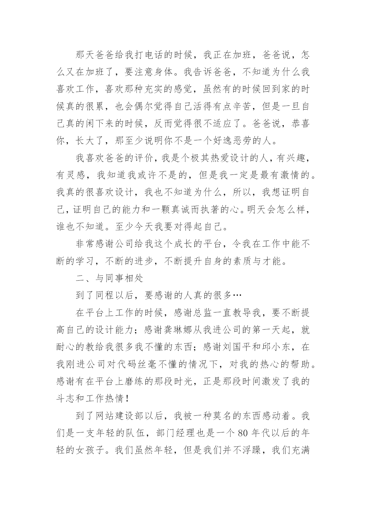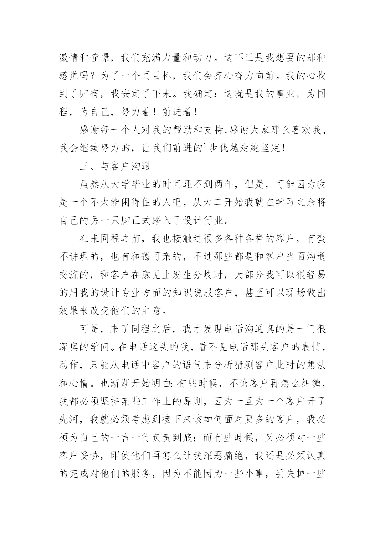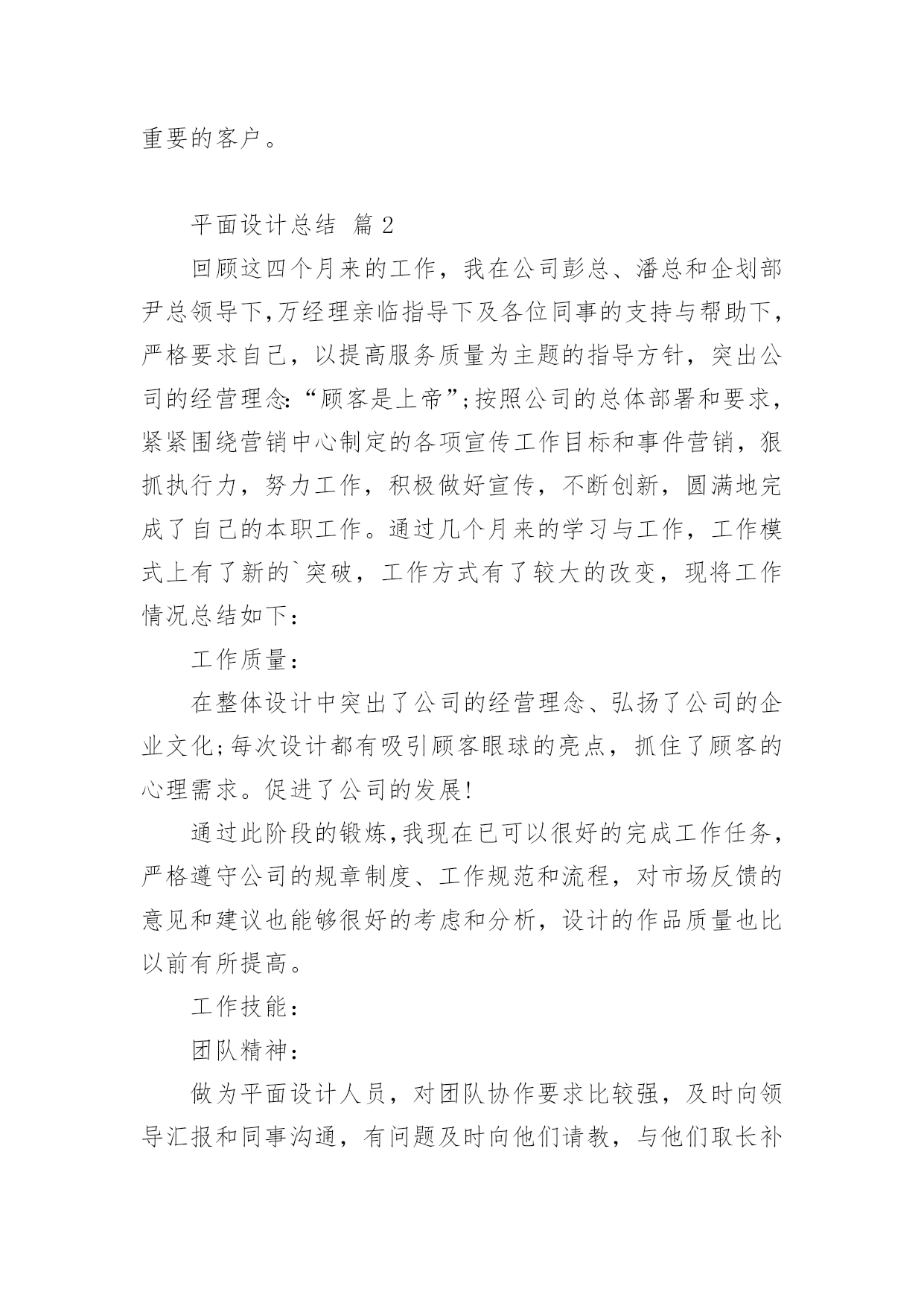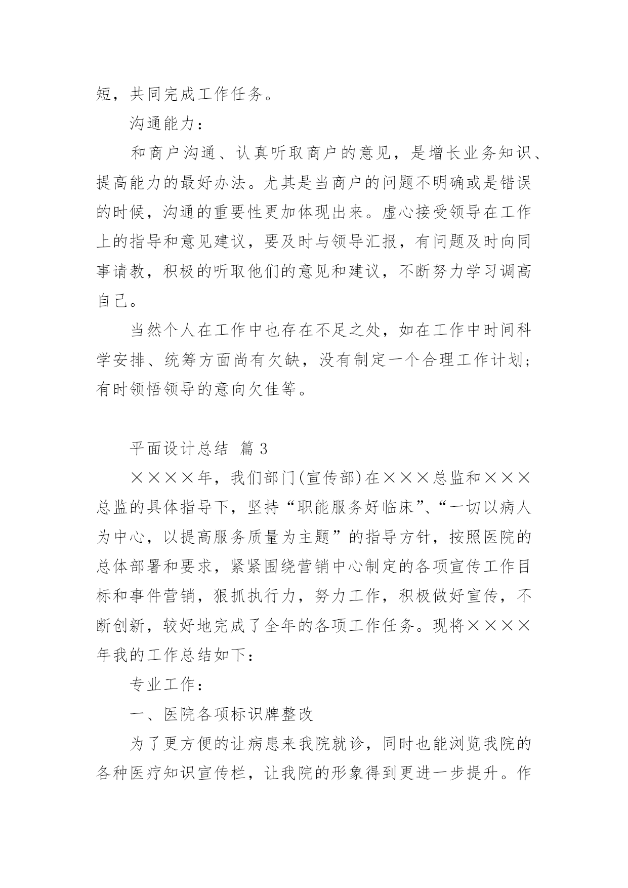 平面设计总结总结是事后对某一阶段的学习或工作情况作加以回顾检查并分析评价的书面材料,它可以帮助我们有寻找学习和工作中的规律,不妨坐下来好好写写总结吧。总结怎么写才是正确的呢?下面是小编为大家整理的平面设计总结,希望能够帮助到大家。平面设计总结篇120xx年很快就会过去了,掐指一算,来到同程已经整整一年了,在这里我对我一年以来的工作情况进行简要的总结,算是对公司也是对个人这段时间的工作的一个交代。一、个人工作总结我是去年2月有幸被同程录用的,之前我一直从事广告平面设计方面的工作,到了苏州后找的第一份工作就是网页设计,不过做的时间不是很长,对这方面还算是个生手。到了同程以后,先是担任平台设计师的工作至5月下旬,然后又调到网站建设部做网站设计师一直至今。在工作中,我学到了很多东西,从不懂,到有点懂,再到熟悉。这中间的过程,只有我自己最清楚。很多时候,日常的工作是琐碎的,我们只有自己从中找到乐趣,才不会觉得枯燥;很多时候当我们做网站刚有灵感的时候,会突然有其它的工作布置下来,我们只有自己调整好自己的心态,统筹安排好自己的工作,才不会手忙脚乱。那天爸爸给我打电话的时候,我正在加班,爸爸说,怎么又在加班了,要注意身体。我告诉爸爸,不知道为什么我喜欢工作,喜欢那种充实的感觉,虽然有的时候回到家的时候真的很累,也会偶尔觉得自己活得有点辛苦,但是一旦自己真的闲下来的时候,反而觉得很不适应了。爸爸说,恭喜你,长大了,那至少说明你不是一个好逸恶劳的人。我喜欢爸爸的评价,我是个极其热爱设计的人,有兴趣,有灵感,我知道我或许不是的,但是我一定是最有激情的。我真的很喜欢设计,我也不知道为什么,所以,我想证明自己,证明自己的能力和一颗真诚而执著的心。明天会怎么样,谁也不知道。至少今天我要对得起自己。非常感谢公司给我这个成长的平台,令我在工作中能不断的学习,不断的进步,不断提升自身的素质与才能。二、与同事相处到了同程以后,要感谢的人真的很多…在平台上工作的时候,感谢总监一直教导我,要不断提高自己的设计能力;感谢龚琳娜从我进公司的第一天起,就耐心的教给我很多我不懂的东西;感谢刘国平和邱小东,在我刚进公司对代码丝毫不懂的情况下,对我的热心的帮助。感谢有在平台上磨练的那段时光,正是那段时间激发了我的斗志和工作热情!到了网站建设部以后,我被一种莫名的东西感动着。我们是一支年轻的队伍,部门经理也是一个80年代以后的年轻的女孩子。我们虽然年轻,但是我们并不浮躁,我们充满激情和憧憬,我们充满力量和动力。这不正是我想要的那种感觉吗?为了一个同目标,我们会齐心奋力向前。我的心找到了归宿,我安定了下来。我确定:这就是我的事业,为同程,为自己,努力着!前进着!感谢每一个人对我的帮助和支持,感谢大家那么喜欢我,我会继续努力的,让我们前进的`步伐越走越坚定!三、与客户沟通虽然从大学毕业的时间还不到两年,但是,可能因为我是一个不太能闲得住的人吧,从大二开始我就在学习之余将自己的另一只脚正式踏入了设计行业。在来同程之前,我也接触过很多各种各样的客户,有蛮不讲理的,也有和蔼可亲的,不过那些都是和客户当面沟通交流的,和客户在意见上发生分歧时,大部分我可以很轻易的用我的设计专业方面的知识说服客户,甚至可以现场做出效果来改变他们的主意。可是,来了同程之后,我才发现电话沟通真的是一门很深奥的学问。在电话这头的我,看不见电话那头客户的表情,动作,只能从电话中客户的语气来分析猜测客户此时的想法和心情。也渐渐开始明白:有些时候,不论客户再怎么纠缠,我都必须坚持某些工作上的原则,因为一旦为一个客户开了先河,我就必须考虑到接下来该如何面对更多的客户,我必须为自己的一言一行负责到底;而有些时候,又必须对一些客户妥协,即使他们再怎么让我深恶痛绝,我还是必须认真的完成对他们的服务,因为不能因为一些小事,丢失掉一些重要的客户。平面设计总结篇2回顾这四个月来的工作,我在公司彭总、潘总和企划部尹总领导下,万经理亲临指导下及各位同事的支持与帮助下,严格要求自己,以提高服务质量为主题的指导方针,突出公司的经营理念:“顾客是上帝”;按照公司的总体部署和要求,紧紧围绕营销中心制定的各项宣传工作目标和事件营销,狠抓执行力,努力工作,积极做好宣传,不断创新,圆满地完成了自己的本职工作。通过几个月来的学习与工作,工作模式上有了新的`突破,工作方式有了较大的改变,现将工作情况总结如下:工作质量:在整体设计中突出了公司的经营理念、弘扬了公司的企业文化;每次设计都有吸引顾客眼球的亮点,抓住了顾客的心理需求。促进了公司的发展!通过此阶段的锻炼,我现在已可以很好的完成工作任务,严格遵守公司的规章制度、工作规范和流程,对市场反馈的意见和建议也能够很好的考虑和分析,设计的作品质量也比以前有所提高。工作技能:团队精神:做为平面设计人员,对团队协