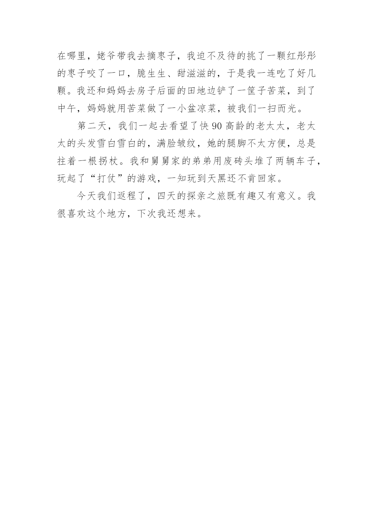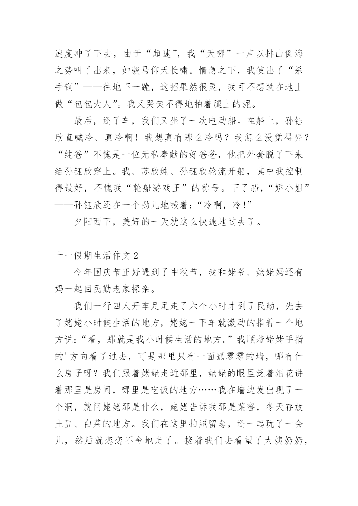 十一假期生活作文在学习、工作乃至生活中,大家都尝试过写作文吧,作文是通过文字来表达一个主题意义的记叙方法。写起作文来就毫无头绪?以下是小编为大家整理的十一假期生活作文,希望对大家有所帮助。十一假期生活作文1嘿,朋友们!国庆节里去游玩、玩耍、串门了吗?给你讲讲我国庆节都干什么了吧。十月三日中午,我和苏欣纯、孙钰欣、包钰轩吃过午饭后,在苏欣纯爸爸妈妈的陪同下,一起去了美丽的天德湖公园。在公园里我们一边骑着四人自行车,一边赏景,真是人生一大乐趣啊!首先,我们去了“动物园林”,这里有“十二生肖”:“吱吱”叫的小老鼠、勤恳为人的大水牛、日行千里的`骏马、腾云驾雾的祥龙、抓耳挠腮的小猴子等等。这些树木做的动物栩栩如生、活灵活现,真是巧夺天工!然后,我们又去了滑草的地方。那是一个很刺激的娱乐项目。从一座很高的山坡上冲下来,那感觉简直爽透了!包钰轩先做了“无畏的探险者”——哥伦布,先冲了下去。接着,苏欣纯也冲了下去。然后,“马后炮”——我也冲了下去,第一次冲时速度比较慢,没找到感觉,不尽兴,又冲了一次。这次可不同凡响了,我以火星撞地球世界末日来临的速度冲了下去,由于“超速”,我“天哪”一声以排山倒海之势叫了出来,如骏马仰天长啸。情急之下,我使出了“杀手锏”——往地下一跪,这招果然很灵,我可不想跌在地上做“包包大人”。我又哭笑不得地拍着腿上的泥。最后,还了车,我们又坐了一次电动船。在船上,孙钰欣直喊冷、真冷啊!我想真有那么冷吗?我怎么没觉得呢?“纯爸”不愧是一位无私奉献的好爸爸,他把外套脱了下来给孙钰欣穿上。我、苏欣纯、孙钰欣轮流开船,其中我控制得最好,不愧我“轮船游戏王”的称号。下了船,“娇小姐”——孙钰欣还在一个劲儿地喊着:“冷啊,冷!”夕阳西下,美好的一天就这么快速地过去了。十一假期生活作文2今年国庆节正好遇到了中秋节,我和姥爷、姥姥妈还有妈一起回民勤老家探亲。我们一行四人开车足足走了六个小时才到了民勤,先去了姥姥小时候生活的地方,姥姥一下车就激动的指着一个地方说:“看,那就是我小时候生活的地方。”我顺着姥姥手指的'方向看了过去,可是那里只有一面孤零零的墙,哪有什么房子呀?我们跟着姥姥走近那里,姥姥的眼里泛着泪花讲着那里是房间,哪里是吃饭的地方……我在墙边发出现了一个洞,就问姥姥那是什么,姥姥告诉我那是菜窖,冬天存放土豆、白菜的地方。我们在这里拍照留念,还一起玩了一会儿,然后就恋恋不舍地走了。接着我们去看望了大姨奶奶,在哪里,姥爷带我去摘枣子,我迫不及待的挑了一颗红彤彤的枣子咬了一口,脆生生、甜滋滋的,于是我一连吃了好几颗。我还和妈妈去房子后面的田地边铲了一筐子苦菜,到了中午,妈妈就用苦菜做了一小盆凉菜,被我们一扫而光。第二天,我们一起去看望了快90高龄的老太太,老太太的头发雪白雪白的,满脸皱纹,她的腿脚不太方便,总是拄着一根拐杖。我和舅舅家的弟弟用废砖头堆了两辆车子,玩起了“打仗”的游戏,一知玩到天黑还不肯回家。今天我们返程了,四天的探亲之旅既有趣又有意义。我很喜欢这个地方,下次我还想来。