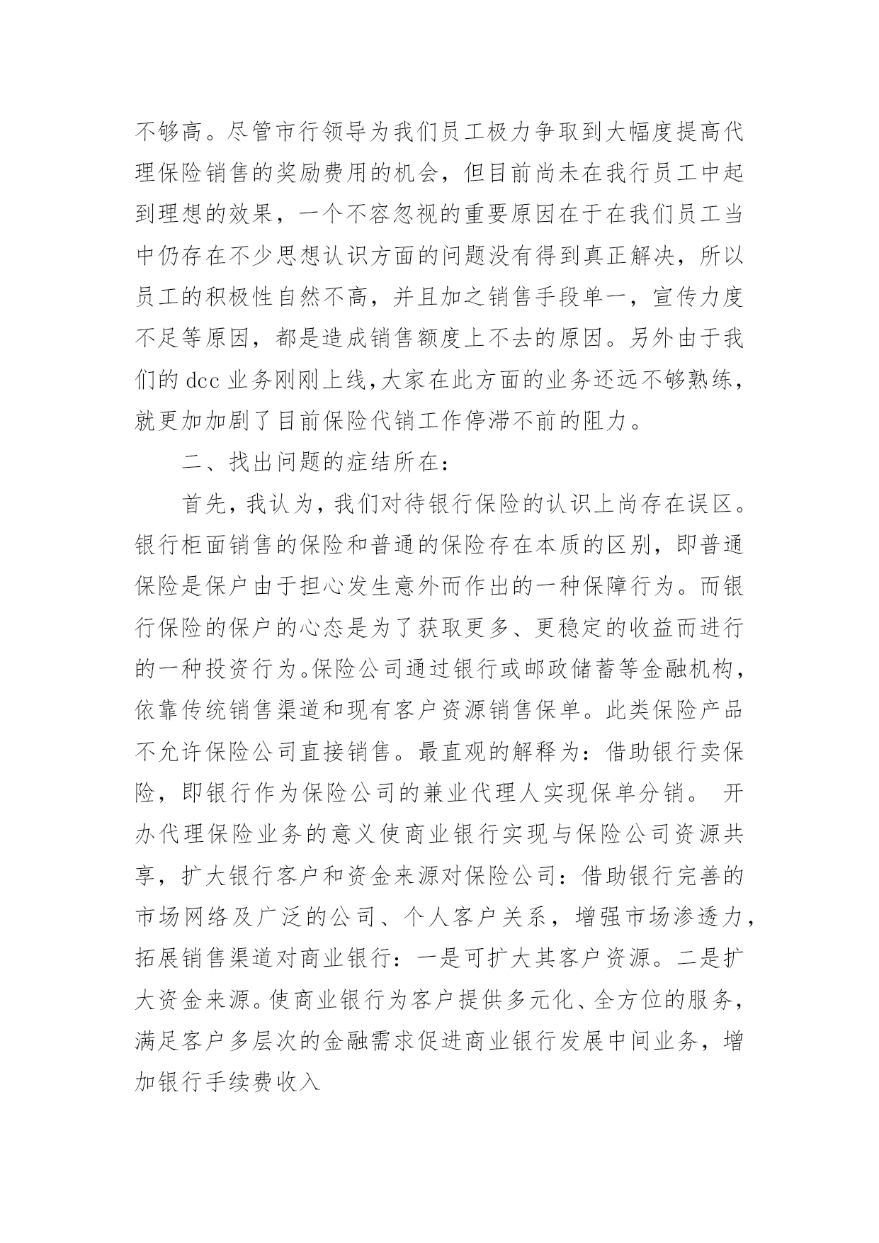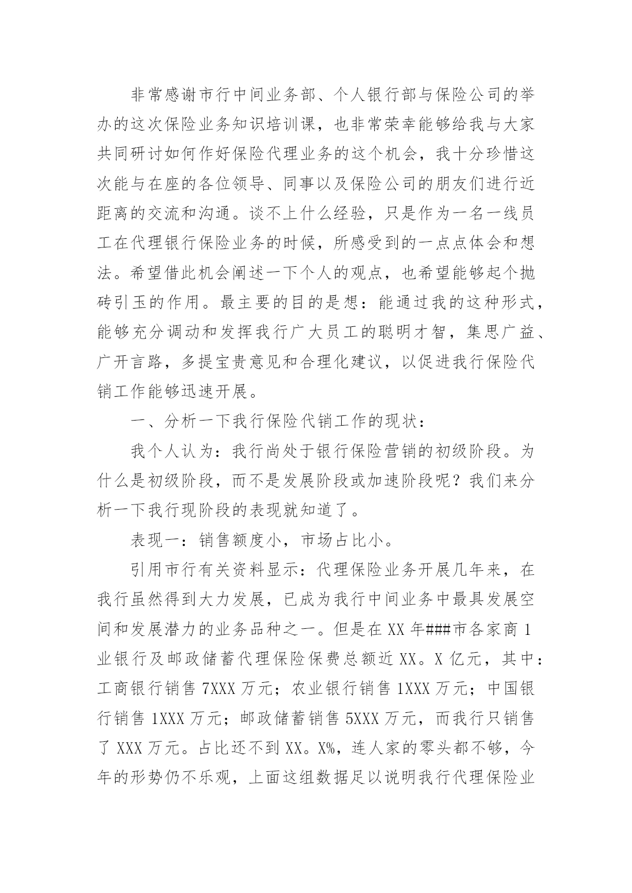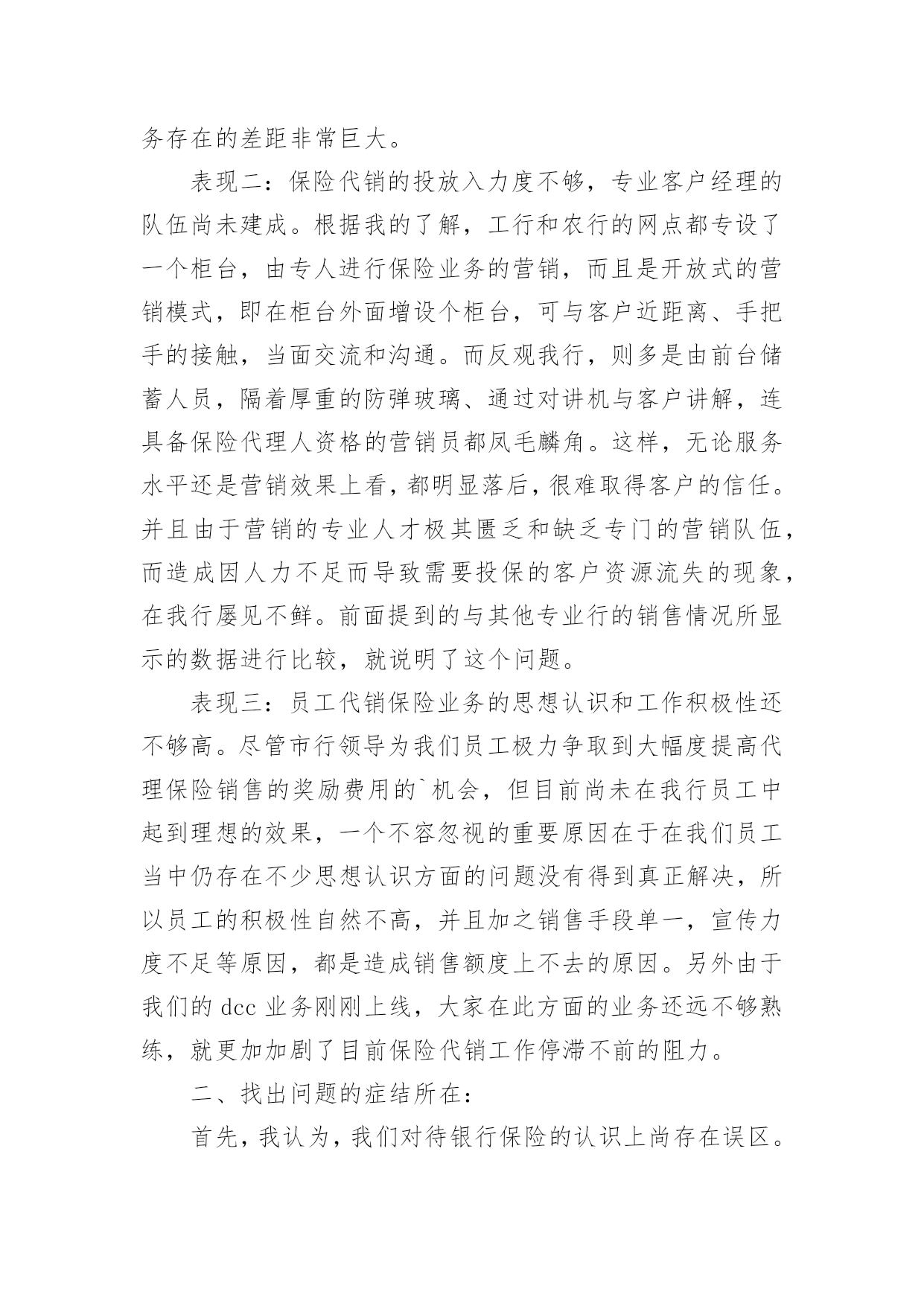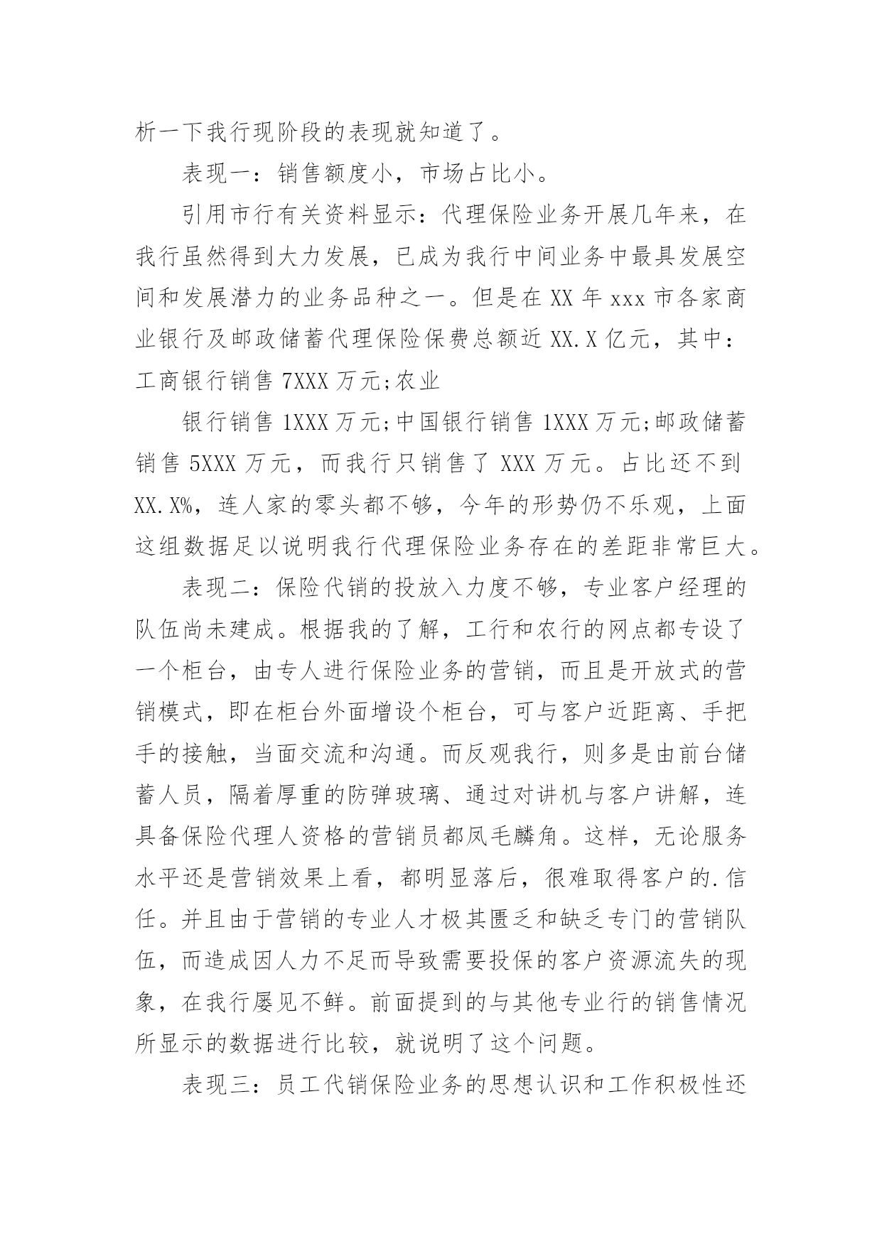银行保险工作总结总结是指对某一阶段的工作、学习或思想中的经验或情况加以总结和概括的书面材料,它能帮我们理顺知识结构,突出重点,突破难点,不如静下心来好好写写总结吧。你所见过的总结应该是什么样的?以下是小编整理的银行保险工作总结,欢迎大家分享。银行保险工作总结篇1各位领导、同事以及银行保险公司的朋友们:非常感谢市行中间业务部、个人银行部与保险公司的举办的这次保险业务知识培训课,也非常荣幸能够给我与大家共同研讨如何作好保险代理业务的这个机会,我十分珍惜这次能与在座的各位领导、同事以及保险公司的朋友们进行近距离的交流和沟通。谈不上什么经验,只是作为一名一线员工在代理银行保险业务的时候,所感受到的一点点体会和想法。希望借此机会阐述一下个人的观点,也希望能够起个抛砖引玉的作用。最主要的目的是想:能通过我的这种形式,能够充分调动和发挥我行广大员工的聪明才智,集思广益、广开言路,多提宝贵意见和合理化建议,以促进我行保险代销工作能够迅速开展。一、分析一下我行保险代销工作的现状:我个人认为:我行尚处于银行保险营销的初级阶段。为什么是初级阶段,而不是发展阶段或加速阶段呢?我们来分析一下我行现阶段的表现就知道了。表现一:销售额度小,市场占比小。引用市行有关资料显示:代理保险业务开展几年来,在我行虽然得到大力发展,已成为我行中间业务中最具发展空间和发展潜力的业务品种之一。但是在XX年xxx市各家商业银行及邮政储蓄代理保险保费总额近XX.X亿元,其中:工商银行销售7XXX万元;农业银行销售1XXX万元;中国银行销售1XXX万元;邮政储蓄销售5XXX万元,而我行只销售了XXX万元。占比还不到XX.X%,连人家的零头都不够,今年的形势仍不乐观,上面这组数据足以说明我行代理保险业务存在的差距非常巨大。表现二:保险代销的投放入力度不够,专业客户经理的队伍尚未建成。根据我的了解,工行和农行的网点都专设了一个柜台,由专人进行保险业务的营销,而且是开放式的营销模式,即在柜台外面增设个柜台,可与客户近距离、手把手的接触,当面交流和沟通。而反观我行,则多是由前台储蓄人员,隔着厚重的防弹玻璃、通过对讲机与客户讲解,连具备保险代理人资格的营销员都凤毛麟角。这样,无论服务水平还是营销效果上看,都明显落后,很难取得客户的.信任。并且由于营销的专业人才极其匮乏和缺乏专门的营销队伍,而造成因人力不足而导致需要投保的客户资源流失的现象,在我行屡见不鲜。前面提到的与其他专业行的销售情况所显示的数据进行比较,就说明了这个问题。表现三:员工代销保险业务的思想认识和工作积极性还不够高。尽管市行领导为我们员工极力争取到大幅度提高代理保险销售的奖励费用的机会,但目前尚未在我行员工中起到理想的效果,一个不容忽视的重要原因在于在我们员工当中仍存在不少思想认识方面的问题没有得到真正解决,所以员工的积极性自然不高,并且加之销售手段单一,宣传力度不足等原因,都是造成销售额度上不去的原因。另外由于我们的dcc业务刚刚上线,大家在此方面的业务还远不够熟练,就更加加剧了目前保险代销工作停滞不前的阻力。二、找出问题的症结所在:首先,我认为,我们对待银行保险的认识上尚存在误区。银行柜面销售的保险和普通的保险存在本质的区别,即普通保险是保户由于担心发生意外而作出的一种保障行为。而银行保险的保户的心态是为了获取更多、更稳定的收益而进行的一种投资行为。保险公司通过银行或邮政储蓄等金融机构,依靠传统销售渠道和现有客户资源销售保单。此类保险产品不允许保险公司直接销售。最直观的解释为:借助银行卖保险,即银行作为保险公司的兼业代理人实现保单分销。开办代理保险业务的意义使商业银行实现与保险公司资源共享,扩大银行客户和资金来源对保险公司:借助银行完善的市场网络及广泛的公司、个人客户关系,增强市场渗透力,拓展销售渠道对商业银行:一是可扩大其客户资源。二是扩大资金来源。使商业银行为客户提供多元化、全方位的服务,满足客户多层次的金融需求促进商业银行发展中间业务,增加银行手续费收入银行保险工作总结篇2很快xx年就要结束了,我也在银行保险部工作了1年,银保部的工作在周总的领导下,在各位同事的关心和鼓舞下,边学习,边工作,渐渐在部门的工作中逐步转入正轨,现就接手后的工作总结如下:一是短期内快速熟识新岗位的工作方式、工作流程。进入本部门后,在周总的领导下,在公司各位同事的关心下,快速适应新的工作环境,在新岗位,转变工作思路,强化服务意识,树立新的工作作风,仔细完成了各项工作任务。二是在提高业务上下功夫,增加工作的指导性。实践中认识到,缺乏业务学问,超前意识,工作被动应付,是影响工作上质量、求实效的.一个重要因素。业精于勤荒于嬉,克服懒散思想,锐意进取,就必需发挥工作的主动性、能动性,力争在某些状况的把握上能够合理适度,做事有分寸,力求让上级放