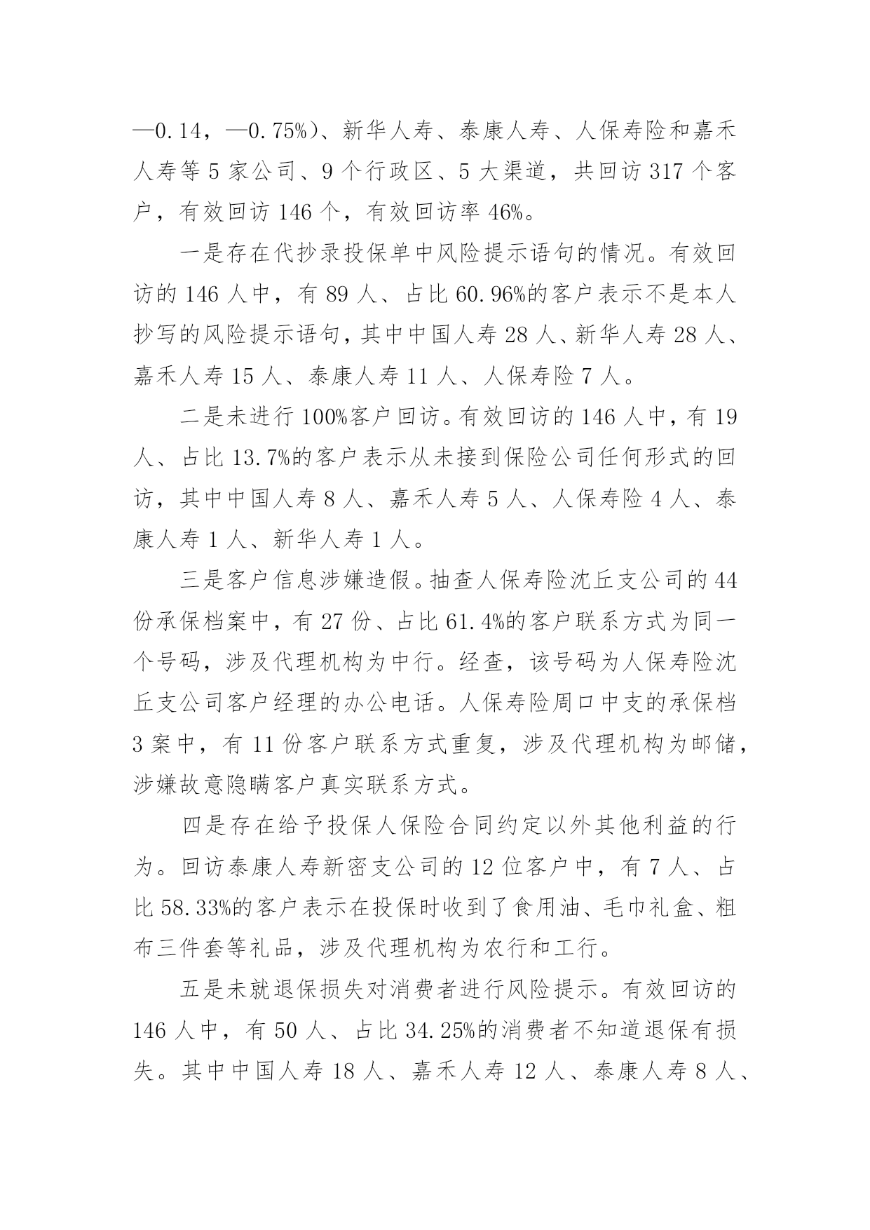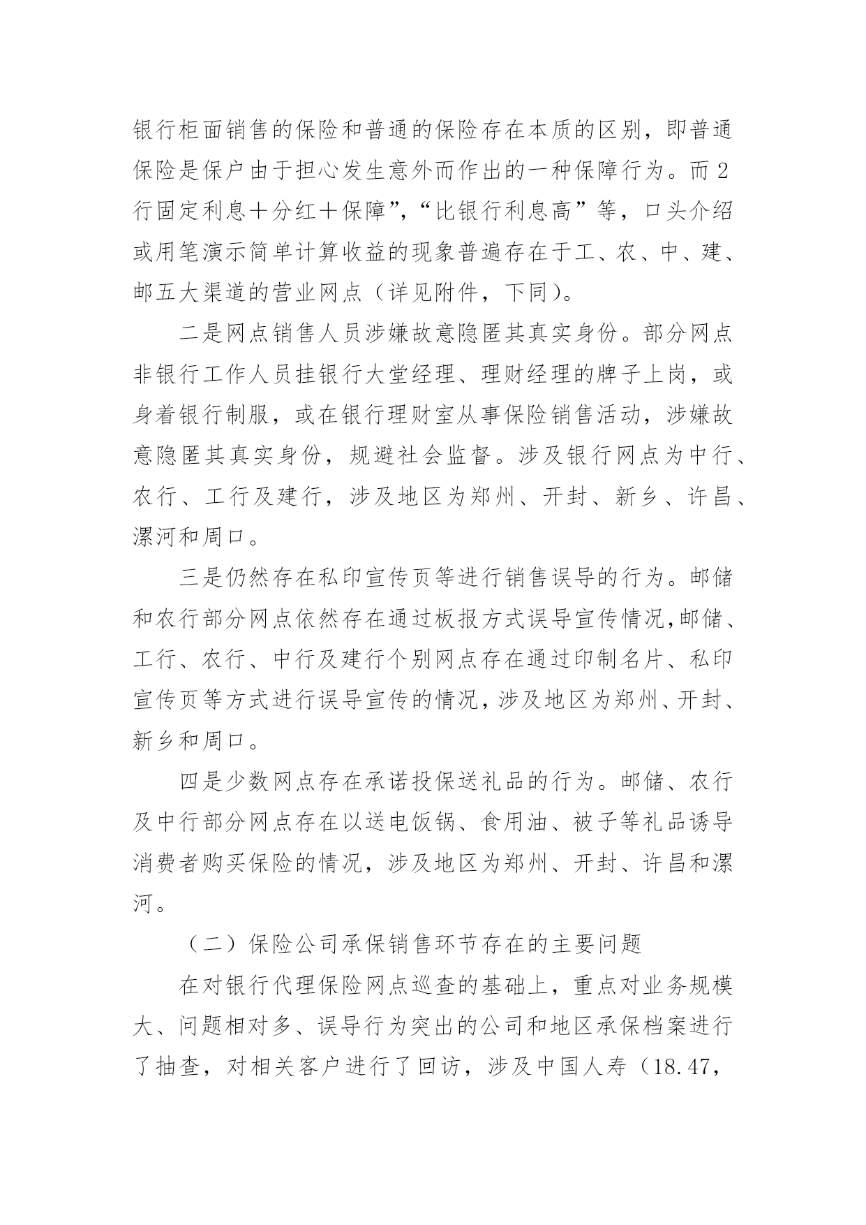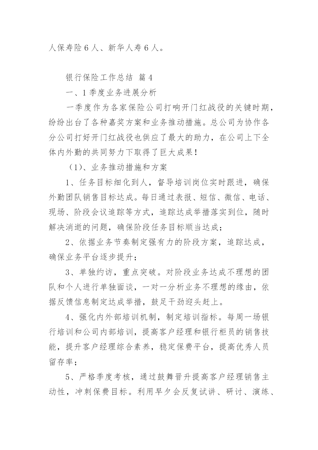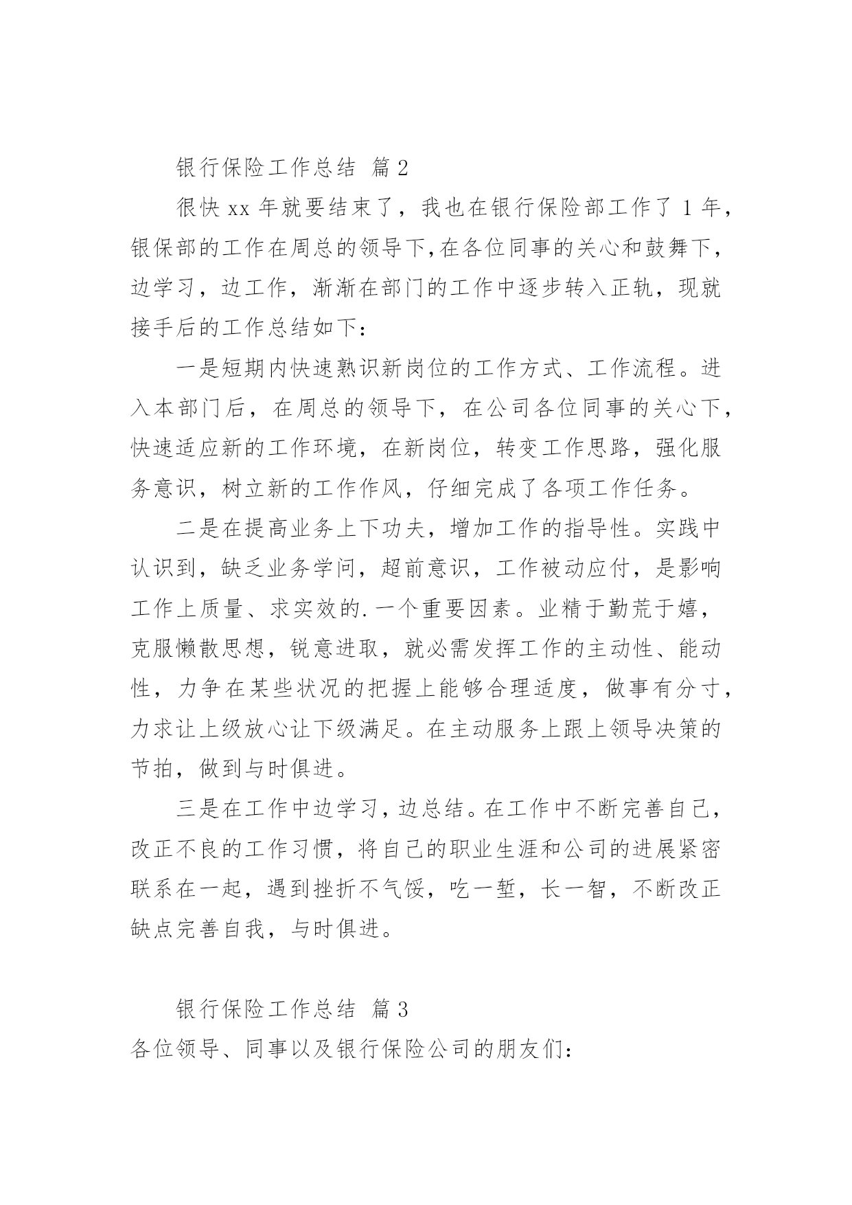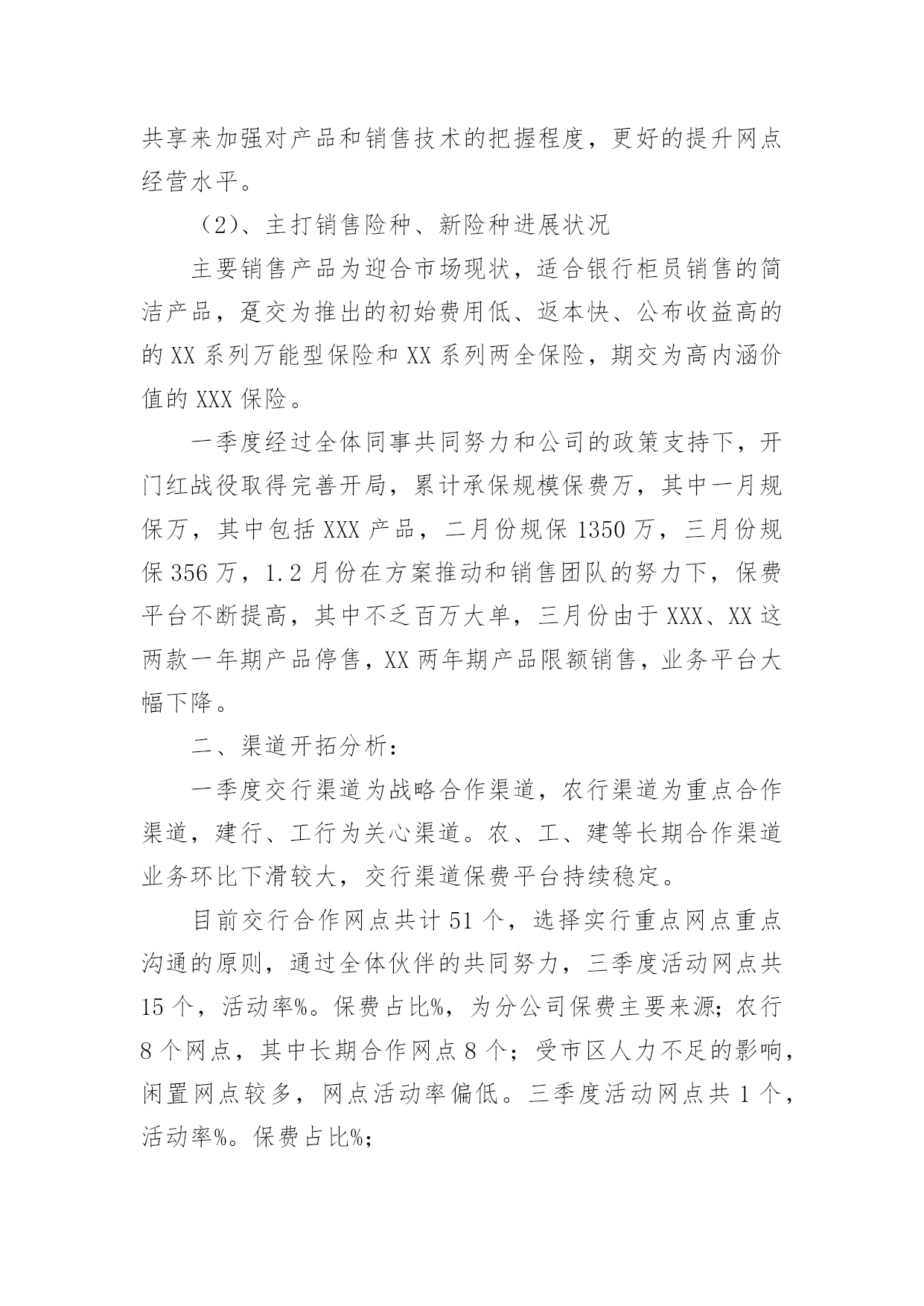 银行保险工作总结总结是指对某一阶段的工作、学习或思想中的经验或情况加以总结和概括的书面材料,它能帮我们理顺知识结构,突出重点,突破难点,不如静下心来好好写写总结吧。你所见过的总结应该是什么样的?以下是小编整理的银行保险工作总结,欢迎大家分享。银行保险工作总结篇1各位领导、同事以及银行保险公司的朋友们:非常感谢市行中间业务部、个人银行部与保险公司的举办的这次保险业务知识培训课,也非常荣幸能够给我与大家共同研讨如何作好保险代理业务的这个机会,我十分珍惜这次能与在座的各位领导、同事以及保险公司的朋友们进行近距离的交流和沟通。谈不上什么经验,只是作为一名一线员工在代理银行保险业务的时候,所感受到的一点点体会和想法。希望借此机会阐述一下个人的观点,也希望能够起个抛砖引玉的作用。最主要的目的是想:能通过我的这种形式,能够充分调动和发挥我行广大员工的聪明才智,集思广益、广开言路,多提宝贵意见和合理化建议,以促进我行保险代销工作能够迅速开展。一、分析一下我行保险代销工作的现状:我个人认为:我行尚处于银行保险营销的初级阶段。为什么是初级阶段,而不是发展阶段或加速阶段呢?我们来分析一下我行现阶段的表现就知道了。表现一:销售额度小,市场占比小。引用市行有关资料显示:代理保险业务开展几年来,在我行虽然得到大力发展,已成为我行中间业务中最具发展空间和发展潜力的业务品种之一。但是在XX年xxx市各家商业银行及邮政储蓄代理保险保费总额近XX.X亿元,其中:工商银行销售7XXX万元;农业银行销售1XXX万元;中国银行销售1XXX万元;邮政储蓄销售5XXX万元,而我行只销售了XXX万元。占比还不到XX.X%,连人家的零头都不够,今年的形势仍不乐观,上面这组数据足以说明我行代理保险业务存在的差距非常巨大。表现二:保险代销的投放入力度不够,专业客户经理的队伍尚未建成。根据我的了解,工行和农行的网点都专设了一个柜台,由专人进行保险业务的营销,而且是开放式的营销模式,即在柜台外面增设个柜台,可与客户近距离、手把手的接触,当面交流和沟通。而反观我行,则多是由前台储蓄人员,隔着厚重的防弹玻璃、通过对讲机与客户讲解,连具备保险代理人资格的营销员都凤毛麟角。这样,无论服务水平还是营销效果上看,都明显落后,很难取得客户的.信任。并且由于营销的专业人才极其匮乏和缺乏专门的营销队伍,而造成因人力不足而导致需要投保的客户资源流失的现象,在我行屡见不鲜。前面提到的与其他专业行的销售情况所显示的数据进行比较,就说明了这个问题。表现三:员工代销保险业务的思想认识和工作积极性还不够高。尽管市行领导为我们员工极力争取到大幅度提高代理保险销售的奖励费用的机会,但目前尚未在我行员工中起到理想的效果,一个不容忽视的重要原因在于在我们员工当中仍存在不少思想认识方面的问题没有得到真正解决,所以员工的积极性自然不高,并且加之销售手段单一,宣传力度不足等原因,都是造成销售额度上不去的原因。另外由于我们的dcc业务刚刚上线,大家在此方面的业务还远不够熟练,就更加加剧了目前保险代销工作停滞不前的阻力。二、找出问题的症结所在:首先,我认为,我们对待银行保险的认识上尚存在误区。银行柜面销售的保险和普通的保险存在本质的区别,即普通保险是保户由于担心发生意外而作出的一种保障行为。而银行保险的保户的心态是为了获取更多、更稳定的收益而进行的一种投资行为。保险公司通过银行或邮政储蓄等金融机构,依靠传统销售渠道和现有客户资源销售保单。此类保险产品不允许保险公司直接销售。最直观的解释为:借助银行卖保险,即银行作为保险公司的兼业代理人实现保单分销。开办代理保险业务的意义使商业银行实现与保险公司资源共享,扩大银行客户和资金来源对保险公司:借助银行完善的市场网络及广泛的公司、个人客户关系,增强市场渗透力,拓展销售渠道对商业银行:一是可扩大其客户资源。二是扩大资金来源。使商业银行为客户提供多元化、全方位的服务,满足客户多层次的金融需求促进商业银行发展中间业务,增加银行手续费收入银行保险工作总结篇2很快xx年就要结束了,我也在银行保险部工作了1年,银保部的工作在周总的领导下,在各位同事的关心和鼓舞下,边学习,边工作,渐渐在部门的工作中逐步转入正轨,现就接手后的工作总结如下:一是短期内快速熟识新岗位的工作方式、工作流程。进入本部门后,在周总的领导下,在公司各位同事的关心下,快速适应新的工作环境,在新岗位,转变工作思路,强化服务意识,树立新的工作作风,仔细完成了各项工作任务。二是在提高业务上下功夫,增加工作的指导性。实践中认识到,缺乏业务学问,超前意识,工作被动应付,是影响工作上质量、求实效的.一个重要因素。业精于勤荒于嬉,克服懒散思想,锐意进取,就必需发挥工作的主动性、能动性,力争在某些状况的把握上能够合理适度,做事有分寸,力求让上级放