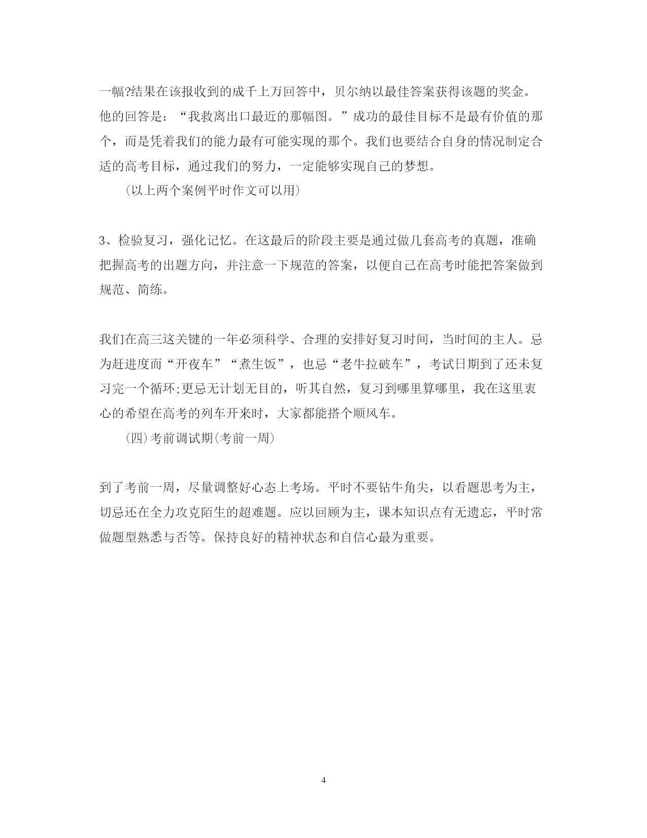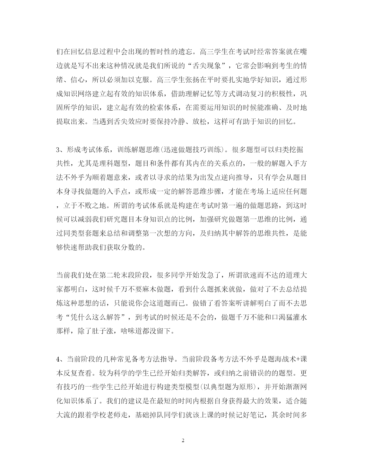 此资料由网络收集而来,如有侵权请告知上传者立即删除。资料共分享,我们负责传递知识。PAGEPAGE420XX年高考复习计划进入新高三总复习之后,可以预见学生的学习时间越来越少了,绝大多数学校或同学给自己悬上了“高考倒计时。”但大多数同学们在这个阶段普遍感到比较茫然,无从下手。新高三马上要进入第一轮复习了,所以我们也应该利用好这一年的时间,有针对性的解决现在存在的问题,为自己赢得迈向成功起点的机会。下面说一下常规的备考阶段和学习目标,以及当前我们务必要做的几件事:高三三轮复习按时间大致分为:(一)第一轮复习(9月—3月初)基础能力过关时期一边是高中三年课程的回顾,一边是知识遗漏的查找,这也是为高考总复习知识系统化、能力化做好准备的时期。高考是考三年的内容,而在高一高二落下的知识很多,而高考的其中的一个黄金定律“8020法则”,就是指高考试题的80%是基础知识,20%是稍难点的综合题,把这部分的基础做好的话,就可以上一所不错的大学。所以必须把这两年的基础知识补上,避免高考时这些知识变成失分点,自己通过做大量的题来找漏洞效果不明显而且又浪费了时间。最后以致于信心受挫,决定放弃学习了。这是学习中的最可怕的现象。我们做题不贵“多”而贵“精”。应该做囊括高考的重点、难点、考点的题和通过对照老师讲的具体内容检测出漏洞。显然大部分学生已经完成了这个阶段,如果少部分学生基础没有掌握牢固的话,还是老老实实的按照第一轮的思想去备考,因为整个高考中,基础及中等难度的分数比例非常之高,抓好基础将能获取更多的分数。(二)第二轮复习(3月初—5月中)综合能力突破时期2、构建知识体系,进行专项练习。体系是综合的根本,专题是提高的保证。我们在回忆信息过程中会出现的暂时性的遗忘。高三学生在考试时经常答案就在嘴边就是写不出来这种情况就是我们所说的“舌尖现象”,它常会影响到考生的情绪、信心,所以必须加以克服。高三学生张扬在平时要扎实地学好知识,通过形成知识网络建立起有效的知识体系,借助理解记忆等方式调动复习的积极性,巩固所学的知识,建立起有效的检索体系,在需要运用知识的时候能准确、及时地提取出来。当遇到舌尖效应时要保持冷静、放松,这样可有助于知识的回忆。3、形成考试体系,训练解题思维(迅速做题技巧训练)。很多题型可以归类挖掘共性,尤其是理科题型,题目和条件都有其内在的关系点的,一般的解题入手方法不外乎为顺着题意来,或者以寻求的结果为出发点逆向推导,只有学会从题目本身寻找做题的入手点,或形成一定的解答思维步骤,才能在考场上适应任何题,立于不败之地。所谓的考试体系就是构建在考试时第一遍的做题思路,到这时候可以减弱我们研究题目本身知识点的比例,加强研究做题第一思维的比例,通过同类型套题来总结和调整第一次想的方向,及归纳其中解答的思维共性,是能够快速帮助我们获取分数的。当前我们处在第二轮末段阶段,很多同学开始发急了,所谓欲速而不达的道理大家都明白,这时候千万不要麻木做题,看到什么题抓来就做,做对了不去总结提炼这种思想的话,只能说你会这道题而已。做错了看答案听讲解明白了而不去思考“凭什么这么解答”,到考试的时候还是不会的,做题千万不能和口渴猛灌水那样,除了肚子涨,啥味道都没留下。4、当前阶段的几种常见备考方法指导。当前阶段备考方法不外乎是题海战术+课本反复查看。较为科学的学生已经开始归类解答,或归纳之前错误的的题型。更有技巧的一些学生已经开始进行构建类型模型(以典型题为原形),并开始渐渐网化知识体系了。我们的建议是在最短的时间内根据自身获得最大的效果,适合随大流的跟着学校老师走,基础掉队同学们就该上课的时候记好笔记,其余时间多花些时间在课本与基础习题上(课本章节后习题练习),感觉在学校已经无法提升的同学,利用套题演练,类型归纳来总结和提高自己的做题精确度和速度,这时候往往是思维的比拼,而不是“努力程度”的比拼。与其花费大量时间盲目做题,不如多花点时间总结归纳会做的题型中的思维步骤,解答步骤。对于会做题,临场发挥不佳的学生,可以通过连续长时间的做套题,或者想办法耗尽精力后(如长跑后,冲刺跑后),再做卷子,或压缩做题时间(2/3~3/4的考试时间做完卷子),以训练考场状态。(三)第三轮复习(5月中—5月底)应用能力提高时期1、调整心理状态。对于每一位参加高考的学生来说,谁都希望能获得成功,而要想能发挥出自己的最高水平就应该具有“瓦伦达心态”。瓦伦达是美国走钢索的杂技演员。钢索一般悬在离地几十米的高空,没有任何人身安全保护措施,还有来自风雨等不利因素的干扰,人在上面行走,其现象可见一般,但他始终能获得成功。对此,瓦伦达说:“我走钢索时从不想到目的地,只想着走钢索这件事,专心专意地走好钢索,不管得失。”后来,心理学上把这种专注于做自己
