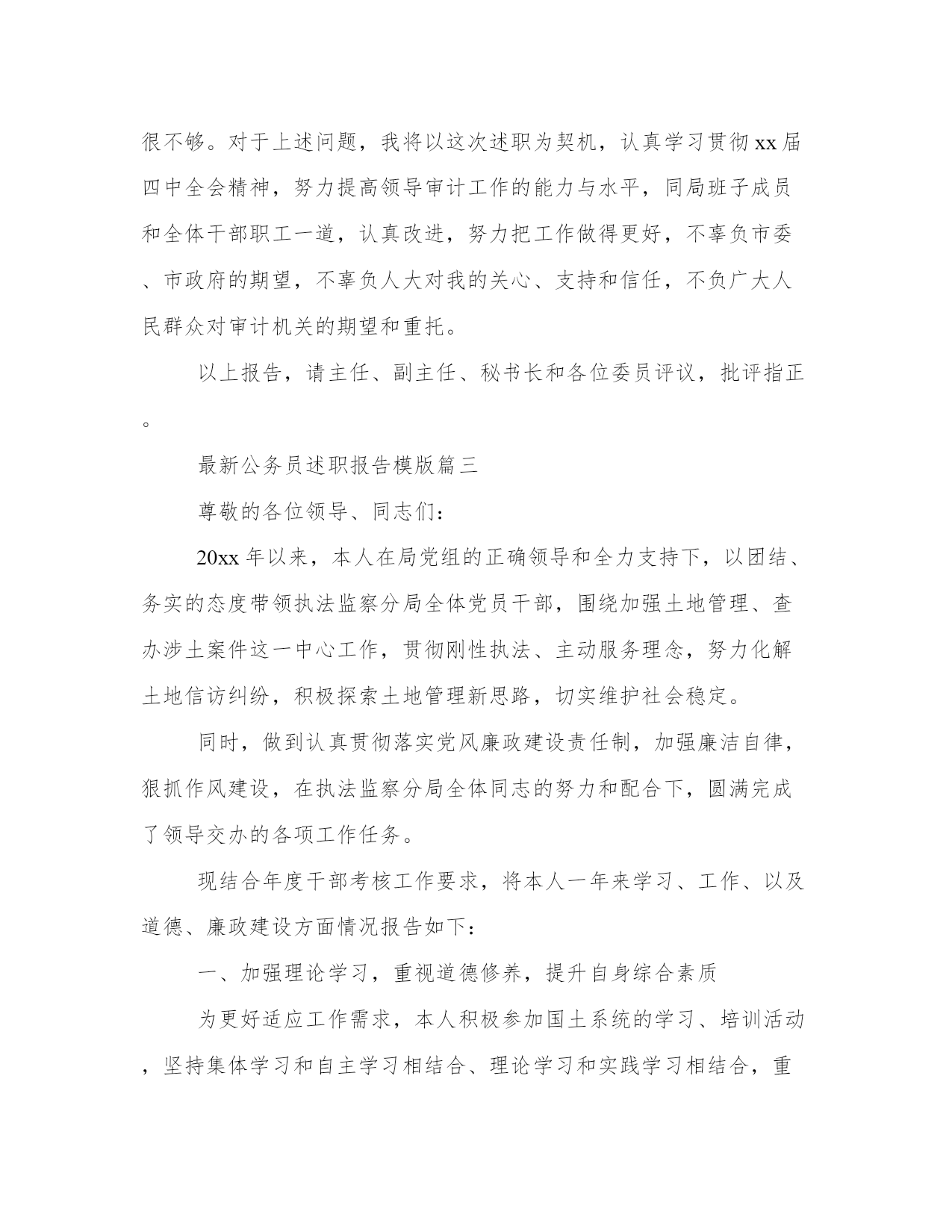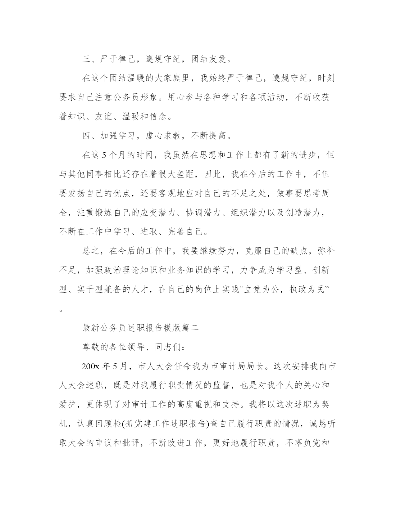最新最新公务员述职报告模版(12篇)随着社会一步步向前发展,报告不再是罕见的东西,多数报告都是在事情做完或发生后撰写的。优秀的报告都具备一些什么特点呢?又该怎么写呢?下面是小编为大家带来的报告优秀范文,希望大家可以喜欢。最新公务员述职报告模版篇一一、学习理论,提高觉悟,统一思想。作为踏入社会不久的年轻人,个人思想素质是做好每一项工作的基础。区总工会党组十分重视干部队伍的思想政治素质建设,这也使我在思想政治方面取得了很大的进步。10月份我向党支部递交了入党申请书,力争成为一名共产主义工二、边学边做,踏实做事,认真负责。应对日新月异的形势,只有加强学习才能做好工作。刚踏上新的工作岗位时,对领导分配的工作缺乏实践经验,但是,在领导及同事们的帮忙下,在自己的努力下,逐渐理清了工作思路,明晰了工作流程。在5个月的时间里,我严格要求自己,遵守各项规章制度,认真完成领导交办的各项工作,并协助*部长做好民管部各项工作,先后完成了职工文体特色品牌争创活动、20xx年工会报刊征订等工作。在领导和同志的帮忙下,我逐渐明白了,作为一名公务员,就是要敢于吃苦,甘于奉献,踏踏实实做好本职工作,认真负责地完成各项任务。三、严于律己,遵规守纪,团结友爱。在这个团结温暖的大家庭里,我始终严于律己,遵规守纪,时刻要求自己注意公务员形象。用心参与各种学习和各项活动,不断收获着知识、友谊、温暖和信念。四、加强学习,虚心求教,不断提高。在这5个月的时间,我虽然在思想和工作上都有了新的进步,但与其他同事相比还存在着很大差距,因此,我在今后的工作中,不但要发扬自己的优点,还要客观地应对自己的不足之处,做事要思考周全,注重锻炼自己的应变潜力、协调潜力、组织潜力以及创造潜力,不断在工作中学习、进取、完善自己。总之,在今后的工作中,我要继续努力,克服自己的缺点,弥补不足,加强政治理论知识和业务知识的学习,力争成为学习型、创新型、实干型兼备的人才,在自己的岗位上实践“立党为公,执政为民”。最新公务员述职报告模版篇二尊敬的各位领导、同志们:200x年5月,市人大会任命我为市审计局局长。这次安排我向市人大会述职,既是对我履行职责情况的监督,也是对我个人的关心和爱护,更体现了对审计工作的高度重视和支持。我将以这次述职为契机,认真回顾检(抓党建工作述职报告)查自己履行职责的情况,诚恳听取大会的审议和批评,不断改进工作,更好地履行职责,不辜负党和人民的重托。下面我将自己两年多来履行职责的主要情况报告如下,请审议。一、认真学习贯彻党的路线、方针、政策,坚持正确的政治方向任局长后,为了在审计工作中贯彻好党的路线、方针、政策,落实好市委、市人大和市政府的各项决策,我始终坚持把加强政治理论学习放在突出位置。两年来,我先后学习了*文选、党的十九大精神等重要政治文献,记学习笔记、体会约4万多字,不断增强政治上的敏锐性和鉴别力。二、坚决执行宪法、法律、法规和市人大的决议、决定,依法履行审计监督职责依法审计是审计机关工作的基本原则。我和局领导班子成员坚持把“立党为公,执法为民”体现到审计工作中,认真践行“三个代表”重要思想,紧紧围绕全市经济工作中心,抓住影响改革、发展、稳定的突出问题和关系人民群众切身利益的问题,确定审计项目,强化审计监督。两年多来,在市人大的关心支持下,在全体审计干部职工的共同努力下,圆满完成了各项审计任务,较好地履行了法律赋予的审计监督职责。有关具体审计工作完成情况,我在每年的预算执行审计工作报告中,都已向大会作了汇报。现在,我重点汇报一下履行职责中的主要做法及效果。(一)突出重点,逐年深化财政预算执行情况审计。根据宪法和审计法的规定,开展本级财政预算执行和其他财政收支情况审计,是审计机关的一项重要工作。两年多来,围绕落实中央和市委、市政府关于推进财政体制改革的有关政策,每年突出几个重点,把财政预算执行审计逐年推向深入。在继续扩大对一级预算单位审计覆盖面的同时,逐年加大了对二、三级单位及项目的延伸审计;为了促进提高财政资金的使用效益,从重收入审计向重支出审计转移,加大对科技、环保、支农等财政资金的审计力度;对部分重点建设资金及时进行跟踪审计;查处了一些较深层次的违纪违规问题,在整顿和规范市场经济秩序方面发挥了积极作用。(二)围绕热点,认真抓好重点行业、重点资金和重点项目的审计。针对社会反映强烈的行业不正之风和专项资金使用及重点建设项目中存在的问题,我们在审计中加大了监督力度。两年多来,先后组织了对我市居民低保、失业保险、农业投入、政府外债、医疗保险、住房公积金、救灾、扶贫、防“非”、公安行业、卫生系统、金融等29个(项)专项资金和行业的审计及调查。揭示了中石销售系统虚增资产1830万元,中国人寿保险系统不良资产2900多万元等行业存在的突出问题