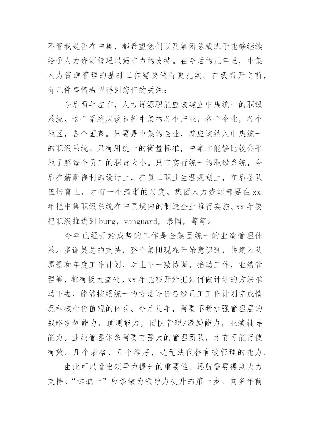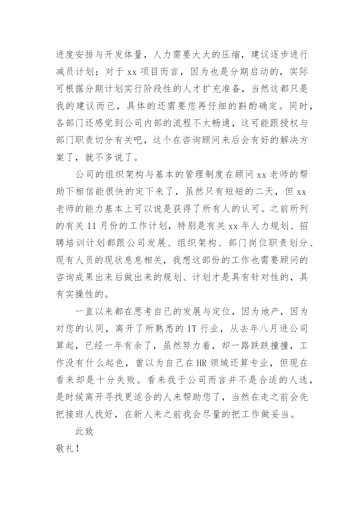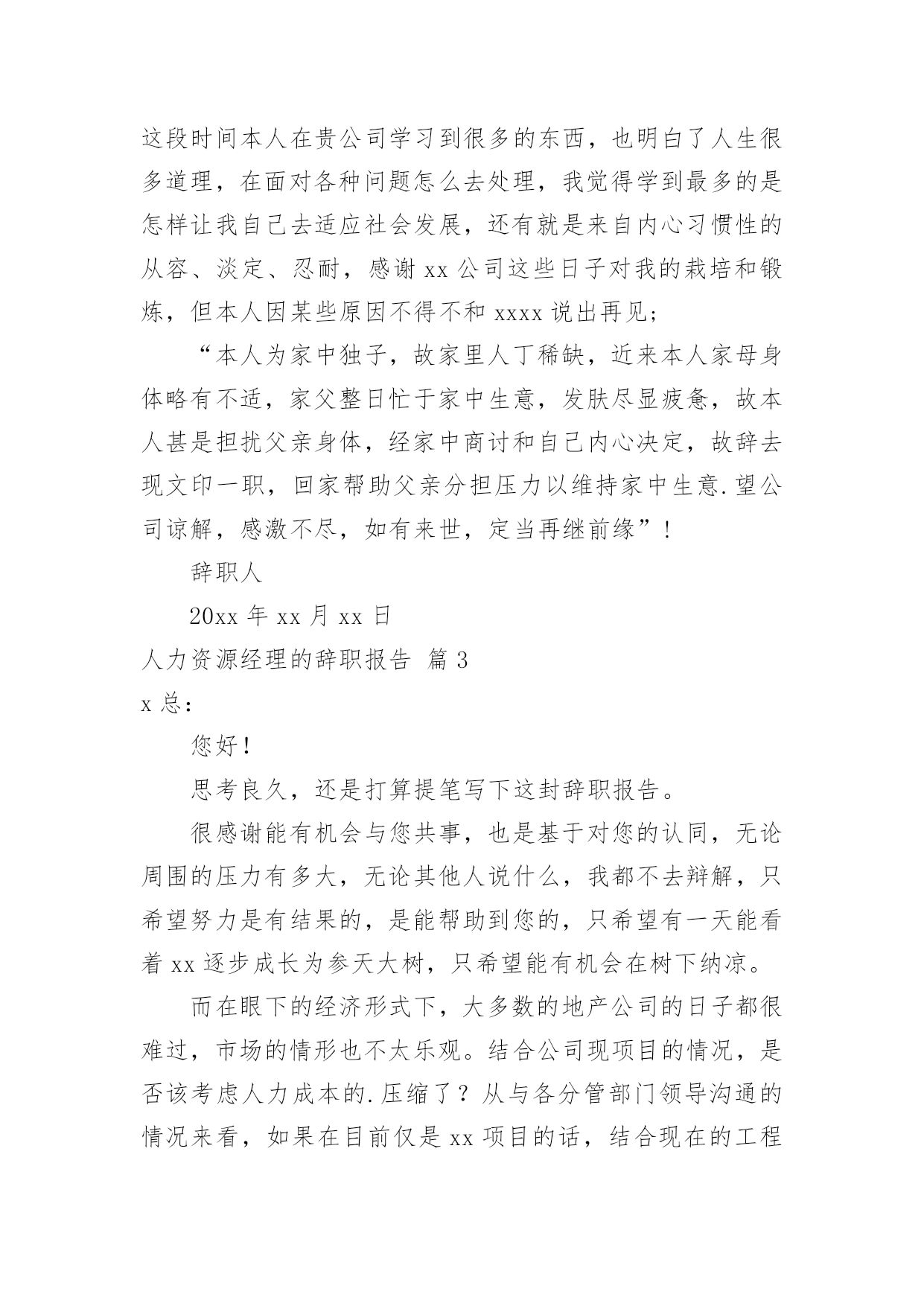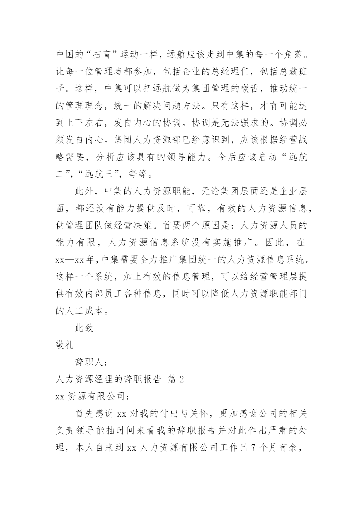 人力资源经理的辞职报告人力资源经理的辞职报告3篇在某个公司做时间长了,我们经过衡量后,会选择与现在的工作告别,这也意味着,需要写辞职报告了。那么你真的会写辞职报告吗?以下是小编精心整理的人力资源经理的辞职报告3篇,供大家参考借鉴,希望可以帮助到有需要的朋友。人力资源经理的辞职报告篇1尊敬的领导:我是xx年11月到中集。至今已有一年又六个月了。我是抱着为一个中国企业尽心尽力的意愿,买了一张单程机票,到了中集。虽然过去我在中国工作过,也和中国企业有过合资的经历,但这是我第一次在一个中国企业内担任职务。到中集的这个决定,有我的理想主义的色彩。这一年多来,我的经历丰富了很多,对中国和中国企业有了更深的了解。我很珍惜这一段经历,而且不后悔做了这个决定。还有一个月的时间,我将离开中集。五月份时,这个信息将公开于众。我们共同探讨中集人力资源管理的模式和人选,已经几个月的时间。您二位一直了解我自己的想法和计划。但是,在这几个月的工作中,您们仍然保持对我的信任,保密和敏感的工作仍然交付给我,让我看到您二位和中集的宽厚和胸怀。对此,我由衷地感谢!人力资源是支撑中集未来持续发展的战略性因素。因此,不管我是否在中集,都希望您们以及集团总裁班子能够继续给予人力资源管理以强有力的支持。在今后的几年里,中集人力资源管理的基础工作需要做得更扎实。在我离开之前,有几件事情希望得到您们的关注:今后两年左右,人力资源职能应该建立中集统一的职级系统。这个系统应该包括中集的各个产业,各个企业,各个地区,各个国家。只要是中集的企业,就应该纳入中集统一的职级系统。只有用统一的衡量标准,中集才能够比较公平地了解每个员工的职责大小。只有实行统一的职级系统,今后在薪酬福利的设计上,在员工职业生涯规划上,在后备队伍培育上,才有一个清晰的尺度。集团人力资源部要在xx年把中集职级系统在中国境内的制造企业推行实施。xx年要把职级推进到burg,vanguard,泰国,等等。今年已经开始成势的工作是全集团统一的业绩管理体系。多谢吴总的支持,整个集团现在开始意识到,共建团队愿景和年度工作计划,对上下一致协调,推动工作,业绩管理等,都有极大益处。xx年能够开始把如何做计划的方法推动下去,能够按照统一的方法评价各级员工工作计划完成情况和核心价值观的体现。今后几年,需要不断加强管理层的战略规划能力,预测能力,团队管理/激励能力,业绩辅导能力。业绩管理体系需要有强大的管理团队,才有可能行使有效。几个表格,几个程序,是无法代替有效管理的能力。由此可以看出领导力提升的重要性。远航需要得到大力支持。“远航一”应该做为领导力提升的第一步。向多年前中国的“扫盲”运动一样,远航应该走到中集的每一个角落。让每一位管理者都参加,包括企业的总经理们,包括总裁班子。这样,中集可以把远航做为集团管理的喉舌,推动统一的管理理念,统一的解决问题方法。只有这样,才有可能达到上下左右,发自内心的协调。协调是无法强求的。协调必须发自内心。集团人力资源部已经意识到,应该根据经营战略需要,分析应该具有的领导能力。今后应该启动“远航二”,“远航三”,等等。此外,中集的人力资源职能,无论集团层面还是企业层面,都还没有能力提供及时,可靠,有效的人力资源信息,供管理团队做经营决策。首要两个原因是:人力资源人员的能力有限,人力资源信息系统没有实施推广。因此,在xx—xx年,中集需要全力推广集团统一的人力资源信息系统。这样一个系统,加上有效的信息管理,可以给经营管理层提供有效内部员工各种信息,同时可以降低人力资源职能部门的人工成本。此致敬礼辞职人:人力资源经理的辞职报告篇2xx资源有限公司:首先感谢xx对我的付出与关怀,更加感谢公司的相关负责领导能抽时间来看我的辞职报告并对此作出严肃的处理,本人自来到xx人力资源有限公司工作已7个月有余,这段时间本人在贵公司学习到很多的东西,也明白了人生很多道理,在面对各种问题怎么去处理,我觉得学到最多的是怎样让我自己去适应社会发展,还有就是来自内心习惯性的从容、淡定、忍耐,感谢xx公司这些日子对我的栽培和锻炼,但本人因某些原因不得不和xxxx说出再见;“本人为家中独子,故家里人丁稀缺,近来本人家母身体略有不适,家父整日忙于家中生意,发肤尽显疲惫,故本人甚是担扰父亲身体,经家中商讨和自己内心决定,故辞去现文印一职,回家帮助父亲分担压力以维持家中生意.望公司谅解,感激不尽,如有来世,定当再继前缘”!辞职人20xx年xx月xx日人力资源经理的辞职报告篇3x总:您好!思考良久,还是打算提笔写下这封辞职报告。很感谢能有机会与您共事,也是基于对您的认同,无论周围的压力有多大,无论其他人说什么,我都不去辩解,只希望努力是有结果的,是能帮助到您的,只希望有一天能看着xx逐步成长为参天大树,只希望能有机会在树下纳凉。而在眼