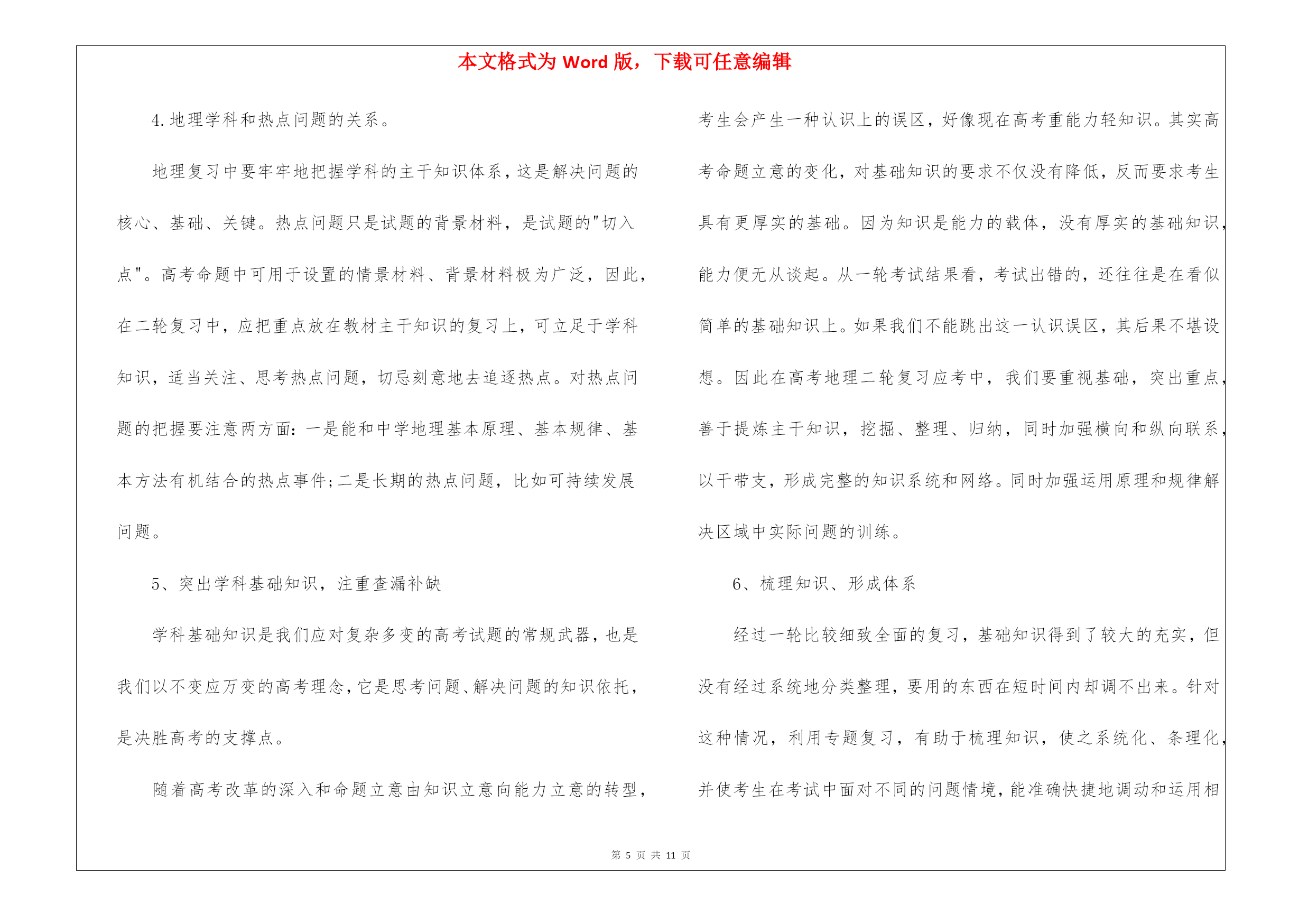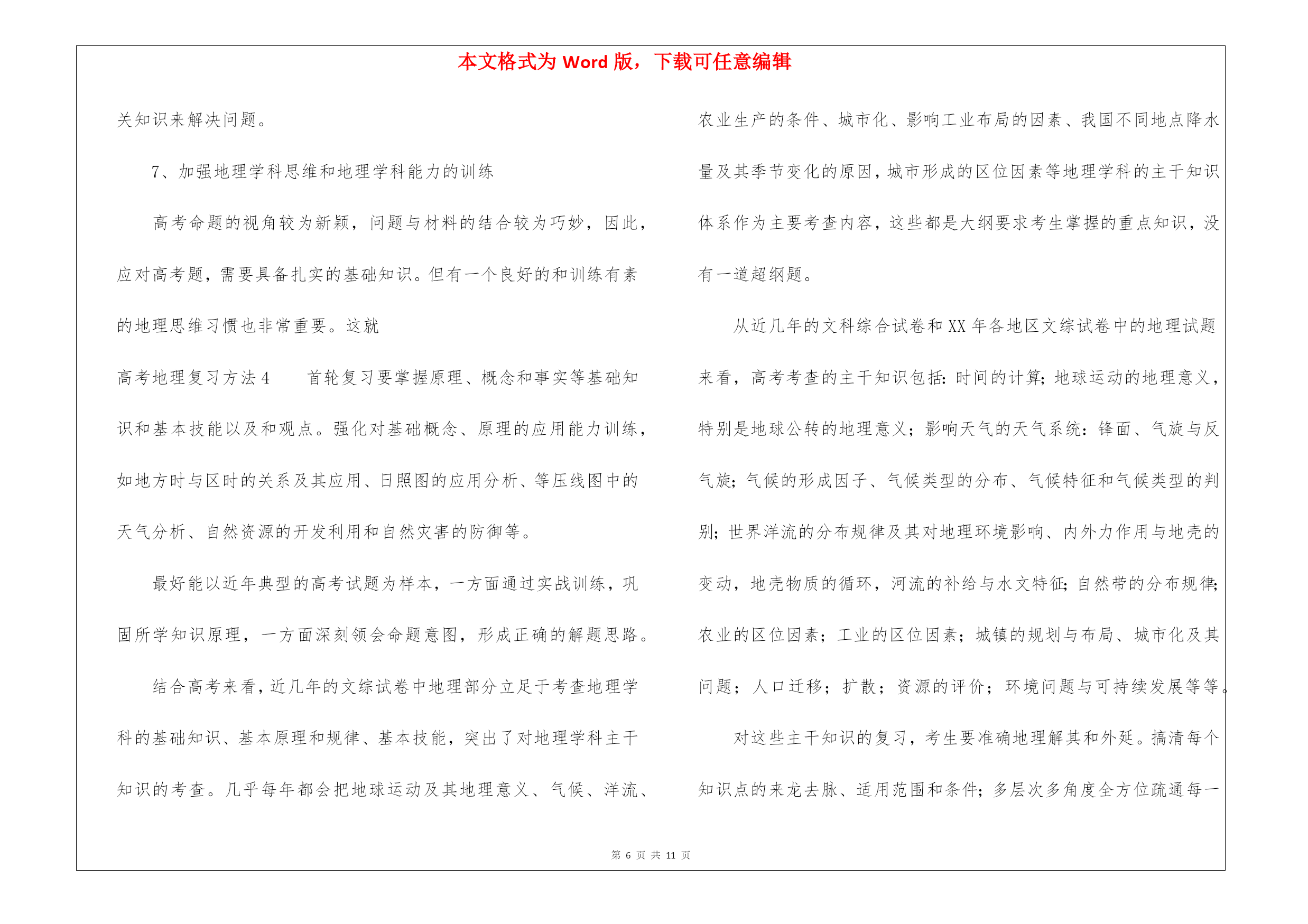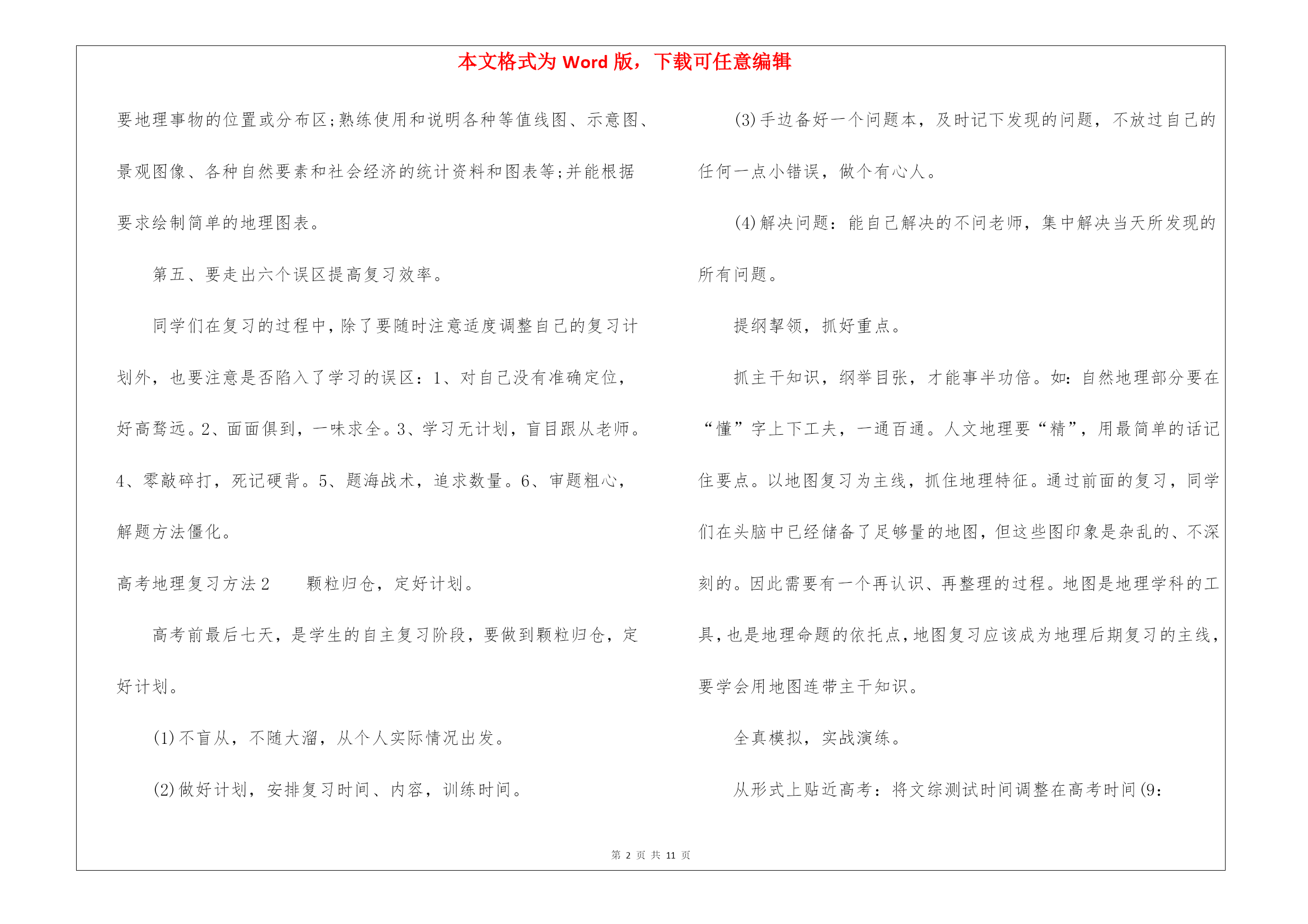 本文格式为Word版,下载可任意编辑第PAGE\*MERGEFORMAT11页共NUMPAGES\*MERGEFORMAT11页高考地理复习方法高考地理复习方法高考地理复习方法1第一、是要狠抓基础、提高能力。所谓基础,指的是基础知识、基本能力、基本的思维过程和基本的地理素养,而这些基础的复习应以教材为载体。在紧密联系教材、巩固知识的同时,使能力得到逐步提高。第二、是要围绕一个中心打好基础。中心就是主干。从近几年文科综合试卷中的地理试题来看,高考考查的主干知识包括:时间的计算;地球运动的地理意义,特别是地球公转的地理意义;影响天气的天气系统:锋面、气旋与反气旋;气候的形成因子、气候类型的分布、气候特征和气候类型的判别;世界洋流的分布规律及其对地理环境影响、内外力作用与地壳的变动等,对于这些主干知识,学生们要准确的理解其内涵和外延。搞清每个知识点的来龙去脉、适用范围和条件。多层次、多角度、全方位疏通每一个知识点。还要对重点知识进行系列整理,理清知识间的横向关系和纵向联系,逐步构建自己的知识体系框架,形成知识网络图。第三、是要形成两个习惯。一个是尽早训练,形成正确的答题习惯。另一个是形成关注热点、拓宽视野的习惯。第四、抓住三种图表,提高识别地理特征的能力。图表是地理学的第二语言,其突出特点是将“空间概念”或“可量化”的地理事物用直观形象的形式表现出来。考试也经常以图表为载体考察地理知识,联系政治、历史。图表可分为三种:一是等值线图,如等高线、等温线、等压线(面)、等盐度线、等降水量、等震线、等潜水位线等;二是统计图表;三是区域地图。通过一轮复习,学生应能做到熟练解读各种比例尺的地图及地形剖面图,并能在图上识别主要地理事物的位置或分布区;熟练使用和说明各种等值线图、示意图、景观图像、各种自然要素和社会经济的统计资料和图表等;并能根据要求绘制简单的地理图表。第五、要走出六个误区提高复习效率。同学们在复习的过程中,除了要随时注意适度调整自己的复习计划外,也要注意是否陷入了学习的误区:1、对自己没有准确定位,好高骛远。2、面面俱到,一味求全。3、学习无计划,盲目跟从老师。4、零敲碎打,死记硬背。5、题海战术,追求数量。6、审题粗心,解题方法僵化。高考地理复习方法2颗粒归仓,定好计划。高考前最后七天,是学生的自主复习阶段,要做到颗粒归仓,定好计划。(1)不盲从,不随大溜,从个人实际情况出发。(2)做好计划,安排复习时间、内容,训练时间。(3)手边备好一个问题本,及时记下发现的问题,不放过自己的任何一点小错误,做个有心人。(4)解决问题:能自己解决的不问老师,集中解决当天所发现的所有问题。提纲挈领,抓好重点。抓主干知识,纲举目张,才能事半功倍。如:自然地理部分要在“懂”字上下工夫,一通百通。人文地理要“精”,用最简单的话记住要点。以地图复习为主线,抓住地理特征。通过前面的复习,同学们在头脑中已经储备了足够量的地图,但这些图印象是杂乱的、不深刻的。因此需要有一个再认识、再整理的过程。地图是地理学科的工具,也是地理命题的依托点,地图复习应该成为地理后期复习的主线,要学会用地图连带主干知识。全真模拟,实战演练。从形式上贴近高考:将文综测试时间调整在高考时间(9:00—11:30)的仿真模拟,单科地理的训练题目改为特定时间内的11个选择题和两道综合题,更多的发现问题并及时的解决问题。通过做精心编制的模拟题,训练答题技巧,培养审题、纠错灵感。同时抓答题的规范,答题常规训练,防止答题因不规范和卷面不整洁失分。对每一套题目都要做到“一题三吃”,即命题意图、解题思路、致错分析补救。要求提高快速获取有用信息、分析整理信息、组织答案的能力。答题时不能就事论事,关键是掌握解题思路,认真理解地理重要的原理、规律,辨析概念,做到所答为所问。同时还要重视答题语言的组织和表述的规范性。高考地理复习方法3为了更好地搞好高三地理学科的第二轮复习,提高学生应考能力,以便在高考中取得更好成绩,经议定:第二轮复习(从4月3日—5月31日)共用8周时间,讲练结合为主,查缺补漏;专题复习为主,共议定8个专题;每周做文综一套,学科综合试题一套,专题复习卷一张;注重解题思路,规范答题;注重思维方法,强调知识的整合,迁移、联想及应用;注重应考能力的训练,注重学科特征,强调解题切入准确,条理清楚,逻辑性强。表现准确完整。重视文科焦点、热点知识,注重因材施解。附:专题内容如下:1、地理的空间定位2、等值线的判读与图表分析3、圈层物质运动规律4、气候的形成因子分析5、区位因素分析6、光照图判读与时间计算7、世界热点问题和热点区域8、中国热点问题和热点区域相比高考地理一轮复习,高考地理二轮复习是在第一轮全面扫描基础上的提高和深化。一方面时间较短,总计只有不到两个月的时间;另一方面,