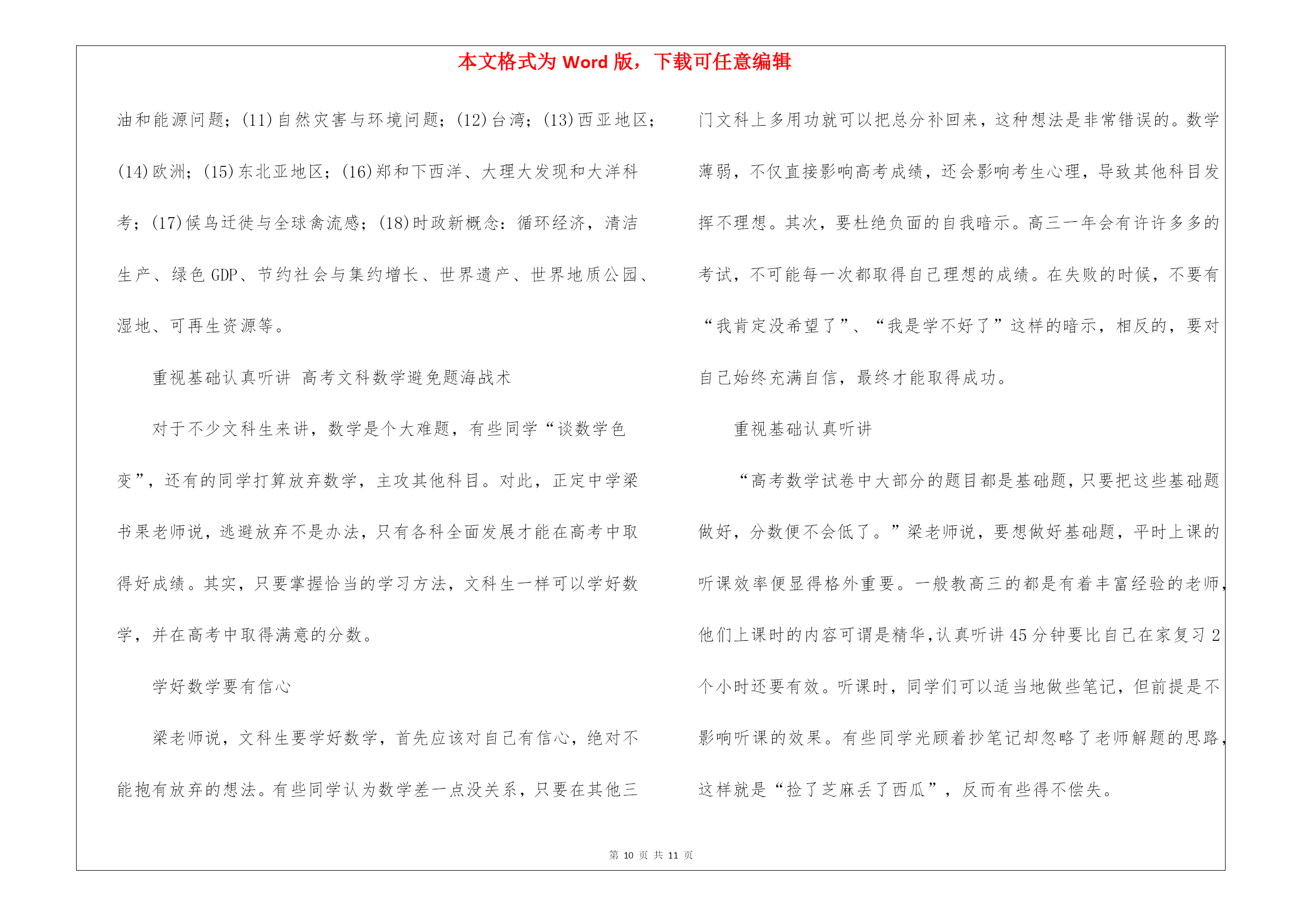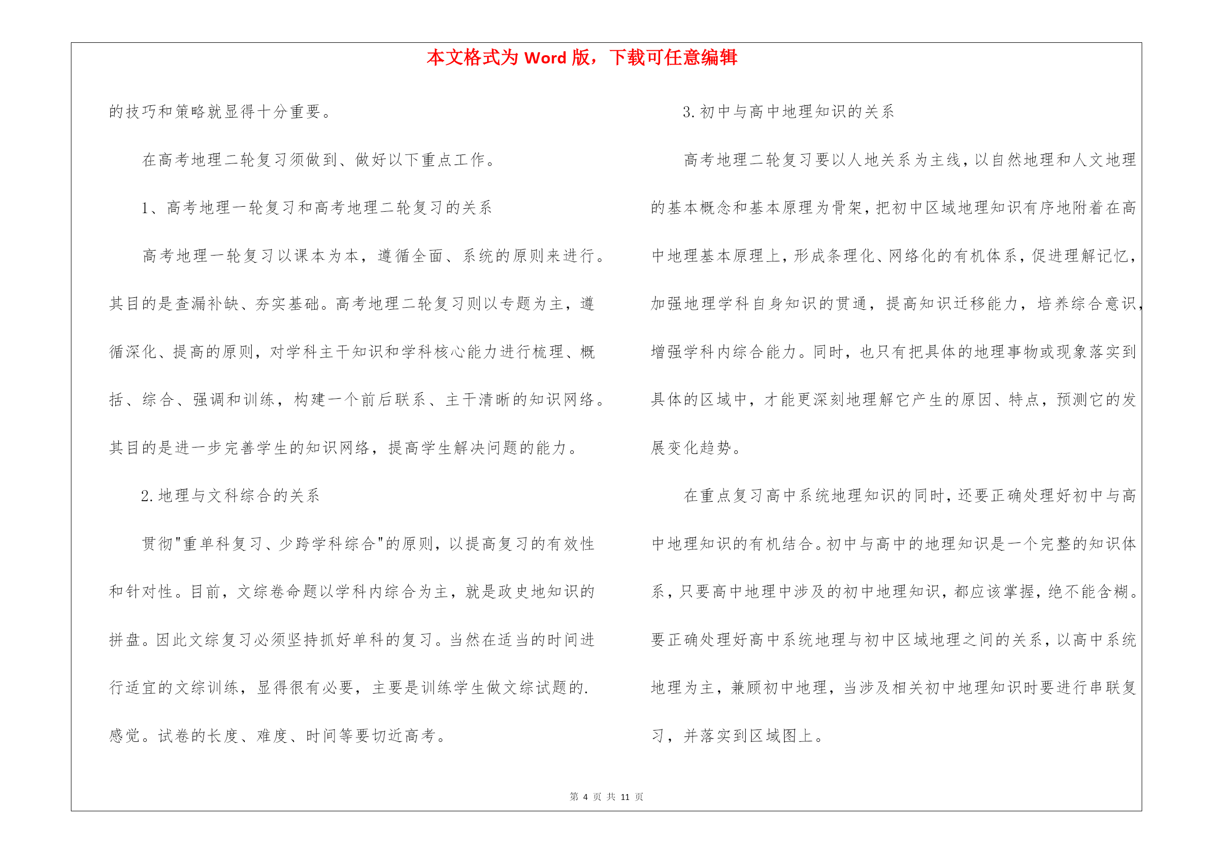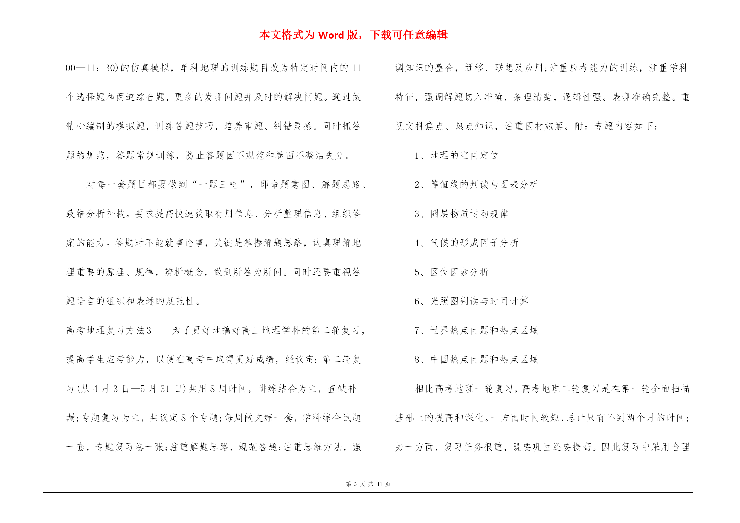 本文格式为Word版,下载可任意编辑第PAGE\*MERGEFORMAT11页共NUMPAGES\*MERGEFORMAT11页高考地理复习方法高考地理复习方法高考地理复习方法1第一、是要狠抓基础、提高能力。所谓基础,指的是基础知识、基本能力、基本的思维过程和基本的地理素养,而这些基础的复习应以教材为载体。在紧密联系教材、巩固知识的同时,使能力得到逐步提高。第二、是要围绕一个中心打好基础。中心就是主干。从近几年文科综合试卷中的地理试题来看,高考考查的主干知识包括:时间的计算;地球运动的地理意义,特别是地球公转的地理意义;影响天气的天气系统:锋面、气旋与反气旋;气候的形成因子、气候类型的分布、气候特征和气候类型的判别;世界洋流的分布规律及其对地理环境影响、内外力作用与地壳的变动等,对于这些主干知识,学生们要准确的理解其内涵和外延。搞清每个知识点的来龙去脉、适用范围和条件。多层次、多角度、全方位疏通每一个知识点。还要对重点知识进行系列整理,理清知识间的横向关系和纵向联系,逐步构建自己的知识体系框架,形成知识网络图。第三、是要形成两个习惯。一个是尽早训练,形成正确的答题习惯。另一个是形成关注热点、拓宽视野的习惯。第四、抓住三种图表,提高识别地理特征的能力。图表是地理学的第二语言,其突出特点是将“空间概念”或“可量化”的地理事物用直观形象的形式表现出来。考试也经常以图表为载体考察地理知识,联系政治、历史。图表可分为三种:一是等值线图,如等高线、等温线、等压线(面)、等盐度线、等降水量、等震线、等潜水位线等;二是统计图表;三是区域地图。通过一轮复习,学生应能做到熟练解读各种比例尺的地图及地形剖面图,并能在图上识别主要地理事物的位置或分布区;熟练使用和说明各种等值线图、示意图、景观图像、各种自然要素和社会经济的统计资料和图表等;并能根据要求绘制简单的地理图表。第五、要走出六个误区提高复习效率。同学们在复习的过程中,除了要随时注意适度调整自己的复习计划外,也要注意是否陷入了学习的误区:1、对自己没有准确定位,好高骛远。2、面面俱到,一味求全。3、学习无计划,盲目跟从老师。4、零敲碎打,死记硬背。5、题海战术,追求数量。6、审题粗心,解题方法僵化。高考地理复习方法2颗粒归仓,定好计划。高考前最后七天,是学生的自主复习阶段,要做到颗粒归仓,定好计划。(1)不盲从,不随大溜,从个人实际情况出发。(2)做好计划,安排复习时间、内容,训练时间。(3)手边备好一个问题本,及时记下发现的问题,不放过自己的任何一点小错误,做个有心人。(4)解决问题:能自己解决的不问老师,集中解决当天所发现的所有问题。提纲挈领,抓好重点。抓主干知识,纲举目张,才能事半功倍。如:自然地理部分要在“懂”字上下工夫,一通百通。人文地理要“精”,用最简单的话记住要点。以地图复习为主线,抓住地理特征。通过前面的复习,同学们在头脑中已经储备了足够量的地图,但这些图印象是杂乱的、不深刻的。因此需要有一个再认识、再整理的过程。地图是地理学科的工具,也是地理命题的依托点,地图复习应该成为地理后期复习的主线,要学会用地图连带主干知识。全真模拟,实战演练。从形式上贴近高考:将文综测试时间调整在高考时间(9:00—11:30)的仿真模拟,单科地理的训练题目改为特定时间内的11个选择题和两道综合题,更多的发现问题并及时的解决问题。通过做精心编制的模拟题,训练答题技巧,培养审题、纠错灵感。同时抓答题的规范,答题常规训练,防止答题因不规范和卷面不整洁失分。对每一套题目都要做到“一题三吃”,即命题意图、解题思路、致错分析补救。要求提高快速获取有用信息、分析整理信息、组织答案的能力。答题时不能就事论事,关键是掌握解题思路,认真理解地理重要的原理、规律,辨析概念,做到所答为所问。同时还要重视答题语言的组织和表述的规范性。高考地理复习方法3为了更好地搞好高三地理学科的第二轮复习,提高学生应考能力,以便在高考中取得更好成绩,经议定:第二轮复习(从4月3日—5月31日)共用8周时间,讲练结合为主,查缺补漏;专题复习为主,共议定8个专题;每周做文综一套,学科综合试题一套,专题复习卷一张;注重解题思路,规范答题;注重思维方法,强调知识的整合,迁移、联想及应用;注重应考能力的训练,注重学科特征,强调解题切入准确,条理清楚,逻辑性强。表现准确完整。重视文科焦点、热点知识,注重因材施解。附:专题内容如下:1、地理的空间定位2、等值线的判读与图表分析3、圈层物质运动规律4、气候的形成因子分析5、区位因素分析6、光照图判读与时间计算7、世界热点问题和热点区域8、中国热点问题和热点区域相比高考地理一轮复习,高考地理二轮复习是在第一轮全面扫描基础上的提高和深化。一方面时间较短,总计只有不到两个月的时间;另一方面,