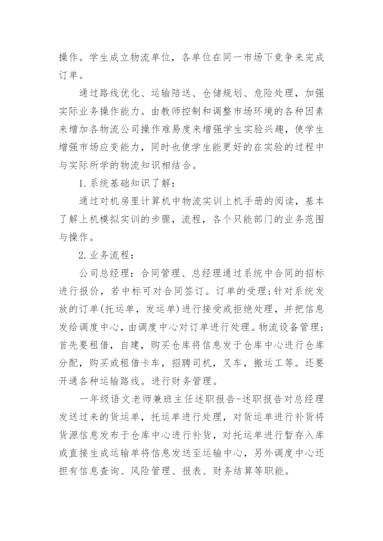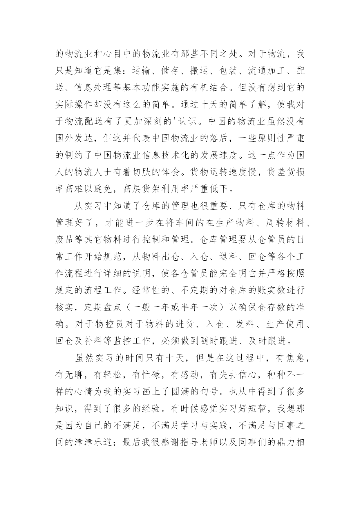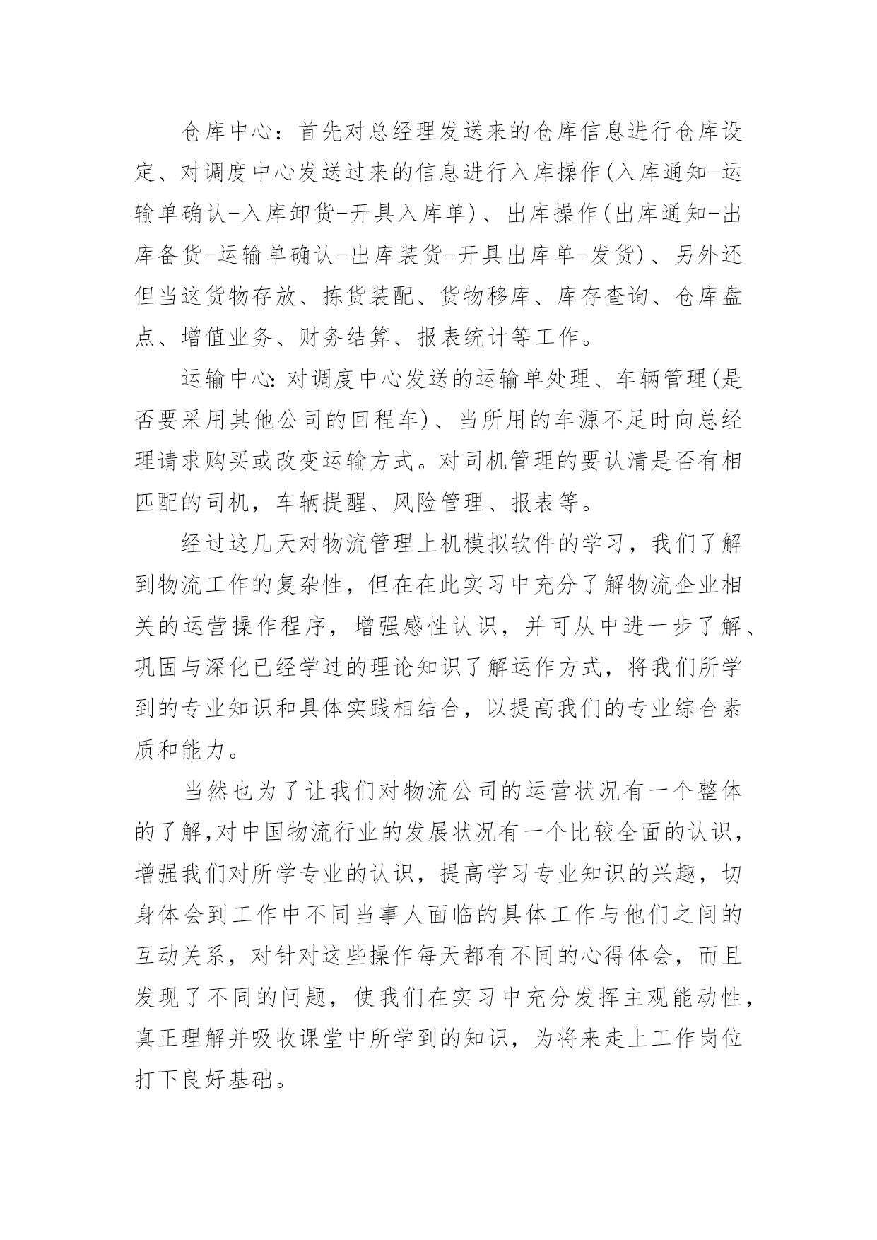 物流专业实习报告物流专业实习报告模板集锦10篇我们眼下的社会,报告的用途越来越大,报告中提到的所有信息应该是准确无误的。那么报告应该怎么写才合适呢?下面是小编帮大家整理的物流专业实习报告10篇,希望对大家有所帮助。物流专业实习报告篇1为了更好的适应以后的学习和工作,在本学期末,由学校统一安排利用XX物流管理软件进行实习。我们将所学到的专业知识和具体实践相结合,以提高我们的专业综合素质和能力,当然也为了让我们对物流公司的运营状况有一个整体的了解,物流的特点,主要设备和作业流程,运营管理,增强同学们对所学专业的认识,提高学习专业知识的兴趣,深化对所学知识的理解,以便即将迈入社会的我们能够更好的适应以后的学习和工作,为以后的学习和工作打下坚实的基础。物流”作为国民经济发展的动脉和基础产业,是一种新的`生产力,是新的经济增长点。针对对这一物流形式学校利用浙科物流管理软件给我们一个更广泛的了解机会,软件中分公司总经理、调度中心、仓库中心、运输中心、四个角色来模拟现实的物流公司在一个模拟的市场环境中的实际操作。学生成立物流单位,各单位在同一市场下竞争来完成订单。通过路线优化、运输陪送、仓储规划、危险处理,加强实际业务操作能力。由教师控制和调整市场环境的各种因素来增加各物流公司操作难易度来增强学生实验兴趣,使学生增强市场应变能力,同时也使学生能更好的在实验的过程中与实际所学的物流知识相结合。1.系统基础知识了解:通过对机房里计算机中物流实训上机手册的阅读,基本了解上机模拟实训的步骤,流程,各个只能部门的业务范围与操作。2.业务流程:公司总经理:合同管理、总经理通过系统中合同的招标进行报价,若中标可对合同签订。订单的受理;针对系统发放的订单(托运单,发运单)进行接受或拒绝处理,并把信息发给调度中心,由调度中心对订单进行处理。物流设备管理;首先要租借,自建,购买仓库将信息发于仓库中心进行仓库分配,购买或租借卡车,招聘司机,叉车,搬运工等。还要开通各种运输路线。进行财务管理。一年级语文老师兼班主任述职报告-述职报告对总经理发送过来的货运单,托运单进行处理,对货运单进行补货将货源信息发布于仓库中心进行补货,对托运单进行暂存入库或直接生成运输单将信息发送至运输中心,另外调度中心还担有信息查询、风险管理、报表、财务结算等职能。仓库中心:首先对总经理发送来的仓库信息进行仓库设定、对调度中心发送过来的信息进行入库操作(入库通知-运输单确认-入库卸货-开具入库单)、出库操作(出库通知-出库备货-运输单确认-出库装货-开具出库单-发货)、另外还但当这货物存放、拣货装配、货物移库、库存查询、仓库盘点、增值业务、财务结算、报表统计等工作。运输中心:对调度中心发送的运输单处理、车辆管理(是否要采用其他公司的回程车)、当所用的车源不足时向总经理请求购买或改变运输方式。对司机管理的要认清是否有相匹配的司机,车辆提醒、风险管理、报表等。经过这几天对物流管理上机模拟软件的学习,我们了解到物流工作的复杂性,但在在此实习中充分了解物流企业相关的运营操作程序,增强感性认识,并可从中进一步了解、巩固与深化已经学过的理论知识了解运作方式,将我们所学到的专业知识和具体实践相结合,以提高我们的专业综合素质和能力。当然也为了让我们对物流公司的运营状况有一个整体的了解,对中国物流行业的发展状况有一个比较全面的认识,增强我们对所学专业的认识,提高学习专业知识的兴趣,切身体会到工作中不同当事人面临的具体工作与他们之间的互动关系,对针对这些操作每天都有不同的心得体会,而且发现了不同的问题,使我们在实习中充分发挥主观能动性,真正理解并吸收课堂中所学到的知识,为将来走上工作岗位打下良好基础。总而言之,在上机实习的这几天时间里,使我学到了书本上无法到的东西。是课本知识的再度升华,是从感性认识上升为理性认识的过程。感谢学校给予我们的这次实习机会和老师们的实习教导。物流专业实习报告篇2有一名话叫做:不经过风雨,怎么见彩虹?我想改一下:不真正进入社会,怎能了解社会呢?在这次实习中,给我收获最大的是我觉得很多工作需要我去摸索和探讨,要不怕吃苦,勇于激流勇进,有的工作虽然单挑又重复,但这是磨练意志最有效的方法,我告诫自己要认真完成,对每项工作都要他看成是公司对自己的一次考核,做到每一件事的过程中遇到困难,一定要争取不抛弃,不放弃,坚持“战斗”,只要希望还在,胜利一定属于我们。在此次专业实习的过程中,我们参观了公司a,公司b,并参加了两次讲座,从实际到理论,加深了我们对物流专业的理解,和对于与社会接轨的深刻感受。作为学生,我们更多的是课本的知识的理解,理论的优势是我们的特色,但是怎样将理论结合实际却是摆在我们面前的难题。而参观公司a和公司b正视给了我们直观的解读。公司a建立了一整套符合国际标准的质量、成本和交付