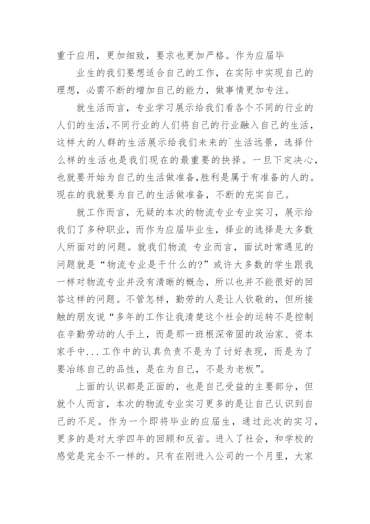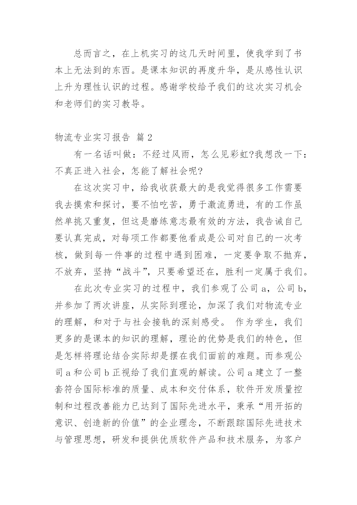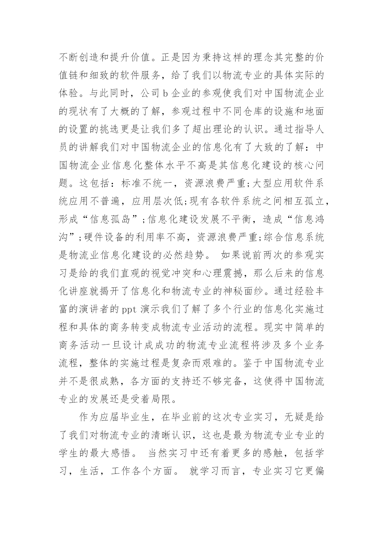 物流专业实习报告物流专业实习报告模板集锦10篇我们眼下的社会,报告的用途越来越大,报告中提到的所有信息应该是准确无误的。那么报告应该怎么写才合适呢?下面是小编帮大家整理的物流专业实习报告10篇,希望对大家有所帮助。物流专业实习报告篇1为了更好的适应以后的学习和工作,在本学期末,由学校统一安排利用XX物流管理软件进行实习。我们将所学到的专业知识和具体实践相结合,以提高我们的专业综合素质和能力,当然也为了让我们对物流公司的运营状况有一个整体的了解,物流的特点,主要设备和作业流程,运营管理,增强同学们对所学专业的认识,提高学习专业知识的兴趣,深化对所学知识的理解,以便即将迈入社会的我们能够更好的适应以后的学习和工作,为以后的学习和工作打下坚实的基础。物流”作为国民经济发展的动脉和基础产业,是一种新的`生产力,是新的经济增长点。针对对这一物流形式学校利用浙科物流管理软件给我们一个更广泛的了解机会,软件中分公司总经理、调度中心、仓库中心、运输中心、四个角色来模拟现实的物流公司在一个模拟的市场环境中的实际操作。学生成立物流单位,各单位在同一市场下竞争来完成订单。通过路线优化、运输陪送、仓储规划、危险处理,加强实际业务操作能力。由教师控制和调整市场环境的各种因素来增加各物流公司操作难易度来增强学生实验兴趣,使学生增强市场应变能力,同时也使学生能更好的在实验的过程中与实际所学的物流知识相结合。1.系统基础知识了解:通过对机房里计算机中物流实训上机手册的阅读,基本了解上机模拟实训的步骤,流程,各个只能部门的业务范围与操作。2.业务流程:公司总经理:合同管理、总经理通过系统中合同的招标进行报价,若中标可对合同签订。订单的受理;针对系统发放的订单(托运单,发运单)进行接受或拒绝处理,并把信息发给调度中心,由调度中心对订单进行处理。物流设备管理;首先要租借,自建,购买仓库将信息发于仓库中心进行仓库分配,购买或租借卡车,招聘司机,叉车,搬运工等。还要开通各种运输路线。进行财务管理。一年级语文老师兼班主任述职报告-述职报告对总经理发送过来的货运单,托运单进行处理,对货运单进行补货将货源信息发布于仓库中心进行补货,对托运单进行暂存入库或直接生成运输单将信息发送至运输中心,另外调度中心还担有信息查询、风险管理、报表、财务结算等职能。仓库中心:首先对总经理发送来的仓库信息进行仓库设定、对调度中心发送过来的信息进行入库操作(入库通知-运输单确认-入库卸货-开具入库单)、出库操作(出库通知-出库备货-运输单确认-出库装货-开具出库单-发货)、另外还但当这货物存放、拣货装配、货物移库、库存查询、仓库盘点、增值业务、财务结算、报表统计等工作。运输中心:对调度中心发送的运输单处理、车辆管理(是否要采用其他公司的回程车)、当所用的车源不足时向总经理请求购买或改变运输方式。对司机管理的要认清是否有相匹配的司机,车辆提醒、风险管理、报表等。经过这几天对物流管理上机模拟软件的学习,我们了解到物流工作的复杂性,但在在此实习中充分了解物流企业相关的运营操作程序,增强感性认识,并可从中进一步了解、巩固与深化已经学过的理论知识了解运作方式,将我们所学到的专业知识和具体实践相结合,以提高我们的专业综合素质和能力。当然也为了让我们对物流公司的运营状况有一个整体的了解,对中国物流行业的发展状况有一个比较全面的认识,增强我们对所学专业的认识,提高学习专业知识的兴趣,切身体会到工作中不同当事人面临的具体工作与他们之间的互动关系,对针对这些操作每天都有不同的心得体会,而且发现了不同的问题,使我们在实习中充分发挥主观能动性,真正理解并吸收课堂中所学到的知识,为将来走上工作岗位打下良好基础。总而言之,在上机实习的这几天时间里,使我学到了书本上无法到的东西。是课本知识的再度升华,是从感性认识上升为理性认识的过程。感谢学校给予我们的这次实习机会和老师们的实习教导。物流专业实习报告篇2有一名话叫做:不经过风雨,怎么见彩虹?我想改一下:不真正进入社会,怎能了解社会呢?在这次实习中,给我收获最大的是我觉得很多工作需要我去摸索和探讨,要不怕吃苦,勇于激流勇进,有的工作虽然单挑又重复,但这是磨练意志最有效的方法,我告诫自己要认真完成,对每项工作都要他看成是公司对自己的一次考核,做到每一件事的过程中遇到困难,一定要争取不抛弃,不放弃,坚持“战斗”,只要希望还在,胜利一定属于我们。在此次专业实习的过程中,我们参观了公司a,公司b,并参加了两次讲座,从实际到理论,加深了我们对物流专业的理解,和对于与社会接轨的深刻感受。作为学生,我们更多的是课本的知识的理解,理论的优势是我们的特色,但是怎样将理论结合实际却是摆在我们面前的难题。而参观公司a和公司b正视给了我们直观的解读。公司a建立了一整套符合国际标准的质量、成本和交付
