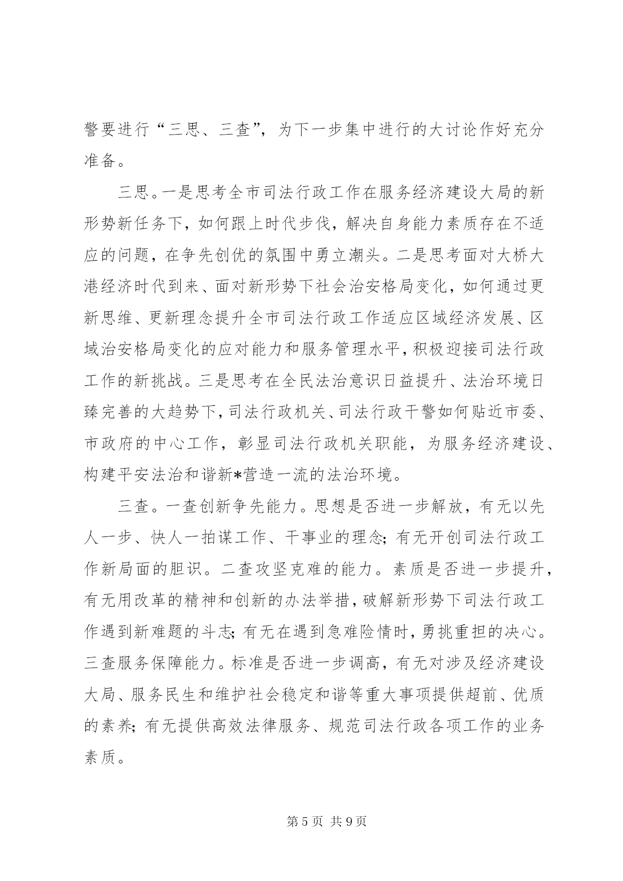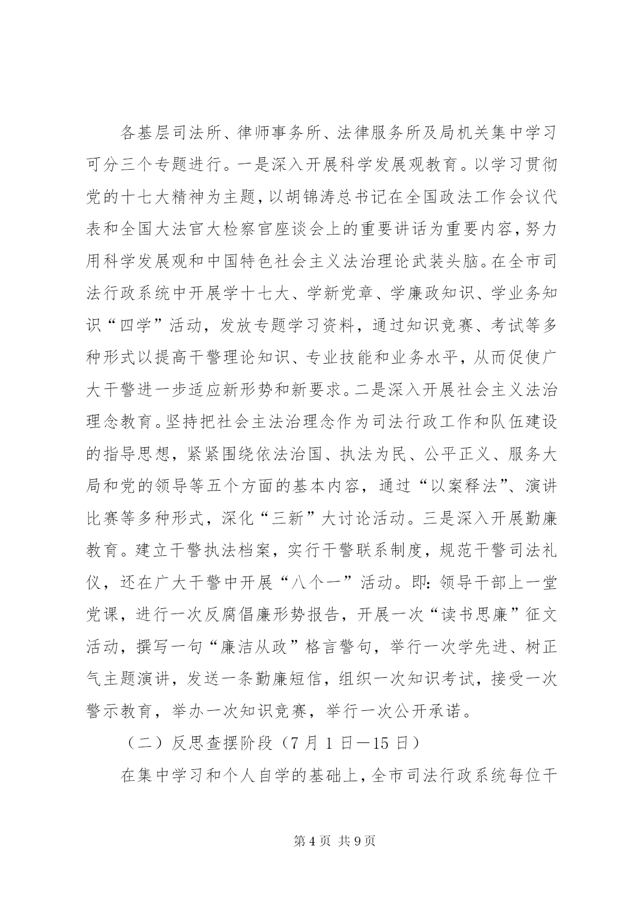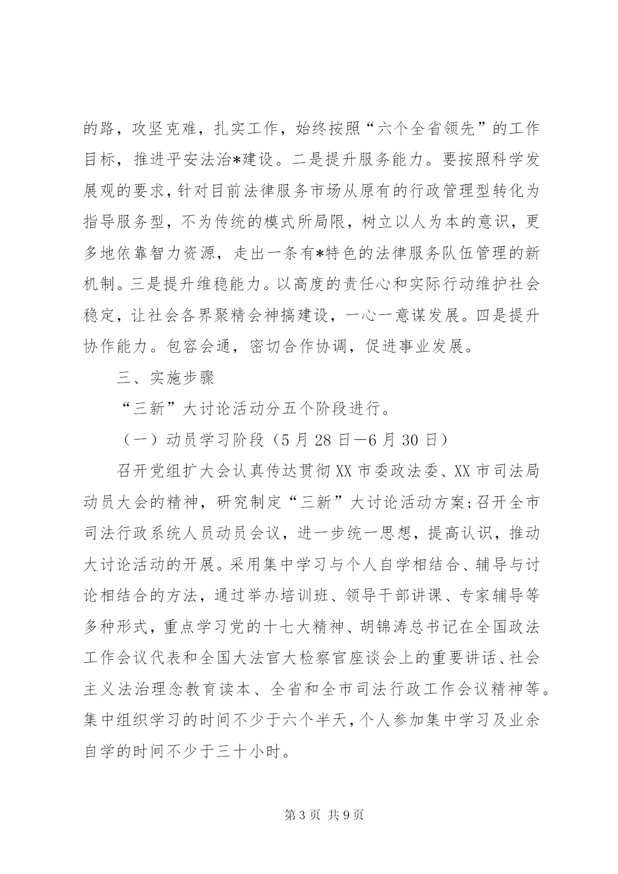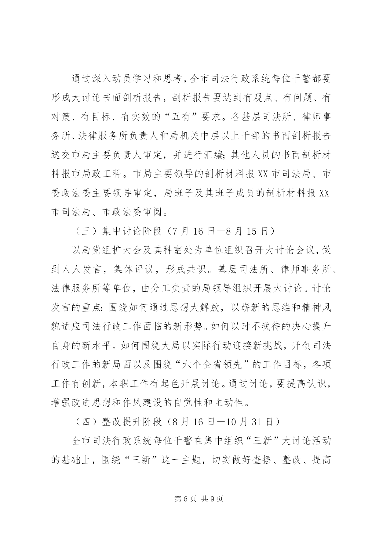 第PAGE\*Arabic\*MERGEFORMAT9页共NUMPAGES\*MERGEFORMAT9页市司法局大讨论活动实施方案为贯彻落实党的十七大和全国司法行政工作会议精神,根据XX市委政法委、XX市司法局《关于开展“适应新形势,立足新起点,提升新水平”大讨论活动的实施意见》(通委政法〔20*〕25号)、(通司发〔20*〕55号)文件的要求,结合全市司法行政工作实际,特制定本实施方案:一、指导思想高举邓小平理论和“三个代表”重要思想的伟大旗帜,认真学习贯彻落实党的十七大和胡锦涛总书记在全国政法工作会议代表和全国大法官、大检察官座谈会上的重要讲话精神,通过“适应新形势,立足新起点,提升新水平”(以下简称“三新”)大讨论活动这一载体和抓手,引导广大干警在解放思想中统一认识,在查找差距中深刻反思,在观念转变中开拓创新,在明确责任中狠抓落实,切实解决广大党员干部在思想、工作、作风等方面存在的问题,进一步把思想统一到中央和省委的要求上来,把智慧和力量凝聚到实现市委确定的目标任务上来,为实现全市经济社会又好又快发展提供强有力的政治保障。二、目标任务通过“三新”大讨论,坚定一个目标,强化四种意识,提升四个能力,在更高起点上推进全市司法行政工作又好又快发展,为全面小康、项目建设、宜居工程三项重点工作,为建设法治*、平安*、和谐*做出新的更大的贡献。坚定一个目标。坚定实现法制宣传教育、大调解工作、安置帮教、社区矫正示范区建设、法律服务、队伍建设“六个全省领先”这一目标。强化四种意识。一是强化大局意识。大局就是全局,就是发展趋势。增强大局意识就要认识大局、把握大局、服从和服务大局。每一位干警要处理好局部与全局的关系,将自己所承担的责任与大局联系起来,只有胸中有大局,工作才能有方向、有章法、有轻重缓急。二是强化责任意识。责任意识,是角色意识,是一种精神状态,有了责任意识,就能集中精力,全身心投入,形成意志和品格,创造出一流的业绩。三是强化务实意识。要充分认识司法工作的新形势、新要求,以新的工作状态,新的工作思路,新的工作举措,推动工作新发展,大力实施普法依法治理工作,全力化解各类社会矛盾,倾力服务全市重点工作,为建设群众公认、老百姓得实惠的全面小康社会,作出更大的贡献。四是强化自律意识。一心为公、执法为民的理念得到充分体现,公正高效、服务民生的主旨得到充分展示。严守党风廉政建设各项规定,堂堂正正做人,清清白白做事。提升四个能力。一是提升创新能力。要跳出*看司法,跳出司法看司法,敢于跟强的比、向高的攀、与快的赛,始终保持昂扬向上的锐气、知难而进的勇气,做前人未做的事,走前人没走的路,攻坚克难,扎实工作,始终按照“六个全省领先”的工作目标,推进平安法治*建设。二是提升服务能力。要按照科学发展观的要求,针对目前法律服务市场从原有的行政管理型转化为指导服务型,不为传统的模式所局限,树立以人为本的意识,更多地依靠智力资源,走出一条有*特色的法律服务队伍管理的新机制。三是提升维稳能力。以高度的责任心和实际行动维护社会稳定,让社会各界聚精会神搞建设,一心一意谋发展。四是提升协作能力。包容会通,密切合作协调,促进事业发展。三、实施步骤“三新”大讨论活动分五个阶段进行。(一)动员学习阶段(5月28日-6月30日)召开党组扩大会认真传达贯彻XX市委政法委、XX市司法局动员大会的精神,研究制定“三新”大讨论活动方案;召开全市司法行政系统人员动员会议,进一步统一思想,提高认识,推动大讨论活动的开展。采用集中学习与个人自学相结合、辅导与讨论相结合的方法,通过举办培训班、领导干部讲课、专家辅导等多种形式,重点学习党的十七大精神、胡锦涛总书记在全国政法工作会议代表和全国大法官大检察官座谈会上的重要讲话、社会主义法治理念教育读本、全省和全市司法行政工作会议精神等。集中组织学习的时间不少于六个半天,个人参加集中学习及业余自学的时间不少于三十小时。各基层司法所、律师事务所、法律服务所及局机关集中学习可分三个专题进行。一是深入开展科学发展观教育。以学习贯彻党的十七大精神为主题,以胡锦涛总书记在全国政法工作会议代表和全国大法官大检察官座谈会上的重要讲话为重要内容,努力用科学发展观和中国特色社会主义法治理论武装头脑。在全市司法行政系统中开展学十七大、学新党章、学廉政知识、学业务知识“四学”活动,发放专题学习资料,通过知识竞赛、考试等多种形式以提高干警理论知识、专业技能和业务水平,从而促使广大干警进一步适应新形势和新要求。二是深入开展社会主义法治理念教育。坚持把社会主法治理念作为司法行政工作和队伍建设的指导思想,紧紧围绕依法治国、执法为民、公平正义、服务大局和党的领导等五个方面的基本内容,通过“以案释法”、演讲比赛等多种形式,深化“三新”大讨论活动。三是深入开展