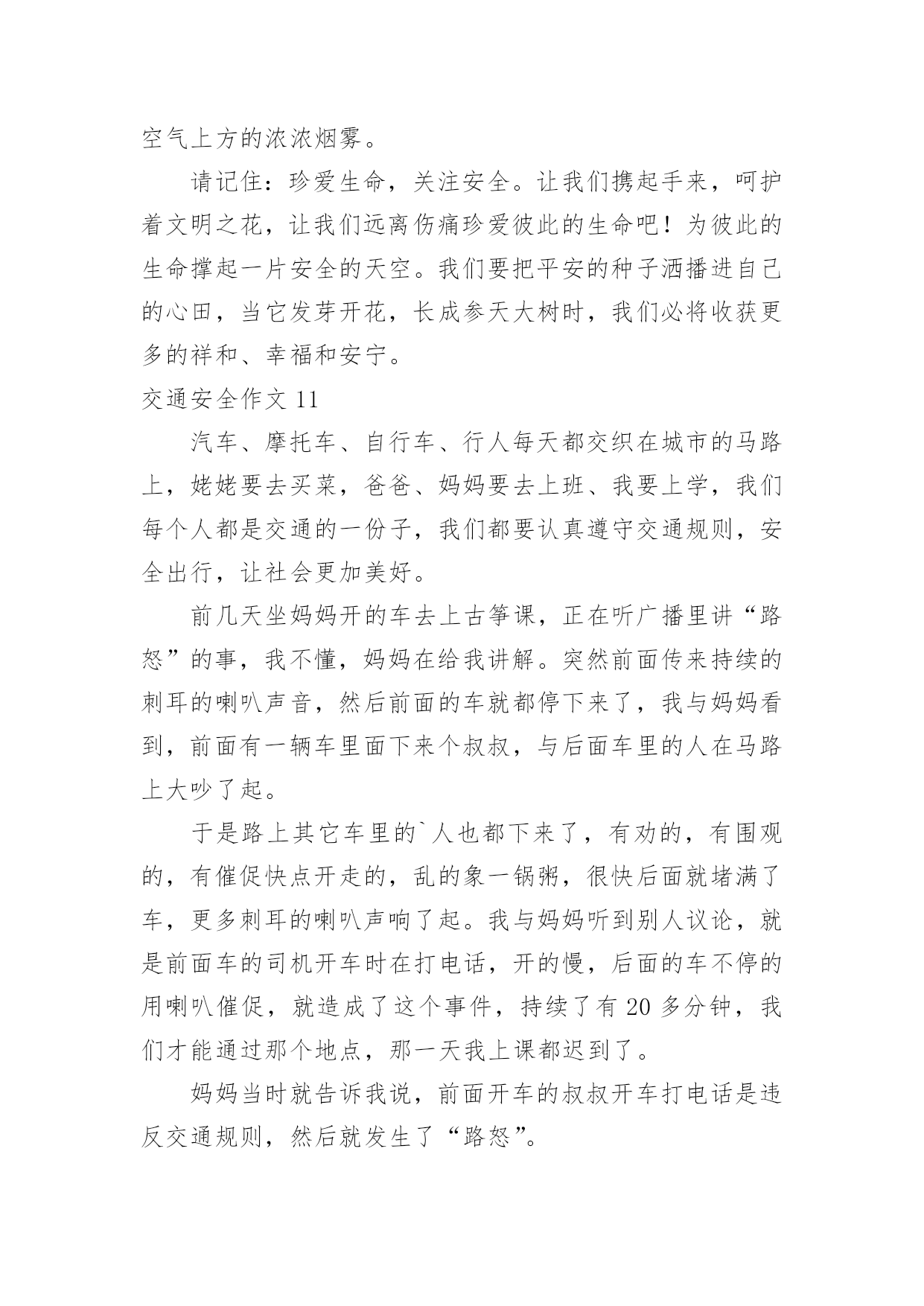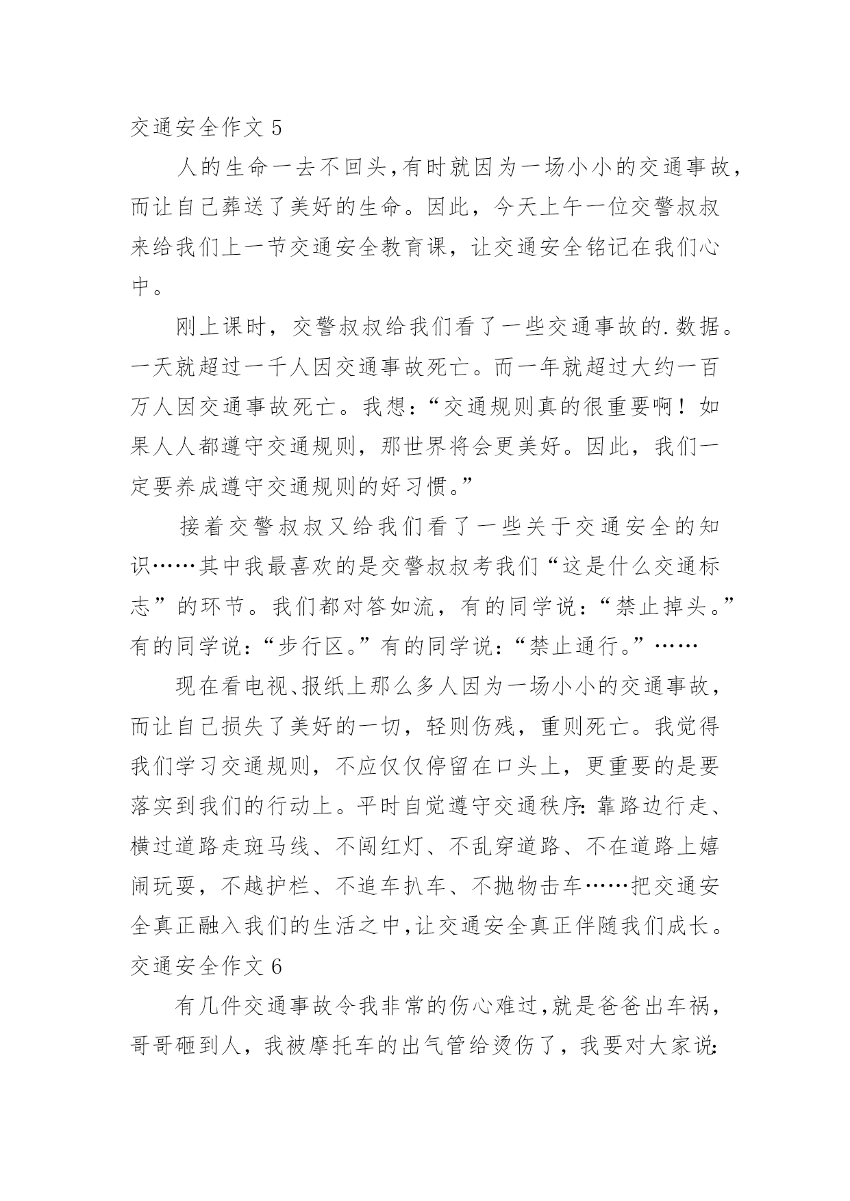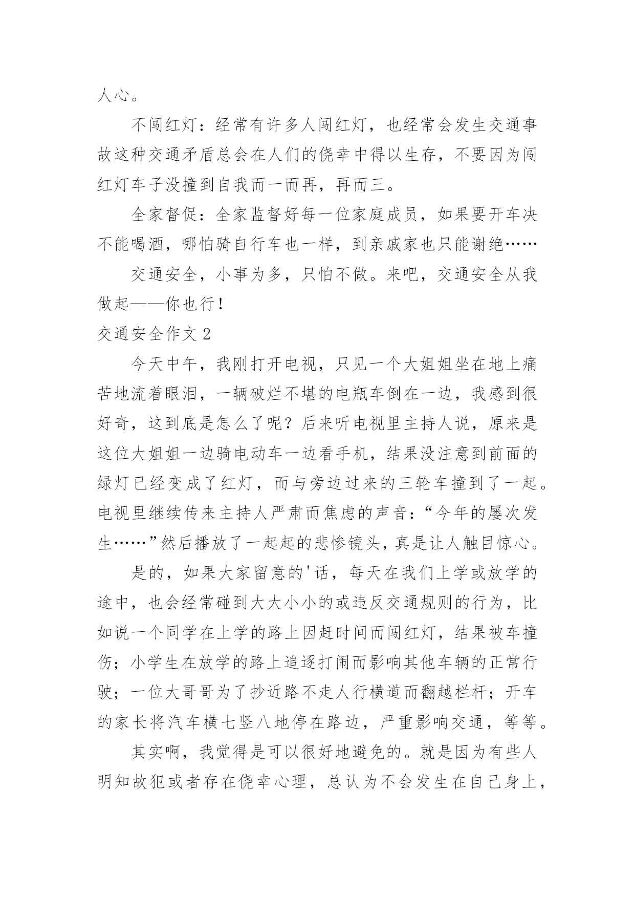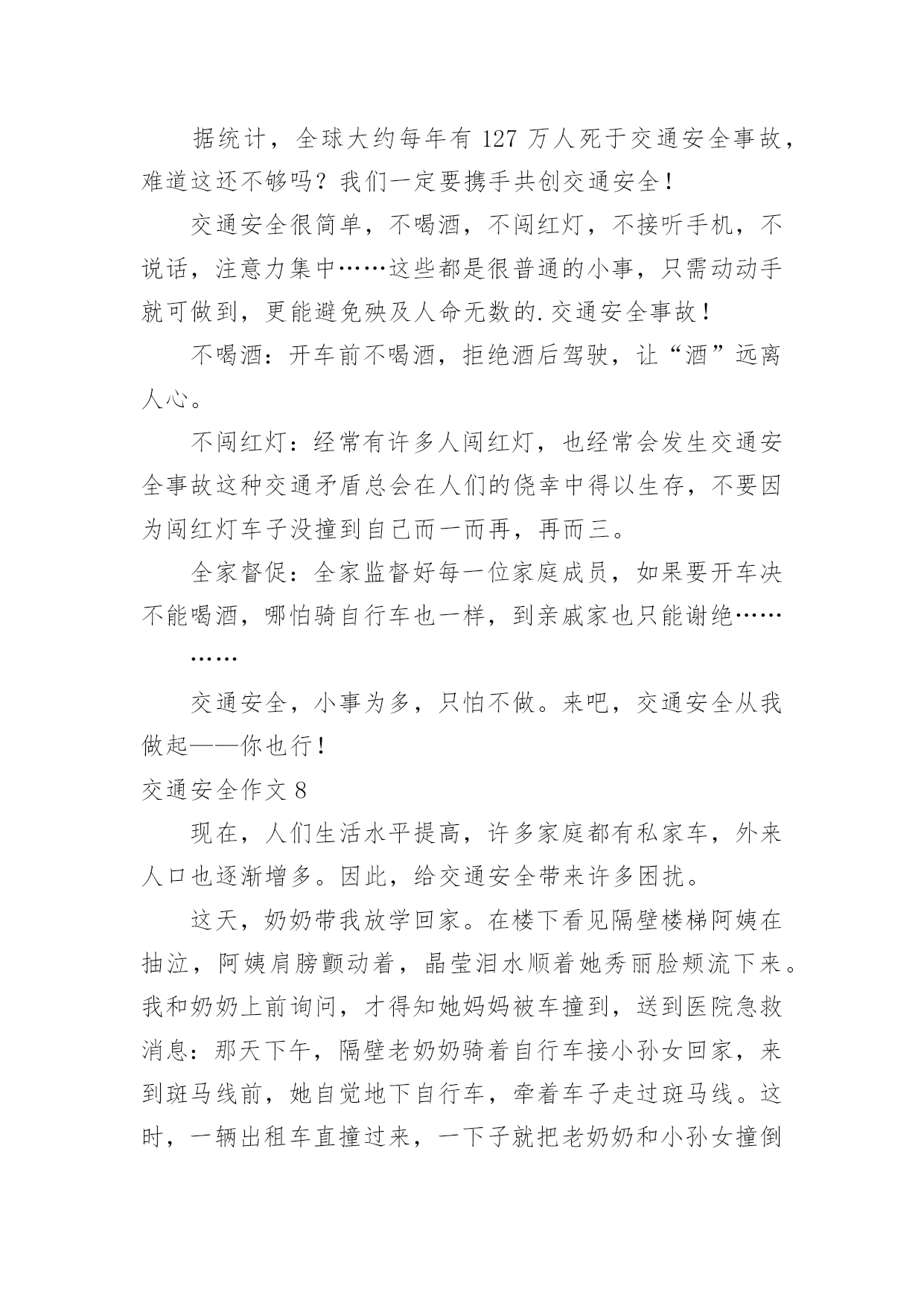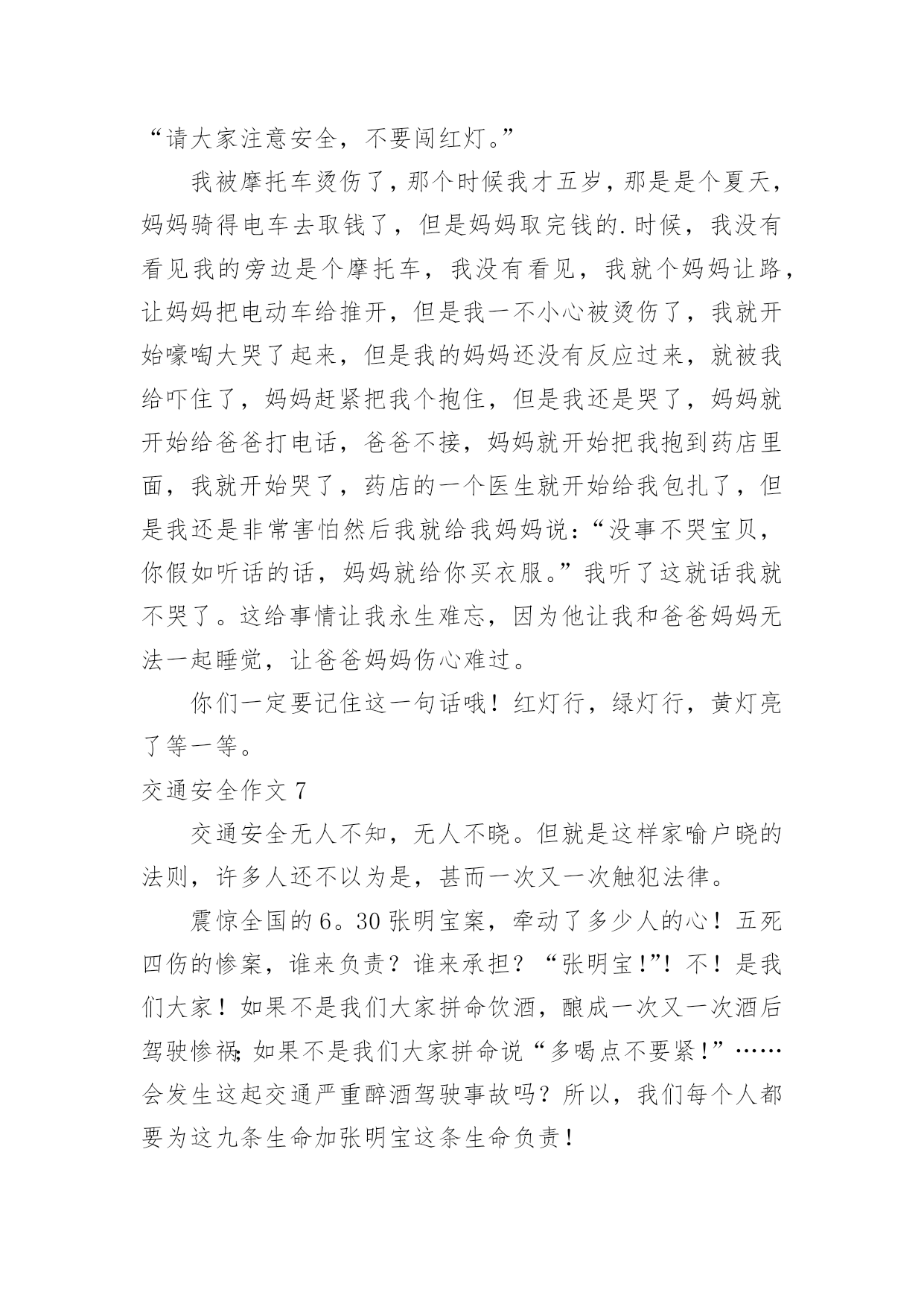 交通安全作文交通安全作文【精】在学习、工作、生活中,大家都接触过作文吧,写作文是培养人们的观察力、联想力、想象力、思考力和记忆力的重要手段。相信写作文是一个让许多人都头痛的问题,下面是小编为大家整理的交通安全作文,欢迎阅读与收藏。交通安全作文1交通安全无人不知,无人不晓。但就然而这样家喻户晓的法则,许多人还不以为然而,甚而一次又一次触犯法律。震惊全国的6.30张明宝案,牵动了多少人的心!五死四伤的惨案,谁来负责?谁来承担?“张明宝!”!不!然而我们大家!如果不然而我们大家拼命饮酒,酿成一次又一次酒后驾驶惨祸;如果不然而我们大家拼命说“多喝点不要紧!”……会发生这起交通严重醉酒驾驶事故吗?此时所以,我们每个人都要为这九条生命加张明宝这条生命负责!据统计,全球大约每年有127万人死于交通事故,难道这还不够吗?我们必须要携手共创交通安全!交通安全很简单,不喝酒,不闯红灯,不接听手机,不说话,此时注意力集中……这些都然而很普通的`小事,只需动动手就可做到,更能避免殃及人命无数的交通事故!不喝酒:开车前不喝酒,拒绝酒后驾驶,让“酒”远离人心。不闯红灯:经常有许多人闯红灯,也经常会发生交通事故这种交通矛盾总会在人们的侥幸中得以生存,不要因为闯红灯车子没撞到自我而一而再,再而三。全家督促:全家监督好每一位家庭成员,如果要开车决不能喝酒,哪怕骑自行车也一样,到亲戚家也只能谢绝……交通安全,小事为多,只怕不做。来吧,交通安全从我做起——你也行!交通安全作文2今天中午,我刚打开电视,只见一个大姐姐坐在地上痛苦地流着眼泪,一辆破烂不堪的电瓶车倒在一边,我感到很好奇,这到底是怎么了呢?后来听电视里主持人说,原来是这位大姐姐一边骑电动车一边看手机,结果没注意到前面的绿灯已经变成了红灯,而与旁边过来的三轮车撞到了一起。电视里继续传来主持人严肃而焦虑的声音:“今年的屡次发生……”然后播放了一起起的悲惨镜头,真是让人触目惊心。是的,如果大家留意的'话,每天在我们上学或放学的途中,也会经常碰到大大小小的或违反交通规则的行为,比如说一个同学在上学的路上因赶时间而闯红灯,结果被车撞伤;小学生在放学的路上追逐打闹而影响其他车辆的正常行驶;一位大哥哥为了抄近路不走人行横道而翻越栏杆;开车的家长将汽车横七竖八地停在路边,严重影响交通,等等。其实啊,我觉得是可以很好地避免的。就是因为有些人明知故犯或者存在侥幸心理,总认为不会发生在自己身上,而疏忽大意,带来的后果就是害人害己。所以,我们每个人都要以身作则,从自己做起,严格遵守交通规则,做到文明出行,互相礼让,共建我们美好的家园!交通安全作文3我们的生活中,处处离不开交通,同时也离不开安全,所以,我们要遵守交通法则。在日常生活中,许多司机不注意交通安全,而鲁莽行事,造成其他人受伤。记得几天前,我在新闻上看到一则新闻:有一辆高级轿车在夜晚不顾他人生命安全,开得很快。开向斑马线时,当时正是红灯,一名行人正慢慢走过,此时“砰”的一声,行人被撞飞几米外后,又有几辆开得很快的车辆从行人身上撞过去。就这样,一名无辜的受害者丧失了生命。在生活中,有这样不守规的司机,也有放纵的行人。行人不遵守交通规则的事情也很多,他们的`这种行为也造成了同样惨重的后果。如:马路上,我们经常看见一些行人不顾后果的随意行走,并且根本不顾红绿灯的警示,还不走斑马线,便造成惨剧。所以,我们在马路上行走要遵守交通规则。为了保护自己的人身安全,我们应该做到不在车行道上追逐打闹;车辆快临近时突然猛拐横穿;不强行拦车或抛物击车。我们须在人行道内行走,没有人行道要靠路边行走。同学们,让我们都自觉遵守交通规则,并自己的能力让更多的人遵守交通规则。多等一分红灯,多一份安全,多一份负责,少一份牺牲,多一份意识,避免交通事故发生。让我们时刻铭记交通安全,让交通安全的警钟时时刻刻在我们的心里长鸣。交通安全作文4交通规则,人人都知道要遵守,可是有些人却做不到,才引发了这么多的交通事故。还有一些售票员、司机、车夫,为了挣更多的钱还违反了交通法规、让乘客有了危险。新年期间,乘车的人特别多,公交车上挤满了人,都已经超载十几个了,售票员还不停地把人放进来,出租车司机为了抢生意把车开得飞快,乘客就有了生命危险,还有三轮车夫,为了节约时间,多做生意,遇到红灯,还是自顾自地骑。这让我们这些乘客十分担心自己的生命。我们学校附近常发生堵车现象,特别是上学高峰期,一辆接一辆的汽车加上两类公交车,把路堵得水泄不通,就连小巧玲珑的.自行车也很难穿过。它给我们学生带来了很大的不便,要是道路能再拓宽一点多好啊!就是这些看起来微不足道的小问题,常常造成一件件的大问题——因此还死了不少人。勤俭路上就发生了一起交通事故。那天下午,有一辆汽车突然急转弯,迎面正好来了一辆摩托车,只听“嘭”的一响,两辆车来了一个亲吻。骑