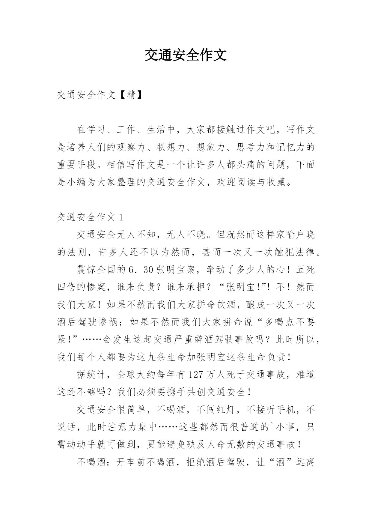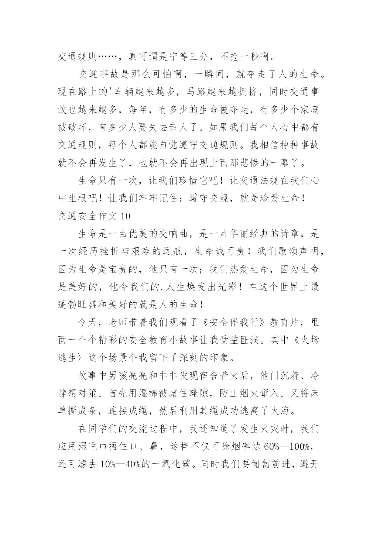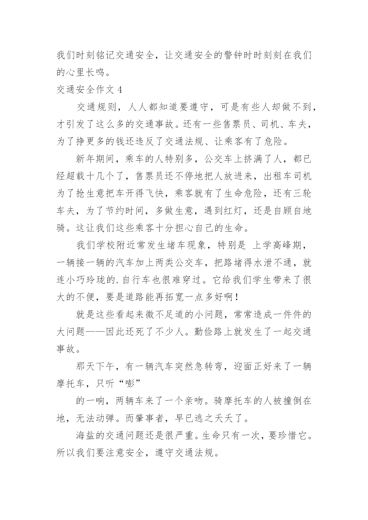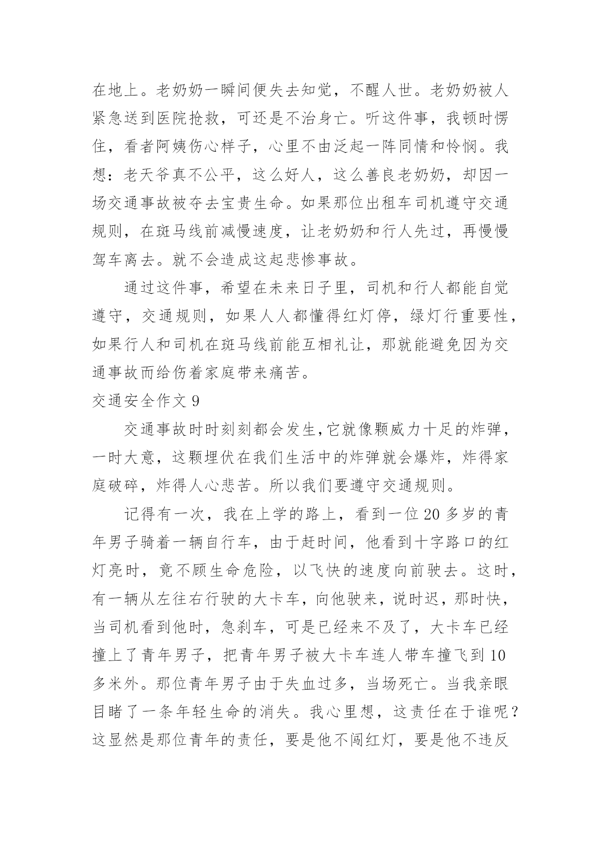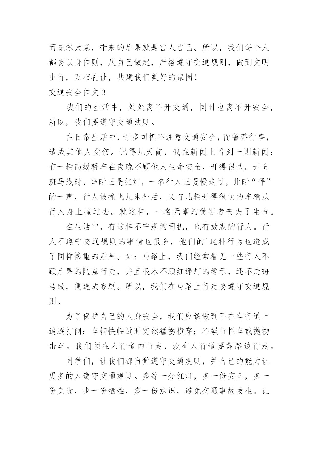 交通安全作文交通安全作文【精】在学习、工作、生活中,大家都接触过作文吧,写作文是培养人们的观察力、联想力、想象力、思考力和记忆力的重要手段。相信写作文是一个让许多人都头痛的问题,下面是小编为大家整理的交通安全作文,欢迎阅读与收藏。交通安全作文1交通安全无人不知,无人不晓。但就然而这样家喻户晓的法则,许多人还不以为然而,甚而一次又一次触犯法律。震惊全国的6.30张明宝案,牵动了多少人的心!五死四伤的惨案,谁来负责?谁来承担?“张明宝!”!不!然而我们大家!如果不然而我们大家拼命饮酒,酿成一次又一次酒后驾驶惨祸;如果不然而我们大家拼命说“多喝点不要紧!”……会发生这起交通严重醉酒驾驶事故吗?此时所以,我们每个人都要为这九条生命加张明宝这条生命负责!据统计,全球大约每年有127万人死于交通事故,难道这还不够吗?我们必须要携手共创交通安全!交通安全很简单,不喝酒,不闯红灯,不接听手机,不说话,此时注意力集中……这些都然而很普通的`小事,只需动动手就可做到,更能避免殃及人命无数的交通事故!不喝酒:开车前不喝酒,拒绝酒后驾驶,让“酒”远离人心。不闯红灯:经常有许多人闯红灯,也经常会发生交通事故这种交通矛盾总会在人们的侥幸中得以生存,不要因为闯红灯车子没撞到自我而一而再,再而三。全家督促:全家监督好每一位家庭成员,如果要开车决不能喝酒,哪怕骑自行车也一样,到亲戚家也只能谢绝……交通安全,小事为多,只怕不做。来吧,交通安全从我做起——你也行!交通安全作文2今天中午,我刚打开电视,只见一个大姐姐坐在地上痛苦地流着眼泪,一辆破烂不堪的电瓶车倒在一边,我感到很好奇,这到底是怎么了呢?后来听电视里主持人说,原来是这位大姐姐一边骑电动车一边看手机,结果没注意到前面的绿灯已经变成了红灯,而与旁边过来的三轮车撞到了一起。电视里继续传来主持人严肃而焦虑的声音:“今年的屡次发生……”然后播放了一起起的悲惨镜头,真是让人触目惊心。是的,如果大家留意的'话,每天在我们上学或放学的途中,也会经常碰到大大小小的或违反交通规则的行为,比如说一个同学在上学的路上因赶时间而闯红灯,结果被车撞伤;小学生在放学的路上追逐打闹而影响其他车辆的正常行驶;一位大哥哥为了抄近路不走人行横道而翻越栏杆;开车的家长将汽车横七竖八地停在路边,严重影响交通,等等。其实啊,我觉得是可以很好地避免的。就是因为有些人明知故犯或者存在侥幸心理,总认为不会发生在自己身上,而疏忽大意,带来的后果就是害人害己。所以,我们每个人都要以身作则,从自己做起,严格遵守交通规则,做到文明出行,互相礼让,共建我们美好的家园!交通安全作文3我们的生活中,处处离不开交通,同时也离不开安全,所以,我们要遵守交通法则。在日常生活中,许多司机不注意交通安全,而鲁莽行事,造成其他人受伤。记得几天前,我在新闻上看到一则新闻:有一辆高级轿车在夜晚不顾他人生命安全,开得很快。开向斑马线时,当时正是红灯,一名行人正慢慢走过,此时“砰”的一声,行人被撞飞几米外后,又有几辆开得很快的车辆从行人身上撞过去。就这样,一名无辜的受害者丧失了生命。在生活中,有这样不守规的司机,也有放纵的行人。行人不遵守交通规则的事情也很多,他们的`这种行为也造成了同样惨重的后果。如:马路上,我们经常看见一些行人不顾后果的随意行走,并且根本不顾红绿灯的警示,还不走斑马线,便造成惨剧。所以,我们在马路上行走要遵守交通规则。为了保护自己的人身安全,我们应该做到不在车行道上追逐打闹;车辆快临近时突然猛拐横穿;不强行拦车或抛物击车。我们须在人行道内行走,没有人行道要靠路边行走。同学们,让我们都自觉遵守交通规则,并自己的能力让更多的人遵守交通规则。多等一分红灯,多一份安全,多一份负责,少一份牺牲,多一份意识,避免交通事故发生。让我们时刻铭记交通安全,让交通安全的警钟时时刻刻在我们的心里长鸣。交通安全作文4交通规则,人人都知道要遵守,可是有些人却做不到,才引发了这么多的交通事故。还有一些售票员、司机、车夫,为了挣更多的钱还违反了交通法规、让乘客有了危险。新年期间,乘车的人特别多,公交车上挤满了人,都已经超载十几个了,售票员还不停地把人放进来,出租车司机为了抢生意把车开得飞快,乘客就有了生命危险,还有三轮车夫,为了节约时间,多做生意,遇到红灯,还是自顾自地骑。这让我们这些乘客十分担心自己的生命。我们学校附近常发生堵车现象,特别是上学高峰期,一辆接一辆的汽车加上两类公交车,把路堵得水泄不通,就连小巧玲珑的.自行车也很难穿过。它给我们学生带来了很大的不便,要是道路能再拓宽一点多好啊!就是这些看起来微不足道的小问题,常常造成一件件的大问题——因此还死了不少人。勤俭路上就发生了一起交通事故。那天下午,有一辆汽车突然急转弯,迎面正好来了一辆摩托车,只听“嘭”的一响,两辆车来了一个亲吻。骑