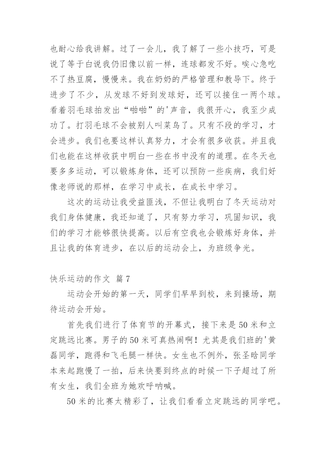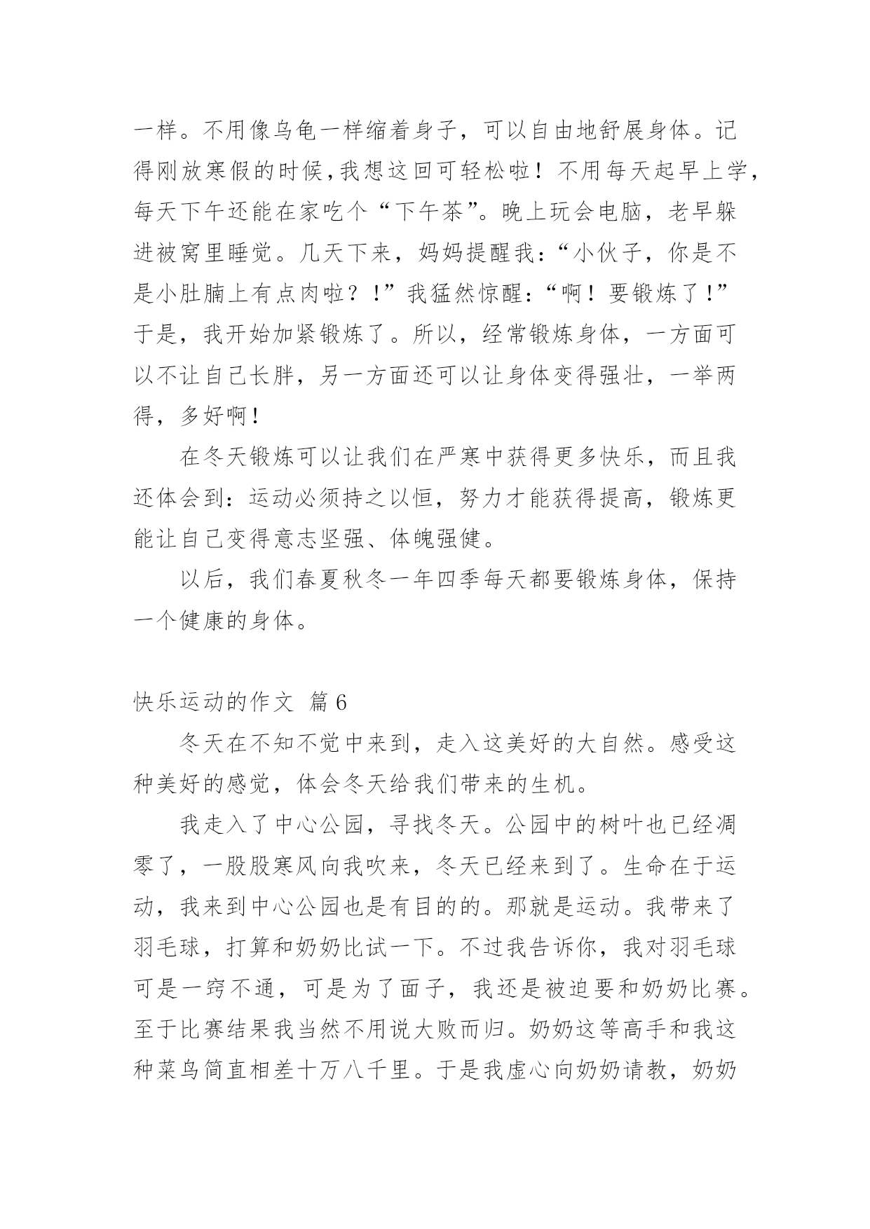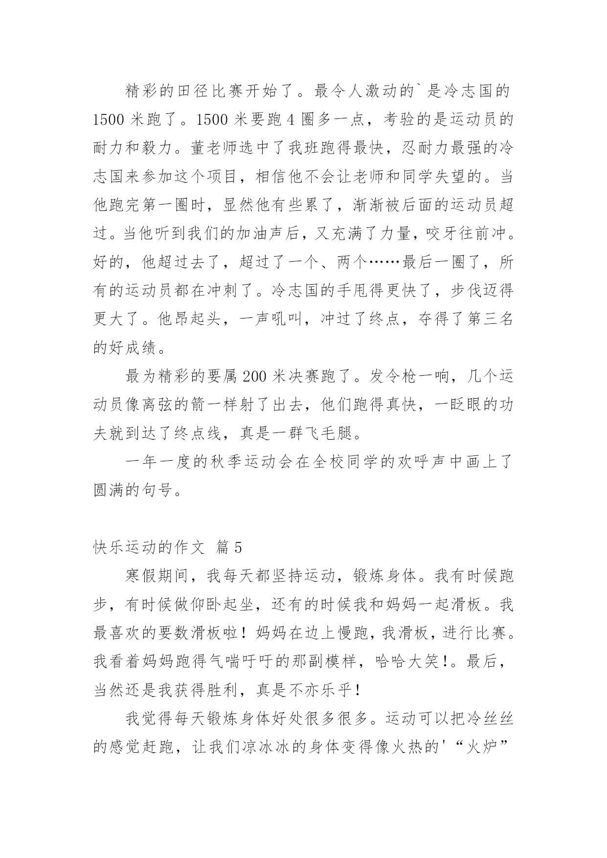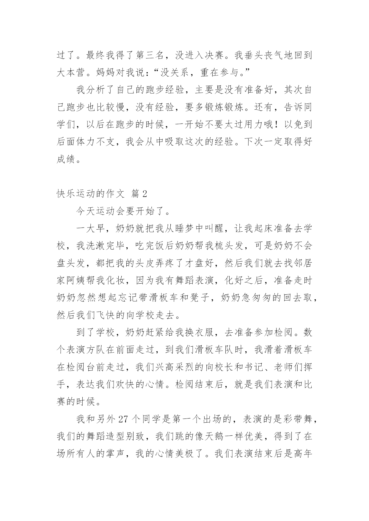 快乐运动的作文精选快乐运动的作文集合七篇在平日的学习、工作和生活里,大家或多或少都会接触过作文吧,根据写作命题的特点,作文可以分为命题作文和非命题作文。你知道作文怎样写才规范吗?下面是小编收集整理的快乐运动的作文7篇,仅供参考,希望能够帮助到大家。快乐运动的作文篇1一年一度的运动会又开始了,操场上挂着五颜六色地彩旗,彩旗迎风飘扬。天空非常晴朗,太阳公公暖暖地照在操场上。同学们都兴高采烈地来参加运动会。我们快速的回到各自班级的大本营,静静地等着广播通知。突然广播响起,请参加女子60米跑步的同学,去跑道上做准备。余芯苑听到广播飞快地跑到了跑道,她压压腿,扭扭腰。只听枪声一响,余芯苑快速地向终点跑去,但是三(4)班的同学跑得更快,把余芯苑给超过了。不知过了多久,广播终于又响起,请参加男子60米跑步的同学,去跑道上做准备。我听到广播,快速地走向跑道,也做了热身运动,突然枪声响起,我像闪电一样快,因为用力过度,我的.速度慢慢得降了下来,2班的同学开始的时候跑得很慢,到了快冲向终点的时候,一下子加速,把我给超过了。最终我得了第三名,没进入决赛。我垂头丧气地回到大本营。妈妈对我说:“没关系,重在参与。”我分析了自己的跑步经验,主要是没有准备好,其次自己跑步也比较慢,没有经验,要多锻炼锻炼。还有,告诉同学们,以后在跑步的时候,一开始不要太过用力哦!以免到后面体力不支,我会从中吸取这次的经验。下次一定取得好成绩。快乐运动的作文篇2今天运动会要开始了。一大早,奶奶就把我从睡梦中叫醒,让我起床准备去学校,我洗漱完毕,吃完饭后奶奶帮我梳头发,可是奶奶不会盘头发,都把我的头皮弄疼了才盘好,然后我们就去找邻居家阿姨帮我化妆,因为我有舞蹈表演,化好之后,准备走时奶奶忽然想起忘记带滑板车和凳子,奶奶急匆匆的回去取,然后我们飞快的向学校走去。到了学校,奶奶赶紧给我换衣服,去准备参加检阅。数个表演方队在前面走过,到我们滑板车队时,我滑着滑板车在检阅台前走过,我们兴高采烈的向校长和书记、老师们挥手,表达我们欢快的心情。检阅结束后,就是我们表演和比赛的时候。我和另外27个同学是第一个出场的,表演的是彩带舞,我们的舞蹈造型别致,我们跳的像天鹅一样优美,得到了在场所有人的掌声,我的心情美极了。我们表演结束后是高年级的哥哥和姐姐们表演。我们回到班级休息区一边吃零食一边看表演。这时,太阳已经火辣辣的了,我们在遮阳伞下躲避阳光,这时,王涵妈妈拎着一大袋冰糕和冰棍来到我们跟前,让我们每个同学选自己喜欢的拿着吃,我也选了喜欢吃的冰棍,我们集体向王涵妈妈表示感谢,敬爱的张老师还给我们拍了集体照。在我们休息这段时间已经有几项比赛结束了,到我的'仰卧起坐比赛了,我走到场上和同学比赛起来,我做了24个仰卧起坐,得到了一份奖品,同学和老师都为我鼓掌,我特别开心。运动会圆满结束。在运动会期间我们要感谢尊敬的张老师和几位同学家长,因为我们的纪律是最好的,所以要谢谢家长和老师对我们的照顾,我们要向您们说声“老师辛苦了,叔叔阿姨辛苦了”。快乐运动的作文篇3一天,我和外婆一起出门晨跑。跑着跑着我慢慢地想起了一次学校里的运动会,在这次运动会上我们班得到了全年级第一名。为什么我们能得第一呢?就是因为我们使用了全身的力气来应付这场“战斗”。这才让我们知道,团结就是力量。老师在操场上摆好终点与起点的位置,并且还把赛道画好了。老师他们拿起刷子,沾上那白白的油漆,弯下腰一笔一笔地画在操场上,许许多多的老师不一会一条一条笔直的雪白色线条画好了。老师分好谁去比什么了以后,我们便去到了“战场”上,和别班“战斗”。我们班同学是很拼的。一位同学一脚踩空滑倒在地上,但他一咕噜跑起来继续三步并两步地跑着。还有一位同学看着别班比我们快了一些,他便使用最快的速度跑了起来,就像一颗陨石一样飞了过去。终于到我比赛了。我是比接力跑的,我拿着接力棒,眉头紧皱,心想如果我跑慢了,那我们班便会输掉。我便使用最快的速度飞奔过去,果然赢了。我们还有全班一起跳绳,看哪个班跳得多。我们每个人拿着绳用力地甩呀甩,脚也不停地跳啊跳。我跳了一百六十三个,这个数我可记得很清楚。一个人的力量什么也不是,很多人的'力量是很强的,团结就是力量。快乐运动的作文篇4“加油啊!快啊,加油!”操场上,同学们的加油声此起彼伏。看,我们正在举行秋季运动会呢!持球协作跑是一年一度的运动会中必不可少的一个项目。看,10个颇有信心的运动员走上了起跑线,两手伸展,互相抵住篮球。他们神情严肃,蓄势待发。“跑!”裁判员一声令下,他们如脱兔一般,快速而又沉稳地跑向前方。他们只想着快点顺利到达终点,为班级争光。虽然这些运动员不是我们班的,但我还是在为他们加油,打气。精彩的田径比赛开始了。最令人激动的`是冷志国的1500米跑了。1500米要跑4圈多一点,考验的是运动员的耐力和毅力。董老师