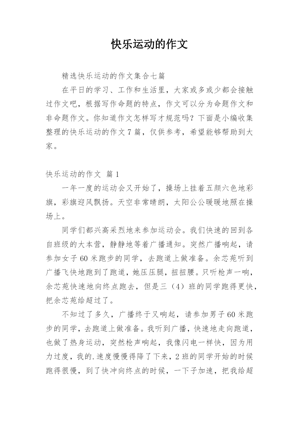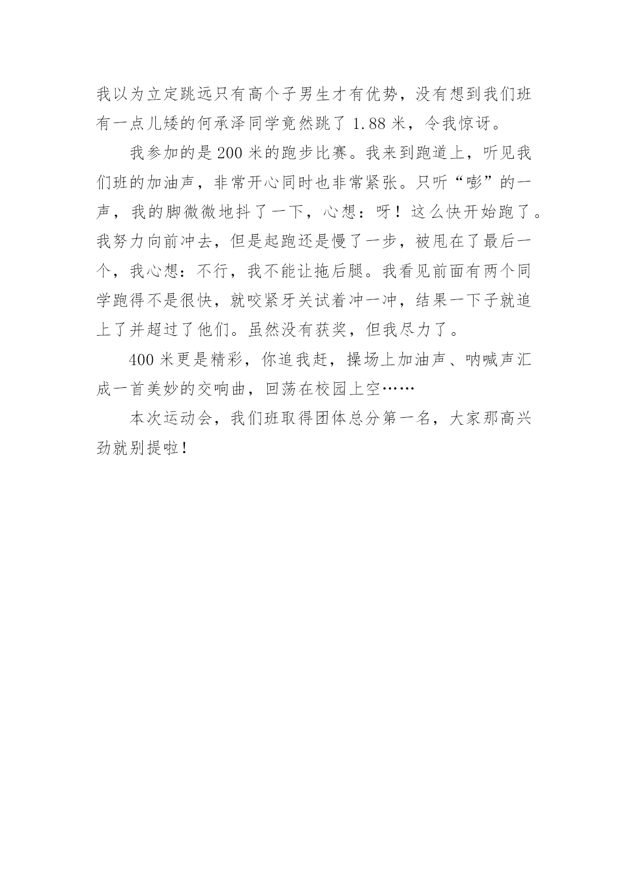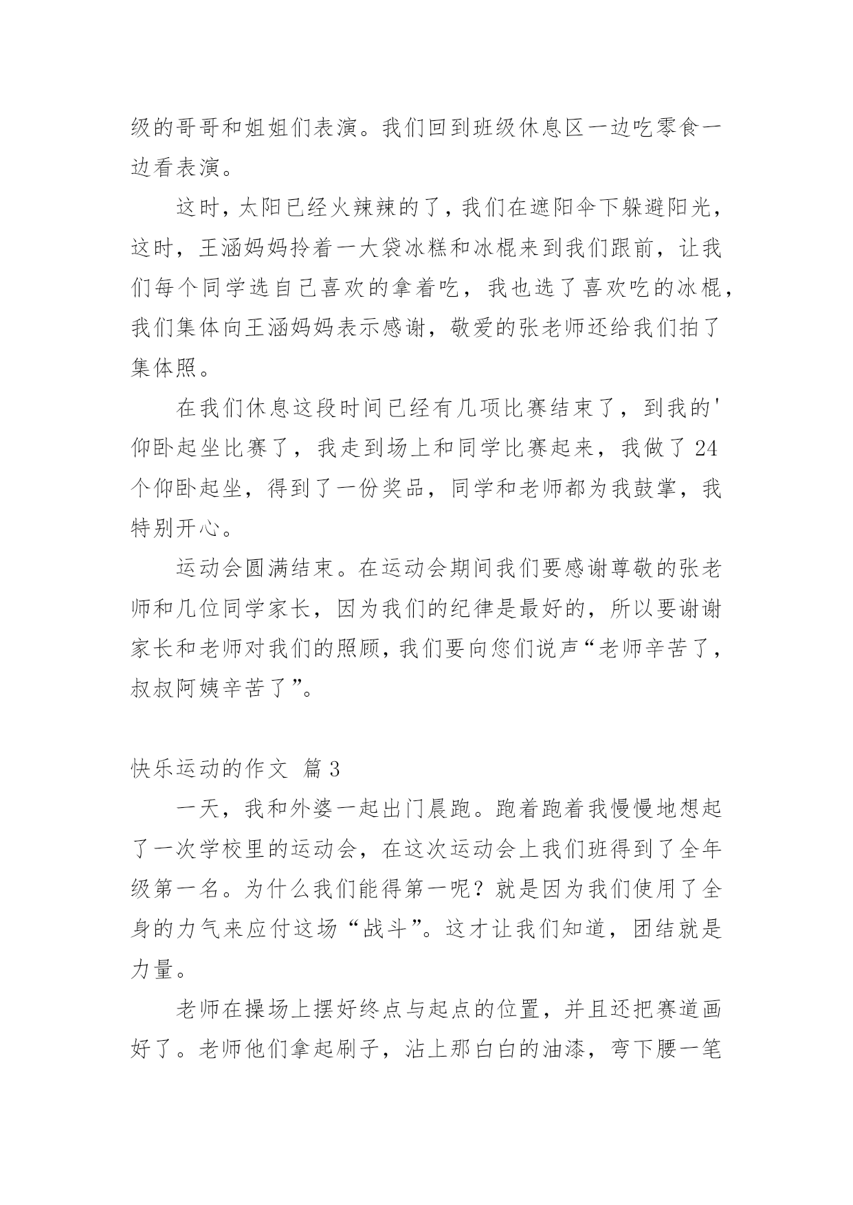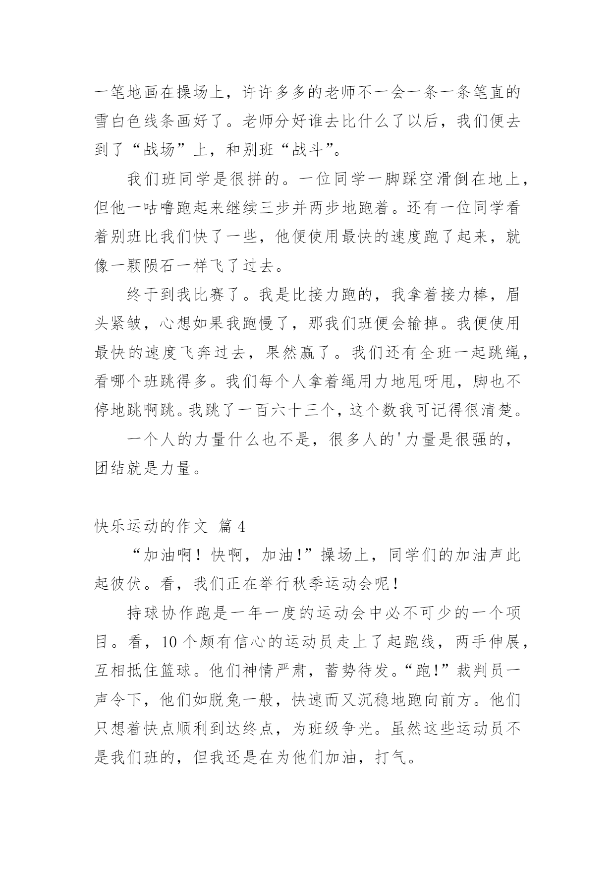 快乐运动的作文精选快乐运动的作文集合七篇在平日的学习、工作和生活里,大家或多或少都会接触过作文吧,根据写作命题的特点,作文可以分为命题作文和非命题作文。你知道作文怎样写才规范吗?下面是小编收集整理的快乐运动的作文7篇,仅供参考,希望能够帮助到大家。快乐运动的作文篇1一年一度的运动会又开始了,操场上挂着五颜六色地彩旗,彩旗迎风飘扬。天空非常晴朗,太阳公公暖暖地照在操场上。同学们都兴高采烈地来参加运动会。我们快速的回到各自班级的大本营,静静地等着广播通知。突然广播响起,请参加女子60米跑步的同学,去跑道上做准备。余芯苑听到广播飞快地跑到了跑道,她压压腿,扭扭腰。只听枪声一响,余芯苑快速地向终点跑去,但是三(4)班的同学跑得更快,把余芯苑给超过了。不知过了多久,广播终于又响起,请参加男子60米跑步的同学,去跑道上做准备。我听到广播,快速地走向跑道,也做了热身运动,突然枪声响起,我像闪电一样快,因为用力过度,我的.速度慢慢得降了下来,2班的同学开始的时候跑得很慢,到了快冲向终点的时候,一下子加速,把我给超过了。最终我得了第三名,没进入决赛。我垂头丧气地回到大本营。妈妈对我说:“没关系,重在参与。”我分析了自己的跑步经验,主要是没有准备好,其次自己跑步也比较慢,没有经验,要多锻炼锻炼。还有,告诉同学们,以后在跑步的时候,一开始不要太过用力哦!以免到后面体力不支,我会从中吸取这次的经验。下次一定取得好成绩。快乐运动的作文篇2今天运动会要开始了。一大早,奶奶就把我从睡梦中叫醒,让我起床准备去学校,我洗漱完毕,吃完饭后奶奶帮我梳头发,可是奶奶不会盘头发,都把我的头皮弄疼了才盘好,然后我们就去找邻居家阿姨帮我化妆,因为我有舞蹈表演,化好之后,准备走时奶奶忽然想起忘记带滑板车和凳子,奶奶急匆匆的回去取,然后我们飞快的向学校走去。到了学校,奶奶赶紧给我换衣服,去准备参加检阅。数个表演方队在前面走过,到我们滑板车队时,我滑着滑板车在检阅台前走过,我们兴高采烈的向校长和书记、老师们挥手,表达我们欢快的心情。检阅结束后,就是我们表演和比赛的时候。我和另外27个同学是第一个出场的,表演的是彩带舞,我们的舞蹈造型别致,我们跳的像天鹅一样优美,得到了在场所有人的掌声,我的心情美极了。我们表演结束后是高年级的哥哥和姐姐们表演。我们回到班级休息区一边吃零食一边看表演。这时,太阳已经火辣辣的了,我们在遮阳伞下躲避阳光,这时,王涵妈妈拎着一大袋冰糕和冰棍来到我们跟前,让我们每个同学选自己喜欢的拿着吃,我也选了喜欢吃的冰棍,我们集体向王涵妈妈表示感谢,敬爱的张老师还给我们拍了集体照。在我们休息这段时间已经有几项比赛结束了,到我的'仰卧起坐比赛了,我走到场上和同学比赛起来,我做了24个仰卧起坐,得到了一份奖品,同学和老师都为我鼓掌,我特别开心。运动会圆满结束。在运动会期间我们要感谢尊敬的张老师和几位同学家长,因为我们的纪律是最好的,所以要谢谢家长和老师对我们的照顾,我们要向您们说声“老师辛苦了,叔叔阿姨辛苦了”。快乐运动的作文篇3一天,我和外婆一起出门晨跑。跑着跑着我慢慢地想起了一次学校里的运动会,在这次运动会上我们班得到了全年级第一名。为什么我们能得第一呢?就是因为我们使用了全身的力气来应付这场“战斗”。这才让我们知道,团结就是力量。老师在操场上摆好终点与起点的位置,并且还把赛道画好了。老师他们拿起刷子,沾上那白白的油漆,弯下腰一笔一笔地画在操场上,许许多多的老师不一会一条一条笔直的雪白色线条画好了。老师分好谁去比什么了以后,我们便去到了“战场”上,和别班“战斗”。我们班同学是很拼的。一位同学一脚踩空滑倒在地上,但他一咕噜跑起来继续三步并两步地跑着。还有一位同学看着别班比我们快了一些,他便使用最快的速度跑了起来,就像一颗陨石一样飞了过去。终于到我比赛了。我是比接力跑的,我拿着接力棒,眉头紧皱,心想如果我跑慢了,那我们班便会输掉。我便使用最快的速度飞奔过去,果然赢了。我们还有全班一起跳绳,看哪个班跳得多。我们每个人拿着绳用力地甩呀甩,脚也不停地跳啊跳。我跳了一百六十三个,这个数我可记得很清楚。一个人的力量什么也不是,很多人的'力量是很强的,团结就是力量。快乐运动的作文篇4“加油啊!快啊,加油!”操场上,同学们的加油声此起彼伏。看,我们正在举行秋季运动会呢!持球协作跑是一年一度的运动会中必不可少的一个项目。看,10个颇有信心的运动员走上了起跑线,两手伸展,互相抵住篮球。他们神情严肃,蓄势待发。“跑!”裁判员一声令下,他们如脱兔一般,快速而又沉稳地跑向前方。他们只想着快点顺利到达终点,为班级争光。虽然这些运动员不是我们班的,但我还是在为他们加油,打气。精彩的田径比赛开始了。最令人激动的`是冷志国的1500米跑了。1500米要跑4圈多一点,考验的是运动员的耐力和毅力。董老师