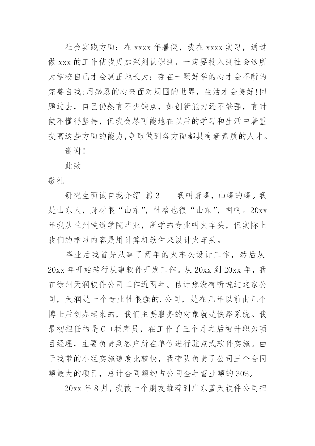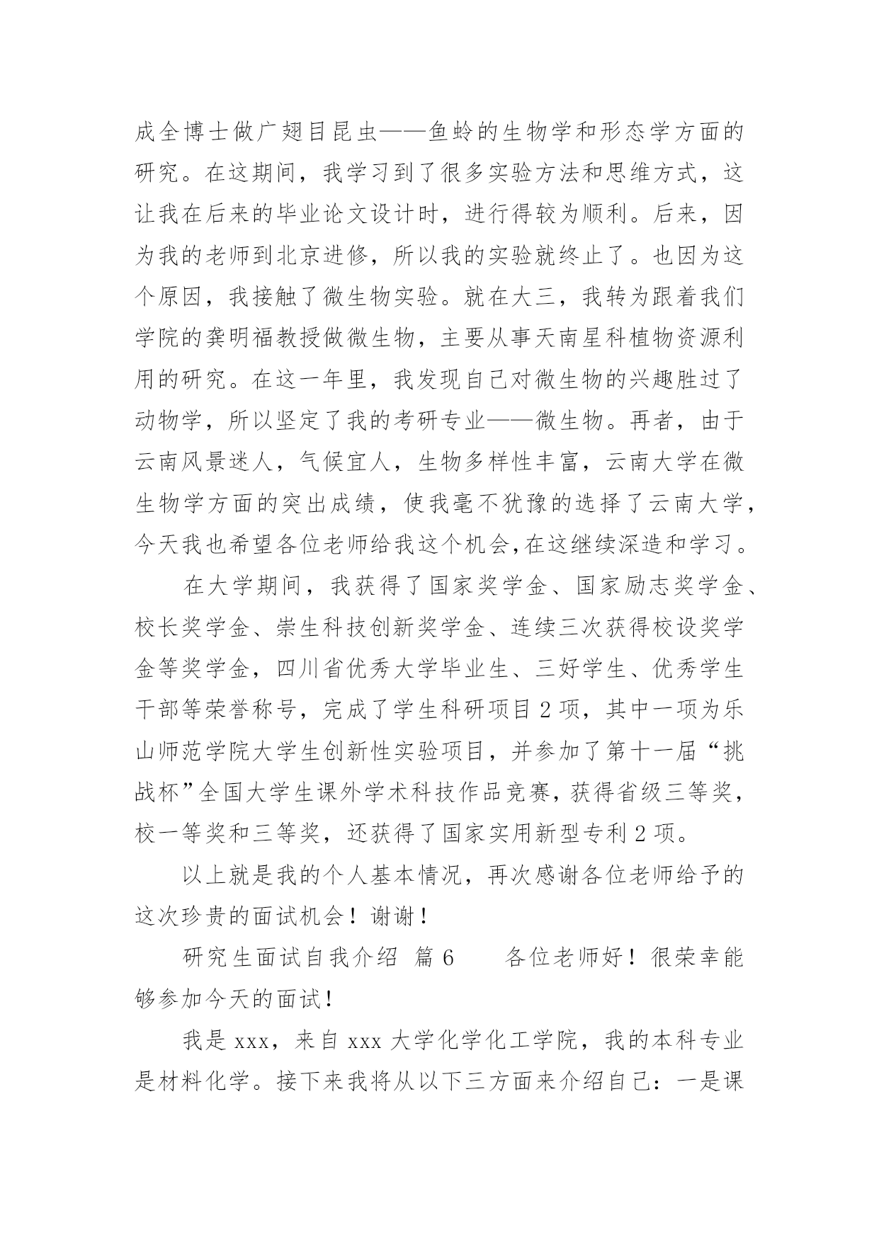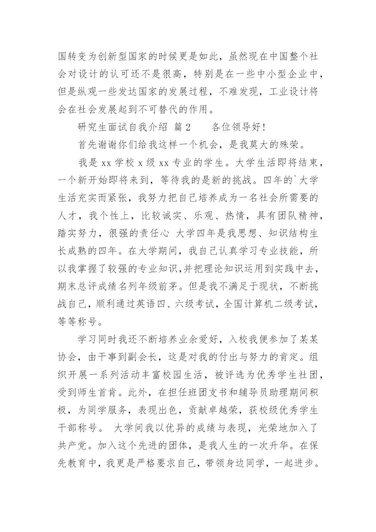 研究生面试自我介绍(通用)研究生面试自我介绍11篇当来到一个陌生的地方时,我们有必要对自己进行适当的介绍,自我介绍有助于自我宣传、自我展示。相信许多人会觉得自我介绍很难写吧,下面是小编精心整理的研究生面试自我介绍,仅供参考,欢迎大家阅读。研究生面试自我介绍篇1各位教授,下午好:很高兴有机会能参加这次面试和各位教授交流。首先,我简洁地介绍一下自己,我叫宋孝方,今年25岁,来自河南商丘,20xx年毕业于河南理工大学机械与动力工程学院,所学的专业是工业设计。其次,我想谈一下我四年的大学生活,让我学到了很多,很多的实践让我从从各个方面提高了自己,不但让我学会了如何思考,学习的方法,还让我看到了实践的重要性,作为一名学生,我深知学习机会的不易,我学习很努力,其中3年拿了学校的奖学金,我还积极地参加各种活动和设计大赛,曾在河南理工大学首届和第二届青少年科技文化节中分别荣获“摄影大赛优秀奖”和“节徽设计大赛二等奖”。在20xx年中的“张江杯”设计大赛中工业设计类中设计的笔记本电脑荣获优秀奖。在大学中我也遇到了好的老师和朋友,从他们身上我学到了很多东西,这对我能力的提高和成长起了很大的作用。再次,我来介绍一下我的毕业之后的工作情况,我大致工作了两年的时间,第一年是在福建迪特工业设计公司,担任工业设计师,主要从事产品设计工作,曾在设计总监的带领下为参加多个设计项目-泉州佳乐集团开发的可视门铃设计和辉煌水暖20xx年的新产品开发设计、其中为辉煌水暖开发命名为龙的水龙头已投入生产并获得了好评、第二年是在福建文创太阳能有限公司工作,担任设计师,主要的工作为太阳能灯具和音响的产品设计,公司画册的设计;为公司的设计的'多款太阳能灯具已投入生产,并受到了客户的好评,在工业设计小组共同努力下设计的太阳能音响已进入了产品的测试阶段,在公司的期间曾多次到车间深入了解材料工艺模具加工和产品生产过程,多次到广交会顺德工业设计博览会了解市场的产品信息。最后,我想谈一下,我考研的原因和研究的方向,我喜欢做设计,当看着自己的创意和产品得到别人认可的时候是一件无比兴奋的事情;还有就是两年的工作经验让我认识到我专业知识的局限,感觉在设计方面还有很多东西要学,自己的知识和能力还远远不够,特别是在经济快速发展的今天,更需要通过系统的复习来提高自己的能力,来化地实现自我价值,想通过3年的学习来对工业设计有个更加深入的了解,我很喜欢学校的感觉和体现出来的学习氛围,到处充满着青春活力,有很多的机会让你去实践和尝试,让人可以深入思考和进行学术的研究。如果我有机会在这所学校学习,我计划把自己的研究方向定为工业设计,因为我发现设计在社会的发展中发挥了越来越重要的作用,特别在国家由制造业大国转变为创新型国家的时候更是如此,虽然现在中国整个社会对设计的认可还不是很高,特别是在一些中小型企业中,但是纵观一些发达国家的发展过程,不难发现,工业设计将会在社会发展起到不可替代的作用。研究生面试自我介绍篇2各位领导好!首先谢谢你们给我这样一个机会,是我莫大的殊荣。我是xx学校x级xx专业的学生。大学生活即将结束,一个新开始即将来到,等待我的是新的挑战。四年的`大学生活充实而紧张,我努力把自己培养成为一名社会所需要的人才,我个性上,比较诚实、乐观、热情,具有团队精神,踏实努力,很强的责任心大学四年是我思想、知识结构生长成熟的四年。在大学期间,我自己认真学习专业技能,所以我掌握了较强的专业知识,并把理论知识运用到实践中去,期末总评成绩名列年级前茅。但是我不满足于现状,不断挑战自己,顺利通过英语四、六级考试,全国计算机二级考试,等等称号。学习同时我还不断培养业余爱好,入校我便参加了某某协会,由干事到副会长,这是对我的付出与努力的肯定。组织开展一系列活动丰富校园生活,被评选为优秀学生社团,受到师生首肯。此外,在担任班团支书和辅导员助理期间积极,为同学服务,表现出色,贡献卓越荣,获校级优秀学生干部称号。大学间我以优异的成绩与表现,光荣地加入了共产党。加入这个先进的团体,是我人生的一次升华。在保先教育中,我更是严格要求自己,带领身边同学,一起进步。社会实践方面:在xxxx年暑假,我在xxxx实习,通过做xxx的工作使我更加深刻认识到,一定要投入到社会这所大学校自己才会真正地长大:存在一颗好学的心才会不断的完善自我;用感恩的心来面对周围的世界,生活才会美好!回顾过去,自己仍然有不少缺点,如创新能力还不够强,有时候不懂得坚持,但我会尽可能地在以后的学习和生活中着重提高这些方面的能力,争取做到各方面都具有新素质的人才。谢谢!此致敬礼研究生面试自我介绍篇3我叫萧峰,山峰的峰。我是山东人,身材很“山东”,性格也很“山东”,呵呵。20xx年我从兰州铁道学院毕业,所学的专业叫火车头,但实际上我们的学习内容是用计算机软件来设计火