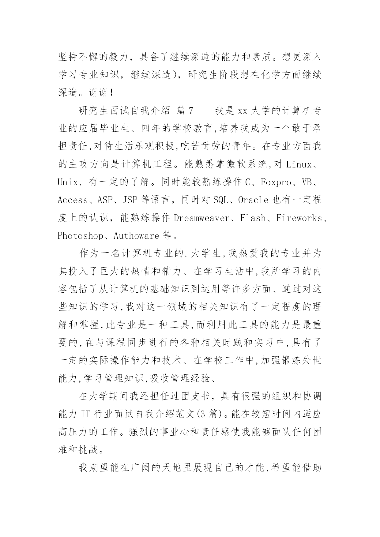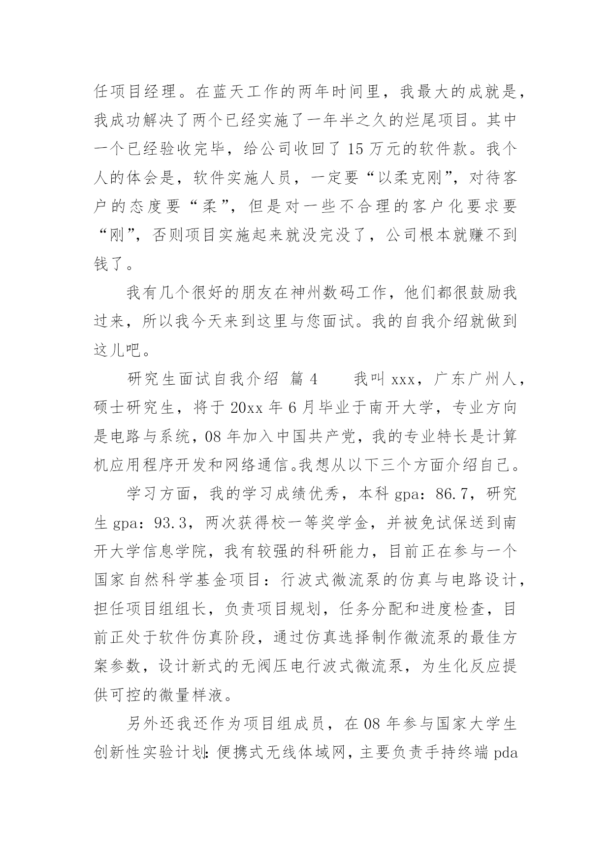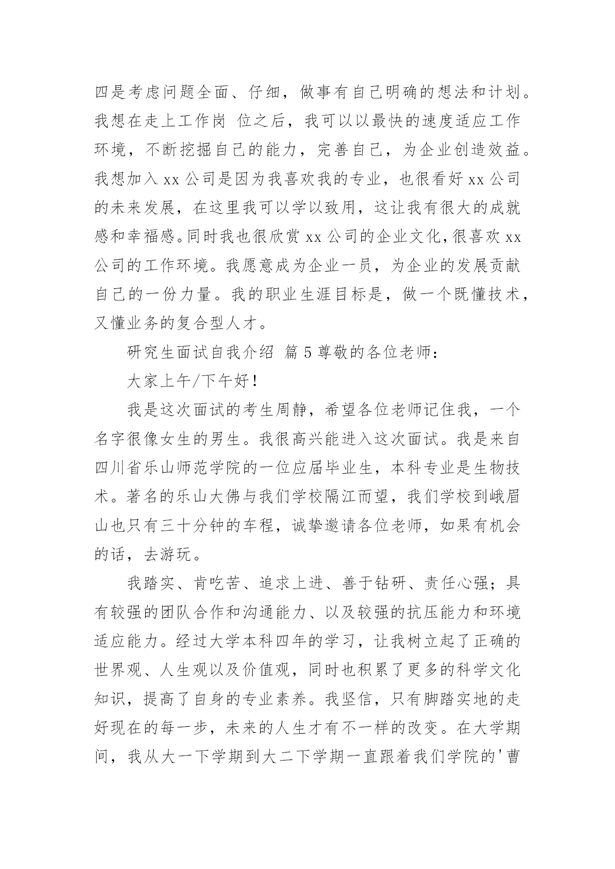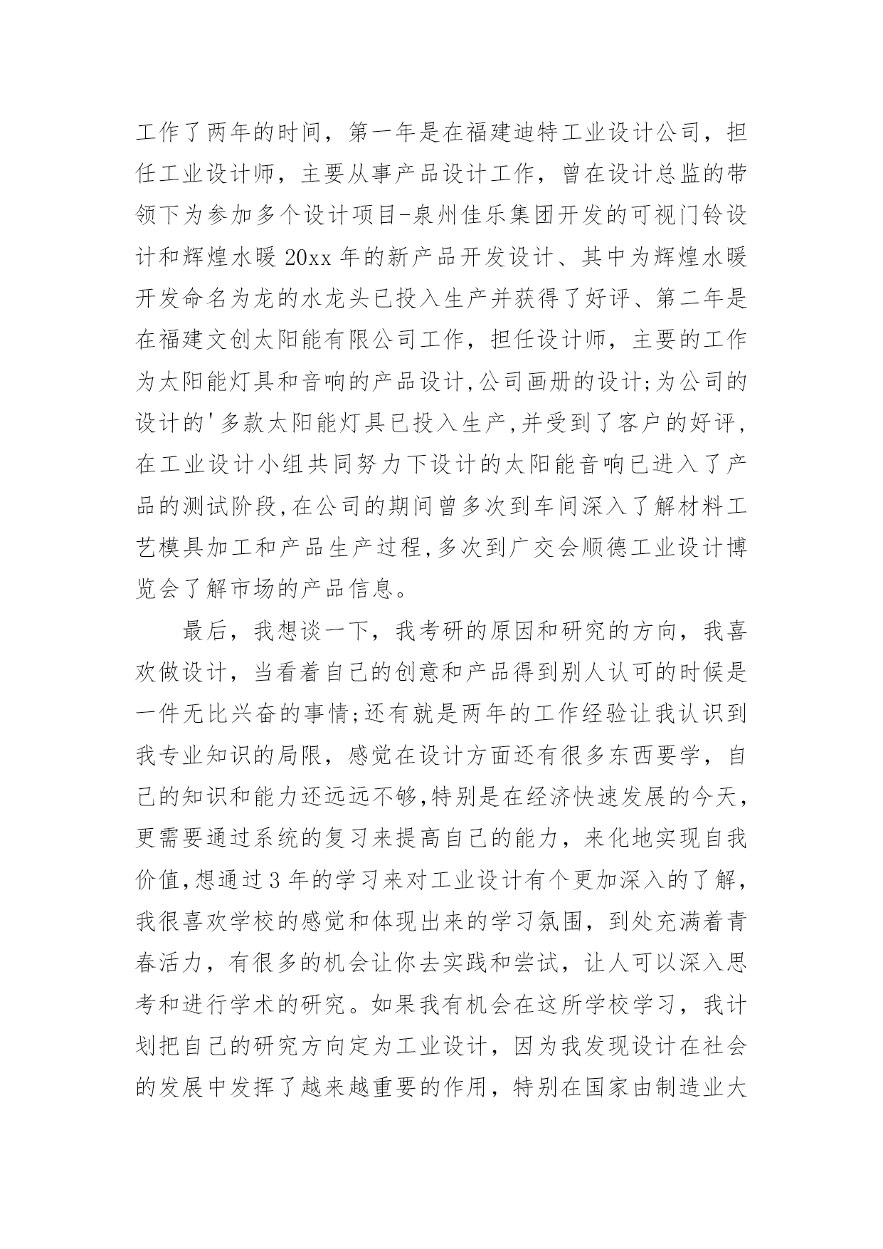 研究生面试自我介绍(通用)研究生面试自我介绍11篇当来到一个陌生的地方时,我们有必要对自己进行适当的介绍,自我介绍有助于自我宣传、自我展示。相信许多人会觉得自我介绍很难写吧,下面是小编精心整理的研究生面试自我介绍,仅供参考,欢迎大家阅读。研究生面试自我介绍篇1各位教授,下午好:很高兴有机会能参加这次面试和各位教授交流。首先,我简洁地介绍一下自己,我叫宋孝方,今年25岁,来自河南商丘,20xx年毕业于河南理工大学机械与动力工程学院,所学的专业是工业设计。其次,我想谈一下我四年的大学生活,让我学到了很多,很多的实践让我从从各个方面提高了自己,不但让我学会了如何思考,学习的方法,还让我看到了实践的重要性,作为一名学生,我深知学习机会的不易,我学习很努力,其中3年拿了学校的奖学金,我还积极地参加各种活动和设计大赛,曾在河南理工大学首届和第二届青少年科技文化节中分别荣获“摄影大赛优秀奖”和“节徽设计大赛二等奖”。在20xx年中的“张江杯”设计大赛中工业设计类中设计的笔记本电脑荣获优秀奖。在大学中我也遇到了好的老师和朋友,从他们身上我学到了很多东西,这对我能力的提高和成长起了很大的作用。再次,我来介绍一下我的毕业之后的工作情况,我大致工作了两年的时间,第一年是在福建迪特工业设计公司,担任工业设计师,主要从事产品设计工作,曾在设计总监的带领下为参加多个设计项目-泉州佳乐集团开发的可视门铃设计和辉煌水暖20xx年的新产品开发设计、其中为辉煌水暖开发命名为龙的水龙头已投入生产并获得了好评、第二年是在福建文创太阳能有限公司工作,担任设计师,主要的工作为太阳能灯具和音响的产品设计,公司画册的设计;为公司的设计的'多款太阳能灯具已投入生产,并受到了客户的好评,在工业设计小组共同努力下设计的太阳能音响已进入了产品的测试阶段,在公司的期间曾多次到车间深入了解材料工艺模具加工和产品生产过程,多次到广交会顺德工业设计博览会了解市场的产品信息。最后,我想谈一下,我考研的原因和研究的方向,我喜欢做设计,当看着自己的创意和产品得到别人认可的时候是一件无比兴奋的事情;还有就是两年的工作经验让我认识到我专业知识的局限,感觉在设计方面还有很多东西要学,自己的知识和能力还远远不够,特别是在经济快速发展的今天,更需要通过系统的复习来提高自己的能力,来化地实现自我价值,想通过3年的学习来对工业设计有个更加深入的了解,我很喜欢学校的感觉和体现出来的学习氛围,到处充满着青春活力,有很多的机会让你去实践和尝试,让人可以深入思考和进行学术的研究。如果我有机会在这所学校学习,我计划把自己的研究方向定为工业设计,因为我发现设计在社会的发展中发挥了越来越重要的作用,特别在国家由制造业大国转变为创新型国家的时候更是如此,虽然现在中国整个社会对设计的认可还不是很高,特别是在一些中小型企业中,但是纵观一些发达国家的发展过程,不难发现,工业设计将会在社会发展起到不可替代的作用。研究生面试自我介绍篇2各位领导好!首先谢谢你们给我这样一个机会,是我莫大的殊荣。我是xx学校x级xx专业的学生。大学生活即将结束,一个新开始即将来到,等待我的是新的挑战。四年的`大学生活充实而紧张,我努力把自己培养成为一名社会所需要的人才,我个性上,比较诚实、乐观、热情,具有团队精神,踏实努力,很强的责任心大学四年是我思想、知识结构生长成熟的四年。在大学期间,我自己认真学习专业技能,所以我掌握了较强的专业知识,并把理论知识运用到实践中去,期末总评成绩名列年级前茅。但是我不满足于现状,不断挑战自己,顺利通过英语四、六级考试,全国计算机二级考试,等等称号。学习同时我还不断培养业余爱好,入校我便参加了某某协会,由干事到副会长,这是对我的付出与努力的肯定。组织开展一系列活动丰富校园生活,被评选为优秀学生社团,受到师生首肯。此外,在担任班团支书和辅导员助理期间积极,为同学服务,表现出色,贡献卓越荣,获校级优秀学生干部称号。大学间我以优异的成绩与表现,光荣地加入了共产党。加入这个先进的团体,是我人生的一次升华。在保先教育中,我更是严格要求自己,带领身边同学,一起进步。社会实践方面:在xxxx年暑假,我在xxxx实习,通过做xxx的工作使我更加深刻认识到,一定要投入到社会这所大学校自己才会真正地长大:存在一颗好学的心才会不断的完善自我;用感恩的心来面对周围的世界,生活才会美好!回顾过去,自己仍然有不少缺点,如创新能力还不够强,有时候不懂得坚持,但我会尽可能地在以后的学习和生活中着重提高这些方面的能力,争取做到各方面都具有新素质的人才。谢谢!此致敬礼研究生面试自我介绍篇3我叫萧峰,山峰的峰。我是山东人,身材很“山东”,性格也很“山东”,呵呵。20xx年我从兰州铁道学院毕业,所学的专业叫火车头,但实际上我们的学习内容是用计算机软件来设计火