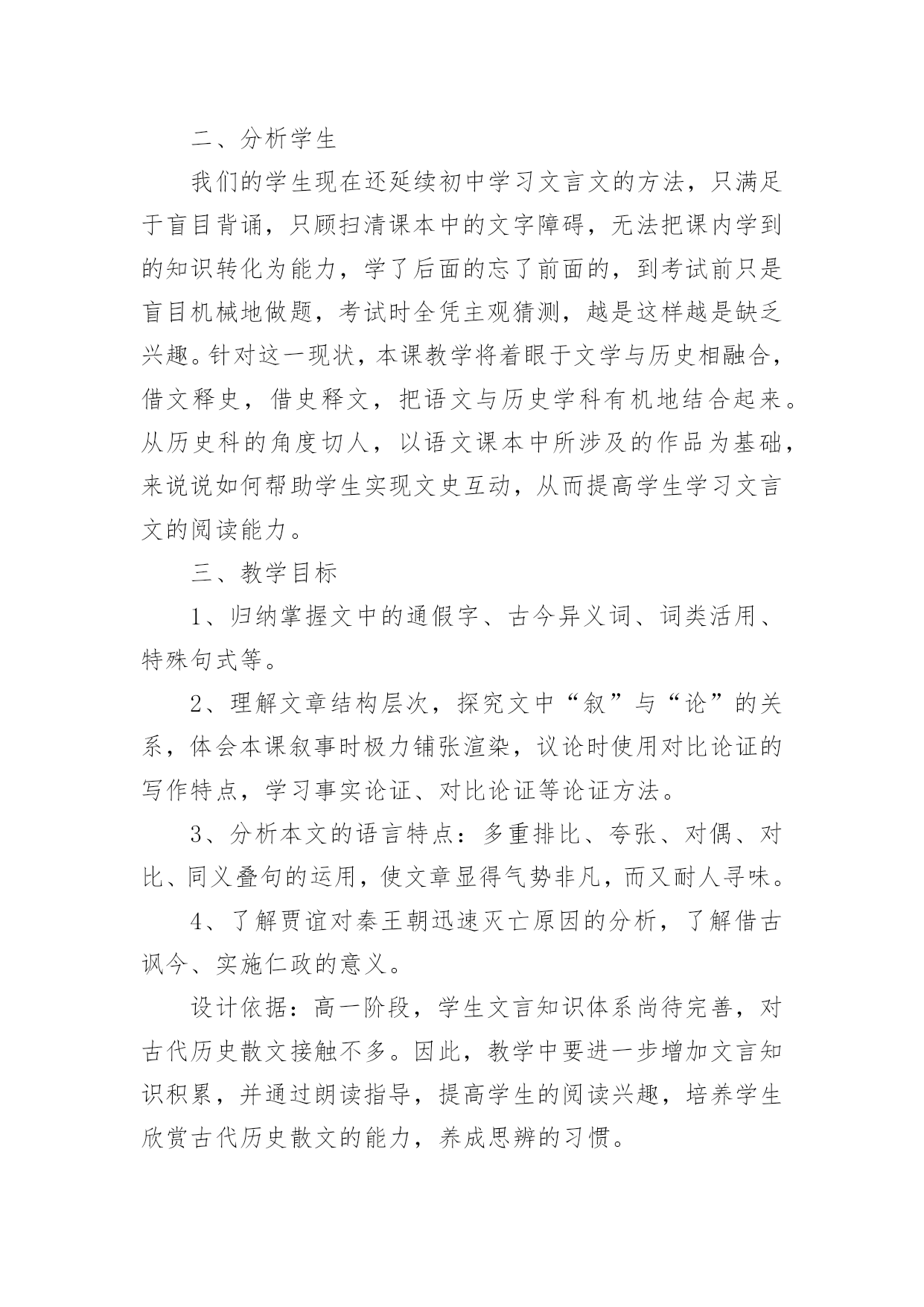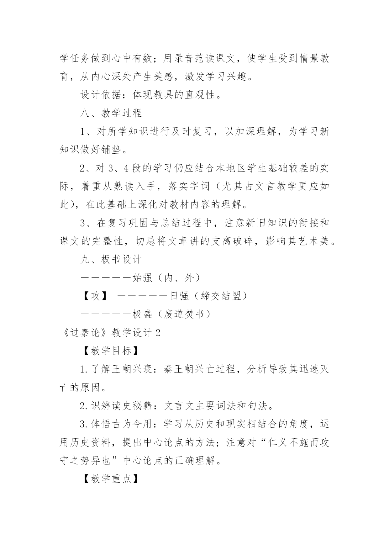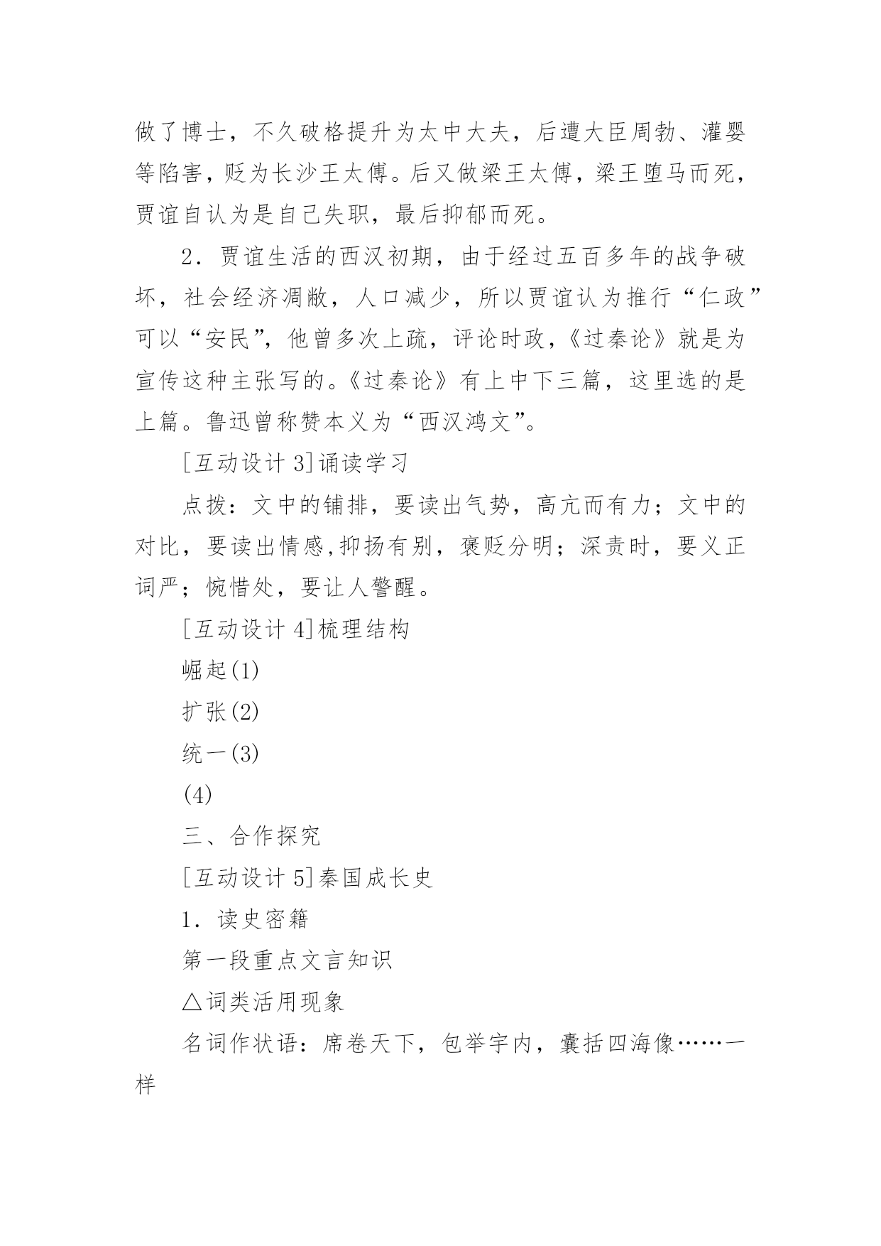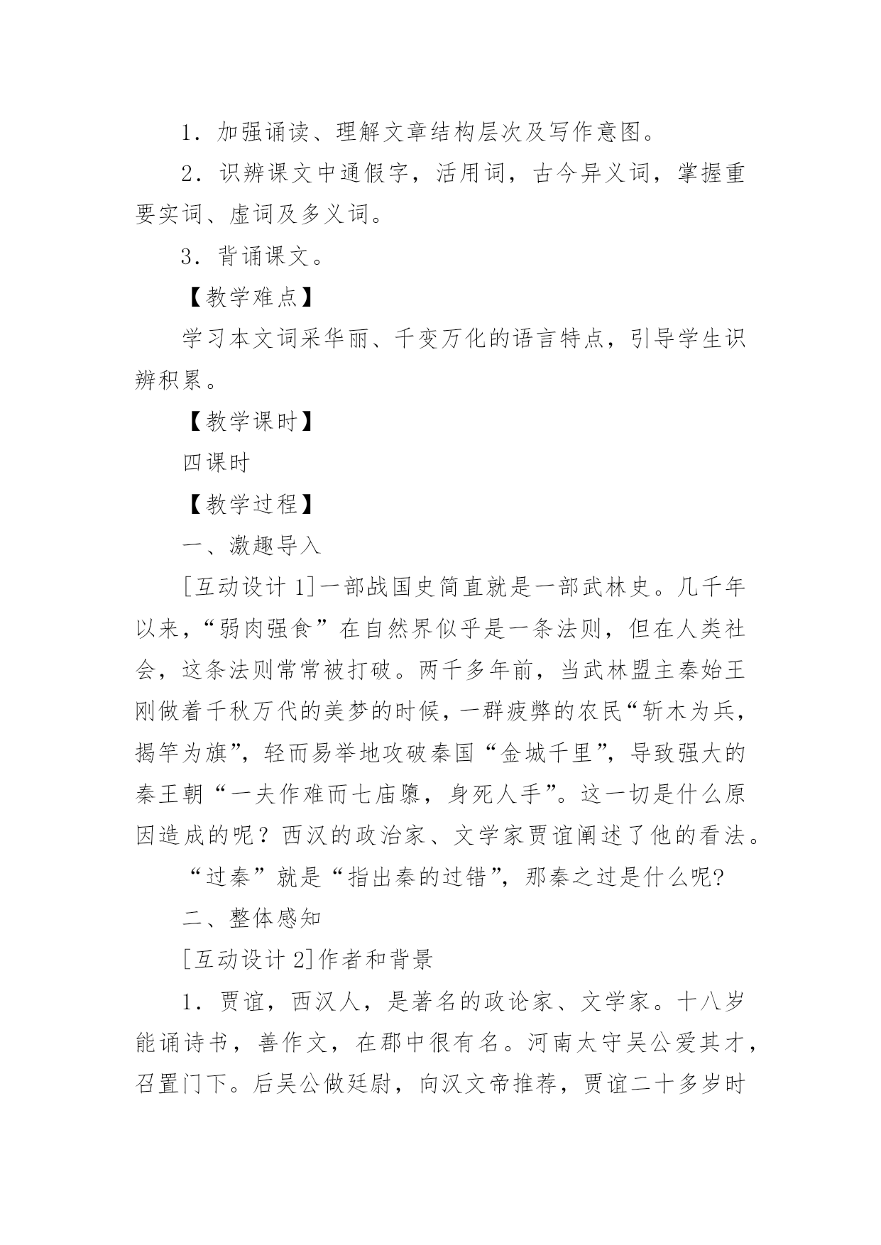 《过秦论》教学设计《过秦论》教学设计在教学工作者开展教学活动前,常常需要准备教学设计,教学设计一般包括教学目标、教学重难点、教学方法、教学步骤与时间分配等环节。你知道什么样的教学设计才能切实有效地帮助到我们吗?以下是小编为大家整理的《过秦论》教学设计,希望对大家有所帮助。《过秦论》教学设计1一、教材分析《过秦论》是高中语文教材第二册第五单元的第一篇课文,节选自贾谊的《新书》,原著分为上、中、下三篇,这里选的是上篇。作者通过对秦王朝兴起、强盛、衰亡过程的叙述,议论了秦王朝成败的缘由,以借古讽今。通过单元提示,我们知道,《史记》和《汉书》等纪传体史书的出现,标志着我国历史散文取得了空前伟大的成就。要通过本单元的学习进一步引导学生欣赏古典文学作品,提高学生的文学素养。其中《过秦论》是本单元的重点课文,学习时,要把握课文的思想内容,着重了解贾谊对秦王朝迅速灭亡的原因的分析,在朗读和背诵过程中,注意掌握有关的文言文词语和文言句式。二、分析学生我们的学生现在还延续初中学习文言文的方法,只满足于盲目背诵,只顾扫清课本中的文字障碍,无法把课内学到的知识转化为能力,学了后面的忘了前面的,到考试前只是盲目机械地做题,考试时全凭主观猜测,越是这样越是缺乏兴趣。针对这一现状,本课教学将着眼于文学与历史相融合,借文释史,借史释文,把语文与历史学科有机地结合起来。从历史科的角度切人,以语文课本中所涉及的作品为基础,来说说如何帮助学生实现文史互动,从而提高学生学习文言文的阅读能力。三、教学目标1、归纳掌握文中的通假字、古今异义词、词类活用、特殊句式等。2、理解文章结构层次,探究文中“叙”与“论”的关系,体会本课叙事时极力铺张渲染,议论时使用对比论证的写作特点,学习事实论证、对比论证等论证方法。3、分析本文的语言特点:多重排比、夸张、对偶、对比、同义叠句的运用,使文章显得气势非凡,而又耐人寻味。4、了解贾谊对秦王朝迅速灭亡原因的分析,了解借古讽今、实施仁政的意义。设计依据:高一阶段,学生文言知识体系尚待完善,对古代历史散文接触不多。因此,教学中要进一步增加文言知识积累,并通过朗读指导,提高学生的阅读兴趣,培养学生欣赏古代历史散文的能力,养成思辨的习惯。四、说教学重点难点本课的教学重点为:1、识辨课文中通假字,活用词,古今异义词,掌握重要实词、虚词及多义词,积累文言词句知识。2、理解文章结构层次及写作意图,赏析本文的语言特点。本课的教学难点为:注意对“仁义不施而攻守之势异也”中心论点的正确理解。设计依据:从学生文言知识薄弱的现状出发,与高考中文言知识比重比较大相结合,主要为学生阅读其它的文言文打下坚实的基础。五、教学方法1、提问讨论法2、讲练结合法3、范读背诵法六、教学程序第二课时的要点是:解读3、4两段的文意,详细深入理解文章结构层次,在此基础上掌握秦由盛而衰的原因,为准确理解本文主旨———仁义不施而攻守之势异也作准备。设计依据:《过秦论》篇幅较长,文言知识较丰富,文章丰厚,因此我设计用三课时教学本文。七、教具安排用投影仪打出本节课的教学目标,使学生对本节课的教学任务做到心中有数;用录音范读课文,使学生受到情景教育,从内心深处产生美感,激发学习兴趣。设计依据:体现教具的直观性。八、教学过程1、对所学知识进行及时复习,以加深理解,为学习新知识做好铺垫。2、对3、4段的学习仍应结合本地区学生基础较差的实际,着重从熟读入手,落实字词(尤其古文言教学更应如此),在此基础上深化对教材内容的理解。3、在复习巩固与总结过程中,注意新旧知识的衔接和课文的完整性,切忌将文章讲的支离破碎,影响其艺术美。九、板书设计―――――始强(内、外)【攻】―――――日强(缔交结盟)―――――极盛(废道焚书)《过秦论》教学设计2【教学目标】1.了解王朝兴衰:秦王朝兴亡过程,分析导致其迅速灭亡的原因。2.识辨读史秘籍:文言文主要词法和句法。3.体悟古为今用:学习从历史和现实相结合的角度,运用历史资料,提出中心论点的方法;注意对“仁义不施而攻守之势异也”中心论点的正确理解。【教学重点】1.加强诵读、理解文章结构层次及写作意图。2.识辨课文中通假字,活用词,古今异义词,掌握重要实词、虚词及多义词。3.背诵课文。【教学难点】学习本文词采华丽、千变万化的语言特点,引导学生识辨积累。【教学课时】四课时【教学过程】一、激趣导入[互动设计1]一部战国史简直就是一部武林史。几千年以来,“弱肉强食”在自然界似乎是一条法则,但在人类社会,这条法则常常被打破。两千多年前,当武林盟主秦始王刚做着千秋万代的美梦的时候,一群疲弊的农民“斩木为兵,揭竿为旗”,轻而易举地攻破秦国“金城千里”,导致强大的秦王朝“一夫作难而七庙隳,身死人手”。这一切是什么原因造成的呢?西汉的政治家、文学家贾谊阐述了他的看法。“过秦”就是“指