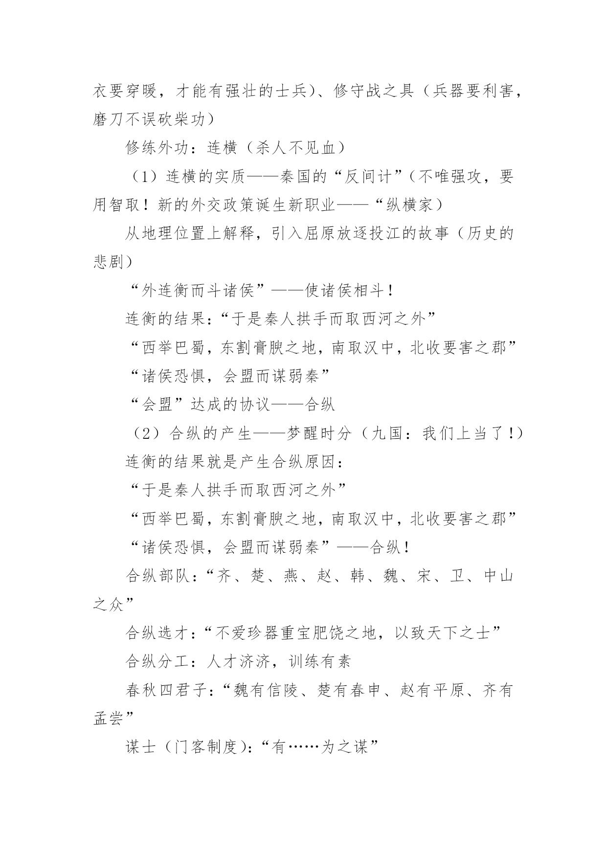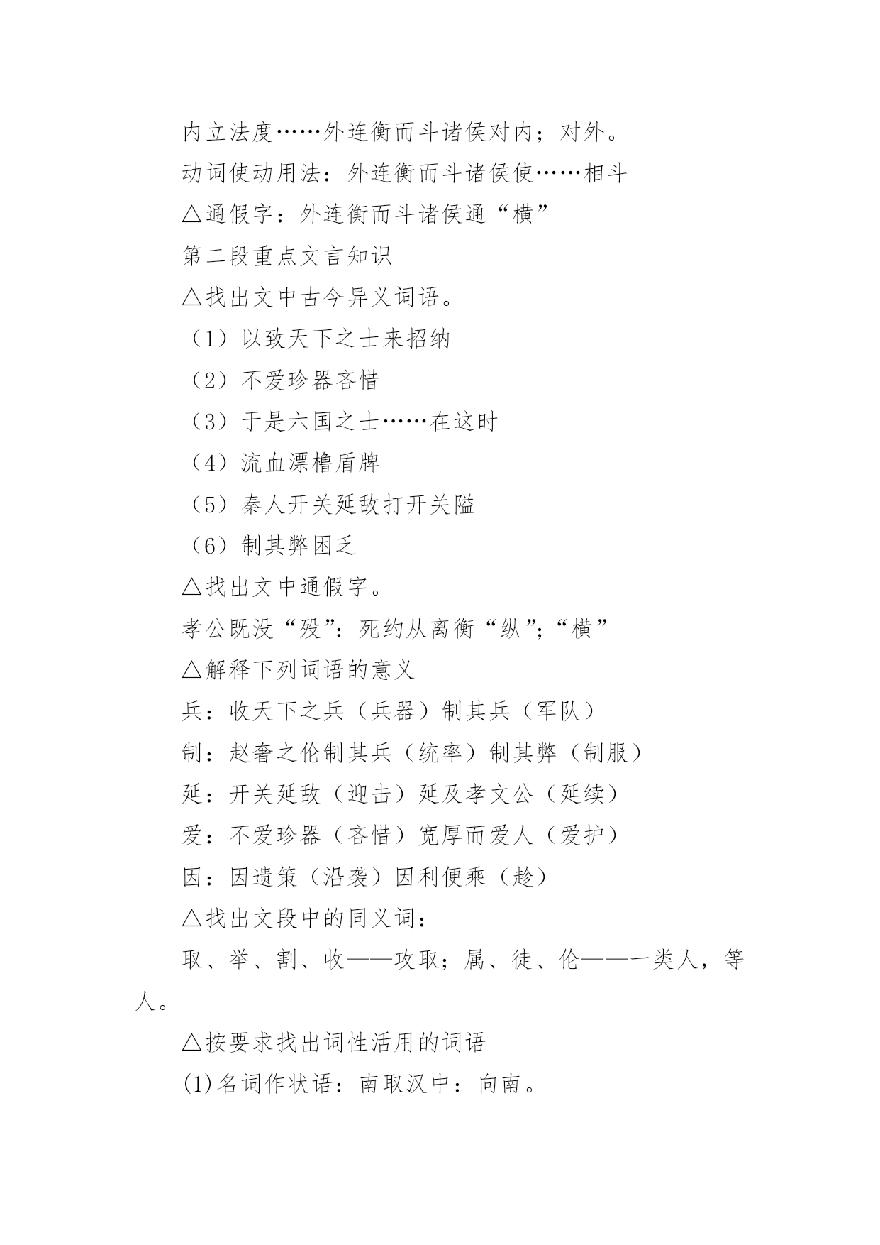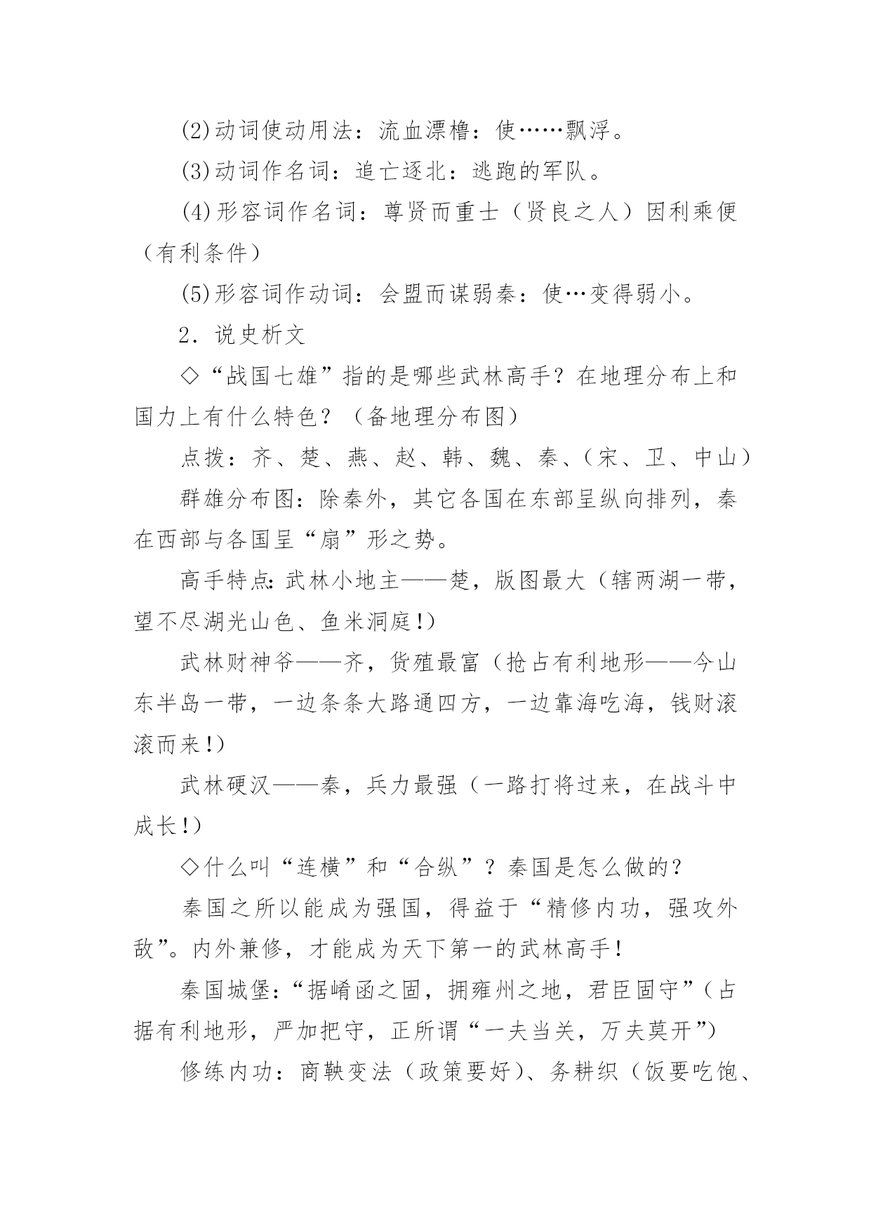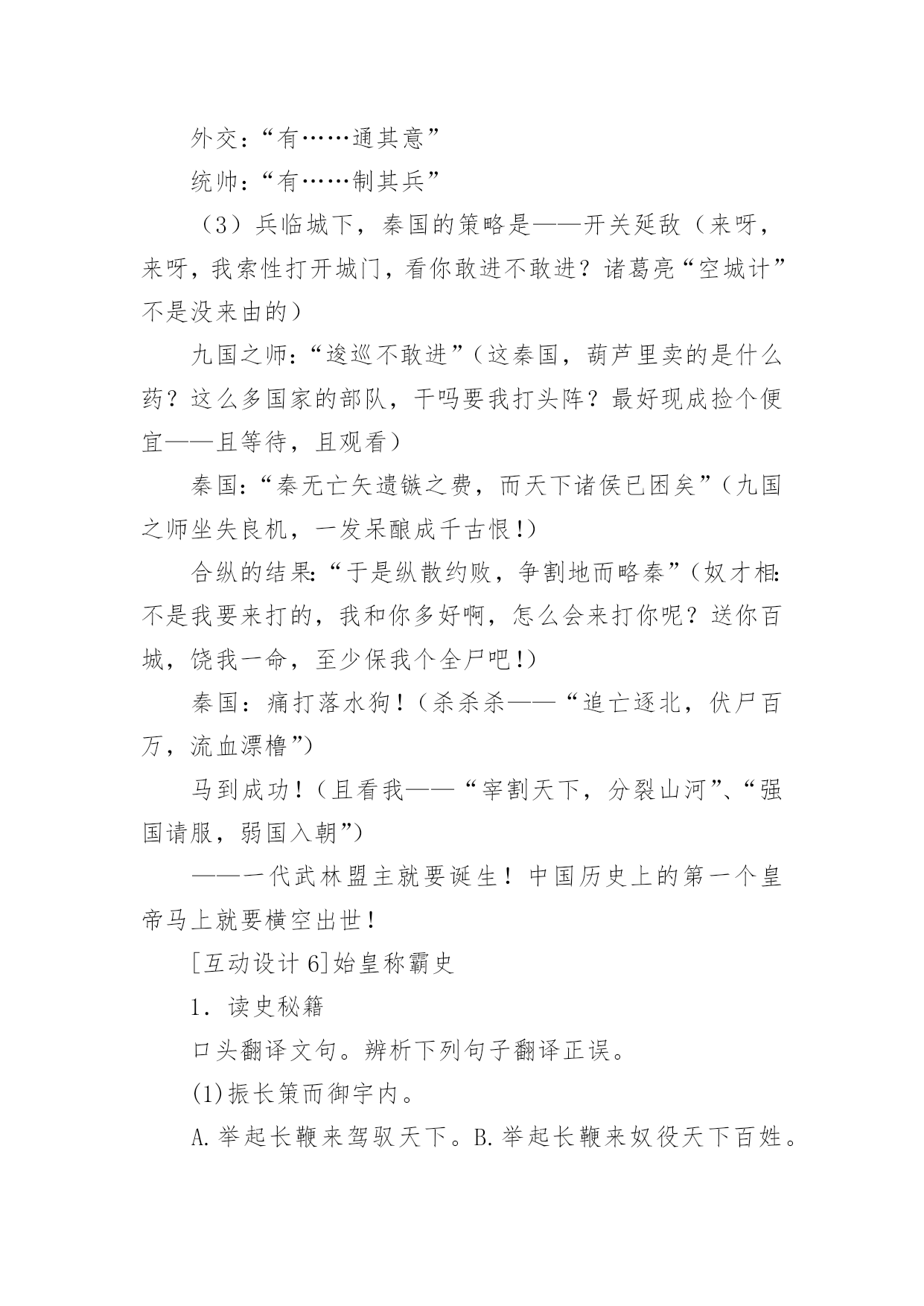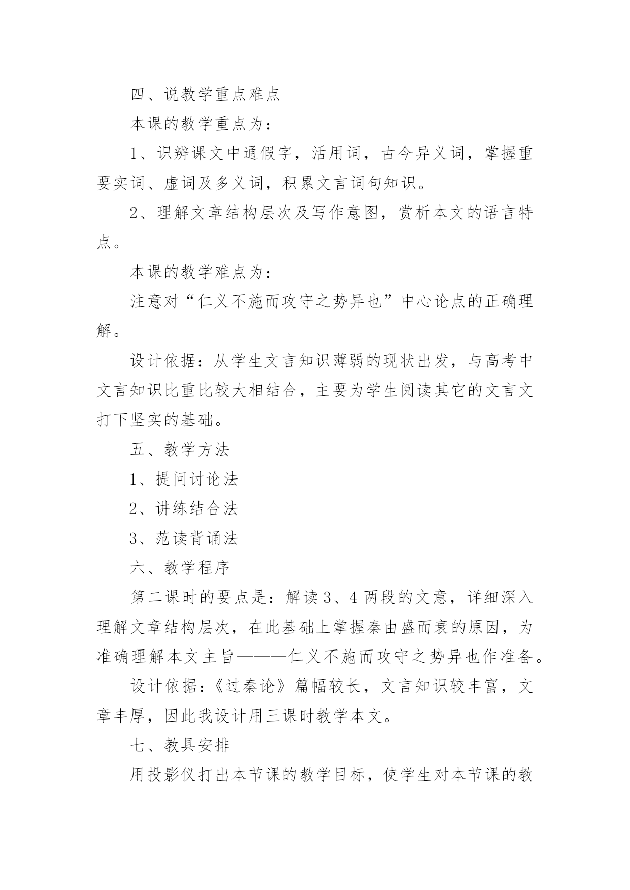 《过秦论》教学设计《过秦论》教学设计在教学工作者开展教学活动前,常常需要准备教学设计,教学设计一般包括教学目标、教学重难点、教学方法、教学步骤与时间分配等环节。你知道什么样的教学设计才能切实有效地帮助到我们吗?以下是小编为大家整理的《过秦论》教学设计,希望对大家有所帮助。《过秦论》教学设计1一、教材分析《过秦论》是高中语文教材第二册第五单元的第一篇课文,节选自贾谊的《新书》,原著分为上、中、下三篇,这里选的是上篇。作者通过对秦王朝兴起、强盛、衰亡过程的叙述,议论了秦王朝成败的缘由,以借古讽今。通过单元提示,我们知道,《史记》和《汉书》等纪传体史书的出现,标志着我国历史散文取得了空前伟大的成就。要通过本单元的学习进一步引导学生欣赏古典文学作品,提高学生的文学素养。其中《过秦论》是本单元的重点课文,学习时,要把握课文的思想内容,着重了解贾谊对秦王朝迅速灭亡的原因的分析,在朗读和背诵过程中,注意掌握有关的文言文词语和文言句式。二、分析学生我们的学生现在还延续初中学习文言文的方法,只满足于盲目背诵,只顾扫清课本中的文字障碍,无法把课内学到的知识转化为能力,学了后面的忘了前面的,到考试前只是盲目机械地做题,考试时全凭主观猜测,越是这样越是缺乏兴趣。针对这一现状,本课教学将着眼于文学与历史相融合,借文释史,借史释文,把语文与历史学科有机地结合起来。从历史科的角度切人,以语文课本中所涉及的作品为基础,来说说如何帮助学生实现文史互动,从而提高学生学习文言文的阅读能力。三、教学目标1、归纳掌握文中的通假字、古今异义词、词类活用、特殊句式等。2、理解文章结构层次,探究文中“叙”与“论”的关系,体会本课叙事时极力铺张渲染,议论时使用对比论证的写作特点,学习事实论证、对比论证等论证方法。3、分析本文的语言特点:多重排比、夸张、对偶、对比、同义叠句的运用,使文章显得气势非凡,而又耐人寻味。4、了解贾谊对秦王朝迅速灭亡原因的分析,了解借古讽今、实施仁政的意义。设计依据:高一阶段,学生文言知识体系尚待完善,对古代历史散文接触不多。因此,教学中要进一步增加文言知识积累,并通过朗读指导,提高学生的阅读兴趣,培养学生欣赏古代历史散文的能力,养成思辨的习惯。四、说教学重点难点本课的教学重点为:1、识辨课文中通假字,活用词,古今异义词,掌握重要实词、虚词及多义词,积累文言词句知识。2、理解文章结构层次及写作意图,赏析本文的语言特点。本课的教学难点为:注意对“仁义不施而攻守之势异也”中心论点的正确理解。设计依据:从学生文言知识薄弱的现状出发,与高考中文言知识比重比较大相结合,主要为学生阅读其它的文言文打下坚实的基础。五、教学方法1、提问讨论法2、讲练结合法3、范读背诵法六、教学程序第二课时的要点是:解读3、4两段的文意,详细深入理解文章结构层次,在此基础上掌握秦由盛而衰的原因,为准确理解本文主旨———仁义不施而攻守之势异也作准备。设计依据:《过秦论》篇幅较长,文言知识较丰富,文章丰厚,因此我设计用三课时教学本文。七、教具安排用投影仪打出本节课的教学目标,使学生对本节课的教学任务做到心中有数;用录音范读课文,使学生受到情景教育,从内心深处产生美感,激发学习兴趣。设计依据:体现教具的直观性。八、教学过程1、对所学知识进行及时复习,以加深理解,为学习新知识做好铺垫。2、对3、4段的学习仍应结合本地区学生基础较差的实际,着重从熟读入手,落实字词(尤其古文言教学更应如此),在此基础上深化对教材内容的理解。3、在复习巩固与总结过程中,注意新旧知识的衔接和课文的完整性,切忌将文章讲的支离破碎,影响其艺术美。九、板书设计―――――始强(内、外)【攻】―――――日强(缔交结盟)―――――极盛(废道焚书)《过秦论》教学设计2【教学目标】1.了解王朝兴衰:秦王朝兴亡过程,分析导致其迅速灭亡的原因。2.识辨读史秘籍:文言文主要词法和句法。3.体悟古为今用:学习从历史和现实相结合的角度,运用历史资料,提出中心论点的方法;注意对“仁义不施而攻守之势异也”中心论点的正确理解。【教学重点】1.加强诵读、理解文章结构层次及写作意图。2.识辨课文中通假字,活用词,古今异义词,掌握重要实词、虚词及多义词。3.背诵课文。【教学难点】学习本文词采华丽、千变万化的语言特点,引导学生识辨积累。【教学课时】四课时【教学过程】一、激趣导入[互动设计1]一部战国史简直就是一部武林史。几千年以来,“弱肉强食”在自然界似乎是一条法则,但在人类社会,这条法则常常被打破。两千多年前,当武林盟主秦始王刚做着千秋万代的美梦的时候,一群疲弊的农民“斩木为兵,揭竿为旗”,轻而易举地攻破秦国“金城千里”,导致强大的秦王朝“一夫作难而七庙隳,身死人手”。这一切是什么原因造成的呢?西汉的政治家、文学家贾谊阐述了他的看法。“过秦”就是“指