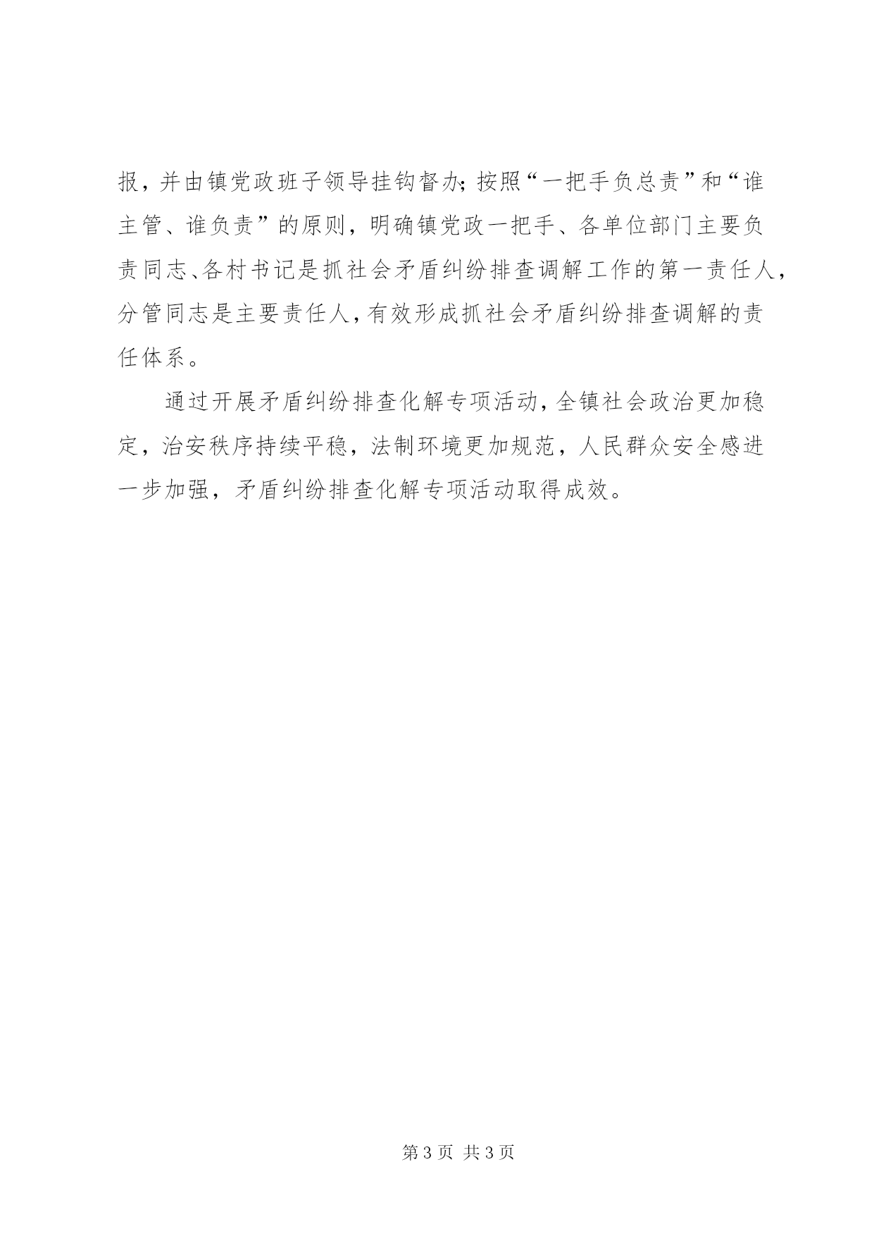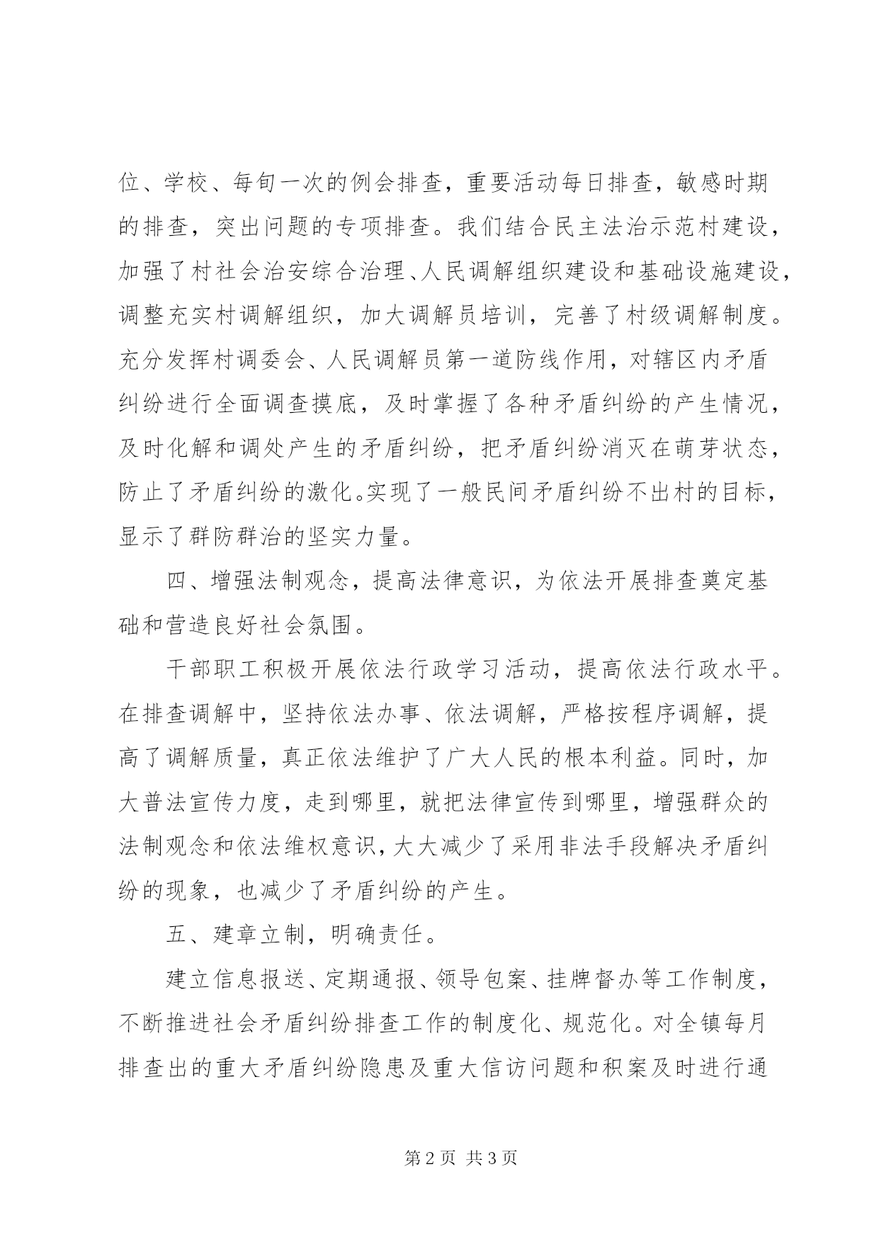 第PAGE\*Arabic\*MERGEFORMAT3页共NUMPAGES\*MERGEFORMAT3页司法所开展“两个排查”活动总结为深入贯彻落实上级文件精神,充分发挥人民调解工作的职能作用,预防化解社会矛盾,维护社会和谐稳定,按照“两个排查”的要求,我所在全镇范围内认真开展了矛盾纠排查和社区矫正、安置帮教安全稳定排查专项活动。现将开展专项活动工作情况总结如下:一、提高认识,精心组织,周密部署。党委、政府对这次大排查工作高度重视,召开班子会议专题传达贯彻上级文件精神,明确了工作目标、任务,提高了对开展此次专项活动的重要性和必要性的认识,并按照上级的统一安排部署,结合本镇实际,研究布置了我镇社会矛盾专项整治活动工作,包括机构成立、方案制定、责任落实、分工明确、工作措施机制等的确定。二、突出重点,抓住主要矛盾重点排查。X61472;我所针对婚姻家庭、邻里关系、宅基地等当前热点难点问题和民生问题开展重点排查。对这些突出的矛盾纠纷,建立包案调处机制,落实责任制明确牵头领导、责任单位、责任人、办结要求、办结期限。实现了大事不出镇,难事不出村,小事不出村组的目标,缓和、化解了矛盾,维护了稳定。三、加强基层建设,强化属地管理,发挥群防群治力量。进一步健全司法所职能,做到每月一次的定期排查,村、单位、学校、每旬一次的例会排查,重要活动每日排查,敏感时期的排查,突出问题的专项排查。我们结合民主法治示范村建设,加强了村社会治安综合治理、人民调解组织建设和基础设施建设,调整充实村调解组织,加大调解员培训,完善了村级调解制度。充分发挥村调委会、人民调解员第一道防线作用,对辖区内矛盾纠纷进行全面调查摸底,及时掌握了各种矛盾纠纷的产生情况,及时化解和调处产生的矛盾纠纷,把矛盾纠纷消灭在萌芽状态,防止了矛盾纠纷的激化。实现了一般民间矛盾纠纷不出村的目标,显示了群防群治的坚实力量。四、增强法制观念,提高法律意识,为依法开展排查奠定基础和营造良好社会氛围。干部职工积极开展依法行政学习活动,提高依法行政水平。在排查调解中,坚持依法办事、依法调解,严格按程序调解,提高了调解质量,真正依法维护了广大人民的根本利益。同时,加大普法宣传力度,走到哪里,就把法律宣传到哪里,增强群众的法制观念和依法维权意识,大大减少了采用非法手段解决矛盾纠纷的现象,也减少了矛盾纠纷的产生。五、建章立制,明确责任。建立信息报送、定期通报、领导包案、挂牌督办等工作制度,不断推进社会矛盾纠纷排查工作的制度化、规范化。对全镇每月排查出的重大矛盾纠纷隐患及重大信访问题和积案及时进行通报,并由镇党政班子领导挂钩督办;按照“一把手负总责”和“谁主管、谁负责”的原则,明确镇党政一把手、各单位部门主要负责同志、各村书记是抓社会矛盾纠纷排查调解工作的第一责任人,分管同志是主要责任人,有效形成抓社会矛盾纠纷排查调解的责任体系。通过开展矛盾纠纷排查化解专项活动,全镇社会政治更加稳定,治安秩序持续平稳,法制环境更加规范,人民群众安全感进一步加强,矛盾纠纷排查化解专项活动取得成效。