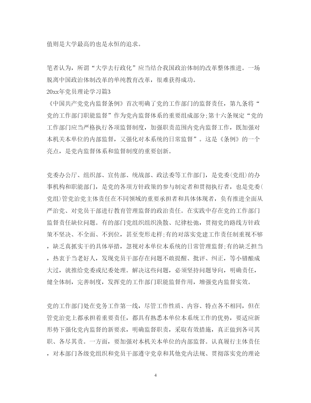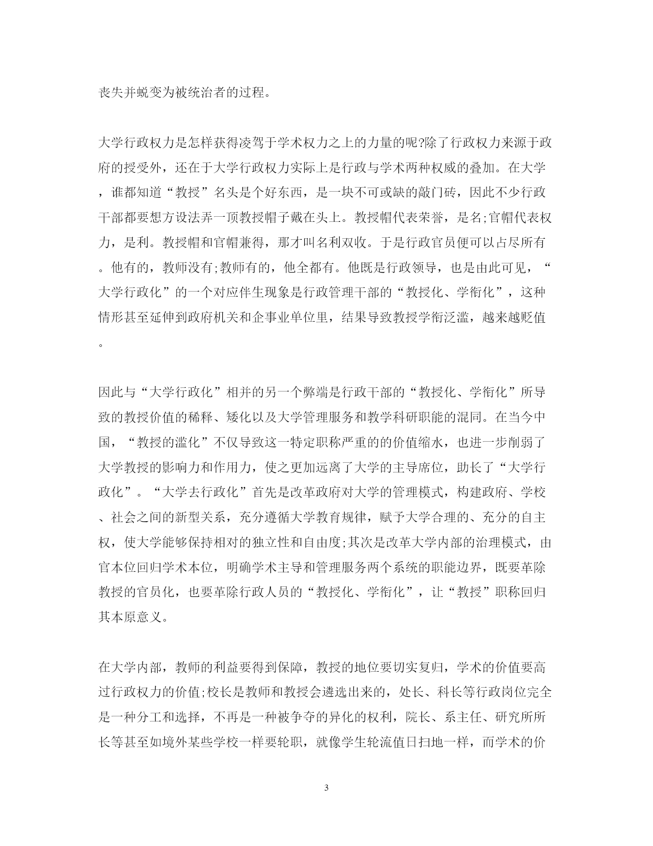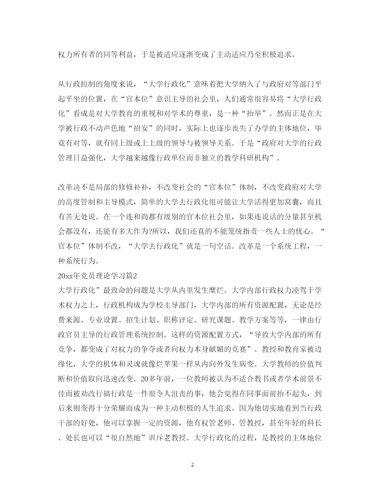 此资料由网络收集而来,如有侵权请告知上传者立即删除。资料共分享,我们负责传递知识。PAGEPAGE52020年党员理论学习20xx年党员理论的学习,对本系统相关单位党组织及其负责人遵守党章党规党纪、履行管党治党主体责任、正确行使权力和廉洁自律等情况进行监督,发现问题及时处置,决不能一谈到监督就只想到纪委或推给纪委。下面是范文网小编为大家收集整理的20xx年党员理论学习,欢迎大家阅读。20xx年党员理论学习篇1国家对解决备受人们诟病的“大学行政化、衙门化”问题决心很大,不但《国家中长期教育改革和发展规划纲要》正式写入了“探索建立符合学校特点的管理制度和配套政策,克服行政化倾向,取消实际存在的行政级别和行政化管理模式”的主张,而且也有明确的态度,令人高兴。但是冷静一想,心里还有点儿不够踏实,因为一些深层问题和相关问题好像还来不及进入人们的注意。大学去行政化主要涉及两个方面的问题:一是政府与大学的关系,二是大学内部的治理结构。从政府与大学的关系看,大学应该有相对的独立性和自由度,而不是被政府高度管制和主导;从大学内部的治理结构看,以教授为代表的学术力量应该取代以行政为中心的权力系统,全面实行教授会制度和大学校长的遴选制度,行政系统只是一个办事或服务机构。我们必须认识到,中国“大学行政化”是一个存在,这个存在有一定的社会前提。不改变这个前提,仅凭一纸公文“取消实际存在的行政级别和行政化管理模式”,有可能事与愿违。“大学行政化”实质上是全社会“官本位”意识及其体制的产物。除了学校干部行政级别的明确化外,还有讲师、副教授、教授相当于科级、正副处级还是副厅正厅级的说法。在官本位体制内,这种对应的确便于学校同政府部门的同级对话和对等接待。这或许是一种无奈的被适应,因为不适应,就会与这套体制格格不入。后来,有人发现“被行政化”其实也很受用,因为他可以在这套体制内获得权力所有者的同等利益,于是被适应逐渐变成了主动适应乃至积极追求。从行政控制的角度来说,“大学行政化”意味着把大学纳入了与政府对等部门平起平坐的位置,在“官本位”意识主导的社会里,人们通常很容易将“大学行政化”看成是对大学教育的重视和对学术的尊重,是一种“抬举”。然而正是在大学被行政不动声色地“招安”的同时,实际上也逐步丧失了办学的主体地位,毕竟有对等,就有同上级或上上级的领导与被领导关系。于是“政府对大学的行政管理日益强化,大学越来越像行政单位而非独立的教学科研机构”。改革决不是局部的修修补补,不改变社会的“官本位”体制,不改变政府对大学的高度管制和主导模式,简单的大学去行政化很可能让大学活得更加窝囊,而且有苦无处说。在一个连和尚都有级别的官本位社会里,如果连说话的分量甚至机会都没有,还能有多大作为?所以,我们还真的不能笼统指责一些人士的忧心。“官本位”体制不改,“大学去行政化”就是一句空话。改革是一个系统工程,一种系统行为。20xx年党员理论学习篇2大学行政化”最致命的问题是大学从内里发生糜烂。大学内部行政权力凌驾于学术权力之上,行政机构成为学校主导部门,大学内部的所有资源配置,无论是经费来源、专业设置、招生计划、职称评定、研究课题、教学方案等等,一律由行政官员主导的行政管理系统控制。这样的资源配置方式,“导致大学内部的所有竞争,都变成了对权力的争夺或者向权力本身献媚的竞赛”。教授和教育家被边缘化,大学的机体和灵魂就像烂苹果一样从内向外发生病变。大学教师的价值判断和价值取向迅速改变。20多年前,一位教师被认为不适合教书或者学术前景不佳而被劝改行搞行政是一件很令人沮丧的事,他会觉得在同事面前抬不起头,到后来则变得十分荣耀而成为一种主动积极的人生追求。因为他切实地看到当行政干部的好处,他可以掌握一定的资源,他有权管老师、管教授,甚至年轻的科长、处长也可以“很自然地”训斥老教授。大学行政化的过程,是教授的主体地位丧失并蜕变为被统治者的过程。大学行政权力是怎样获得凌驾于学术权力之上的力量的呢?除了行政权力来源于政府的授受外,还在于大学行政权力实际上是行政与学术两种权威的叠加。在大学,谁都知道“教授”名头是个好东西,是一块不可或缺的敲门砖,因此不少行政干部都要想方设法弄一顶教授帽子戴在头上。教授帽代表荣誉,是名;官帽代表权力,是利。教授帽和官帽兼得,那才叫名利双收。于是行政官员便可以占尽所有。他有的,教师没有;教师有的,他全都有。他既是行政领导,也是由此可见,“大学行政化”的一个对应伴生现象是行政管理干部的“教授化、学衔化”,这种情形甚至延伸到政府机关和企事业单位里,结果导致教授学衔泛滥,越来越贬值。因此与“大学行政化”相并的另一个弊端是行政干部的“教授化、学衔化”所导致的教授价值的稀释、矮化以及大学管理服务和教学科研职能的混同。在当今中国,“教授的