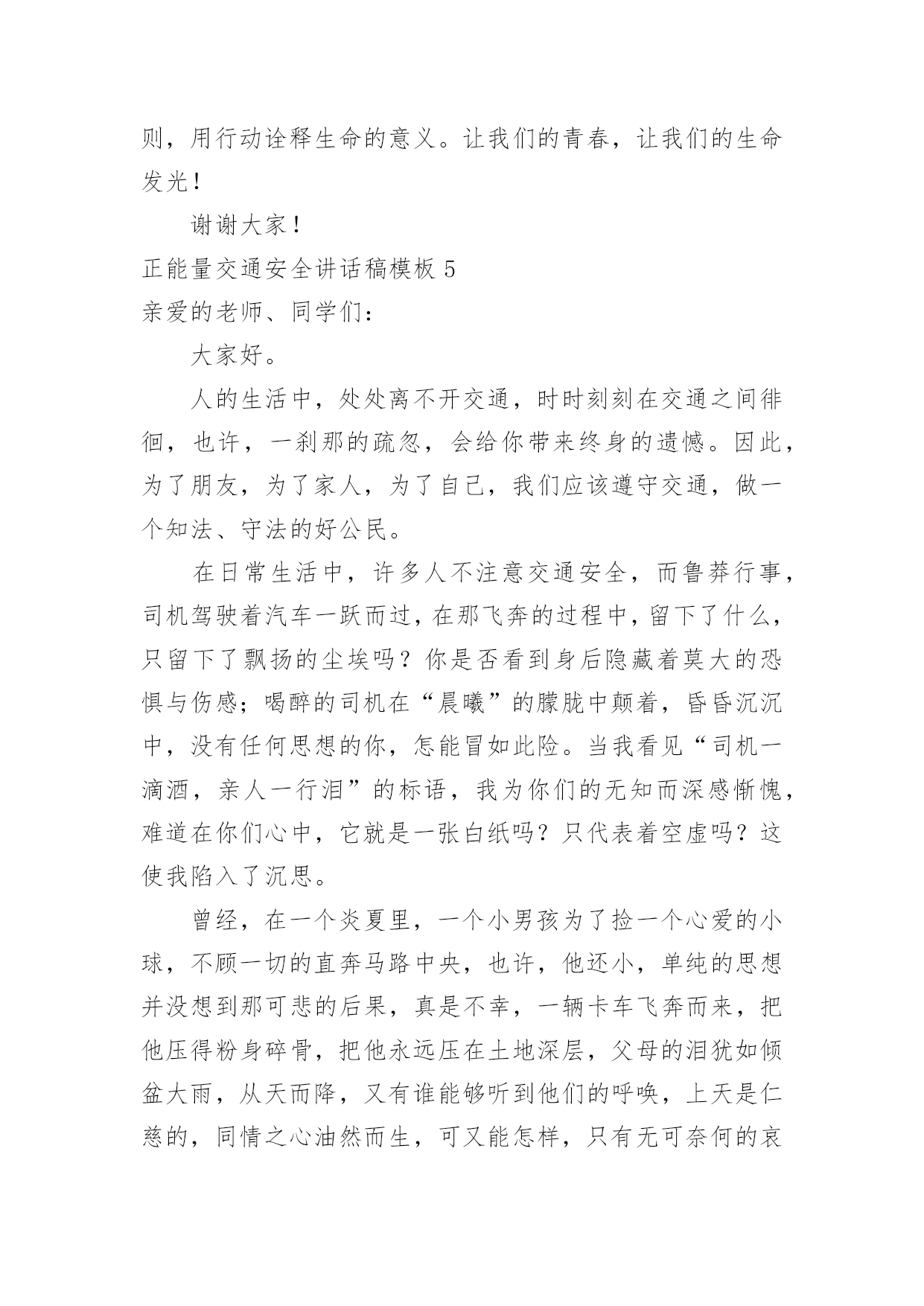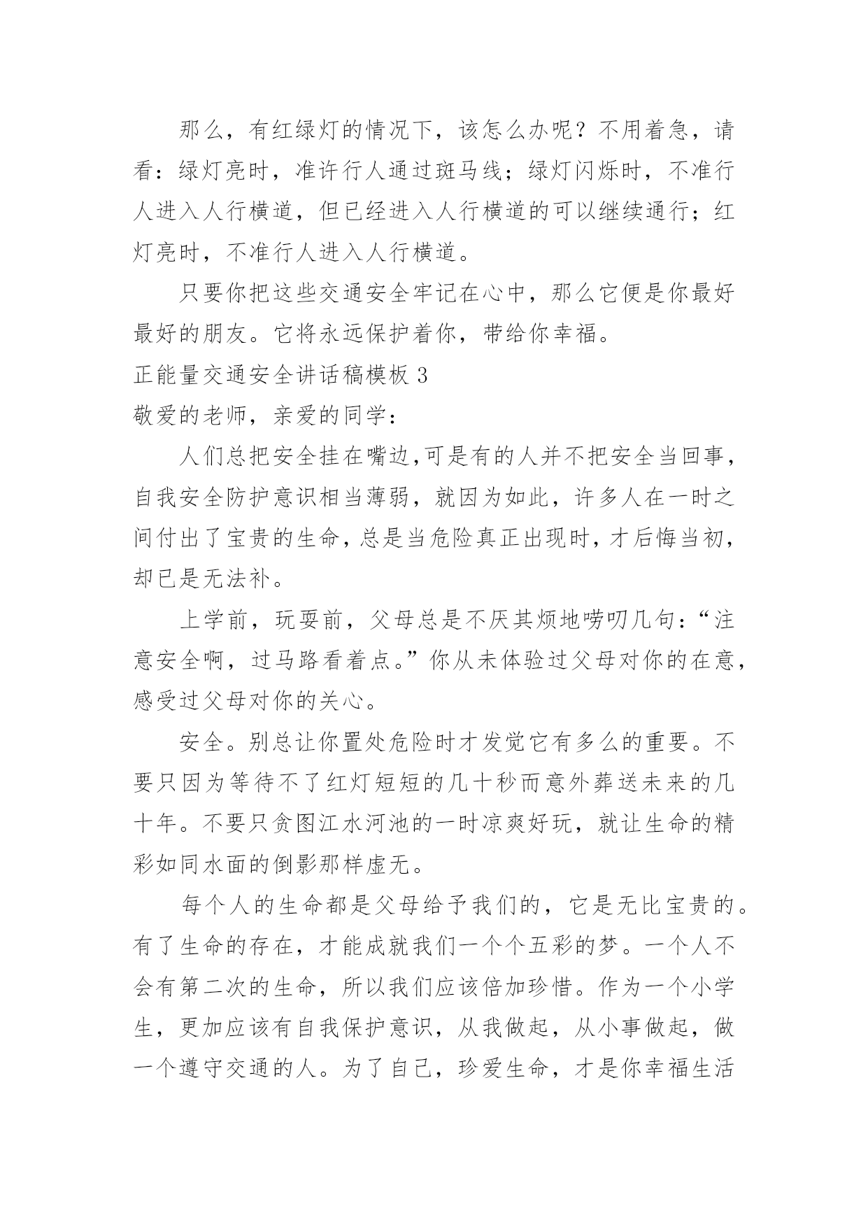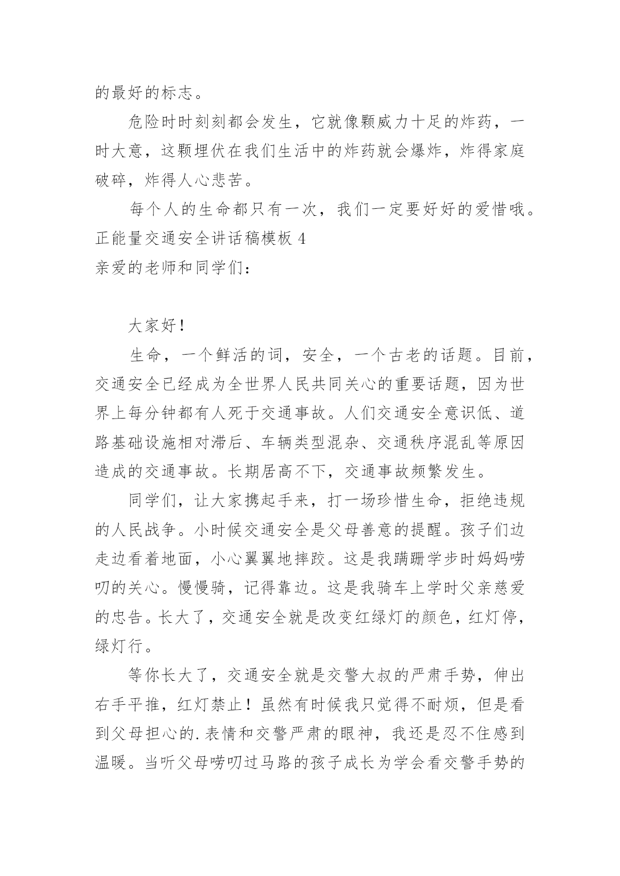 正能量交通安全讲话稿正能量交通安全讲话稿模板在生活中,各种讲话稿频频出现,讲话稿是应用写作研究的重要文体之一。那要怎么写好讲话稿呢?下面是小编整理的正能量交通安全讲话稿模板,欢迎大家借鉴与参考,希望对大家有所帮助。正能量交通安全讲话稿模板1亲爱的老师、同学们:大家好。今天我国旗下讲话的题目是《交通安全记我心中》。安全是什么?安全是忠实的保护神,日日夜夜守护在我们身边,让生命之树挺拔青翠;安全是警钟,时时刻刻提醒我们珍爱生命,注意安全。每天来上学,父母总不忘提醒我们:安全第一。上课时,老师常常教导我们:学校内外要注意安全。我们却常常把他们的话当做耳旁风,而这所谓的耳旁风,正是对我们的爱的叮咛。每当上学放学的路上,放眼望去,好多同学不遵守交通规则,比如走在机动车道上、横穿马路、走逆行道,更有甚者还在车流不息的马路上打闹,多么危险的行为啊。我在此倡议:尽量请家长接送上下学,保护我们的安全;遵守《道路交通安全法实施条例》和《中小学生守则》规定,不满十二周岁的同学坚决不骑自行车上路;在马路上步行时一定要走人行横道,并且靠右行;横穿马路时,要走斑马线,注意往来车辆。生命只有一次,只有珍爱生命,时时刻刻注意安全,我们才能平平安安的度过一生,在此希望大家能共同遵守交通规则,享受幸福人生。我的讲话到此结束,谢谢大家。正能量交通安全讲话稿模板2敬爱的老师,亲爱的同学:交通安全与我们的关系是非常密切的,它就像我们的朋友。日日夜夜都守在我们的身边,教育我们,劝戒我们。生命是宝贵的,人的一生就只有一次生命,我们应该爱惜生命。注意交通安全也是爱惜生命的一部分。现在因为交通事故而死于非命的人太多了,难道他们不是死的太冤枉了吗?交通安全,我们应当牢记在心。更主要的,是要知道交通安全常识:首先,行人须在人行通道内行走,没有人行道靠右边行走。穿越马路须走人行横道,通过有交通信号控制的人行横道,须遵守信号的规定。通过没有交通信号控制的人行道,要左顾右盼,注意车辆来往,不准追逐,奔跑。有人行过街天桥或地道时,须走人行街天桥或地道。不准爬马路边和路中的护栏、隔离栏,不准在道路上扒车、追车、强行拦车或抛物击车。那么,有红绿灯的情况下,该怎么办呢?不用着急,请看:绿灯亮时,准许行人通过斑马线;绿灯闪烁时,不准行人进入人行横道,但已经进入人行横道的可以继续通行;红灯亮时,不准行人进入人行横道。只要你把这些交通安全牢记在心中,那么它便是你最好最好的朋友。它将永远保护着你,带给你幸福。正能量交通安全讲话稿模板3敬爱的老师,亲爱的同学:人们总把安全挂在嘴边,可是有的人并不把安全当回事,自我安全防护意识相当薄弱,就因为如此,许多人在一时之间付出了宝贵的生命,总是当危险真正出现时,才后悔当初,却已是无法补。上学前,玩耍前,父母总是不厌其烦地唠叨几句:“注意安全啊,过马路看着点。”你从未体验过父母对你的在意,感受过父母对你的关心。安全。别总让你置处危险时才发觉它有多么的重要。不要只因为等待不了红灯短短的几十秒而意外葬送未来的几十年。不要只贪图江水河池的一时凉爽好玩,就让生命的精彩如同水面的倒影那样虚无。每个人的生命都是父母给予我们的,它是无比宝贵的。有了生命的存在,才能成就我们一个个五彩的梦。一个人不会有第二次的生命,所以我们应该倍加珍惜。作为一个小学生,更加应该有自我保护意识,从我做起,从小事做起,做一个遵守交通的人。为了自己,珍爱生命,才是你幸福生活的最好的标志。危险时时刻刻都会发生,它就像颗威力十足的炸药,一时大意,这颗埋伏在我们生活中的炸药就会爆炸,炸得家庭破碎,炸得人心悲苦。每个人的生命都只有一次,我们一定要好好的爱惜哦。正能量交通安全讲话稿模板4亲爱的老师和同学们:大家好!生命,一个鲜活的词,安全,一个古老的话题。目前,交通安全已经成为全世界人民共同关心的重要话题,因为世界上每分钟都有人死于交通事故。人们交通安全意识低、道路基础设施相对滞后、车辆类型混杂、交通秩序混乱等原因造成的交通事故。长期居高不下,交通事故频繁发生。同学们,让大家携起手来,打一场珍惜生命,拒绝违规的人民战争。小时候交通安全是父母善意的提醒。孩子们边走边看着地面,小心翼翼地摔跤。这是我蹒跚学步时妈妈唠叨的关心。慢慢骑,记得靠边。这是我骑车上学时父亲慈爱的忠告。长大了,交通安全就是改变红绿灯的颜色,红灯停,绿灯行。等你长大了,交通安全就是交警大叔的严肃手势,伸出右手平推,红灯禁止!虽然有时候我只觉得不耐烦,但是看到父母担心的.表情和交警严肃的眼神,我还是忍不住感到温暖。当听父母唠叨过马路的孩子成长为学会看交警手势的少年时,车辆日新月异,路上的车辆速度越来越快,随之而来的交通安全问题成为我们享受宁静生活的不和谐运动。当刺耳的刹车声响起,路上有一点殷红的血迹,然后另一个家庭将笼罩在悲伤和泪水中,他们的生活从