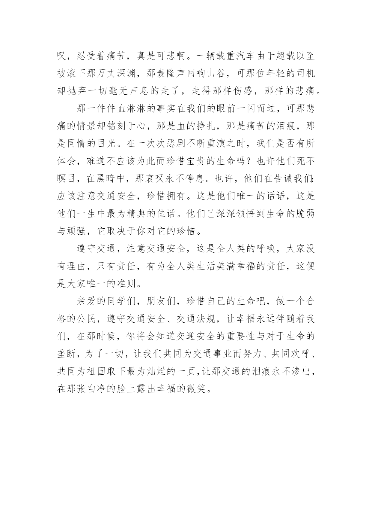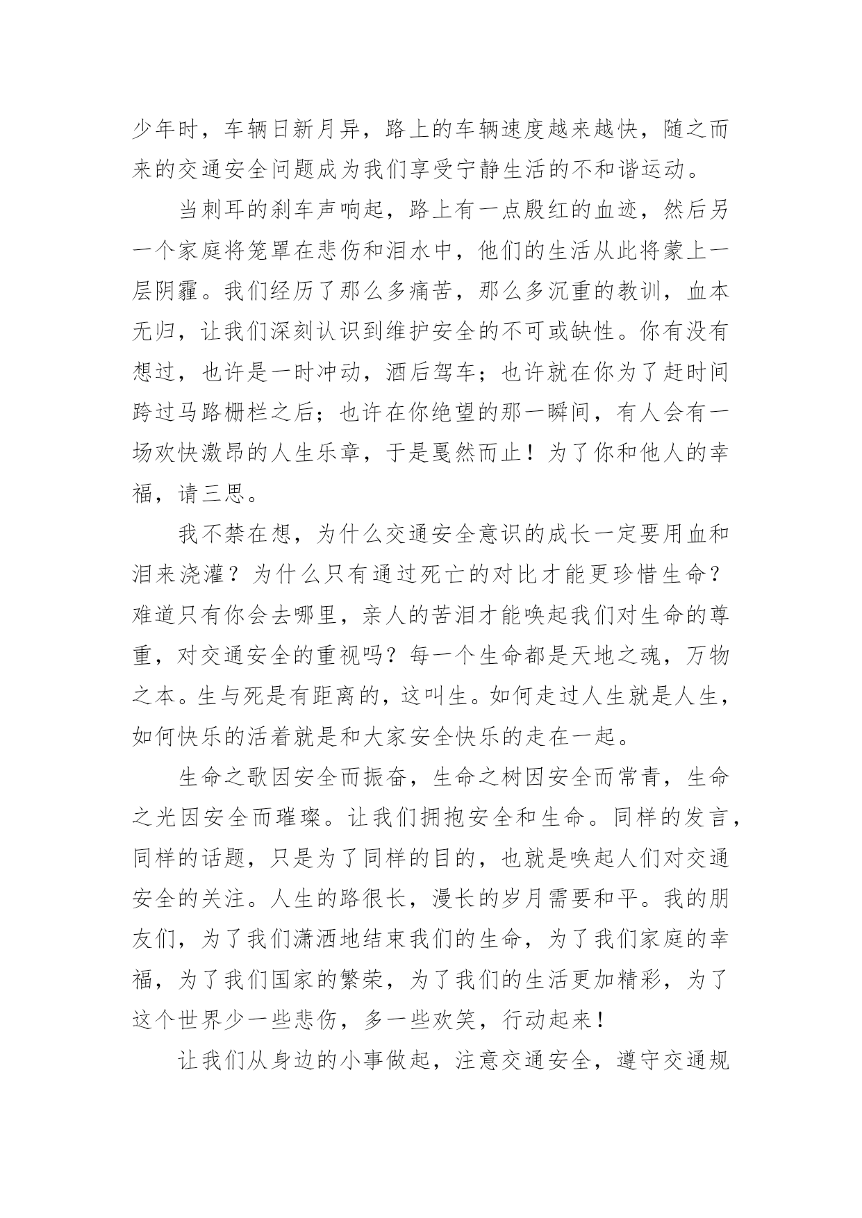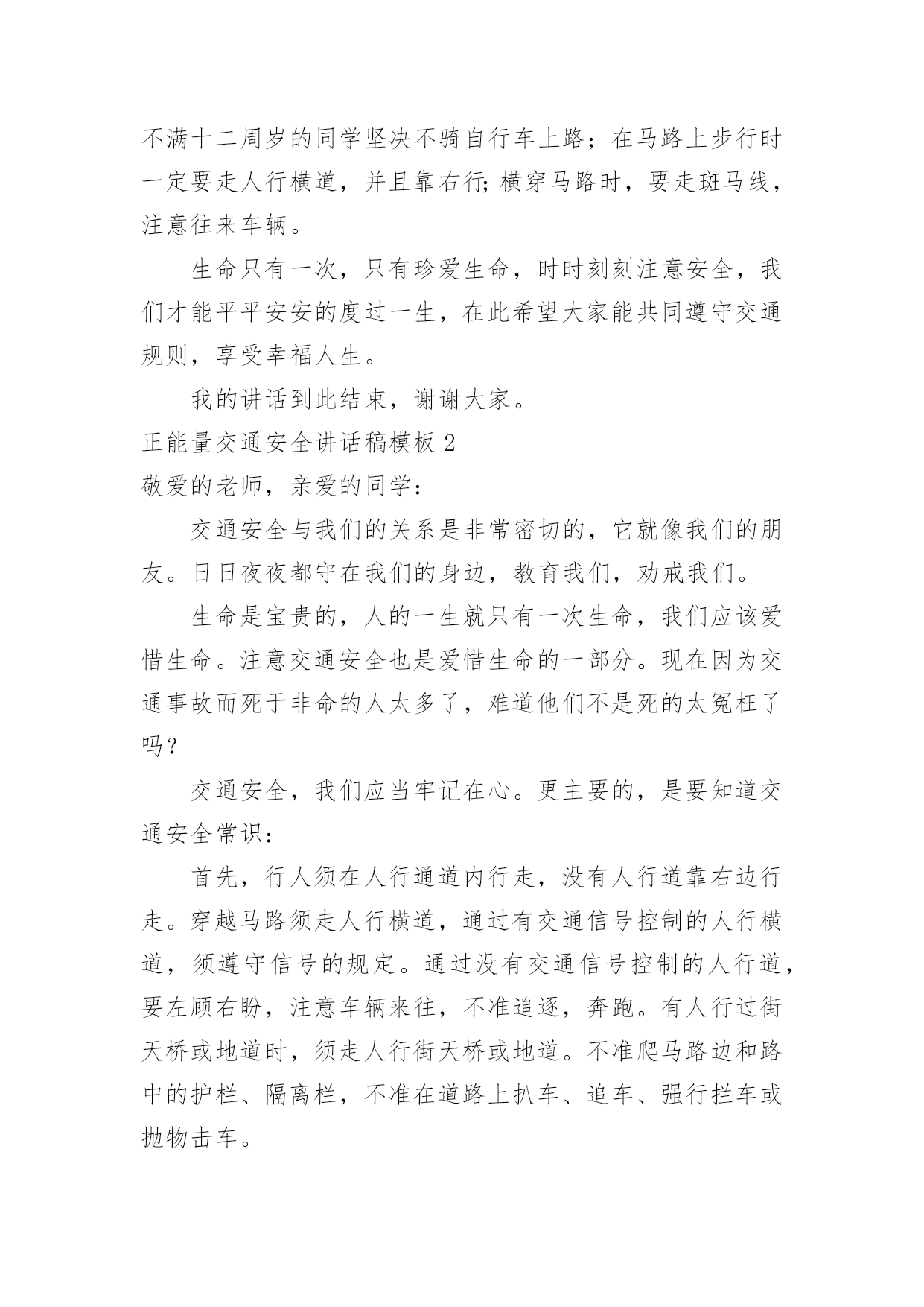 正能量交通安全讲话稿正能量交通安全讲话稿模板在生活中,各种讲话稿频频出现,讲话稿是应用写作研究的重要文体之一。那要怎么写好讲话稿呢?下面是小编整理的正能量交通安全讲话稿模板,欢迎大家借鉴与参考,希望对大家有所帮助。正能量交通安全讲话稿模板1亲爱的老师、同学们:大家好。今天我国旗下讲话的题目是《交通安全记我心中》。安全是什么?安全是忠实的保护神,日日夜夜守护在我们身边,让生命之树挺拔青翠;安全是警钟,时时刻刻提醒我们珍爱生命,注意安全。每天来上学,父母总不忘提醒我们:安全第一。上课时,老师常常教导我们:学校内外要注意安全。我们却常常把他们的话当做耳旁风,而这所谓的耳旁风,正是对我们的爱的叮咛。每当上学放学的路上,放眼望去,好多同学不遵守交通规则,比如走在机动车道上、横穿马路、走逆行道,更有甚者还在车流不息的马路上打闹,多么危险的行为啊。我在此倡议:尽量请家长接送上下学,保护我们的安全;遵守《道路交通安全法实施条例》和《中小学生守则》规定,不满十二周岁的同学坚决不骑自行车上路;在马路上步行时一定要走人行横道,并且靠右行;横穿马路时,要走斑马线,注意往来车辆。生命只有一次,只有珍爱生命,时时刻刻注意安全,我们才能平平安安的度过一生,在此希望大家能共同遵守交通规则,享受幸福人生。我的讲话到此结束,谢谢大家。正能量交通安全讲话稿模板2敬爱的老师,亲爱的同学:交通安全与我们的关系是非常密切的,它就像我们的朋友。日日夜夜都守在我们的身边,教育我们,劝戒我们。生命是宝贵的,人的一生就只有一次生命,我们应该爱惜生命。注意交通安全也是爱惜生命的一部分。现在因为交通事故而死于非命的人太多了,难道他们不是死的太冤枉了吗?交通安全,我们应当牢记在心。更主要的,是要知道交通安全常识:首先,行人须在人行通道内行走,没有人行道靠右边行走。穿越马路须走人行横道,通过有交通信号控制的人行横道,须遵守信号的规定。通过没有交通信号控制的人行道,要左顾右盼,注意车辆来往,不准追逐,奔跑。有人行过街天桥或地道时,须走人行街天桥或地道。不准爬马路边和路中的护栏、隔离栏,不准在道路上扒车、追车、强行拦车或抛物击车。那么,有红绿灯的情况下,该怎么办呢?不用着急,请看:绿灯亮时,准许行人通过斑马线;绿灯闪烁时,不准行人进入人行横道,但已经进入人行横道的可以继续通行;红灯亮时,不准行人进入人行横道。只要你把这些交通安全牢记在心中,那么它便是你最好最好的朋友。它将永远保护着你,带给你幸福。正能量交通安全讲话稿模板3敬爱的老师,亲爱的同学:人们总把安全挂在嘴边,可是有的人并不把安全当回事,自我安全防护意识相当薄弱,就因为如此,许多人在一时之间付出了宝贵的生命,总是当危险真正出现时,才后悔当初,却已是无法补。上学前,玩耍前,父母总是不厌其烦地唠叨几句:“注意安全啊,过马路看着点。”你从未体验过父母对你的在意,感受过父母对你的关心。安全。别总让你置处危险时才发觉它有多么的重要。不要只因为等待不了红灯短短的几十秒而意外葬送未来的几十年。不要只贪图江水河池的一时凉爽好玩,就让生命的精彩如同水面的倒影那样虚无。每个人的生命都是父母给予我们的,它是无比宝贵的。有了生命的存在,才能成就我们一个个五彩的梦。一个人不会有第二次的生命,所以我们应该倍加珍惜。作为一个小学生,更加应该有自我保护意识,从我做起,从小事做起,做一个遵守交通的人。为了自己,珍爱生命,才是你幸福生活的最好的标志。危险时时刻刻都会发生,它就像颗威力十足的炸药,一时大意,这颗埋伏在我们生活中的炸药就会爆炸,炸得家庭破碎,炸得人心悲苦。每个人的生命都只有一次,我们一定要好好的爱惜哦。正能量交通安全讲话稿模板4亲爱的老师和同学们:大家好!生命,一个鲜活的词,安全,一个古老的话题。目前,交通安全已经成为全世界人民共同关心的重要话题,因为世界上每分钟都有人死于交通事故。人们交通安全意识低、道路基础设施相对滞后、车辆类型混杂、交通秩序混乱等原因造成的交通事故。长期居高不下,交通事故频繁发生。同学们,让大家携起手来,打一场珍惜生命,拒绝违规的人民战争。小时候交通安全是父母善意的提醒。孩子们边走边看着地面,小心翼翼地摔跤。这是我蹒跚学步时妈妈唠叨的关心。慢慢骑,记得靠边。这是我骑车上学时父亲慈爱的忠告。长大了,交通安全就是改变红绿灯的颜色,红灯停,绿灯行。等你长大了,交通安全就是交警大叔的严肃手势,伸出右手平推,红灯禁止!虽然有时候我只觉得不耐烦,但是看到父母担心的.表情和交警严肃的眼神,我还是忍不住感到温暖。当听父母唠叨过马路的孩子成长为学会看交警手势的少年时,车辆日新月异,路上的车辆速度越来越快,随之而来的交通安全问题成为我们享受宁静生活的不和谐运动。当刺耳的刹车声响起,路上有一点殷红的血迹,然后另一个家庭将笼罩在悲伤和泪水中,他们的生活从