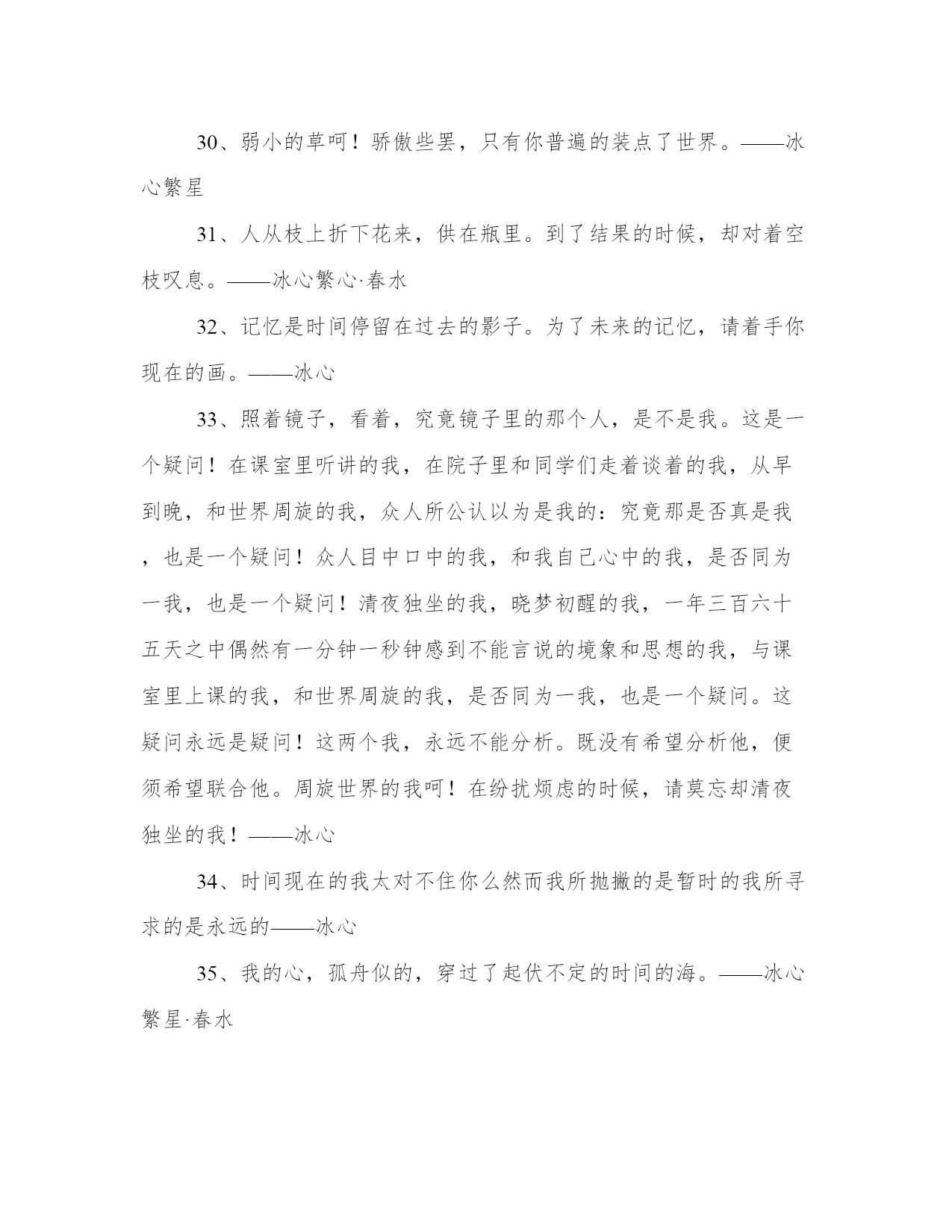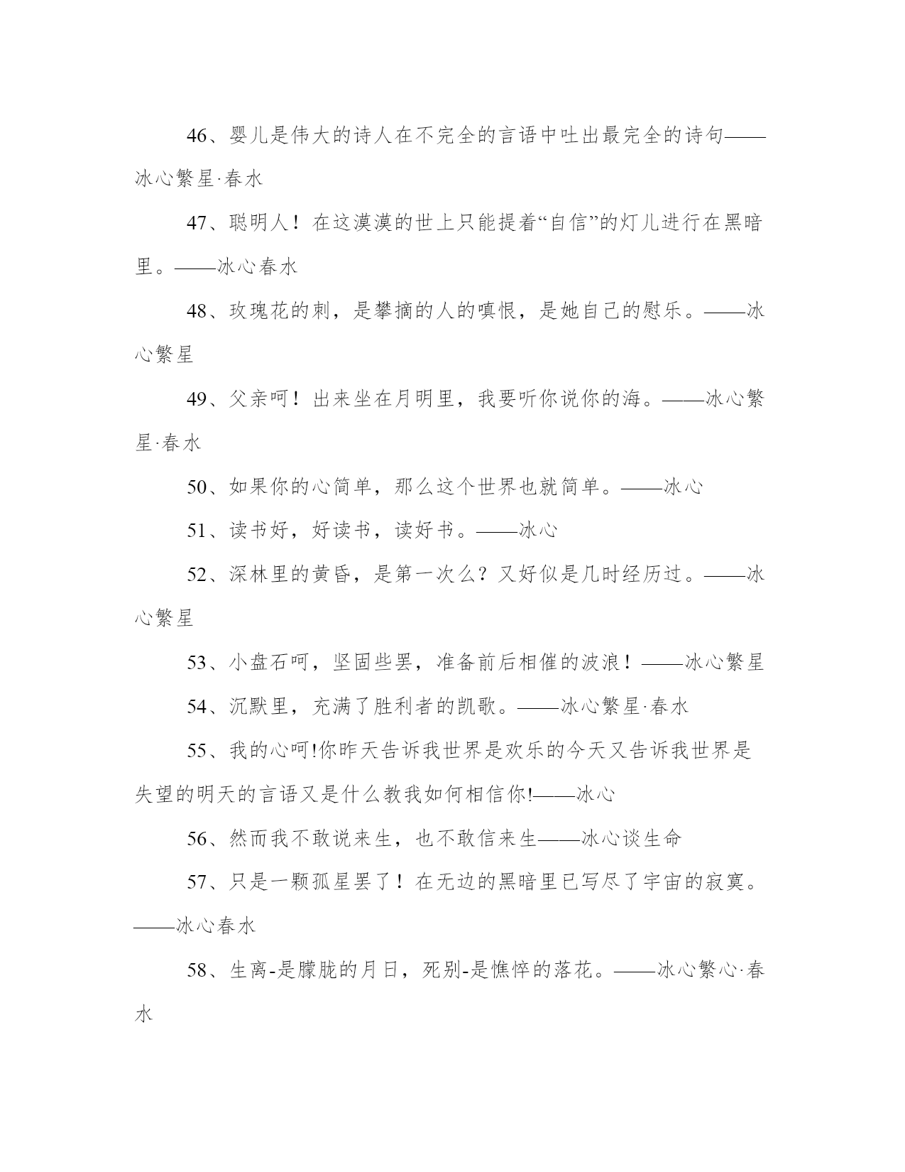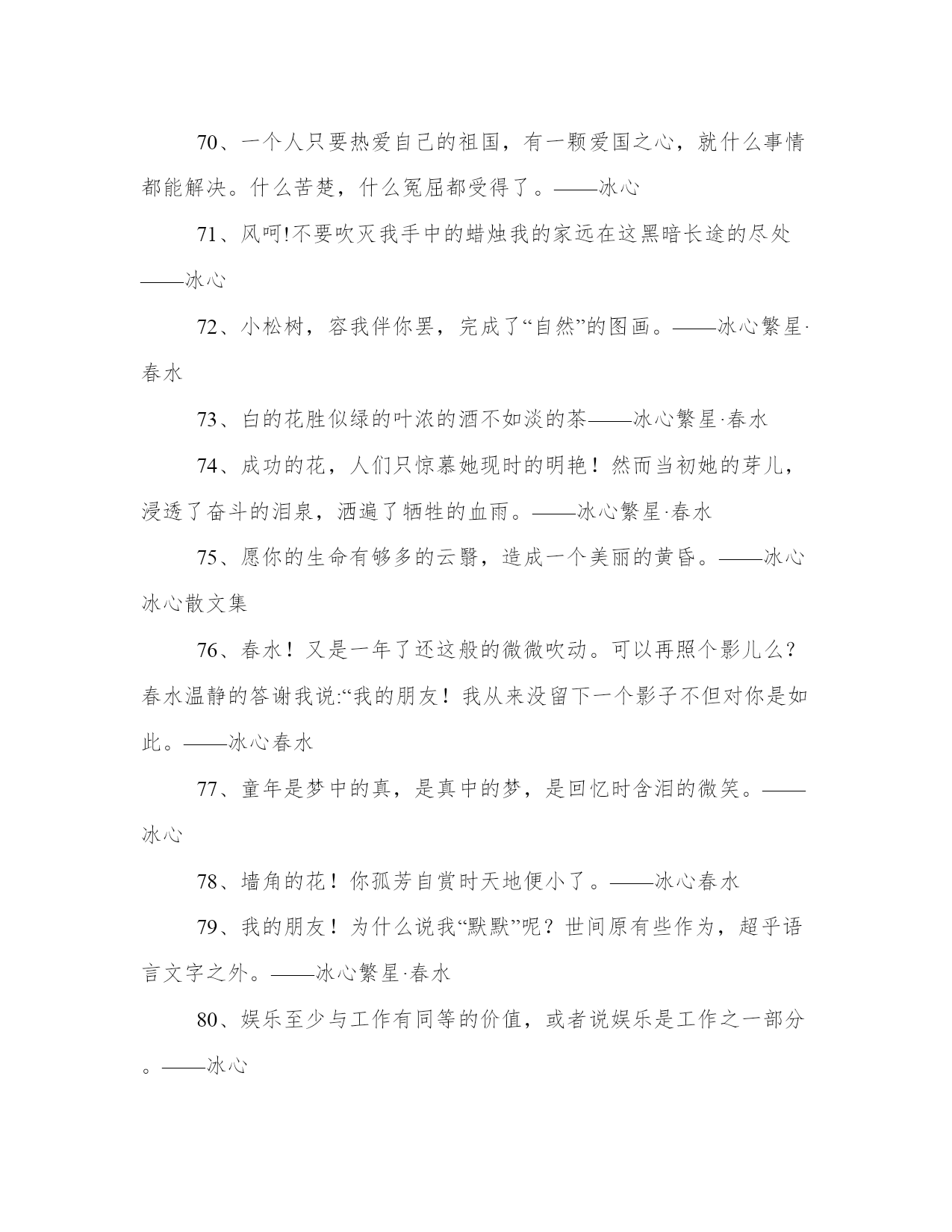 有关冰心的名言集锦关于冰心的名言1、我自己是凡人,我只求凡人的幸福——冰心2、星星——只能白了青年人的发,不能灰了青年人的心。——冰心繁星·春水3、母亲呵!这零碎的篇儿,你能看一看么?这些字,在没有我以前,已隐藏在你的心怀里。——冰心繁星·春水4、人类呵!相爱罢,我们都是长行的旅客,向着同一的归宿。——冰心繁星·春水5、西山呵!别了!我不忍离开你,但我苦忆我的母亲。——冰心繁星·春水6、轨道旁的花儿和石子!只这一秒的时间里我和你是无限之生中的偶遇也是无限之生中的永别再来时万千同类中何处更寻你——冰心7、繁星闪烁着——深蓝的天空,何曾听得见他们对话?沉默中,微光里,他们深深的互相颂赞了。——冰心繁星·春水8、夜中的雨,丝丝的织就了诗人的情绪。——冰心繁星·春水9、愿你的生命有够多的云翳,造成一个美丽的黄昏。——冰心冰心散文集10、无希望的永古不失望,不希翼那不可希翼的,永古无悲哀。——冰心往事11、走在生命的两旁,随时撒种,随时开花。让穿枝拂叶的行人,踏着荆棘,不觉得痛苦,有泪可落,却不是悲凉。——冰心赠葛洛12、群里的欢笑掩不过静里的悲哀。——冰心13、如果今生是有趣,那么今生已经足矣。如果今生是无味的,那么我不要来生。——冰心14、诗人从她的心中滴出快乐的忧愁的血。在不知不觉里已成了世界上同情的花。——冰心繁星·春水15、心灵的灯,在寂静中光明,在热闹中熄灭。——谢婉莹繁星·春水16、向日葵对那些未见过白莲的人承认他们是最好的朋友白莲出水了向日葵低下头了她亭亭的傲骨分别了自己——冰心繁星17、这无收束的尘寰,可有众生归路;世界上,来路便是归途,归途也成来路。——冰心繁星·春水18、何用写呢?诗人自己,便是诗了。——冰心19、小小的花也想抬起头来感谢春光的爱然而深厚的恩慈反使他终于沉默母亲呵!你是那春光么——冰心20、雨后的青山,好像泪洗过的良心。——谢冰心21、我的朋友!不要随从我。我的心灵之灯,只照自己的前途呵!——冰心22、光阴难道就着般的过去么?除却缥缈的思想之外,一事无成!——冰心繁星·春水23、心是冷的泪是热的心--凝固了世界泪--温柔了世界——冰心24、-我的飞扬的心灵,又落进了痛楚的躯壳。-我忽然想起老子的几句话:吾有大患,及吾有身;及吾无身,吾有何患。-这时我感觉到了躯壳给人类的痛苦。而且人类也有精神上的痛苦:大之如国忧家难,生离死别……小之如伤春悲秋……-宇宙内的万物,都是无情的:日月经天,江河行地,春往秋来,花开花落,都是遵循着大自然的规律。只在世界上有了人——万物之灵的人,才会拿自己的感情,赋予在无情的万物身上!什么“感时花溅泪,恨别鸟惊心”这种句子,古今中外,不知有千千万万。总之,只因有了有思想、有情感的人,便有了悲欢离合,便有了“战争与和平”,便有了“爱和死是永恒的主题”。——冰心病榻呓语25、我的朋友不要让春风欺哄了你花色原不如花香啊!——冰心春水26、有爱,就有了一切。——冰心27、沉默着罢!在这无穷的世界上弱小的我原只当微笑不应放言。——冰心春水28、少年的梦想是风的梦想,青春的思念是长长的思念。——冰心29、爱在左,同情在右,走在生命的两旁,随时播种,随时开花b——冰心30、弱小的草呵!骄傲些罢,只有你普遍的装点了世界。——冰心繁星31、人从枝上折下花来,供在瓶里。到了结果的时候,却对着空枝叹息。——冰心繁心·春水32、记忆是时间停留在过去的影子。为了未来的记忆,请着手你现在的画。——冰心33、照着镜子,看着,究竟镜子里的那个人,是不是我。这是一个疑问!在课室里听讲的我,在院子里和同学们走着谈着的我,从早到晚,和世界周旋的我,众人所公认以为是我的:究竟那是否真是我,也是一个疑问!众人目中口中的我,和我自己心中的我,是否同为一我,也是一个疑问!清夜独坐的我,晓梦初醒的我,一年三百六十五天之中偶然有一分钟一秒钟感到不能言说的境象和思想的我,与课室里上课的我,和世界周旋的我,是否同为一我,也是一个疑问。这疑问永远是疑问!这两个我,永远不能分析。既没有希望分析他,便须希望联合他。周旋世界的我呵!在纷扰烦虑的时候,请莫忘却清夜独坐的我!——冰心34、时间现在的我太对不住你么然而我所抛撇的是暂时的我所寻求的是永远的——冰心35、我的心,孤舟似的,穿过了起伏不定的时间的海。——冰心繁星·春水36、青年人!信你自己罢!只有你自己是真实的,也只有你自己能创造你自己。——冰心繁星37、冷静的心,在任何环境里,都能建立了更深微的世界。——冰心38、嫩绿的芽儿,和青年说:“发展你自己!”淡白的花儿,和青年说:“贡献你自己!”深红的果儿,和青年说:“牺牲你自己!”——冰心繁星39、言论的花儿,开的愈大。行为的果实,结的愈小。——冰心繁星