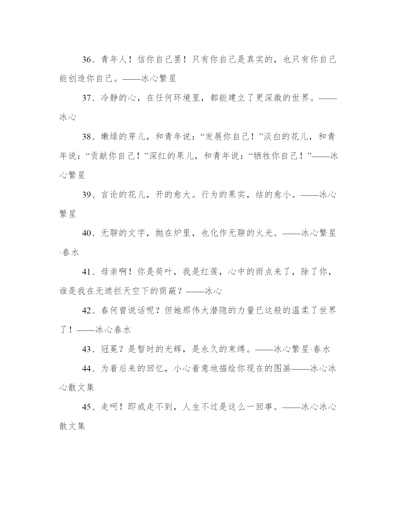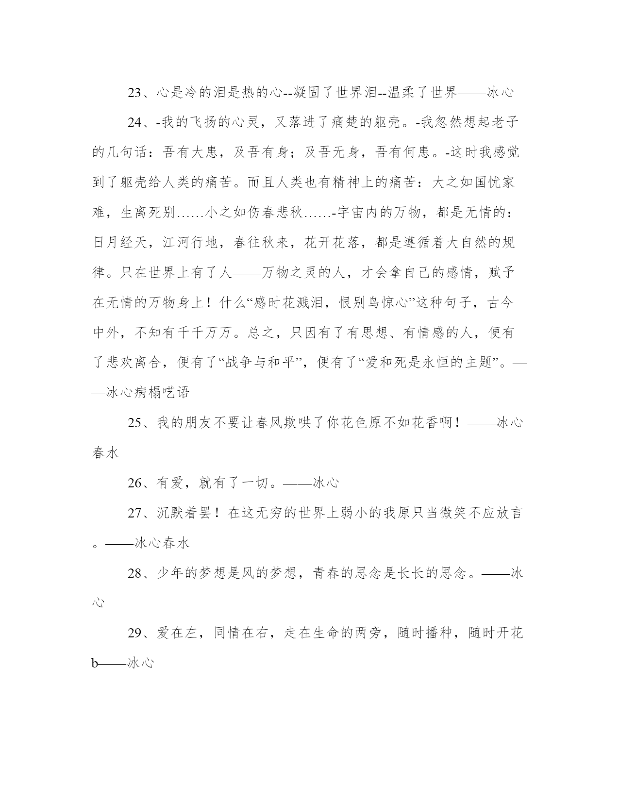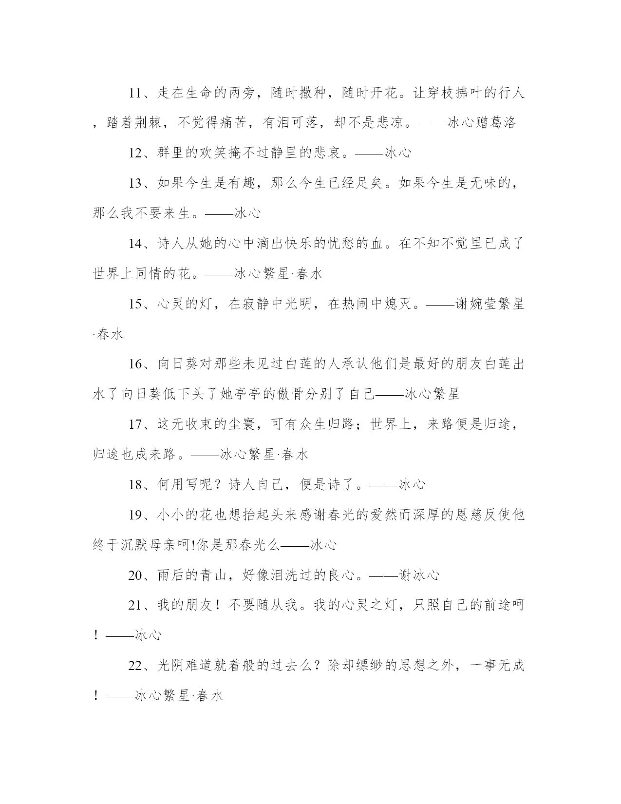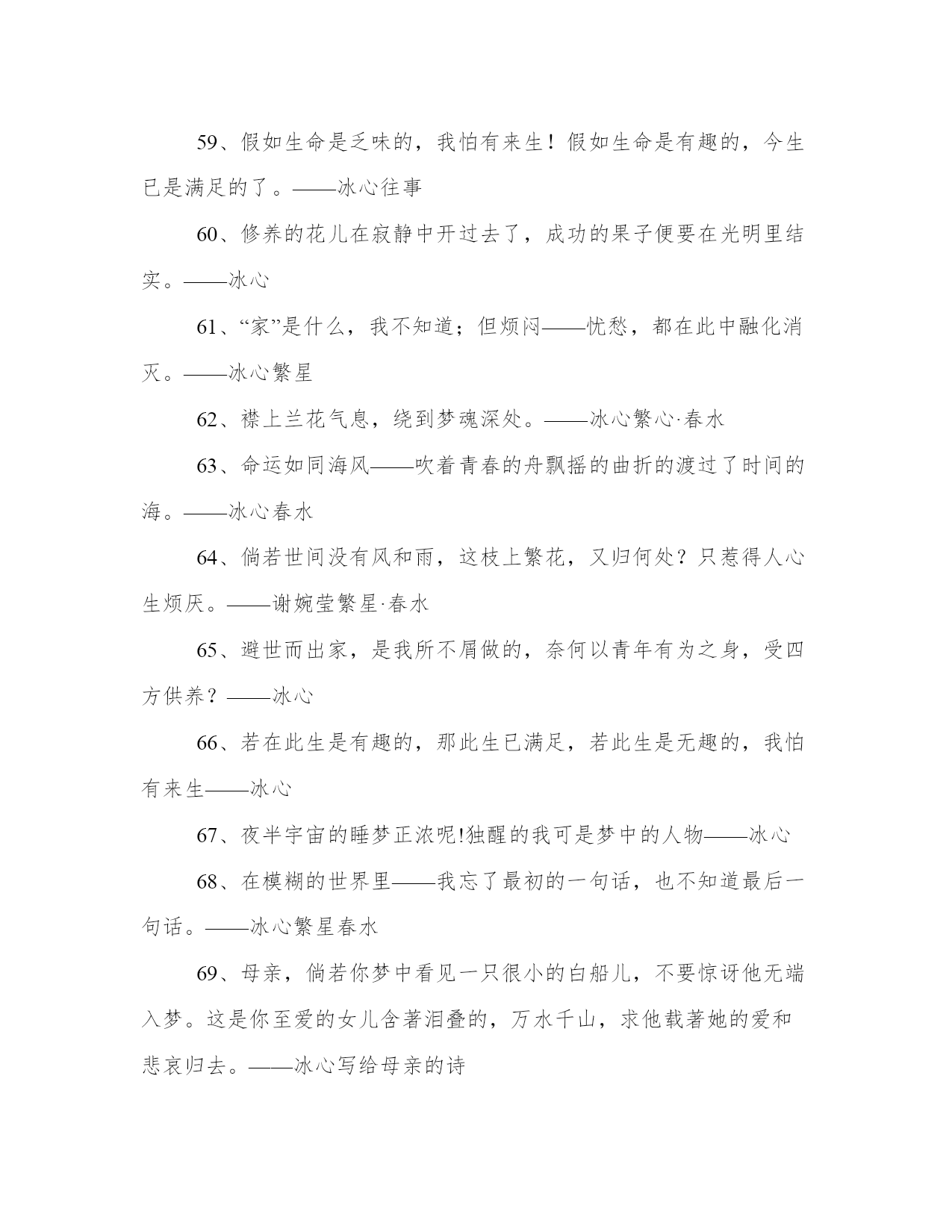 有关冰心的名言集锦关于冰心的名言1、我自己是凡人,我只求凡人的幸福——冰心2、星星——只能白了青年人的发,不能灰了青年人的心。——冰心繁星·春水3、母亲呵!这零碎的篇儿,你能看一看么?这些字,在没有我以前,已隐藏在你的心怀里。——冰心繁星·春水4、人类呵!相爱罢,我们都是长行的旅客,向着同一的归宿。——冰心繁星·春水5、西山呵!别了!我不忍离开你,但我苦忆我的母亲。——冰心繁星·春水6、轨道旁的花儿和石子!只这一秒的时间里我和你是无限之生中的偶遇也是无限之生中的永别再来时万千同类中何处更寻你——冰心7、繁星闪烁着——深蓝的天空,何曾听得见他们对话?沉默中,微光里,他们深深的互相颂赞了。——冰心繁星·春水8、夜中的雨,丝丝的织就了诗人的情绪。——冰心繁星·春水9、愿你的生命有够多的云翳,造成一个美丽的黄昏。——冰心冰心散文集10、无希望的永古不失望,不希翼那不可希翼的,永古无悲哀。——冰心往事11、走在生命的两旁,随时撒种,随时开花。让穿枝拂叶的行人,踏着荆棘,不觉得痛苦,有泪可落,却不是悲凉。——冰心赠葛洛12、群里的欢笑掩不过静里的悲哀。——冰心13、如果今生是有趣,那么今生已经足矣。如果今生是无味的,那么我不要来生。——冰心14、诗人从她的心中滴出快乐的忧愁的血。在不知不觉里已成了世界上同情的花。——冰心繁星·春水15、心灵的灯,在寂静中光明,在热闹中熄灭。——谢婉莹繁星·春水16、向日葵对那些未见过白莲的人承认他们是最好的朋友白莲出水了向日葵低下头了她亭亭的傲骨分别了自己——冰心繁星17、这无收束的尘寰,可有众生归路;世界上,来路便是归途,归途也成来路。——冰心繁星·春水18、何用写呢?诗人自己,便是诗了。——冰心19、小小的花也想抬起头来感谢春光的爱然而深厚的恩慈反使他终于沉默母亲呵!你是那春光么——冰心20、雨后的青山,好像泪洗过的良心。——谢冰心21、我的朋友!不要随从我。我的心灵之灯,只照自己的前途呵!——冰心22、光阴难道就着般的过去么?除却缥缈的思想之外,一事无成!——冰心繁星·春水23、心是冷的泪是热的心--凝固了世界泪--温柔了世界——冰心24、-我的飞扬的心灵,又落进了痛楚的躯壳。-我忽然想起老子的几句话:吾有大患,及吾有身;及吾无身,吾有何患。-这时我感觉到了躯壳给人类的痛苦。而且人类也有精神上的痛苦:大之如国忧家难,生离死别……小之如伤春悲秋……-宇宙内的万物,都是无情的:日月经天,江河行地,春往秋来,花开花落,都是遵循着大自然的规律。只在世界上有了人——万物之灵的人,才会拿自己的感情,赋予在无情的万物身上!什么“感时花溅泪,恨别鸟惊心”这种句子,古今中外,不知有千千万万。总之,只因有了有思想、有情感的人,便有了悲欢离合,便有了“战争与和平”,便有了“爱和死是永恒的主题”。——冰心病榻呓语25、我的朋友不要让春风欺哄了你花色原不如花香啊!——冰心春水26、有爱,就有了一切。——冰心27、沉默着罢!在这无穷的世界上弱小的我原只当微笑不应放言。——冰心春水28、少年的梦想是风的梦想,青春的思念是长长的思念。——冰心29、爱在左,同情在右,走在生命的两旁,随时播种,随时开花b——冰心30、弱小的草呵!骄傲些罢,只有你普遍的装点了世界。——冰心繁星31、人从枝上折下花来,供在瓶里。到了结果的时候,却对着空枝叹息。——冰心繁心·春水32、记忆是时间停留在过去的影子。为了未来的记忆,请着手你现在的画。——冰心33、照着镜子,看着,究竟镜子里的那个人,是不是我。这是一个疑问!在课室里听讲的我,在院子里和同学们走着谈着的我,从早到晚,和世界周旋的我,众人所公认以为是我的:究竟那是否真是我,也是一个疑问!众人目中口中的我,和我自己心中的我,是否同为一我,也是一个疑问!清夜独坐的我,晓梦初醒的我,一年三百六十五天之中偶然有一分钟一秒钟感到不能言说的境象和思想的我,与课室里上课的我,和世界周旋的我,是否同为一我,也是一个疑问。这疑问永远是疑问!这两个我,永远不能分析。既没有希望分析他,便须希望联合他。周旋世界的我呵!在纷扰烦虑的时候,请莫忘却清夜独坐的我!——冰心34、时间现在的我太对不住你么然而我所抛撇的是暂时的我所寻求的是永远的——冰心35、我的心,孤舟似的,穿过了起伏不定的时间的海。——冰心繁星·春水36、青年人!信你自己罢!只有你自己是真实的,也只有你自己能创造你自己。——冰心繁星37、冷静的心,在任何环境里,都能建立了更深微的世界。——冰心38、嫩绿的芽儿,和青年说:“发展你自己!”淡白的花儿,和青年说:“贡献你自己!”深红的果儿,和青年说:“牺牲你自己!”——冰心繁星39、言论的花儿,开的愈大。行为的果实,结的愈小。——冰心繁星