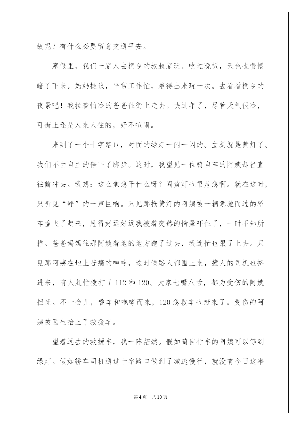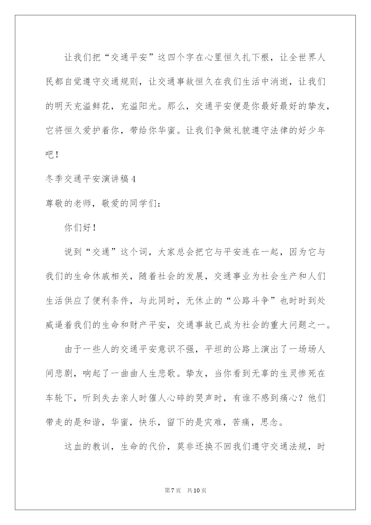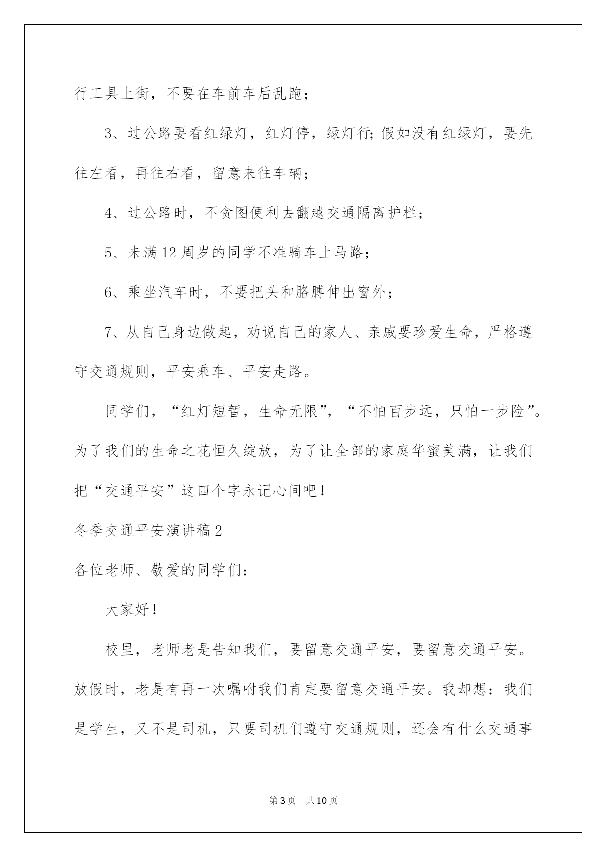 第PAGE\*Arabic\*MERGEFORMAT10页共NUMPAGES\*Arabic\*MERGEFORMAT10页第PAGE\*MERGEFORMAT10页共NUMPAGES\*MERGEFORMAT10页第PAGE\*MERGEFORMAT10页共NUMPAGES\*MERGEFORMAT10页第PAGE\*MERGEFORMAT10页共NUMPAGES\*MERGEFORMAT10页第PAGE\*MERGEFORMAT10页共NUMPAGES\*MERGEFORMAT10页第PAGE\*MERGEFORMAT10页共NUMPAGES\*MERGEFORMAT10页第PAGE\*MERGEFORMAT10页共NUMPAGES\*MERGEFORMAT10页第PAGE\*MERGEFORMAT10页共NUMPAGES\*MERGEFORMAT10页第PAGE\*MERGEFORMAT10页共NUMPAGES\*MERGEFORMAT10页第PAGE\*MERGEFORMAT10页共NUMPAGES\*MERGEFORMAT10页第PAGE\*MERGEFORMAT10页共NUMPAGES\*MERGEFORMAT10页2022冬季交通安全演讲稿冬季交通平安演讲稿演讲稿可以帮助发言者更好的表达。在不断进步的社会中,演讲稿应用范围愈来愈广泛,写起演讲稿来就毫无头绪?以下是我整理的冬季交通平安演讲稿,希望能够帮助到大家。冬季交通平安演讲稿1老师们、同学们:早上好!今日我在国旗下讲话的主题是《交通平安伴我行》。目前,交通事故正在夺去许多人的生命,为唤起人们关注这一事实,我国把每年的4月30日定为全国交通平安反思日。把这一天设为交通平安反思日,意在提示更多的人来关注交通平安,反思以往的行路或驾车的陋俗,仔细谛视并改正不文明的交通习惯,把珍贵的生命从无情的车祸中解救出来,敬重人的生存价值和生存权利!随着济的快速增长,汽车数量也相应地剧增,在石家庄,我们更能感受到这种车辆的增长速度,于是交通事故频发也成为社会的主要公害。中国每年因交通事故死亡人数大约是10万人,也就是说,每天有两百多人死于车祸。其中,未成年人占了很大的比例,这些血淋淋的数字,无不告知我们交通事故猛于虎。现在让我们想一想,当你走在公路上的时候,是否有下列的陋俗呢?随意穿越公路,不走人行道,对车鸣声充耳不闻、照旧在公路上高谈阔论或者追逐打闹,闯红灯,未满12周岁而骑自行车上公路。同学们,当我们违反交通规则的时候,是否考虑到有可能产生严峻的不行挽回的后果呢?生命是珍贵的,对每个人来说,生命只有一次,而你们正处于成长阶段,天真活泼,新奇心强,敢动敢玩,但自控实力和应变实力较差,遇到紧急状况难于应付,因而发生交通事故的可能性较大,往往要高于成人好几倍。在公路上行走时,要有平安意识,时时防范意外,这就要求我们不但要重视交通平安,更要自觉遵守交通规则。在此,我向同学们发出以下倡议:1、主动学习交通平安学问,时刻留意交通平安,自觉遵守交通规则;2、走人行道,不在马路上游戏、打闹,不运用滑板、旱冰鞋等滑行工具上街,不要在车前车后乱跑;3、过公路要看红绿灯,红灯停,绿灯行;假如没有红绿灯,要先往左看,再往右看,留意来往车辆;4、过公路时,不贪图便利去翻越交通隔离护栏;5、未满12周岁的同学不准骑车上马路;6、乘坐汽车时,不要把头和胳膊伸出窗外;7、从自己身边做起,劝说自己的家人、亲戚要珍爱生命,严格遵守交通规则,平安乘车、平安走路。同学们,“红灯短暂,生命无限”,“不怕百步远,只怕一步险”。为了我们的生命之花恒久绽放,为了让全部的家庭华蜜美满,让我们把“交通平安”这四个字永记心间吧!冬季交通平安演讲稿2各位老师、敬爱的同学们:大家好!校里,老师老是告知我们,要留意交通平安,要留意交通平安。放假时,老是有再一次嘱咐我们肯定要留意交通平安。我却想:我们是学生,又不是司机,只要司机们遵守交通规则,还会有什么交通事故呢?有什么必要留意交通平安。寒假里,我们一家人去桐乡的叔叔家玩。吃过晚饭,天色也慢慢暗了下来。妈妈提议,平常工作忙,难得出来玩一次。去看看桐乡的夜景吧!我拉着怕冷的爸爸往街上走去。快过年了,尽管天气很冷,可街上还是人来人往的,好不喧闹。来到了一个十字路口,对面的绿灯一闪一闪的。立刻就是黄灯了。我们不由自主的停下了脚步。这时,我望见一位骑自车的阿姨却径直往前冲去。我想:这么焦急干什么呀?闯黄灯也很危急啊。就在这时,只听见“砰”的一声巨响。只见那抢黄灯的阿姨被一辆急驰而过的轿车撞飞了起来,甩得好远好远我被着突然的情景吓住了,一时
