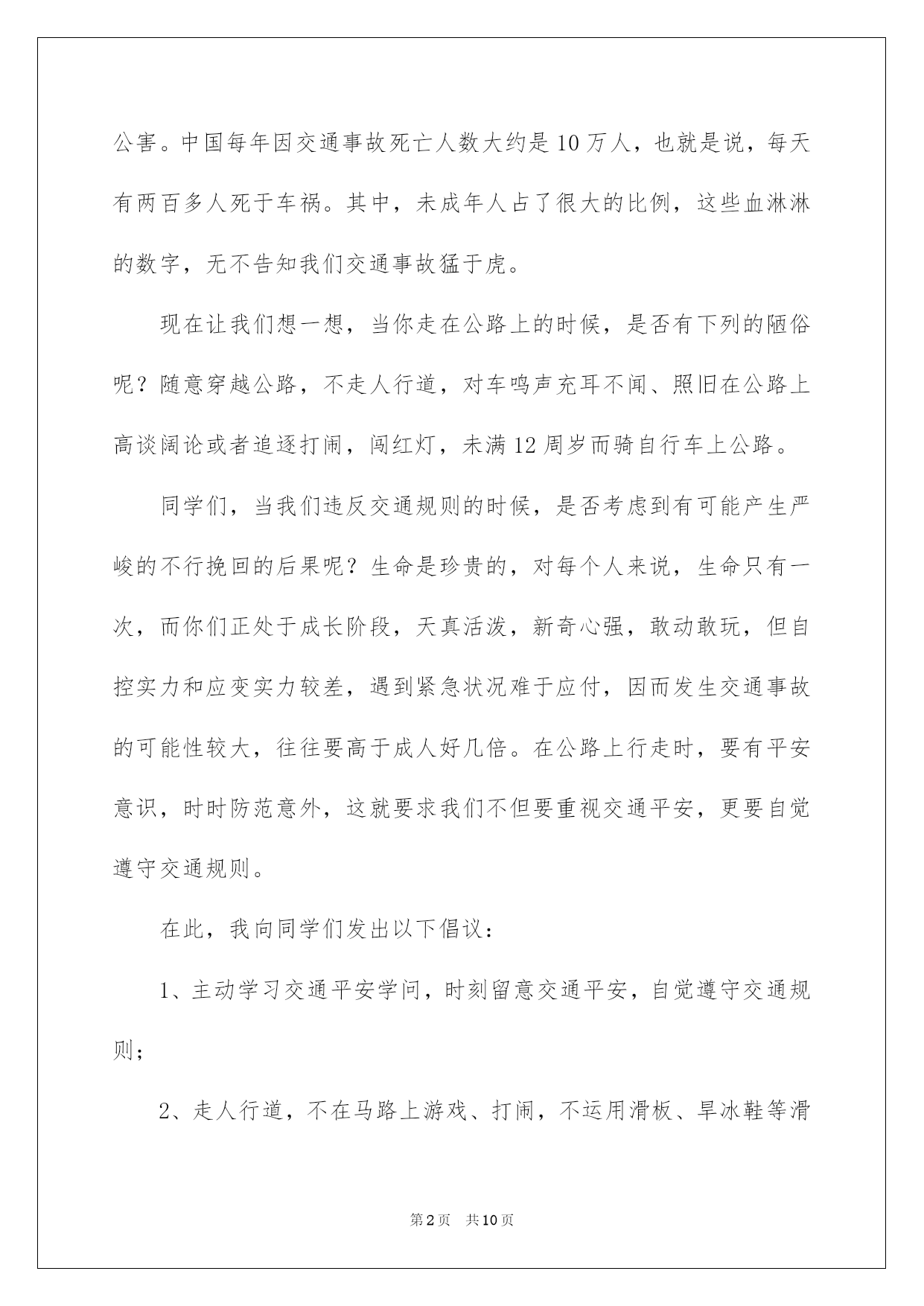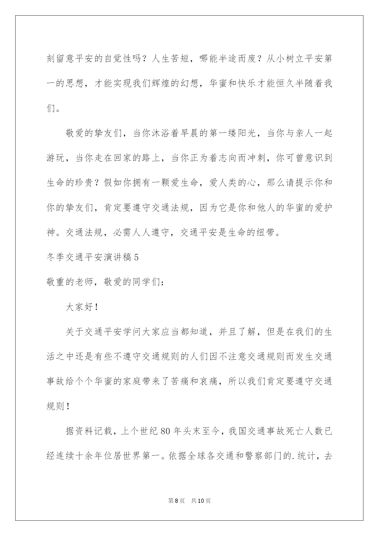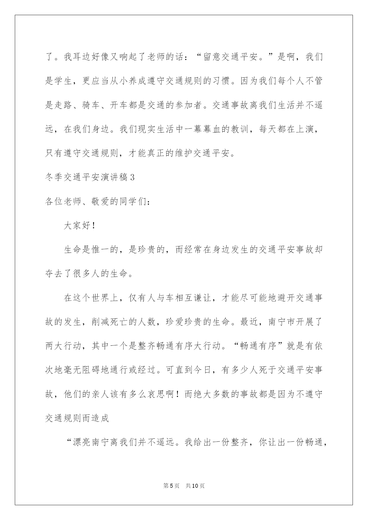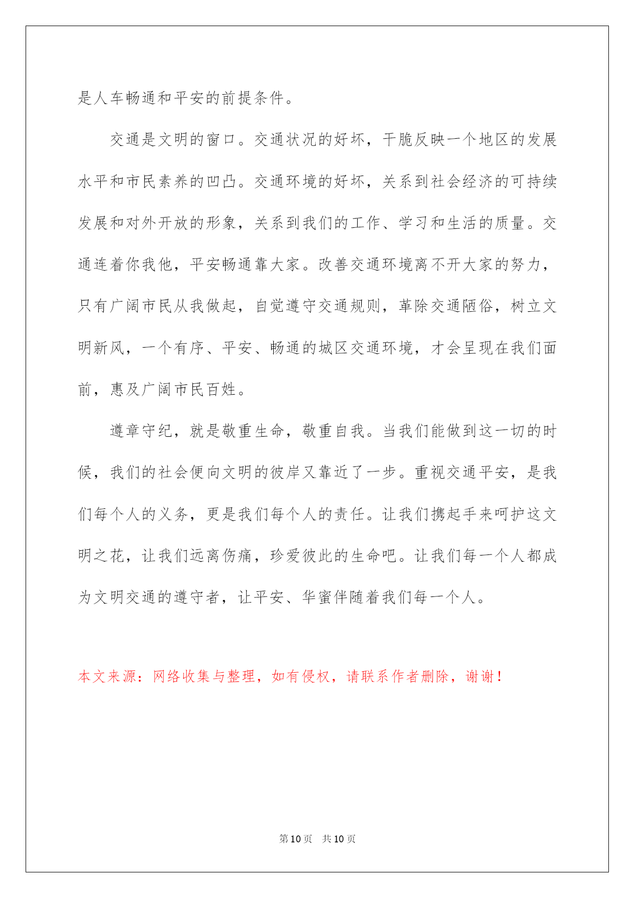 第PAGE\*Arabic\*MERGEFORMAT10页共NUMPAGES\*Arabic\*MERGEFORMAT10页第PAGE\*MERGEFORMAT10页共NUMPAGES\*MERGEFORMAT10页第PAGE\*MERGEFORMAT10页共NUMPAGES\*MERGEFORMAT10页第PAGE\*MERGEFORMAT10页共NUMPAGES\*MERGEFORMAT10页第PAGE\*MERGEFORMAT10页共NUMPAGES\*MERGEFORMAT10页第PAGE\*MERGEFORMAT10页共NUMPAGES\*MERGEFORMAT10页第PAGE\*MERGEFORMAT10页共NUMPAGES\*MERGEFORMAT10页第PAGE\*MERGEFORMAT10页共NUMPAGES\*MERGEFORMAT10页第PAGE\*MERGEFORMAT10页共NUMPAGES\*MERGEFORMAT10页第PAGE\*MERGEFORMAT10页共NUMPAGES\*MERGEFORMAT10页第PAGE\*MERGEFORMAT10页共NUMPAGES\*MERGEFORMAT10页2022冬季交通安全演讲稿冬季交通平安演讲稿演讲稿可以帮助发言者更好的表达。在不断进步的社会中,演讲稿应用范围愈来愈广泛,写起演讲稿来就毫无头绪?以下是我整理的冬季交通平安演讲稿,希望能够帮助到大家。冬季交通平安演讲稿1老师们、同学们:早上好!今日我在国旗下讲话的主题是《交通平安伴我行》。目前,交通事故正在夺去许多人的生命,为唤起人们关注这一事实,我国把每年的4月30日定为全国交通平安反思日。把这一天设为交通平安反思日,意在提示更多的人来关注交通平安,反思以往的行路或驾车的陋俗,仔细谛视并改正不文明的交通习惯,把珍贵的生命从无情的车祸中解救出来,敬重人的生存价值和生存权利!随着济的快速增长,汽车数量也相应地剧增,在石家庄,我们更能感受到这种车辆的增长速度,于是交通事故频发也成为社会的主要公害。中国每年因交通事故死亡人数大约是10万人,也就是说,每天有两百多人死于车祸。其中,未成年人占了很大的比例,这些血淋淋的数字,无不告知我们交通事故猛于虎。现在让我们想一想,当你走在公路上的时候,是否有下列的陋俗呢?随意穿越公路,不走人行道,对车鸣声充耳不闻、照旧在公路上高谈阔论或者追逐打闹,闯红灯,未满12周岁而骑自行车上公路。同学们,当我们违反交通规则的时候,是否考虑到有可能产生严峻的不行挽回的后果呢?生命是珍贵的,对每个人来说,生命只有一次,而你们正处于成长阶段,天真活泼,新奇心强,敢动敢玩,但自控实力和应变实力较差,遇到紧急状况难于应付,因而发生交通事故的可能性较大,往往要高于成人好几倍。在公路上行走时,要有平安意识,时时防范意外,这就要求我们不但要重视交通平安,更要自觉遵守交通规则。在此,我向同学们发出以下倡议:1、主动学习交通平安学问,时刻留意交通平安,自觉遵守交通规则;2、走人行道,不在马路上游戏、打闹,不运用滑板、旱冰鞋等滑行工具上街,不要在车前车后乱跑;3、过公路要看红绿灯,红灯停,绿灯行;假如没有红绿灯,要先往左看,再往右看,留意来往车辆;4、过公路时,不贪图便利去翻越交通隔离护栏;5、未满12周岁的同学不准骑车上马路;6、乘坐汽车时,不要把头和胳膊伸出窗外;7、从自己身边做起,劝说自己的家人、亲戚要珍爱生命,严格遵守交通规则,平安乘车、平安走路。同学们,“红灯短暂,生命无限”,“不怕百步远,只怕一步险”。为了我们的生命之花恒久绽放,为了让全部的家庭华蜜美满,让我们把“交通平安”这四个字永记心间吧!冬季交通平安演讲稿2各位老师、敬爱的同学们:大家好!校里,老师老是告知我们,要留意交通平安,要留意交通平安。放假时,老是有再一次嘱咐我们肯定要留意交通平安。我却想:我们是学生,又不是司机,只要司机们遵守交通规则,还会有什么交通事故呢?有什么必要留意交通平安。寒假里,我们一家人去桐乡的叔叔家玩。吃过晚饭,天色也慢慢暗了下来。妈妈提议,平常工作忙,难得出来玩一次。去看看桐乡的夜景吧!我拉着怕冷的爸爸往街上走去。快过年了,尽管天气很冷,可街上还是人来人往的,好不喧闹。来到了一个十字路口,对面的绿灯一闪一闪的。立刻就是黄灯了。我们不由自主的停下了脚步。这时,我望见一位骑自车的阿姨却径直往前冲去。我想:这么焦急干什么呀?闯黄灯也很危急啊。就在这时,只听见“砰”的一声巨响。只见那抢黄灯的阿姨被一辆急驰而过的轿车撞飞了起来,甩得好远好远我被着突然的情景吓住了,一时