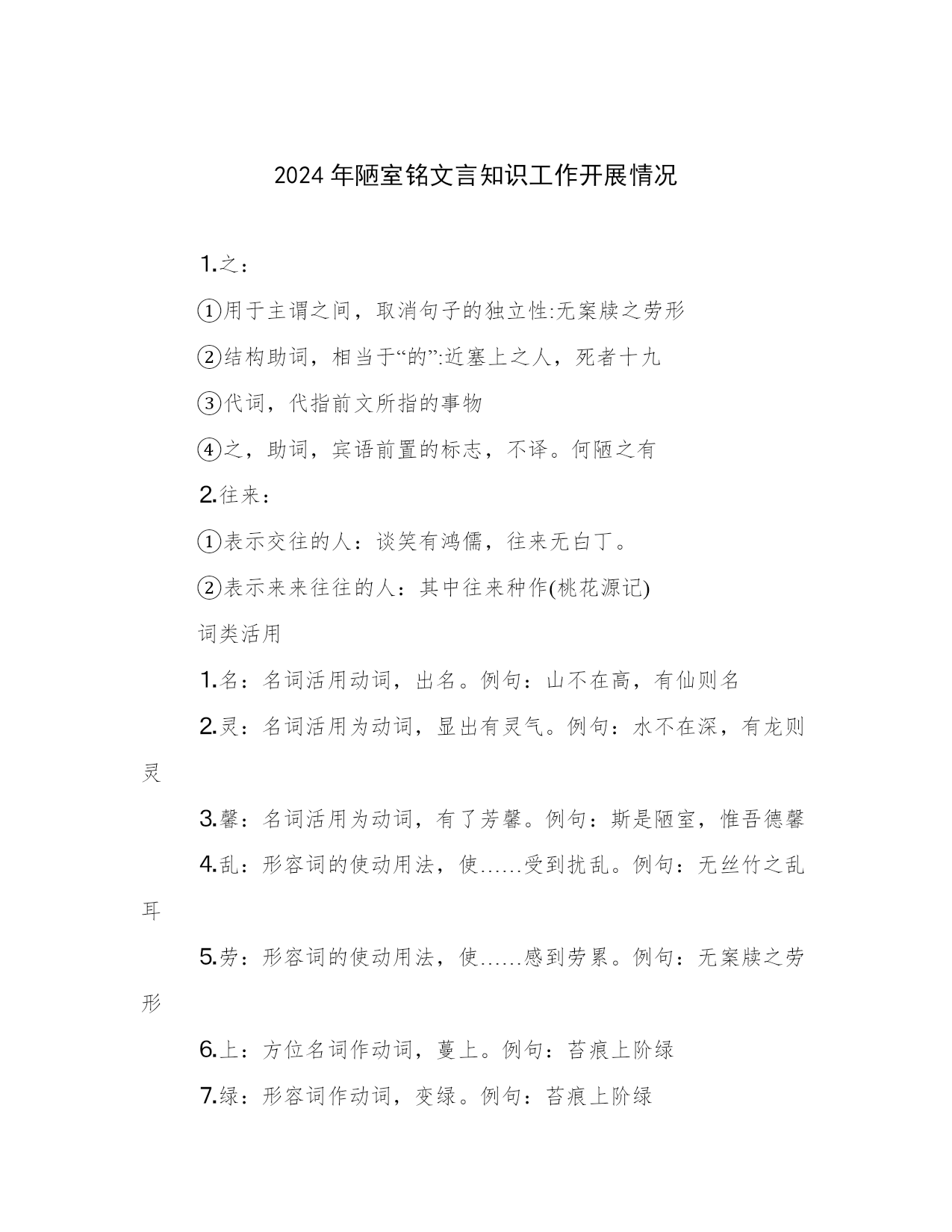 2024年陋室铭文言知识工作开展情况⒈之:①用于主谓之间,取消句子的独立性:无案牍之劳形②结构助词,相当于“的”:近塞上之人,死者十九③代词,代指前文所指的事物④之,助词,宾语前置的标志,不译。何陋之有⒉往来:①表示交往的人:谈笑有鸿儒,往来无白丁。②表示来来往往的人:其中往来种作(桃花源记)词类活用⒈名:名词活用动词,出名。例句:山不在高,有仙则名⒉灵:名词活用为动词,显出有灵气。例句:水不在深,有龙则灵⒊馨:名词活用为动词,有了芳馨。例句:斯是陋室,惟吾德馨⒋乱:形容词的使动用法,使……受到扰乱。例句:无丝竹之乱耳⒌劳:形容词的使动用法,使……感到劳累。例句:无案牍之劳形⒍上:方位名词作动词,蔓上。例句:苔痕上阶绿⒎绿:形容词作动词,变绿。例句:苔痕上阶绿古今异义⒈无案牍之劳形(形:身体;今常用义为:样子)⒉惟吾德馨(馨:品德高尚;今义为:芳香.)⒊谈笑有鸿儒(鸿:大,渊博;今义为:鸿雁,书信.)⒋无丝竹之乱耳(丝竹:琴瑟箫笛等管弦乐器,这里指奏乐乐器的声音;今义为:丝绸和竹子)5.可以调素琴(调:弹奏;今义为:调解)