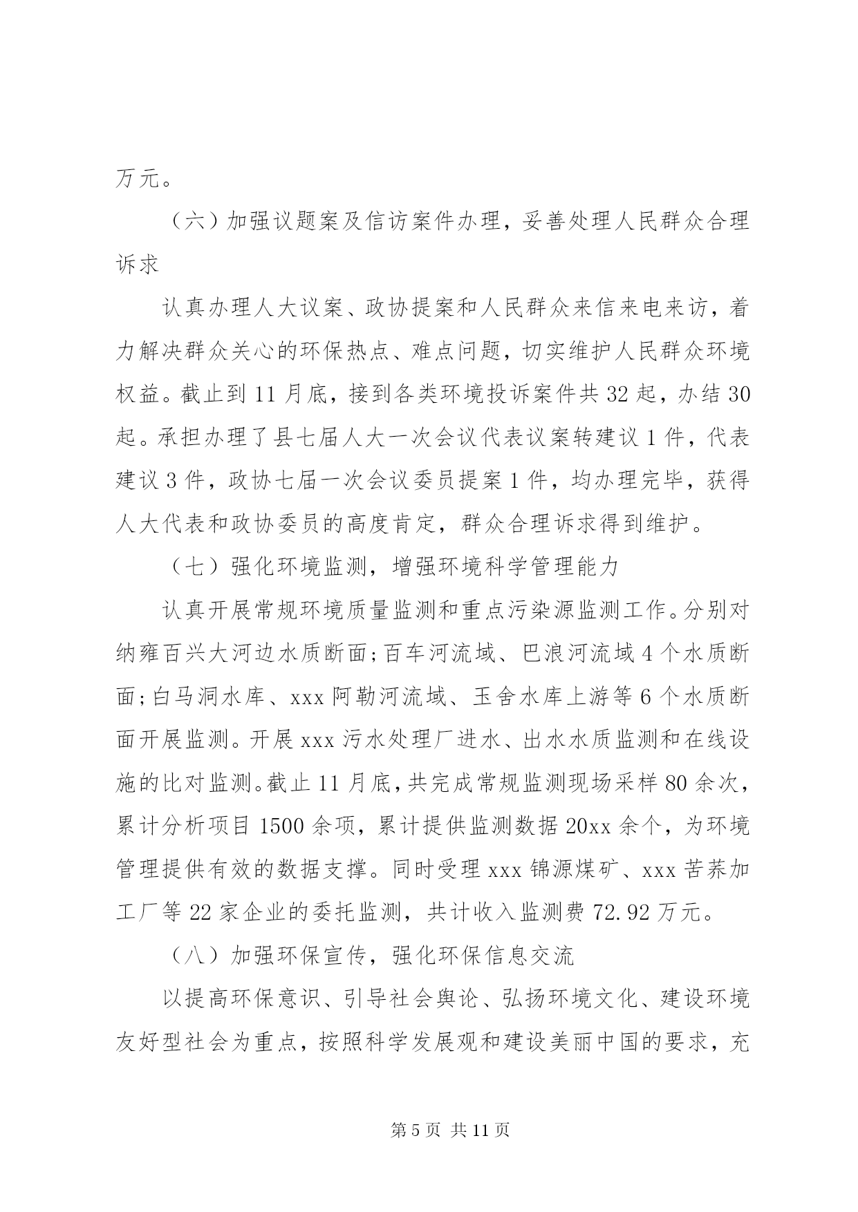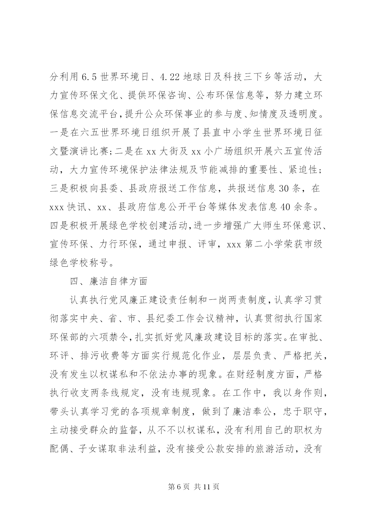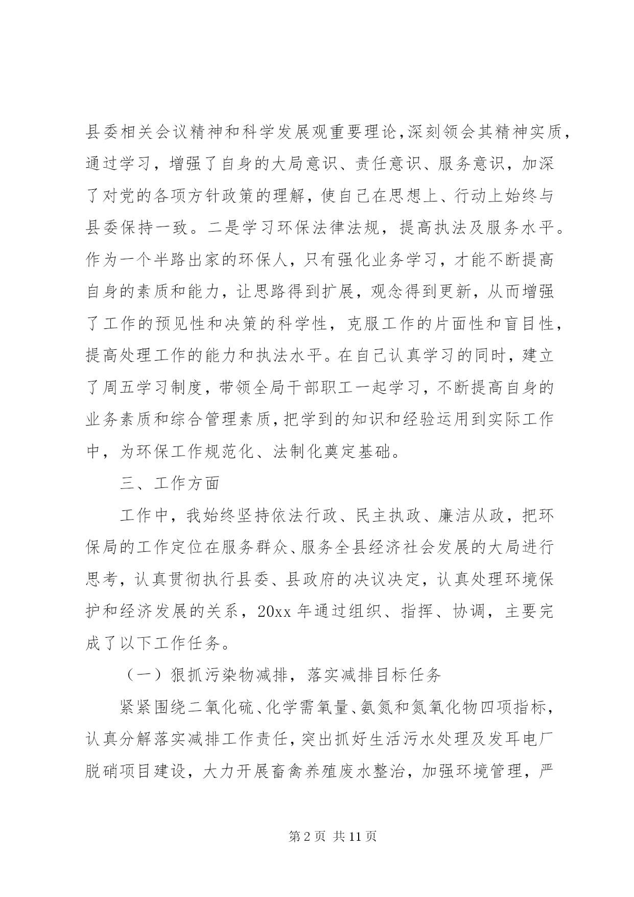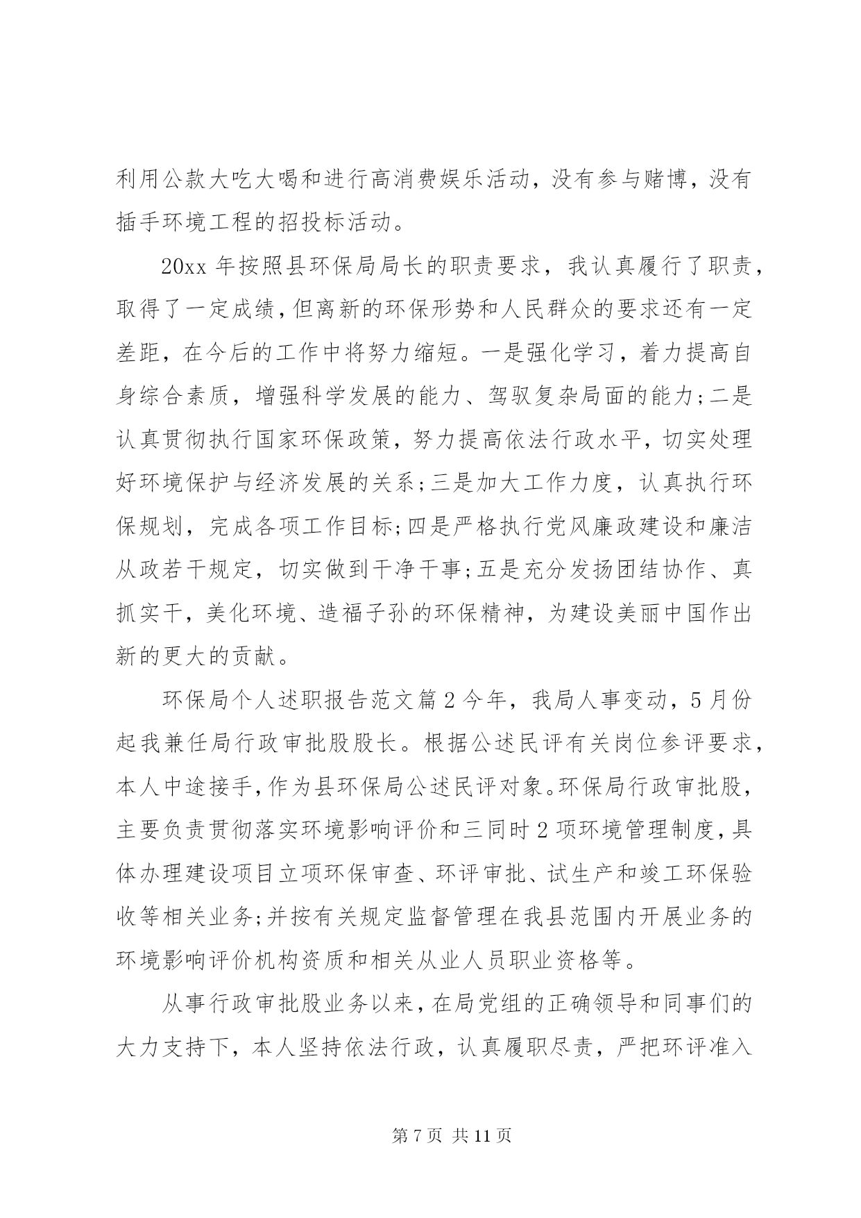 第PAGE\*Arabic\*MERGEFORMAT11页共NUMPAGES\*MERGEFORMAT11页环保局个人述职报告环保局个人述职报告范文篇1尊敬的各位领导、同志们:根据《xxx县委管理干部年度考核办法(试行)》的有关规定,现将我20xx年思想、学习、工作、廉洁自律等方面的情况汇报如下,不妥之处,请批评指正。一、思想方面根据县委、县政府有关安排,我于今年20xx年3月到县环保局担任党组副书记、局长以来,认真贯彻执行县委、县政府的决定,服从县委、县政府的领导,接受县人大、政协的监督。一年来,始终坚持以邓小平理论、xxxx重要思想和科学发展观为指导,深入贯彻及省十一次党代会精神,紧紧围绕县委、县政府的统一部署,以改善环境质量、确保环境安全、服务科学发展为统揽,以抢抓国家扩大内需项目为工作重心,进一步落实主要污染物减排责任,切实加强环境保护和生态环境建设,科学处理环境保护和经济发展的关系,团结带领全局干部职工,认真履行环境监管职能,服务我县经济社会发展,着力改善人居环境,为推动全县经济社会又好又快发展作出新的更大的贡献。二、学习方面一是认真学习邓小平理论、xxxx重要思想、科学发展观和党的路线、方针、政策,以及党的、省委十一次党代会、市委、县委相关会议精神和科学发展观重要理论,深刻领会其精神实质,通过学习,增强了自身的大局意识、责任意识、服务意识,加深了对党的各项方针政策的理解,使自己在思想上、行动上始终与县委保持一致。二是学习环保法律法规,提高执法及服务水平。作为一个半路出家的环保人,只有强化业务学习,才能不断提高自身的素质和能力,让思路得到扩展,观念得到更新,从而增强了工作的预见性和决策的科学性,克服工作的片面性和盲目性,提高处理工作的能力和执法水平。在自己认真学习的同时,建立了周五学习制度,带领全局干部职工一起学习,不断提高自身的业务素质和综合管理素质,把学到的知识和经验运用到实际工作中,为环保工作规范化、法制化奠定基础。三、工作方面工作中,我始终坚持依法行政、民主执政、廉洁从政,把环保局的工作定位在服务群众、服务全县经济社会发展的大局进行思考,认真贯彻执行县委、县政府的决议决定,认真处理环境保护和经济发展的关系,20xx年通过组织、指挥、协调,主要完成了以下工作任务。(一)狠抓污染物减排,落实减排目标任务紧紧围绕二氧化硫、化学需氧量、氨氮和氮氧化物四项指标,认真分解落实减排工作责任,突出抓好生活污水处理及发耳电厂脱硝项目建设,大力开展畜禽养殖废水整治,加强环境管理,严格项目审批,强化监督执法,预计今年可以完成二氧化硫排放量下降15.19%,化学需氧量削减2.32%,氨氮削减19.01%及发耳电厂脱硝改造的年度减排任务。(二)整治工业污染,改善区域环境质量紧紧围绕县委、县政府工业经济发展重点,在总结20xx百车河污染治理取得的工作经验基础上,今年将我县巴朗河流域纳入重点治理,针对各企业的项目性质做到一企一策,从项目下达开展环评通知开始,到污染物排放标准确认、环评文件审批、试生产批复及环境保护竣工验收的全过程中注重协调服务,加强项目事前、事中、事后的监督管理,督促各企业把环保措施落实到位,强化污染源治理,杜绝了污染事故的发生。(三)抓好源头管理,严把建设项目审批全面加强建设项目环评审批,用正确的评价结果支撑政府科学决策、指导企业发展和作为环境管理的依据。全年共办理建设项目环评172项,其中登记表xx8项,报告表25项,环评报告表审批9项,全年无越权、降级审批行为。采取排污总量控制与重点治理相结合、增量控制与存量削减相结合的办法,确保做到发展不增污,全年换发临时排污许可证34家。(四)开展村庄整治,改善农村生态环境按照新农村建设要求,以改善生态环境为重点,一是完成xx农村环境污染治理项目,共计对180户农户生活污水进行治理、建设人工湿地污水处理系统x个,投入资金xx万元,项目于今年9月通过验收并投入运行;二是开展xx农村环境污染治理项目,该项目于今年9月开工建设,共计对140户农户生活污水进行治理,投入资金xx万元,目前项目已建设完成,正在组织验收;三是加强玉舍水库水污染治理,开展玉舍水库木柯河入库口10亩缓冲湿地建设,投入资金xx万元,从源头上防治污染,保障市中心XX县区居民饮用水安全,目前该工程正在培养水生植物。四是继续争取上级支持,推动农村环境综合整治工作,经认真组织申报,获20xx年度中央农村环保专项资金xx万元,用于开展xx环境综合整治。(五)强化环境监管,严打环境违法行为以整治违法排污企业保障群众健康环保专项行动为载体,进一步加强重金属、危险固废、辐射安全管理及企业企业污染物排放监管,严厉打击非法企业,从重查处环境违法行为,严格排污费征收管理,促进企业环保设施规范运行,及时处理信访投