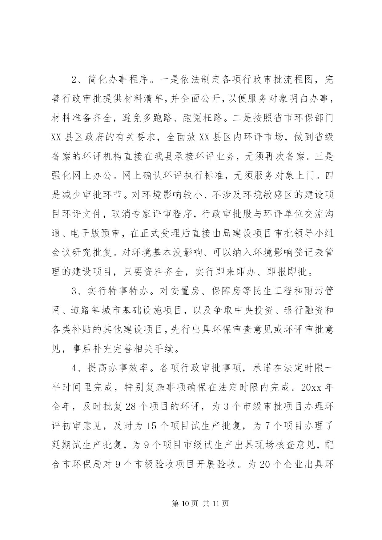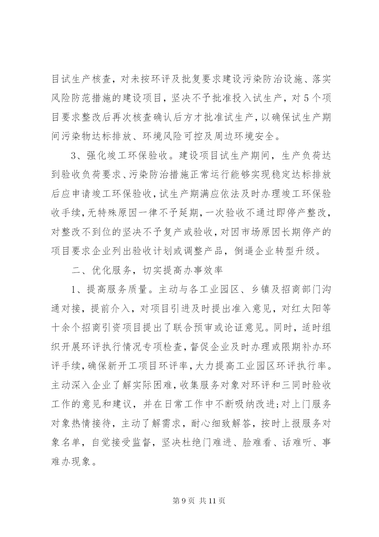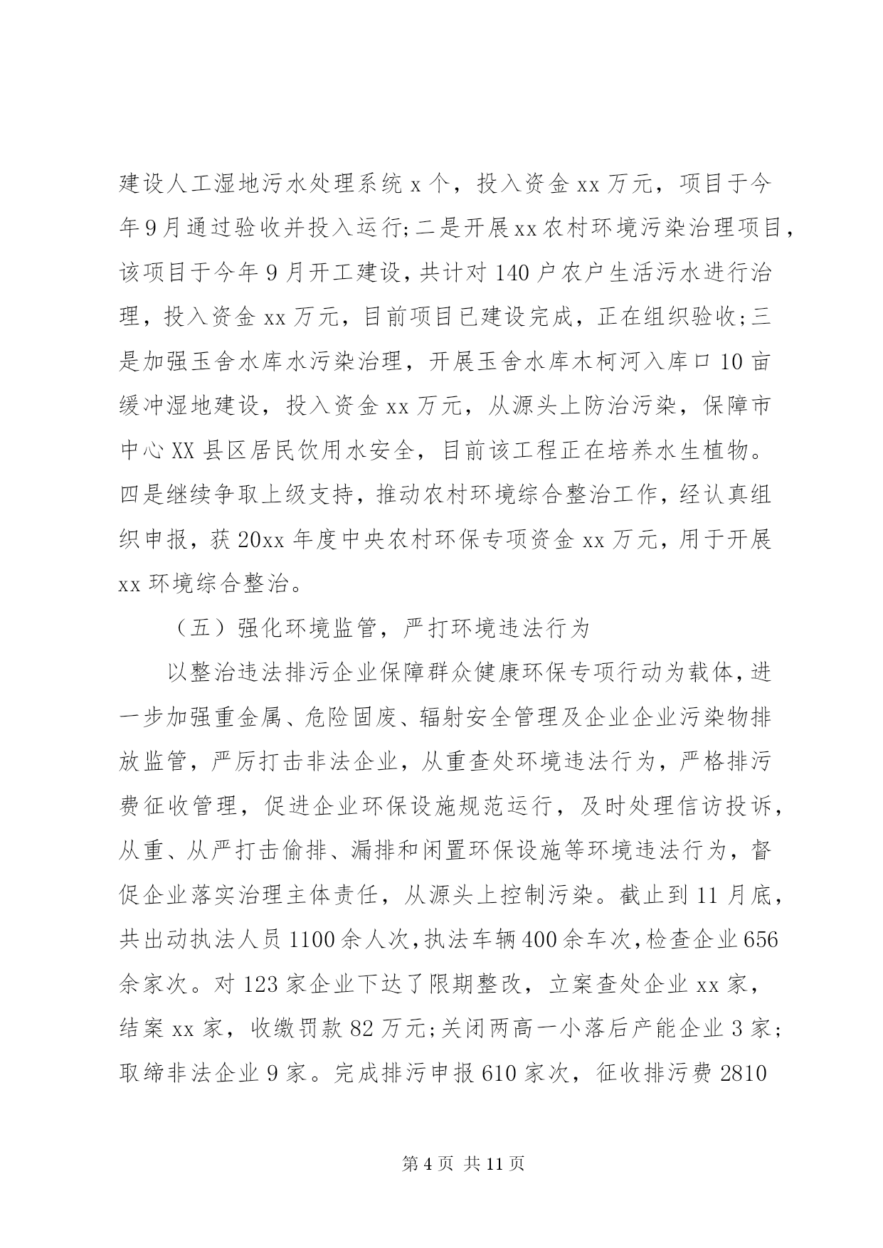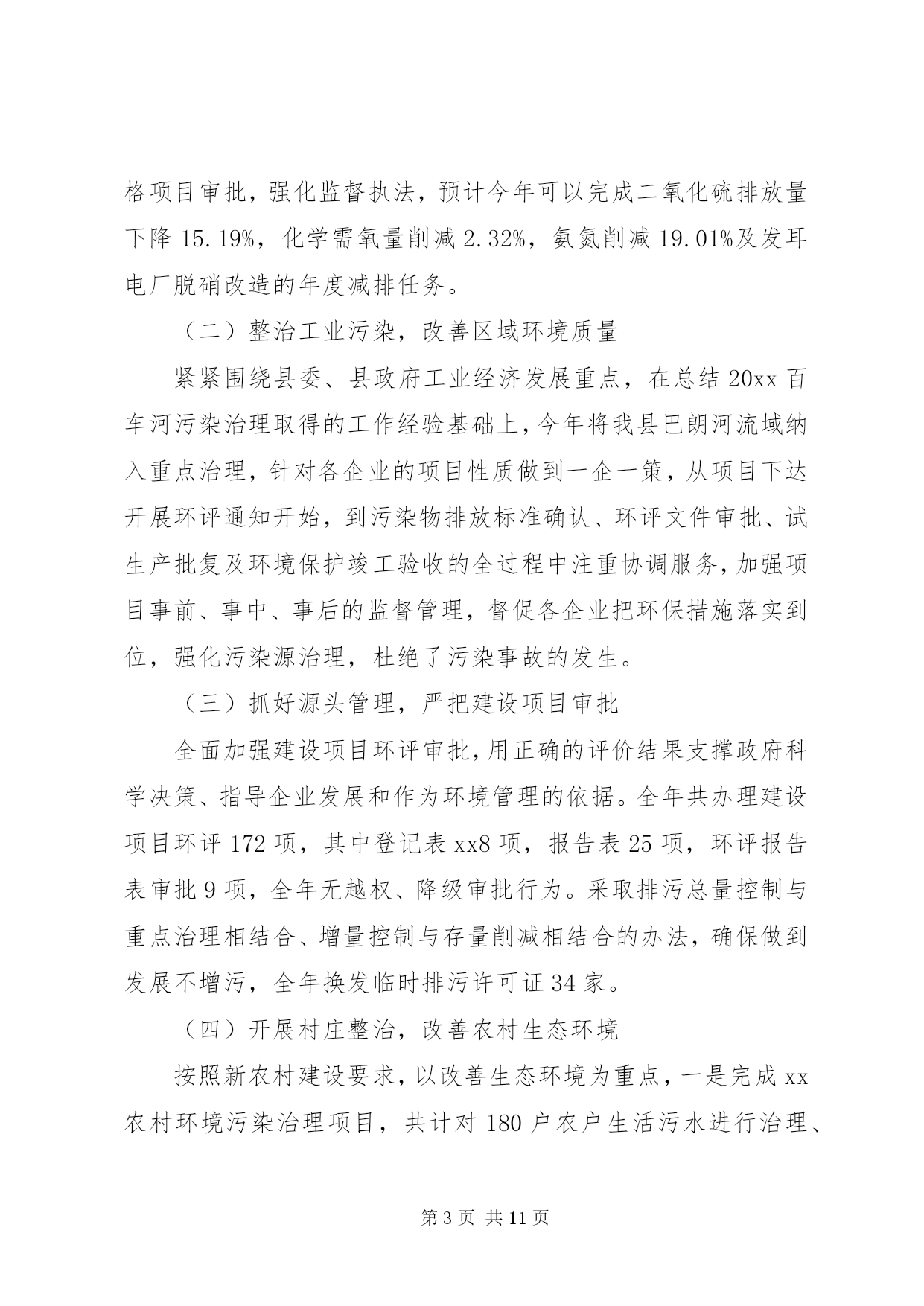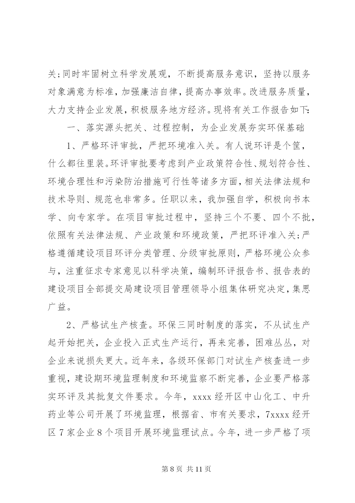 第PAGE\*Arabic\*MERGEFORMAT11页共NUMPAGES\*MERGEFORMAT11页环保局个人述职报告环保局个人述职报告范文篇1尊敬的各位领导、同志们:根据《xxx县委管理干部年度考核办法(试行)》的有关规定,现将我20xx年思想、学习、工作、廉洁自律等方面的情况汇报如下,不妥之处,请批评指正。一、思想方面根据县委、县政府有关安排,我于今年20xx年3月到县环保局担任党组副书记、局长以来,认真贯彻执行县委、县政府的决定,服从县委、县政府的领导,接受县人大、政协的监督。一年来,始终坚持以邓小平理论、xxxx重要思想和科学发展观为指导,深入贯彻及省十一次党代会精神,紧紧围绕县委、县政府的统一部署,以改善环境质量、确保环境安全、服务科学发展为统揽,以抢抓国家扩大内需项目为工作重心,进一步落实主要污染物减排责任,切实加强环境保护和生态环境建设,科学处理环境保护和经济发展的关系,团结带领全局干部职工,认真履行环境监管职能,服务我县经济社会发展,着力改善人居环境,为推动全县经济社会又好又快发展作出新的更大的贡献。二、学习方面一是认真学习邓小平理论、xxxx重要思想、科学发展观和党的路线、方针、政策,以及党的、省委十一次党代会、市委、县委相关会议精神和科学发展观重要理论,深刻领会其精神实质,通过学习,增强了自身的大局意识、责任意识、服务意识,加深了对党的各项方针政策的理解,使自己在思想上、行动上始终与县委保持一致。二是学习环保法律法规,提高执法及服务水平。作为一个半路出家的环保人,只有强化业务学习,才能不断提高自身的素质和能力,让思路得到扩展,观念得到更新,从而增强了工作的预见性和决策的科学性,克服工作的片面性和盲目性,提高处理工作的能力和执法水平。在自己认真学习的同时,建立了周五学习制度,带领全局干部职工一起学习,不断提高自身的业务素质和综合管理素质,把学到的知识和经验运用到实际工作中,为环保工作规范化、法制化奠定基础。三、工作方面工作中,我始终坚持依法行政、民主执政、廉洁从政,把环保局的工作定位在服务群众、服务全县经济社会发展的大局进行思考,认真贯彻执行县委、县政府的决议决定,认真处理环境保护和经济发展的关系,20xx年通过组织、指挥、协调,主要完成了以下工作任务。(一)狠抓污染物减排,落实减排目标任务紧紧围绕二氧化硫、化学需氧量、氨氮和氮氧化物四项指标,认真分解落实减排工作责任,突出抓好生活污水处理及发耳电厂脱硝项目建设,大力开展畜禽养殖废水整治,加强环境管理,严格项目审批,强化监督执法,预计今年可以完成二氧化硫排放量下降15.19%,化学需氧量削减2.32%,氨氮削减19.01%及发耳电厂脱硝改造的年度减排任务。(二)整治工业污染,改善区域环境质量紧紧围绕县委、县政府工业经济发展重点,在总结20xx百车河污染治理取得的工作经验基础上,今年将我县巴朗河流域纳入重点治理,针对各企业的项目性质做到一企一策,从项目下达开展环评通知开始,到污染物排放标准确认、环评文件审批、试生产批复及环境保护竣工验收的全过程中注重协调服务,加强项目事前、事中、事后的监督管理,督促各企业把环保措施落实到位,强化污染源治理,杜绝了污染事故的发生。(三)抓好源头管理,严把建设项目审批全面加强建设项目环评审批,用正确的评价结果支撑政府科学决策、指导企业发展和作为环境管理的依据。全年共办理建设项目环评172项,其中登记表xx8项,报告表25项,环评报告表审批9项,全年无越权、降级审批行为。采取排污总量控制与重点治理相结合、增量控制与存量削减相结合的办法,确保做到发展不增污,全年换发临时排污许可证34家。(四)开展村庄整治,改善农村生态环境按照新农村建设要求,以改善生态环境为重点,一是完成xx农村环境污染治理项目,共计对180户农户生活污水进行治理、建设人工湿地污水处理系统x个,投入资金xx万元,项目于今年9月通过验收并投入运行;二是开展xx农村环境污染治理项目,该项目于今年9月开工建设,共计对140户农户生活污水进行治理,投入资金xx万元,目前项目已建设完成,正在组织验收;三是加强玉舍水库水污染治理,开展玉舍水库木柯河入库口10亩缓冲湿地建设,投入资金xx万元,从源头上防治污染,保障市中心XX县区居民饮用水安全,目前该工程正在培养水生植物。四是继续争取上级支持,推动农村环境综合整治工作,经认真组织申报,获20xx年度中央农村环保专项资金xx万元,用于开展xx环境综合整治。(五)强化环境监管,严打环境违法行为以整治违法排污企业保障群众健康环保专项行动为载体,进一步加强重金属、危险固废、辐射安全管理及企业企业污染物排放监管,严厉打击非法企业,从重查处环境违法行为,严格排污费征收管理,促进企业环保设施规范运行,及时处理信访投