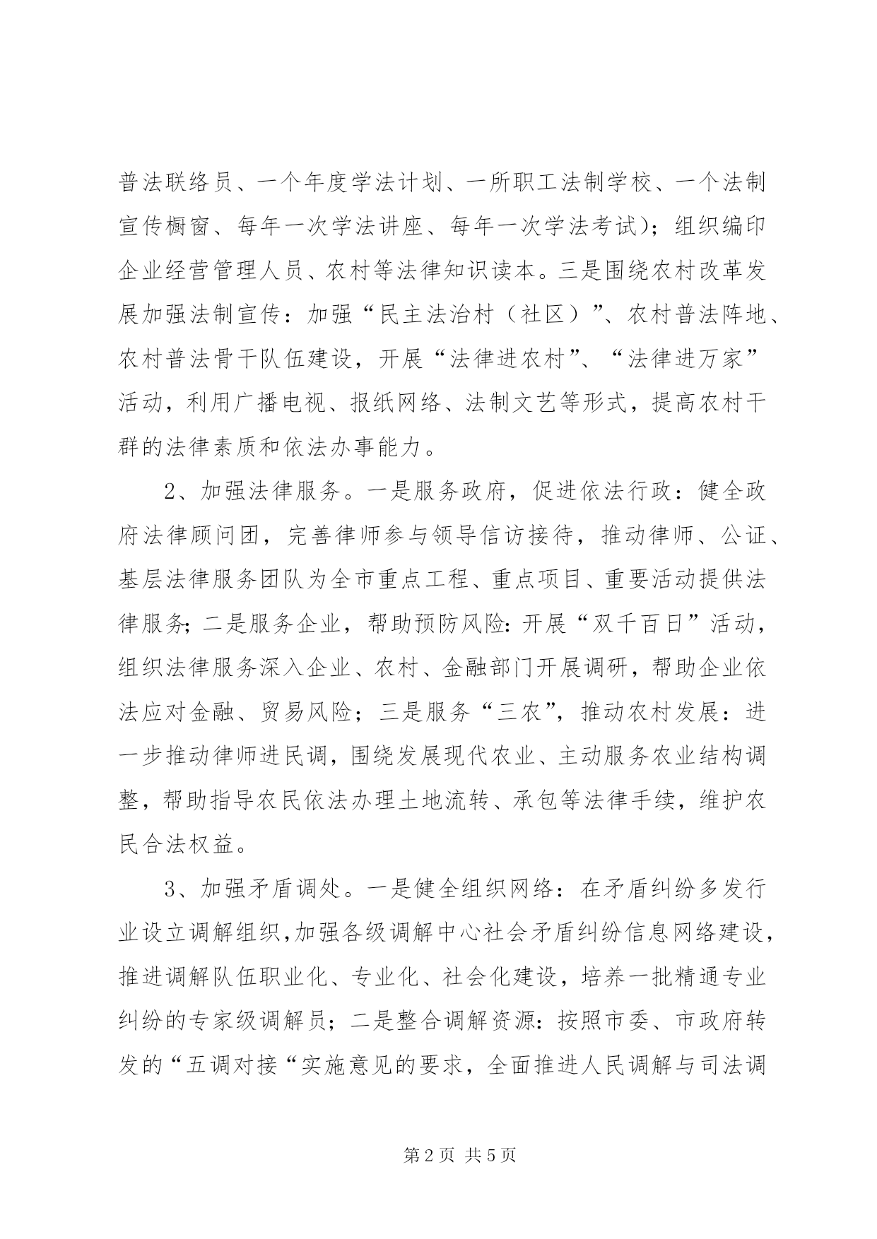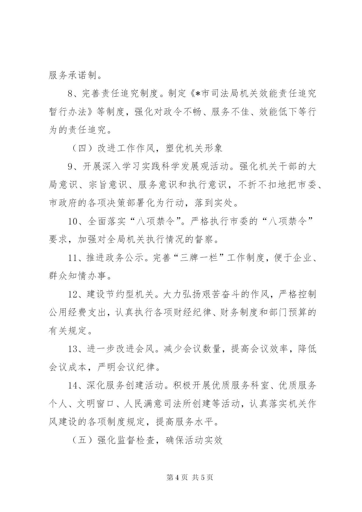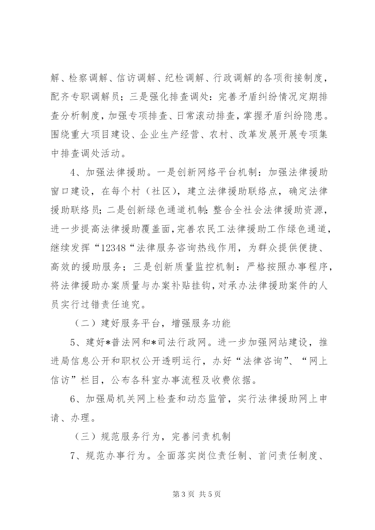 第PAGE\*Arabic\*MERGEFORMAT5页共NUMPAGES\*MERGEFORMAT5页司法局服务年活动的实施意见为进一步强化机关作风建设,提升机关服务效能,优化经济发展软环境,以新作为、新成效和新形象,为全市经济社会及司法行政事业又好又快发展提供保障。根据市委、市政府《关于开展创新服务行动年活动的实施意见》(坛委发〔2009〕8号)文件精神,现就全市司法行政系统开展“创新服务行动年”活动提出如下意见:一、工作目标以服务企业、服务项目、服务基层、服务群众为重点,把送服务送政策、创新服务品牌贯穿工作始终,突出重点,全面推动,严格责任,强化监督,努力打造简便、快捷、高效、透明的经济发展软环境。二、工作内容(一)创新服务举措,拓展活动内涵1、加强法制宣传教育。一是围绕促进经济社会健康较快发展加强法制宣传:大力宣传金融危机知识、政府政策措施和宏观调控、资源环境、土地经营权流转、知识产权保护等方面的法律法规;大力宣传社会管理、打击犯罪、依法维权等方面的法律法规;大力宣传劳动就业、社会保障、食品药品安全等方面的法律法规。二是围绕促进企业发展壮大加强法制宣传:深化“法律进企业”活动,落实企业法制宣传教育“六个一”项目建设(一名普法联络员、一个年度学法计划、一所职工法制学校、一个法制宣传橱窗、每年一次学法讲座、每年一次学法考试);组织编印企业经营管理人员、农村等法律知识读本。三是围绕农村改革发展加强法制宣传:加强“民主法治村(社区)”、农村普法阵地、农村普法骨干队伍建设,开展“法律进农村”、“法律进万家”活动,利用广播电视、报纸网络、法制文艺等形式,提高农村干群的法律素质和依法办事能力。2、加强法律服务。一是服务政府,促进依法行政:健全政府法律顾问团,完善律师参与领导信访接待,推动律师、公证、基层法律服务团队为全市重点工程、重点项目、重要活动提供法律服务;二是服务企业,帮助预防风险:开展“双千百日”活动,组织法律服务深入企业、农村、金融部门开展调研,帮助企业依法应对金融、贸易风险;三是服务“三农”,推动农村发展:进一步推动律师进民调,围绕发展现代农业、主动服务农业结构调整,帮助指导农民依法办理土地流转、承包等法律手续,维护农民合法权益。3、加强矛盾调处。一是健全组织网络:在矛盾纠纷多发行业设立调解组织,加强各级调解中心社会矛盾纠纷信息网络建设,推进调解队伍职业化、专业化、社会化建设,培养一批精通专业纠纷的专家级调解员;二是整合调解资源:按照市委、市政府转发的“五调对接“实施意见的要求,全面推进人民调解与司法调解、检察调解、信访调解、纪检调解、行政调解的各项衔接制度,配齐专职调解员;三是强化排查调处:完善矛盾纠纷情况定期排查分析制度,加强专项排查、日常滚动排查,掌握矛盾纠纷隐患。围绕重大项目建设、企业生产经营、农村、改革发展开展专项集中排查调处活动。4、加强法律援助。一是创新网络平台机制:加强法律援助窗口建设,在每个村(社区),建立法律援助联络点,确定法律援助联络员;二是创新绿色通道机制:整合全社会法律援助资源,进一步提高法律援助覆盖面,完善农民工法律援助工作绿色通道,继续发挥“12348“法律服务咨询热线作用,为群众提供便捷、高效的援助服务;三是创新质量监控机制:严格按照办事程序,将法律援助办案质量与办案补贴挂钩,对承办法律援助案件的人员实行过错责任追究。(二)建好服务平台,增强服务功能5、建好*普法网和*司法行政网。进一步加强网站建设,推进局信息公开和职权公开透明运行,办好“法律咨询”、“网上信访”栏目,公布各科室办事流程及收费依据。6、加强局机关网上检查和动态监管,实行法律援助网上申请、办理。(三)规范服务行为,完善问责机制7、规范办事行为。全面落实岗位责任制、首问责任制度、服务承诺制。8、完善责任追究制度。制定《*市司法局机关效能责任追究暂行办法》等制度,强化对政令不畅、服务不佳、效能低下等行为的责任追究。(四)改进工作作风,塑优机关形象9、开展深入学习实践科学发展观活动。强化机关干部的大局意识、宗旨意识、服务意识和执行意识,不折不扣地把市委、市政府的各项决策部署化为行动,落到实处。10、全面落实“八项禁令”。严格执行市委的“八项禁令”要求,加强对全局机关执行情况的督察。11、推进政务公示。完善“三牌一栏”工作制度,便于企业、群众知情办事。12、建设节约型机关。大力弘扬艰苦奋斗的作风,严格控制公用经费支出,认真执行各项财经纪律、财务制度和部门预算的有关规定。13、进一步改进会风。减少会议数量,提高会议效率,降低会议成本,严明会议纪律。14、深化服务创建活动。积极开展优质服务科室、优质服务个人、文明窗口、人民满意司法所创建等活动,认真落实机关作风建设的各项制度规定,提高服务水平。(五)强化监督检查