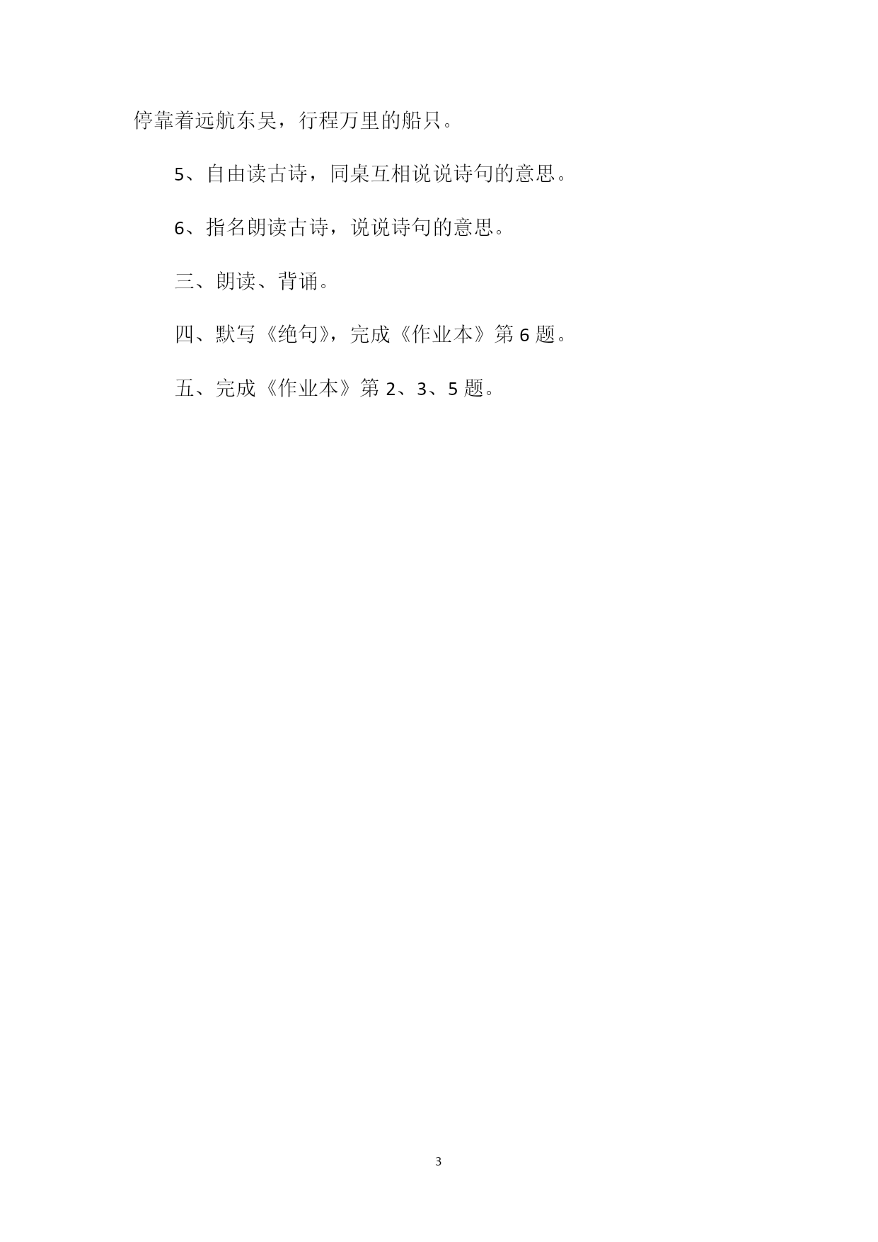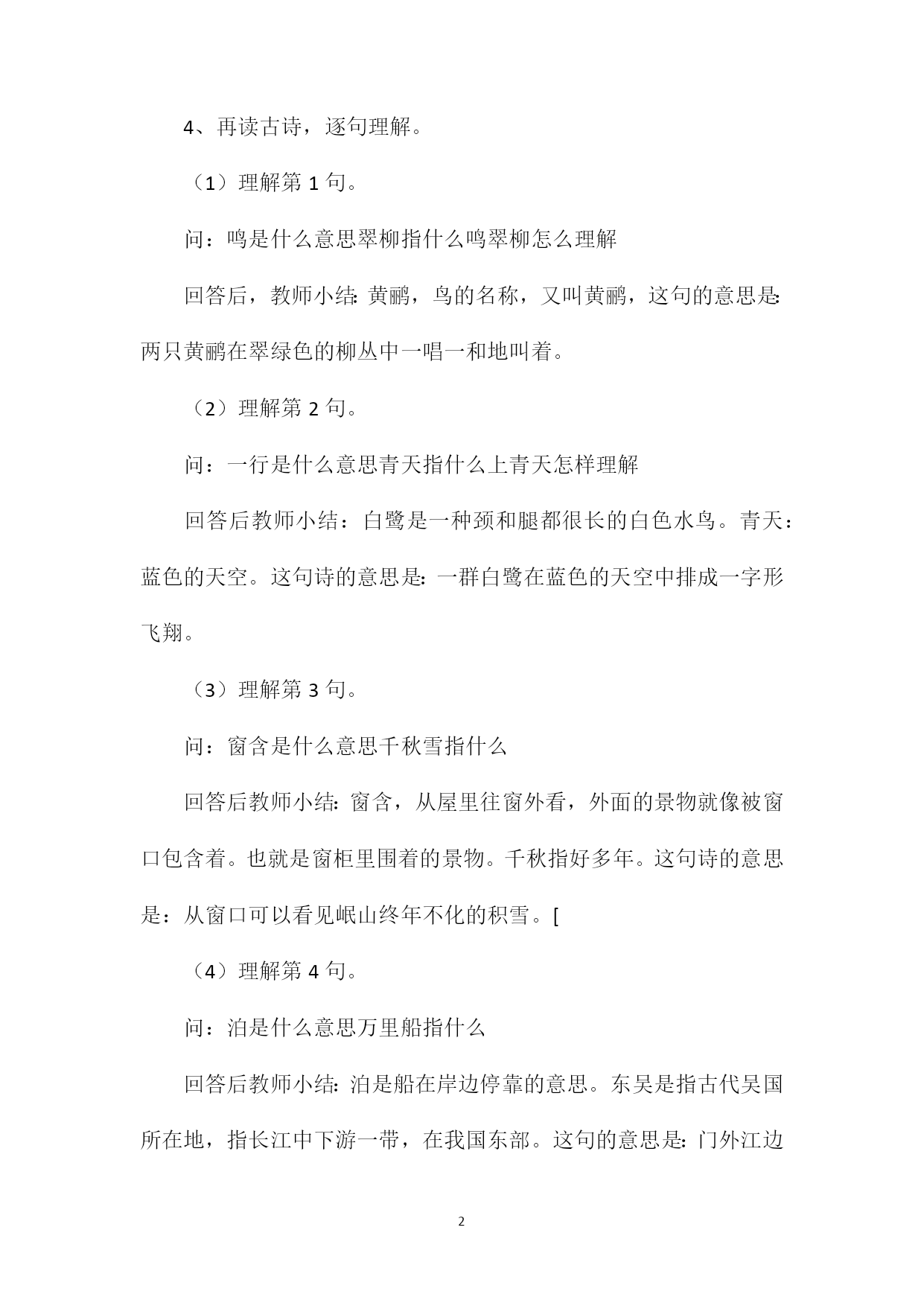 PAGEPAGE3《绝句》教学设计七教学过程:一、揭示课题。(1)说说学古诗的基本方法。(2)揭题,板书:古诗二首(3)教师范读。思考:这两首诗写哪个季节的景色写了哪些景物二、教学《绝句》。1、解题:绝句是旧诗体裁之一,一首四句。每句五个字的叫五言绝句,每句七个字的叫七言绝句。有的古诗按诗的内容列题目,这首诗就用旧诗体裁做题目。2、介绍作者:杜甫,唐代诗人。这是他重返成都时写的。他自幼好学,七岁就会吟诗,他的诗很有名。3、初读古诗。(1)自由读,拼读生字音节,观察插图,想想哪些地方你能读懂。(2)检查自学效果。认读生字和多音字泊。(3)指名朗读古诗,说说哪些地方学懂了。4、再读古诗,逐句理解。(1)理解第1句。问:鸣是什么意思翠柳指什么鸣翠柳怎么理解回答后,教师小结:黄鹂,鸟的名称,又叫黄鹂,这句的意思是:两只黄鹂在翠绿色的柳丛中一唱一和地叫着。(2)理解第2句。问:一行是什么意思青天指什么上青天怎样理解回答后教师小结:白鹭是一种颈和腿都很长的白色水鸟。青天:蓝色的天空。这句诗的意思是:一群白鹭在蓝色的天空中排成一字形飞翔。(3)理解第3句。问:窗含是什么意思千秋雪指什么回答后教师小结:窗含,从屋里往窗外看,外面的景物就像被窗口包含着。也就是窗柜里围着的景物。千秋指好多年。这句诗的意思是:从窗口可以看见岷山终年不化的积雪。[(4)理解第4句。问:泊是什么意思万里船指什么回答后教师小结:泊是船在岸边停靠的意思。东吴是指古代吴国所在地,指长江中下游一带,在我国东部。这句的意思是:门外江边停靠着远航东吴,行程万里的船只。5、自由读古诗,同桌互相说说诗句的意思。6、指名朗读古诗,说说诗句的意思。三、朗读、背诵。四、默写《绝句》,完成《作业本》第6题。五、完成《作业本》第2、3、5题。