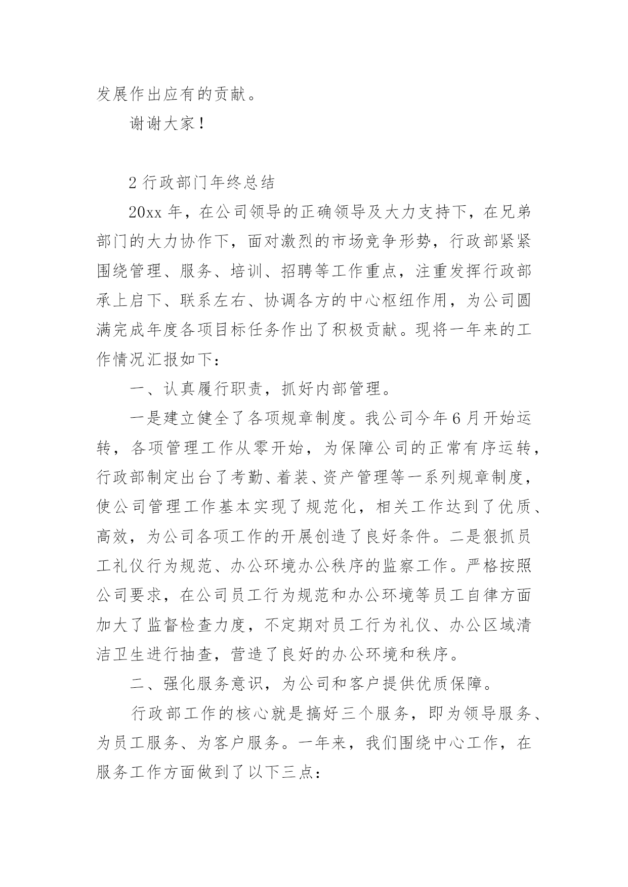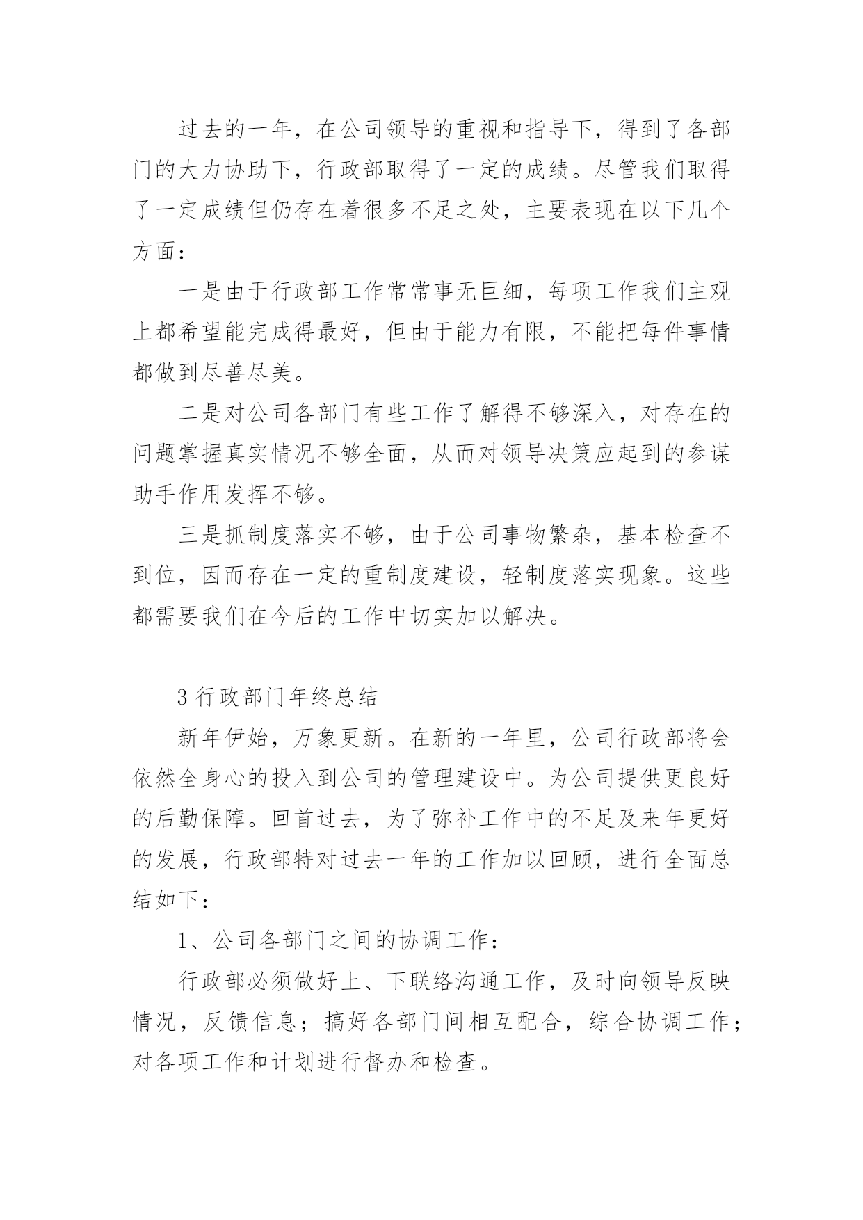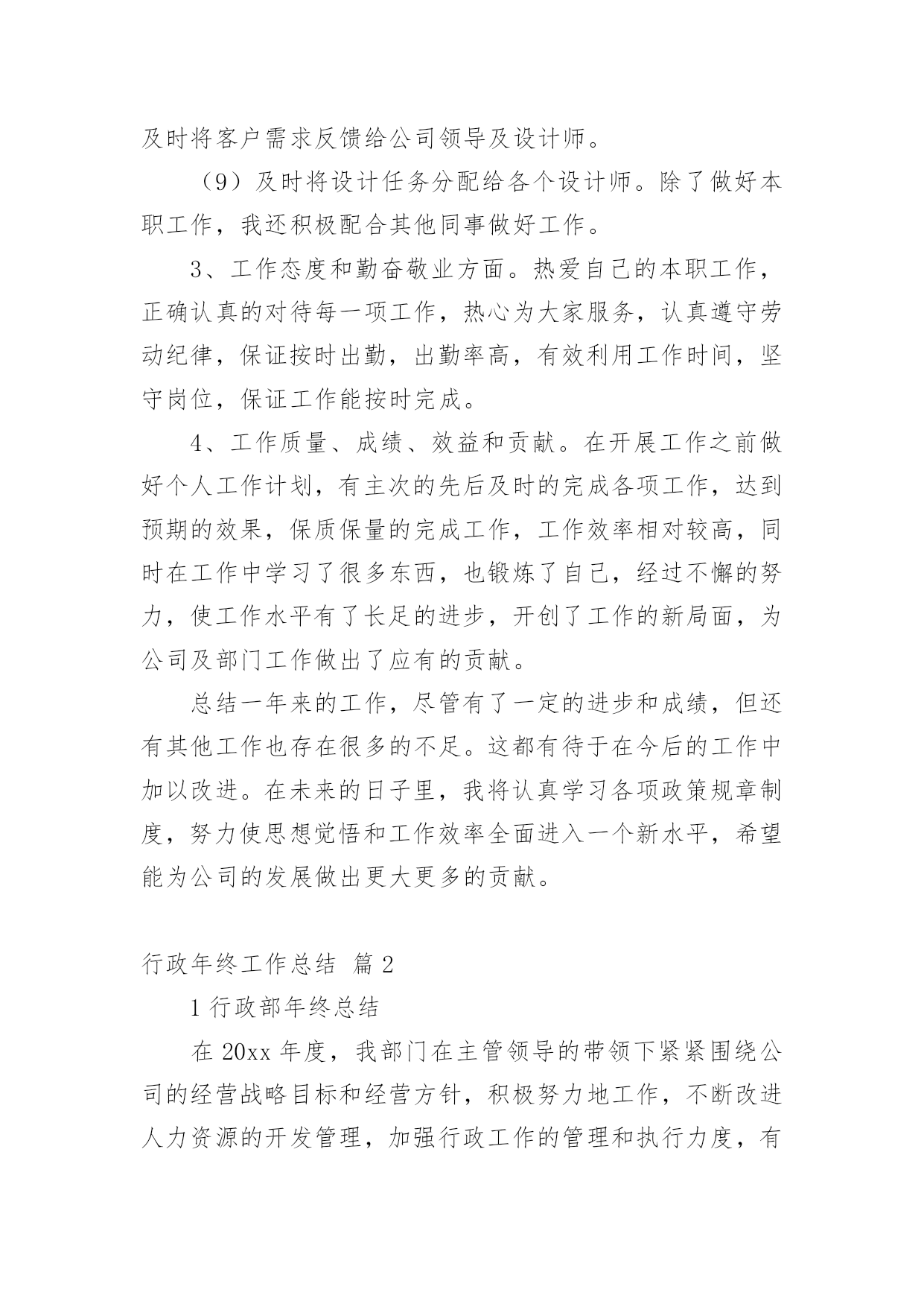 行政年终工作总结关于行政年终工作总结八篇总结是在某一时期、某一项目或某些工作告一段落或者全部完成后进行回顾检查、分析评价,从而得出教训和一些规律性认识的一种书面材料,它是增长才干的一种好办法,让我们好好写一份总结吧。总结怎么写才是正确的呢?下面是小编精心整理的行政年终工作总结8篇,欢迎大家分享。行政年终工作总结篇120xx年x月加入贵公司,任行政文员工作,之前有过一点相关工作的经验,但来到贵公司后我虚心向人请教和学习,一切都从零学起,从零做起,使自己从零中慢慢成长和完善,使自己的行为标准、思想觉悟和工作能力尽快的向公司要求的目标靠拢,希望自己能早日加入设计行业的大集体。一年的时间很快过去了,在这一年里,我在公司领导及同事们的关心与帮助下完成了各项工作,在思想觉悟方面有了更进一步的提高,这次的工作总结主要有以下几项:一、思想政治表现、品德素质修养及职业道德能够认真贯彻党的基本路线方针政策,通过网络、报纸、杂志、书籍积极学习政治理论;遵纪守法,认真学习法律知识;爱岗敬业,具有强烈的责任感和事业心,积极主动认真的学习专业知识,工作态度端正,认真负责。二、专业知识、工作能力和具体工作我是xx月份来到公司工作,担任公司行政助理工作,主要是做好行政工作。我认为行政工作比较琐碎,每天都面临着大量的'、琐碎的、不起眼的事务,而这些事务又是必不可少的。为了搞好工作,我不怕麻烦,向领导请教、向同事学习、自己摸索实践,在短时间内熟悉了本职的工作,明确了工作的程序、方向,提高了工作能力,在具体的工作中形成了一个清晰的工作思路,能够顺利的开展和完成本职工作。概括来说,行政管理在企业中主要有管理、协调、服务三大功能;其中管理是主干,协调是核心,服务是根本。总而言之,行政管理的实质就是服务。在这一年中,我本着“把工作做的更好”这样一个目标,开拓创新意识,积极的完成了以下本职工作:(1)公司的两次变更手续。(2)公司员工联系单、固定资产、办公明细等电子文档的的更新。(3)各类杂志、报纸订阅时间的统计及后续工作。(4)工作区域的卫生管理及执行。(5)做好办公用品的管理工作:做好办公用品领用登记,按需所发,做到不浪费,按时清点,以便能及时补充办公用品,满足员工工作的需要。(6)办公耗材及办公用品的采购、维护与维修工作。(7)认真地做好公司领导及行政经理交办的其它工作。(8)为了公司工作的顺利进行与客户之间的工作协调,及时将客户需求反馈给公司领导及设计师。(9)及时将设计任务分配给各个设计师。除了做好本职工作,我还积极配合其他同事做好工作。3、工作态度和勤奋敬业方面。热爱自己的本职工作,正确认真的对待每一项工作,热心为大家服务,认真遵守劳动纪律,保证按时出勤,出勤率高,有效利用工作时间,坚守岗位,保证工作能按时完成。4、工作质量、成绩、效益和贡献。在开展工作之前做好个人工作计划,有主次的先后及时的完成各项工作,达到预期的效果,保质保量的完成工作,工作效率相对较高,同时在工作中学习了很多东西,也锻炼了自己,经过不懈的努力,使工作水平有了长足的进步,开创了工作的新局面,为公司及部门工作做出了应有的贡献。总结一年来的工作,尽管有了一定的进步和成绩,但还有其他工作也存在很多的不足。这都有待于在今后的工作中加以改进。在未来的日子里,我将认真学习各项政策规章制度,努力使思想觉悟和工作效率全面进入一个新水平,希望能为公司的发展做出更大更多的贡献。行政年终工作总结篇21行政部年终总结在20xx年度,我部门在主管领导的带领下紧紧围绕公司的经营战略目标和经营方针,积极努力地工作,不断改进人力资源的开发管理,加强行政工作的管理和执行力度,有力的保障了公司正常的经营秩序。现对主要工作进行汇报:第一、行政人力资源管理方面工作行政人力资源管理是公司行政工作中一项重要工作,行政人力资源部是总经理直接领导下的综合管理机构,是承上启下、沟通内外、协调左右、联系四面八方的枢纽,推动各项工作朝着既定目标前进的中心,是企业利润价值创造的源泉和发展的基础,做好行政人力资源管理工作已是各个企业管理工作中的重中之重。在20xx年,行政人力资源管理工作紧随着公司地发展,积极进行内部工作的建立、健全和完善,主要从以下几个方面开展:1、制度建设方面公司制度是规范相关劳动关系的建立、运行的规则,既保障员工享有在公司的各项劳动权利,也制约和规范员工在工作场所的`行为。今年4月,结合公司实际情况,我部门颁布并执行了公司新的管理制度,弥补了旧制度的不足,加强企业成本控制、维护工作秩序、提高工作效率,极大的调动了员工的工作积极性。2、员工培训和开发培训是最好的福利。为了提高员工的职业技能和综合素质,增强公司整体凝聚力和执行力,我部门积极完善规范培训各程序环节的工作,制定了员工的培训计划,保证公司人力资源的供应和提升。3。