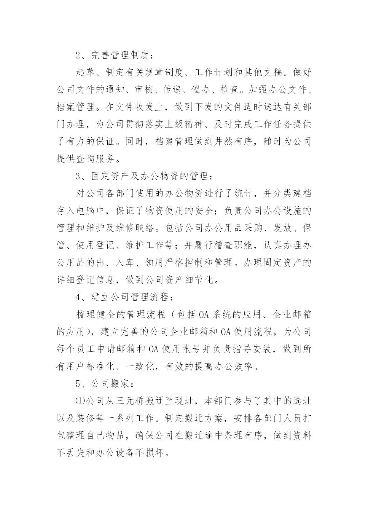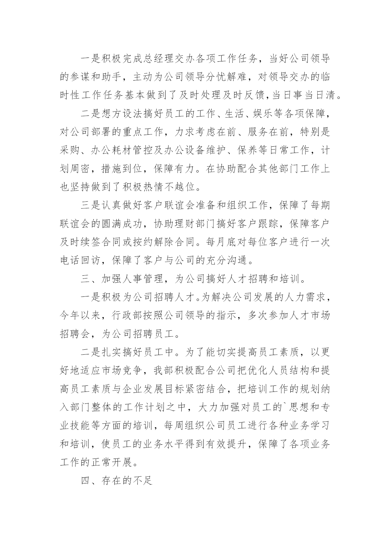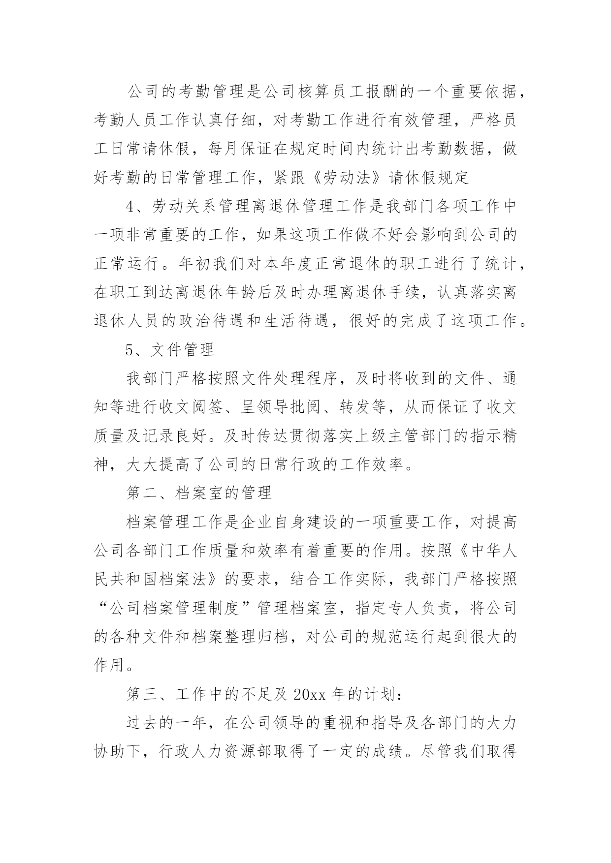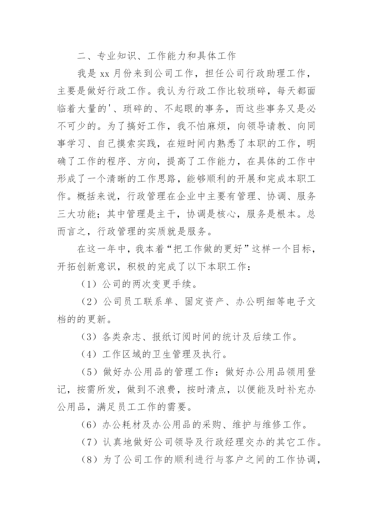 行政年终工作总结关于行政年终工作总结八篇总结是在某一时期、某一项目或某些工作告一段落或者全部完成后进行回顾检查、分析评价,从而得出教训和一些规律性认识的一种书面材料,它是增长才干的一种好办法,让我们好好写一份总结吧。总结怎么写才是正确的呢?下面是小编精心整理的行政年终工作总结8篇,欢迎大家分享。行政年终工作总结篇120xx年x月加入贵公司,任行政文员工作,之前有过一点相关工作的经验,但来到贵公司后我虚心向人请教和学习,一切都从零学起,从零做起,使自己从零中慢慢成长和完善,使自己的行为标准、思想觉悟和工作能力尽快的向公司要求的目标靠拢,希望自己能早日加入设计行业的大集体。一年的时间很快过去了,在这一年里,我在公司领导及同事们的关心与帮助下完成了各项工作,在思想觉悟方面有了更进一步的提高,这次的工作总结主要有以下几项:一、思想政治表现、品德素质修养及职业道德能够认真贯彻党的基本路线方针政策,通过网络、报纸、杂志、书籍积极学习政治理论;遵纪守法,认真学习法律知识;爱岗敬业,具有强烈的责任感和事业心,积极主动认真的学习专业知识,工作态度端正,认真负责。二、专业知识、工作能力和具体工作我是xx月份来到公司工作,担任公司行政助理工作,主要是做好行政工作。我认为行政工作比较琐碎,每天都面临着大量的'、琐碎的、不起眼的事务,而这些事务又是必不可少的。为了搞好工作,我不怕麻烦,向领导请教、向同事学习、自己摸索实践,在短时间内熟悉了本职的工作,明确了工作的程序、方向,提高了工作能力,在具体的工作中形成了一个清晰的工作思路,能够顺利的开展和完成本职工作。概括来说,行政管理在企业中主要有管理、协调、服务三大功能;其中管理是主干,协调是核心,服务是根本。总而言之,行政管理的实质就是服务。在这一年中,我本着“把工作做的更好”这样一个目标,开拓创新意识,积极的完成了以下本职工作:(1)公司的两次变更手续。(2)公司员工联系单、固定资产、办公明细等电子文档的的更新。(3)各类杂志、报纸订阅时间的统计及后续工作。(4)工作区域的卫生管理及执行。(5)做好办公用品的管理工作:做好办公用品领用登记,按需所发,做到不浪费,按时清点,以便能及时补充办公用品,满足员工工作的需要。(6)办公耗材及办公用品的采购、维护与维修工作。(7)认真地做好公司领导及行政经理交办的其它工作。(8)为了公司工作的顺利进行与客户之间的工作协调,及时将客户需求反馈给公司领导及设计师。(9)及时将设计任务分配给各个设计师。除了做好本职工作,我还积极配合其他同事做好工作。3、工作态度和勤奋敬业方面。热爱自己的本职工作,正确认真的对待每一项工作,热心为大家服务,认真遵守劳动纪律,保证按时出勤,出勤率高,有效利用工作时间,坚守岗位,保证工作能按时完成。4、工作质量、成绩、效益和贡献。在开展工作之前做好个人工作计划,有主次的先后及时的完成各项工作,达到预期的效果,保质保量的完成工作,工作效率相对较高,同时在工作中学习了很多东西,也锻炼了自己,经过不懈的努力,使工作水平有了长足的进步,开创了工作的新局面,为公司及部门工作做出了应有的贡献。总结一年来的工作,尽管有了一定的进步和成绩,但还有其他工作也存在很多的不足。这都有待于在今后的工作中加以改进。在未来的日子里,我将认真学习各项政策规章制度,努力使思想觉悟和工作效率全面进入一个新水平,希望能为公司的发展做出更大更多的贡献。行政年终工作总结篇21行政部年终总结在20xx年度,我部门在主管领导的带领下紧紧围绕公司的经营战略目标和经营方针,积极努力地工作,不断改进人力资源的开发管理,加强行政工作的管理和执行力度,有力的保障了公司正常的经营秩序。现对主要工作进行汇报:第一、行政人力资源管理方面工作行政人力资源管理是公司行政工作中一项重要工作,行政人力资源部是总经理直接领导下的综合管理机构,是承上启下、沟通内外、协调左右、联系四面八方的枢纽,推动各项工作朝着既定目标前进的中心,是企业利润价值创造的源泉和发展的基础,做好行政人力资源管理工作已是各个企业管理工作中的重中之重。在20xx年,行政人力资源管理工作紧随着公司地发展,积极进行内部工作的建立、健全和完善,主要从以下几个方面开展:1、制度建设方面公司制度是规范相关劳动关系的建立、运行的规则,既保障员工享有在公司的各项劳动权利,也制约和规范员工在工作场所的`行为。今年4月,结合公司实际情况,我部门颁布并执行了公司新的管理制度,弥补了旧制度的不足,加强企业成本控制、维护工作秩序、提高工作效率,极大的调动了员工的工作积极性。2、员工培训和开发培训是最好的福利。为了提高员工的职业技能和综合素质,增强公司整体凝聚力和执行力,我部门积极完善规范培训各程序环节的工作,制定了员工的培训计划,保证公司人力资源的供应和提升。3。