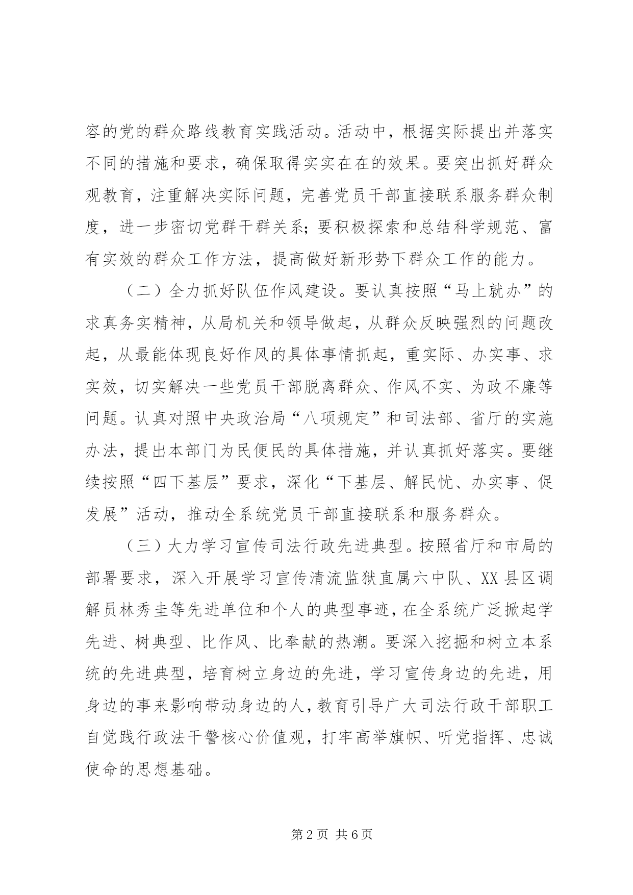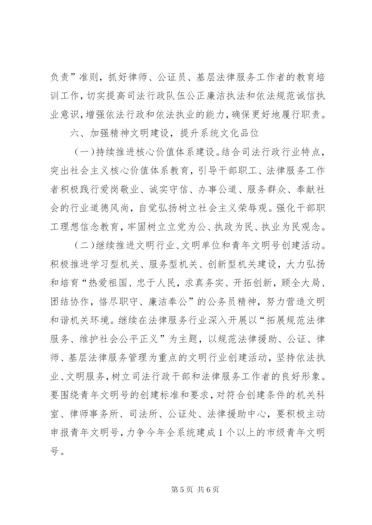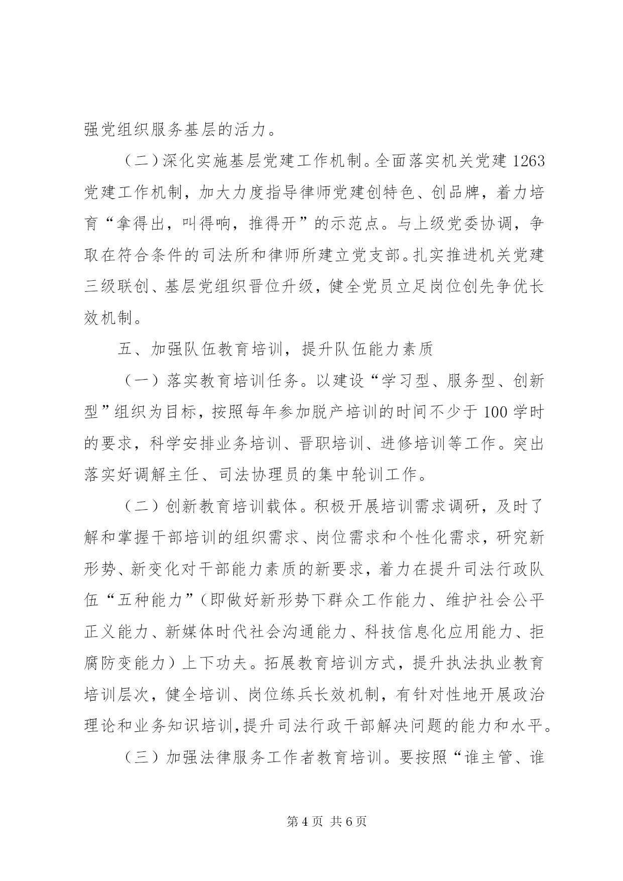 第PAGE\*Arabic\*MERGEFORMAT6页共NUMPAGES\*MERGEFORMAT6页司法局队伍建设工作要点一、加强思想政治建设,提升队伍理论水平(一)全力抓好十八大精神的学习贯彻。以领导干部为重点,采取专题培训、研讨交流等多种方式,分期分批组织轮训,带动全系统深入学习和自觉贯彻十八大提出的重大理论观点、重大方针政策和重大工作部署。要突出加强思想政治建设,把理想信念教育与中国特色社会主义教育、革命传统教育、政法干警核心价值观教育紧密结合起来,坚持用中国特色社会主义理论体系武装党员干部;引导广大党员干部坚定中国特色社会主义的道路自信、理论自信、制度自信。(二)深入开展“增强忧患意识推动长远发展”大讨论活动。按照县委统一部署,严格按照时序步骤抓好每个阶段工作。要贴近工作实际,紧盯年度目标任务,找准司法行政服务全县经济发展的着眼点、着力点,认真研究确定具体调研课题。要通过学习会、征求意见、研讨会、务虚会等形式,组织好讨论和调研,引导机关人员和法律服务人员进一步解放思想、寻找差距、改进作风,提高执行力和落实力,持续推进司法行政工作跨越发展、长远发展。二、加强队伍作风建设,密切党群干群关系(一)扎实开展党的群众路线教育实践活动。按照省、市、县的统一部署,认真组织开展以“为民、务实、清廉”为主要内容的党的群众路线教育实践活动。活动中,根据实际提出并落实不同的措施和要求,确保取得实实在在的效果。要突出抓好群众观教育,注重解决实际问题,完善党员干部直接联系服务群众制度,进一步密切党群干群关系;要积极探索和总结科学规范、富有实效的群众工作方法,提高做好新形势下群众工作的能力。(二)全力抓好队伍作风建设。要认真按照“马上就办”的求真务实精神,从局机关和领导做起,从群众反映强烈的问题改起,从最能体现良好作风的具体事情抓起,重实际、办实事、求实效,切实解决一些党员干部脱离群众、作风不实、为政不廉等问题。认真对照中央政治局“八项规定”和司法部、省厅的实施办法,提出本部门为民便民的具体措施,并认真抓好落实。要继续按照“四下基层”要求,深化“下基层、解民忧、办实事、促发展”活动,推动全系统党员干部直接联系和服务群众。(三)大力学习宣传司法行政先进典型。按照省厅和市局的部署要求,深入开展学习宣传清流监狱直属六中队、XX县区调解员林秀圭等先进单位和个人的典型事迹,在全系统广泛掀起学先进、树典型、比作风、比奉献的热潮。要深入挖掘和树立本系统的先进典型,培育树立身边的先进,学习宣传身边的先进,用身边的事来影响带动身边的人,教育引导广大司法行政干部职工自觉践行政法干警核心价值观,打牢高举旗帜、听党指挥、忠诚使命的思想基础。三、加强干部人事管理,优化干部队伍结构(一)加强领导班子建设。要切实加强自身建设,大力加强领导干部作风和纪律建设,落实好以民主集中制为核心的领导班子内部制度建设,完善工作决策机制和运行机制,健全并落实好领导班子内部沟通协调和民主生活会制度,切实把领导班子建设成为善于领导科学发展跨越发展的坚强集体。认真落实领导干部述职述廉、谈话、函询、个人有关事项报告等制度,不断规范权力运行制约机制,切实做到“把权力关进制度的笼子里”。(二)深化人事制度改革。坚持德才兼备、以德为先,坚持注重实绩、群众公认,坚持用人标准,注重抓用人导向、抓准确评价、抓人岗匹配,规范完善干部选拔任用机制。重点抓好后备干部队伍建设和管理工作;注重优秀年轻干部培养,合理使用各年龄段干部,落实干部交流轮岗工作要求。(三)加强基层队伍管理。加强对基层政法专项编制使用情况的协调,切实推进司法助理员专项编制的配备使用,力争副科级司法所长配备率达90%以上。四、加强党组织基础建设,进一步创新基层党建工作(一)加强服务型党组织建设。注重抓责任、抓载体、抓带头人、抓典型,充分发挥党支部在推动发展、服务群众、维护稳定、凝聚人心的作用,努力把党支部建设成为全面建成小康社会的战斗堡垒。要针对有的党员作风不实等问题,着力抓作风,增强党组织服务基层的活力。(二)深化实施基层党建工作机制。全面落实机关党建1263党建工作机制,加大力度指导律师党建创特色、创品牌,着力培育“拿得出,叫得响,推得开”的示范点。与上级党委协调,争取在符合条件的司法所和律师所建立党支部。扎实推进机关党建三级联创、基层党组织晋位升级,健全党员立足岗位创先争优长效机制。五、加强队伍教育培训,提升队伍能力素质(一)落实教育培训任务。以建设“学习型、服务型、创新型”组织为目标,按照每年参加脱产培训的时间不少于100学时的要求,科学安排业务培训、晋职培训、进修培训等工作。突出落实好调解主任、司法协理员的集中轮训工作。(二)创新教育培训载体。积极开展培训需求调研,及时了解和掌握干部培训的组织需求、岗位需求和个