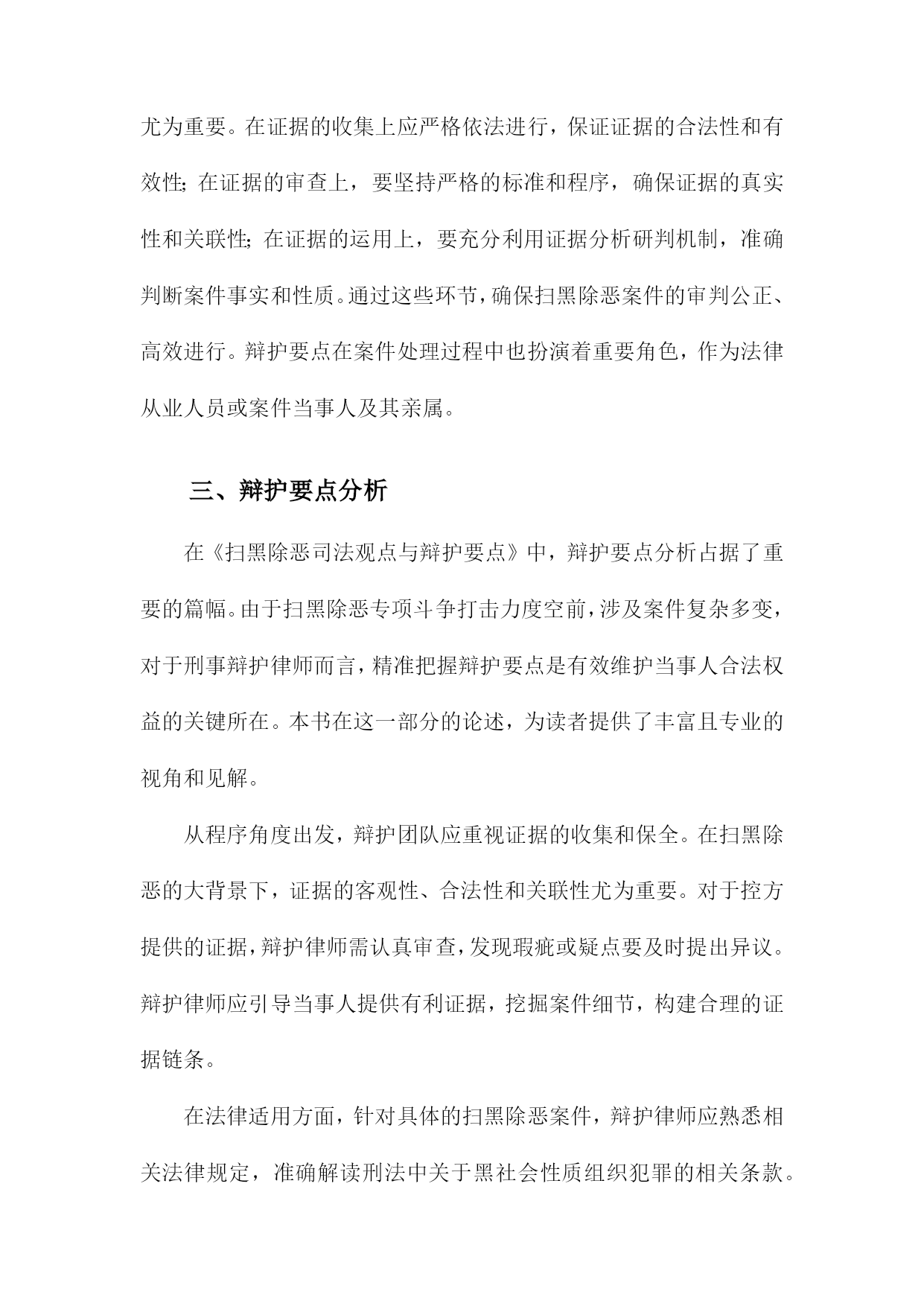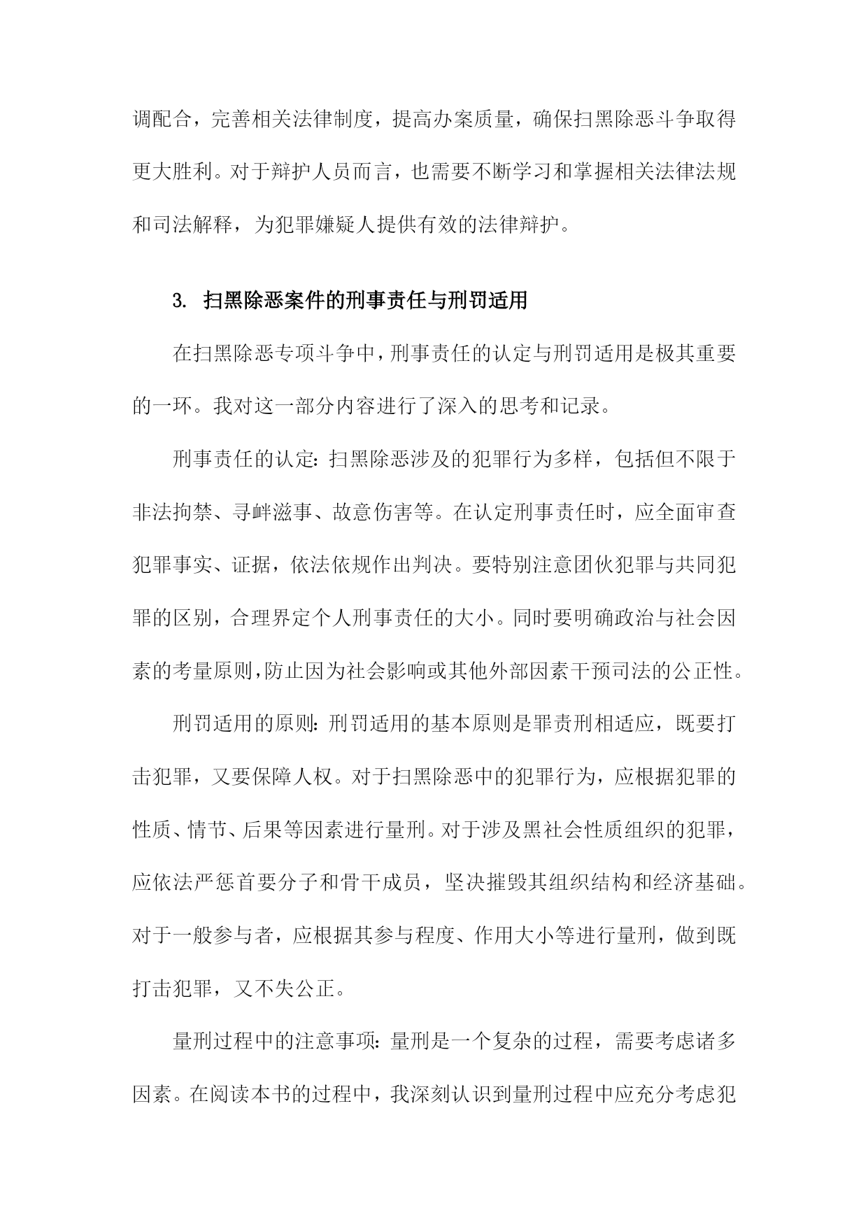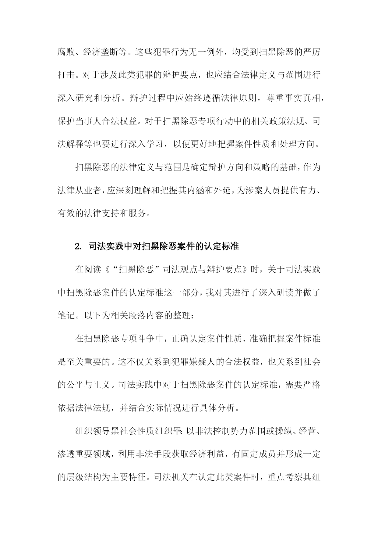 《“扫黑除恶”司法观点与辩护要点》读书札记一、背景介绍在当前社会背景下,扫黑除恶不仅是社会治安综合治理的重要内容,更是维护社会稳定、保障人民群众生命财产安全的重要行动。随着法治建设的深入推进,扫黑除恶专项斗争的司法实践逐渐丰富,涉及的法律问题也日益复杂多样。对于从事法律工作的人员而言,深入了解扫黑除恶的司法观点与辩护要点显得尤为重要。在此背景下,我阅读了《“扫黑除恶”司法观点与辩护要点》对扫黑除恶专项斗争的司法实践有了更为深入的认识和理解。本书不仅梳理了扫黑除恶相关的法律法规和政策文件,还结合具体案例分析了扫黑除恶行动的实务操作和法律适用问题。阅读本书后,我对如何运用法律知识参与到扫黑除恶专项斗争中的实际工作和辩护实践有了更加明确的指导方向。以下是我对本书内容的详细札记。1.扫黑除恶的背景和重要性扫黑除恶是一项在中国特定历史时期和社会环境下应运而生的重大行动。随着社会的不断发展,一些黑恶势力逐渐滋生并侵蚀社会肌理的深层次,严重影响了社会的稳定与和谐。这些黑恶势力以暴力、贿赂等手段,干扰社会正常秩序,侵害人民群众的生命财产安全,破坏经济发展环境。为了维护社会的公正、公平和正义,扫黑除恶行动应运而生。维护社会稳定:扫黑除恶行动能够有效地打击黑恶势力的嚣张气焰,维护社会的稳定和和谐。一个稳定的社会环境是经济发展的基础,也是人民安居乐业的前提。保护人民群众利益:黑恶势力通过非法手段侵害人民群众的利益,扫黑除恶行动能够有力地保护人民群众的合法权益,让人民群众感受到公正和正义。净化社会风气:扫黑除恶行动能够净化社会风气,树立社会正气,增强人民群众的法制意识,提高社会的文明程度。促进经济发展:一个稳定、公正、公平的社会环境是经济发展的重要保障。扫黑除恶行动能够为经济发展提供良好的社会环境,促进经济的健康发展。彰显法治精神:扫黑除恶行动是法治精神的具体体现,彰显了法律在维护社会秩序、保护人民权益方面的重要作用。在当前的社会环境下,扫黑除恶行动具有重要的现实意义和深远的历史意义。它不仅是一项打击黑恶势力的行动,更是一项维护社会公正、公平和正义的重要举措。2.本书的目的和意义本书《“扫黑除恶”司法观点与辩护要点》旨在深入探讨扫黑除恶专项斗争的司法实践与理论发展,结合具体案例和法律条文,系统阐述扫黑除恶的法律内涵、司法观点及辩护要点。在当前社会治安形势下,扫黑除恶不仅是维护社会稳定的重要行动,也是推进法治建设的重要内容。本书具有以下几方面的目的和意义:本书有助于普及扫黑除恶的法律知识,通过深入解析相关法律法规和司法解释,帮助公众理解扫黑除恶专项斗争的背景、目的和任务,提高公众对扫黑除恶专项斗争的认识和参与度。本书为司法实践提供指导,结合具体案例,分析扫黑除恶司法实践中的疑难问题,为司法人员在处理相关案件时提供借鉴和参考,促进司法公正和效率。本书强调辩护权利的重要性,在扫黑除恶专项斗争中,保障被告人的辩护权利至关重要。本书详细阐述了辩护要点,旨在提醒司法人员在办案过程中充分尊重和保护被告人的合法权益,确保司法公正和程序正义。本书推动法治建设和社会治理创新,通过对扫黑除恶专项斗争的深入研究,本书为法治建设和社会治理创新提供理论支持和实践经验,有助于推动社会治安综合治理和法治国家建设。本书《“扫黑除恶”司法观点与辩护要点》旨在深入剖析扫黑除恶专项斗争的司法实践与理论发展,为普及法律知识、指导司法实践、保障辩护权利以及推动法治建设和社会治理创新等方面发挥积极作用。二、司法观点梳理扫黑除恶专项斗争的重要性:司法界普遍认为,扫黑除恶不仅是社会治安问题,更是关乎国家政治安全、社会稳定和经济发展的重要课题。严厉打击黑恶势力,是维护社会公平正义的必然要求。依法严惩黑恶势力:司法实践中,对于黑恶势力犯罪要坚持依法严惩的原则。黑社会性质组织犯罪严重影响社会稳定和人民生命财产安全,对其成员要依法追究刑事责任,从严惩处首要分子和骨干成员。准确把握法律界限:在扫黑除恶专项斗争中,要准确把握法律界限,确保不枉不纵。对于涉及黑社会性质组织犯罪的案件,要准确区分罪与非罪、此罪与彼罪的界限,确保案件质量。重视证据收集与审查:司法实践中强调,对于扫黑除恶案件,证据的收集与审查至关重要。公安机关、检察机关和审判机关要加强协作,确保案件证据充分、确凿,经得起法律的检验。辩护策略与技巧:在扫黑除恶案件中,辩护律师要充分发挥作用,积极为被告人辩护。在辩护过程中,要准确理解法律条款,找到有利于被告人的法律依据,合理运用辩护技巧,确保被告人的合法权益得到保障。坚持宽严相济政策:在扫黑除恶专项斗争中,要坚持宽严相济的政策。对于自首、立功等情节,要依法从轻或减轻处罚。对于情节恶劣、社会影响大的案件,要坚决依法严惩。加强宣传教育:司法界认为,加强扫黑除恶