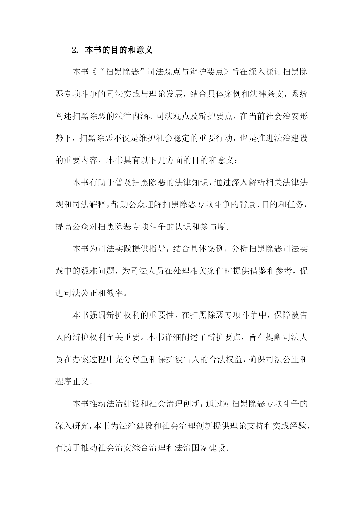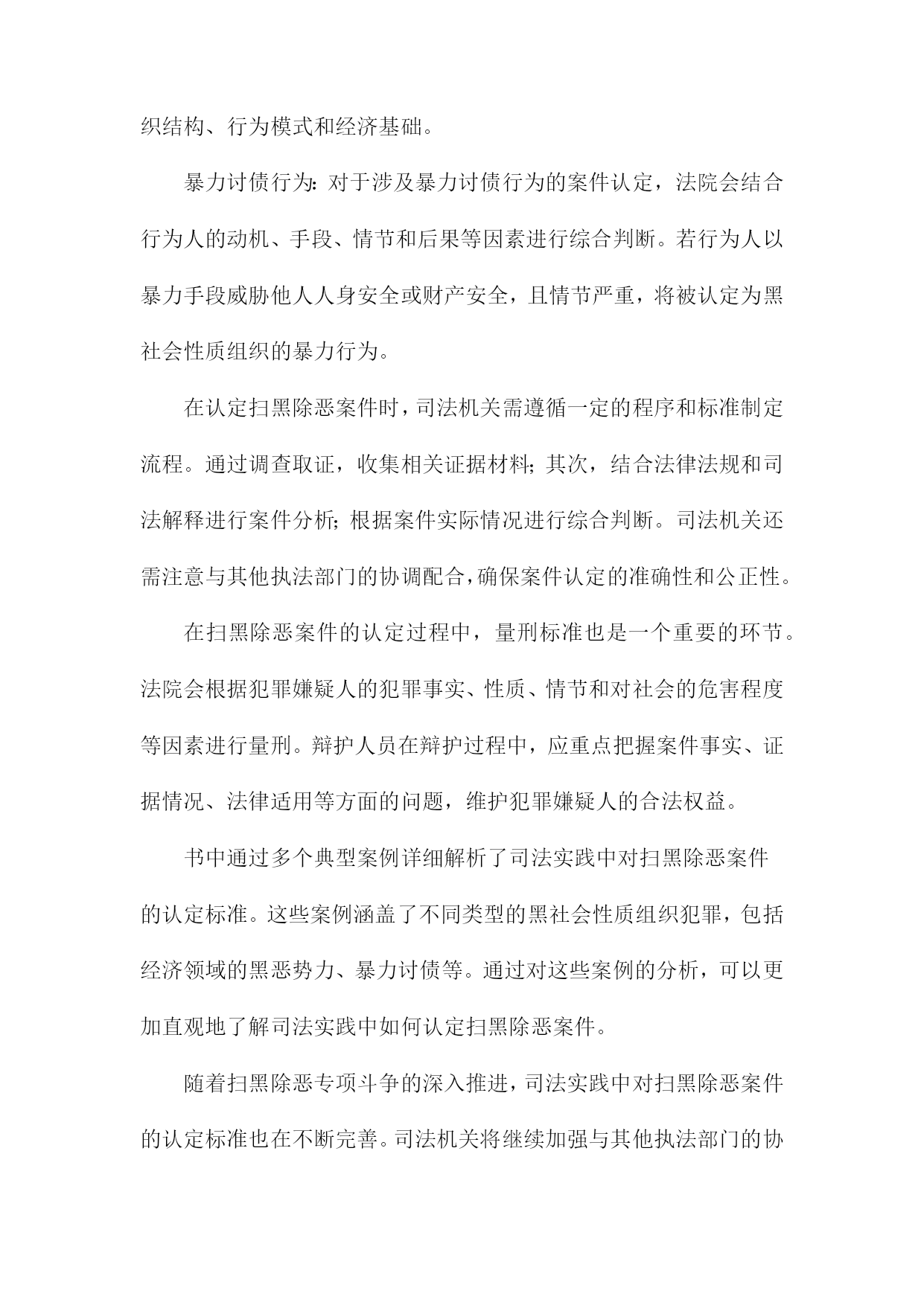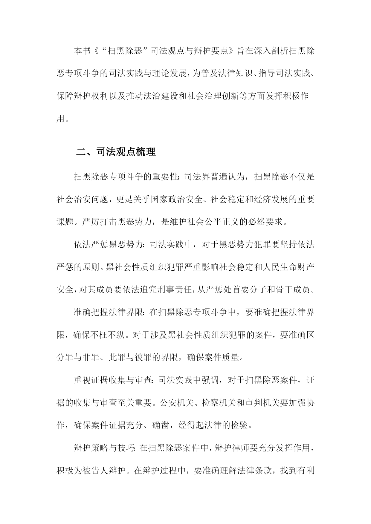 《“扫黑除恶”司法观点与辩护要点》读书札记一、背景介绍在当前社会背景下,扫黑除恶不仅是社会治安综合治理的重要内容,更是维护社会稳定、保障人民群众生命财产安全的重要行动。随着法治建设的深入推进,扫黑除恶专项斗争的司法实践逐渐丰富,涉及的法律问题也日益复杂多样。对于从事法律工作的人员而言,深入了解扫黑除恶的司法观点与辩护要点显得尤为重要。在此背景下,我阅读了《“扫黑除恶”司法观点与辩护要点》对扫黑除恶专项斗争的司法实践有了更为深入的认识和理解。本书不仅梳理了扫黑除恶相关的法律法规和政策文件,还结合具体案例分析了扫黑除恶行动的实务操作和法律适用问题。阅读本书后,我对如何运用法律知识参与到扫黑除恶专项斗争中的实际工作和辩护实践有了更加明确的指导方向。以下是我对本书内容的详细札记。1.扫黑除恶的背景和重要性扫黑除恶是一项在中国特定历史时期和社会环境下应运而生的重大行动。随着社会的不断发展,一些黑恶势力逐渐滋生并侵蚀社会肌理的深层次,严重影响了社会的稳定与和谐。这些黑恶势力以暴力、贿赂等手段,干扰社会正常秩序,侵害人民群众的生命财产安全,破坏经济发展环境。为了维护社会的公正、公平和正义,扫黑除恶行动应运而生。维护社会稳定:扫黑除恶行动能够有效地打击黑恶势力的嚣张气焰,维护社会的稳定和和谐。一个稳定的社会环境是经济发展的基础,也是人民安居乐业的前提。保护人民群众利益:黑恶势力通过非法手段侵害人民群众的利益,扫黑除恶行动能够有力地保护人民群众的合法权益,让人民群众感受到公正和正义。净化社会风气:扫黑除恶行动能够净化社会风气,树立社会正气,增强人民群众的法制意识,提高社会的文明程度。促进经济发展:一个稳定、公正、公平的社会环境是经济发展的重要保障。扫黑除恶行动能够为经济发展提供良好的社会环境,促进经济的健康发展。彰显法治精神:扫黑除恶行动是法治精神的具体体现,彰显了法律在维护社会秩序、保护人民权益方面的重要作用。在当前的社会环境下,扫黑除恶行动具有重要的现实意义和深远的历史意义。它不仅是一项打击黑恶势力的行动,更是一项维护社会公正、公平和正义的重要举措。2.本书的目的和意义本书《“扫黑除恶”司法观点与辩护要点》旨在深入探讨扫黑除恶专项斗争的司法实践与理论发展,结合具体案例和法律条文,系统阐述扫黑除恶的法律内涵、司法观点及辩护要点。在当前社会治安形势下,扫黑除恶不仅是维护社会稳定的重要行动,也是推进法治建设的重要内容。本书具有以下几方面的目的和意义:本书有助于普及扫黑除恶的法律知识,通过深入解析相关法律法规和司法解释,帮助公众理解扫黑除恶专项斗争的背景、目的和任务,提高公众对扫黑除恶专项斗争的认识和参与度。本书为司法实践提供指导,结合具体案例,分析扫黑除恶司法实践中的疑难问题,为司法人员在处理相关案件时提供借鉴和参考,促进司法公正和效率。本书强调辩护权利的重要性,在扫黑除恶专项斗争中,保障被告人的辩护权利至关重要。本书详细阐述了辩护要点,旨在提醒司法人员在办案过程中充分尊重和保护被告人的合法权益,确保司法公正和程序正义。本书推动法治建设和社会治理创新,通过对扫黑除恶专项斗争的深入研究,本书为法治建设和社会治理创新提供理论支持和实践经验,有助于推动社会治安综合治理和法治国家建设。本书《“扫黑除恶”司法观点与辩护要点》旨在深入剖析扫黑除恶专项斗争的司法实践与理论发展,为普及法律知识、指导司法实践、保障辩护权利以及推动法治建设和社会治理创新等方面发挥积极作用。二、司法观点梳理扫黑除恶专项斗争的重要性:司法界普遍认为,扫黑除恶不仅是社会治安问题,更是关乎国家政治安全、社会稳定和经济发展的重要课题。严厉打击黑恶势力,是维护社会公平正义的必然要求。依法严惩黑恶势力:司法实践中,对于黑恶势力犯罪要坚持依法严惩的原则。黑社会性质组织犯罪严重影响社会稳定和人民生命财产安全,对其成员要依法追究刑事责任,从严惩处首要分子和骨干成员。准确把握法律界限:在扫黑除恶专项斗争中,要准确把握法律界限,确保不枉不纵。对于涉及黑社会性质组织犯罪的案件,要准确区分罪与非罪、此罪与彼罪的界限,确保案件质量。重视证据收集与审查:司法实践中强调,对于扫黑除恶案件,证据的收集与审查至关重要。公安机关、检察机关和审判机关要加强协作,确保案件证据充分、确凿,经得起法律的检验。辩护策略与技巧:在扫黑除恶案件中,辩护律师要充分发挥作用,积极为被告人辩护。在辩护过程中,要准确理解法律条款,找到有利于被告人的法律依据,合理运用辩护技巧,确保被告人的合法权益得到保障。坚持宽严相济政策:在扫黑除恶专项斗争中,要坚持宽严相济的政策。对于自首、立功等情节,要依法从轻或减轻处罚。对于情节恶劣、社会影响大的案件,要坚决依法严惩。加强宣传教育:司法界认为,加强扫黑除恶