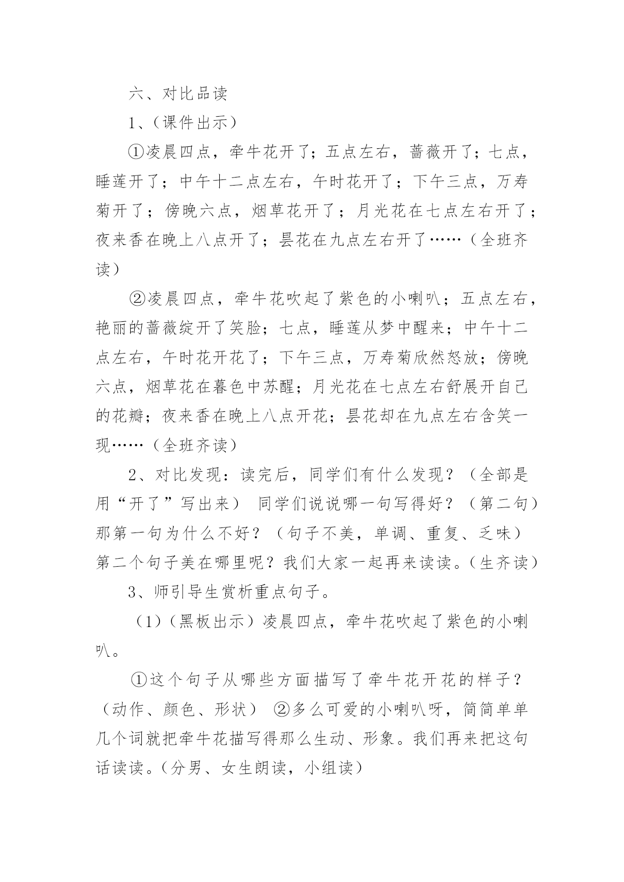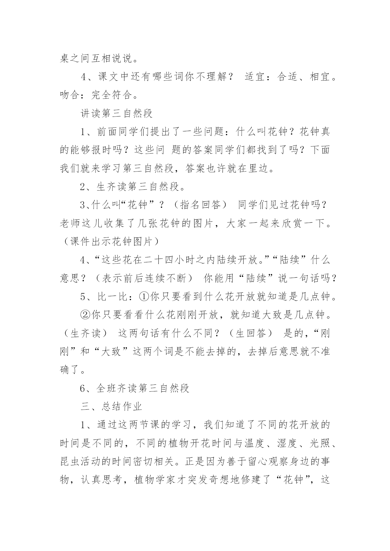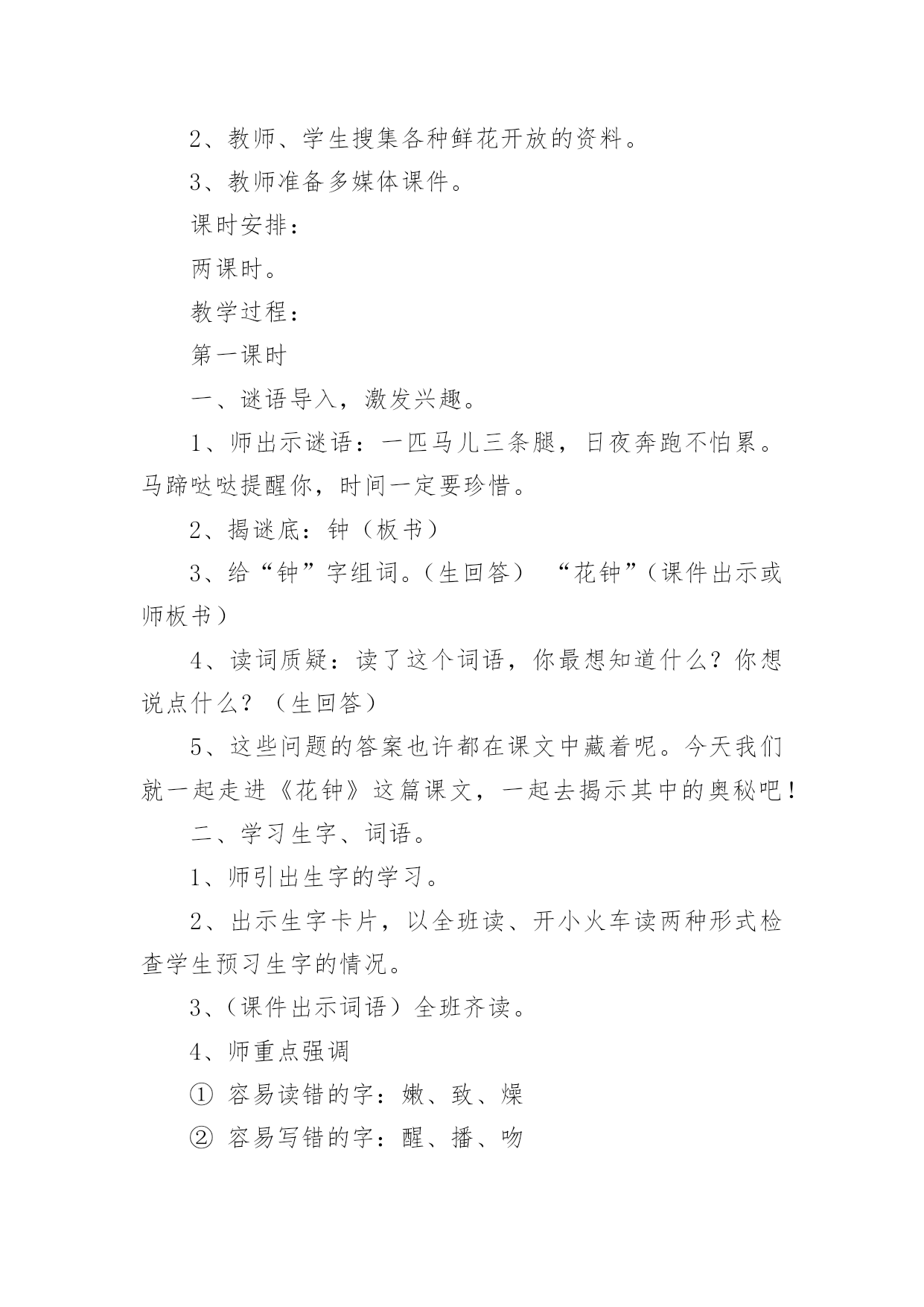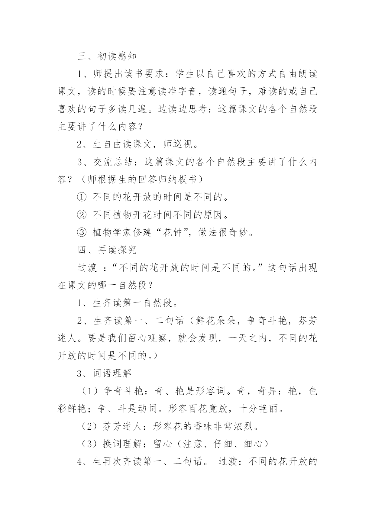 花钟教学设计花钟教学设计在教学工作者实际的教学活动中,时常需要准备好教学设计,借助教学设计可以提高教学效率和教学质量。那么教学设计应该怎么写才合适呢?下面是小编整理的花钟教学设计,希望对大家有所帮助。花钟教学设计1教学目标:1、会认“怒”等8个生字,会写“斗”“艳”等14个生字,正确读写“争奇斗艳”等词语。2、正确、流利地朗读课文,结合语境理解词语,并用欣赏的心情朗读和背诵自己喜欢的部分。3、读懂课文内容,初步培养学生留心观察周围事物的习惯。4、学习运用多样的句式表达。教学重点:正确、流利地朗读课文,结合语境理解、品味词语。教学难点:在理解课文内容的基础上,理解不同的表达句式。课前准备:1、生字卡片。2、教师、学生搜集各种鲜花开放的资料。3、教师准备多媒体课件。课时安排:两课时。教学过程:第一课时一、谜语导入,激发兴趣。1、师出示谜语:一匹马儿三条腿,日夜奔跑不怕累。马蹄哒哒提醒你,时间一定要珍惜。2、揭谜底:钟(板书)3、给“钟”字组词。(生回答)“花钟”(课件出示或师板书)4、读词质疑:读了这个词语,你最想知道什么?你想说点什么?(生回答)5、这些问题的答案也许都在课文中藏着呢。今天我们就一起走进《花钟》这篇课文,一起去揭示其中的奥秘吧!二、学习生字、词语。1、师引出生字的学习。2、出示生字卡片,以全班读、开小火车读两种形式检查学生预习生字的情况。3、(课件出示词语)全班齐读。4、师重点强调①容易读错的字:嫩、致、燥②容易写错的字:醒、播、吻三、初读感知1、师提出读书要求:学生以自己喜欢的方式自由朗读课文,读的时候要注意读准字音,读通句子,难读的或自己喜欢的句子多读几遍。边读边思考:这篇课文的各个自然段主要讲了什么内容?2、生自由读课文,师巡视。3、交流总结:这篇课文的各个自然段主要讲了什么内容?(师根据生的回答归纳板书)①不同的花开放的时间是不同的。②不同植物开花时间不同的原因。③植物学家修建“花钟”,做法很奇妙。四、再读探究过渡:“不同的花开放的时间是不同的。”这句话出现在课文的哪一自然段?1、生齐读第一自然段。2、生齐读第一、二句话(鲜花朵朵,争奇斗艳,芬芳迷人。要是我们留心观察,就会发现,一天之内,不同的花开放的时间是不同的。)3、词语理解(1)争奇斗艳:奇、艳是形容词。奇,奇异;艳,色彩鲜艳;争、斗是动词。形容百花竟放,十分艳丽。(2)芬芳迷人:形容花的香味非常浓烈。(3)换词理解:留心(注意、仔细、细心)4、生再次齐读第一、二句话。过渡:不同的花开放的时间是不同的,怎么不同呢?课文的哪些地方说了?找出来读一读。(生齐读:凌晨四点,牵牛花吹起了紫色的小喇叭……含笑一现……)5、这一自然段向我们介绍了哪些花呢?它们分别是什么时候开放的?在文中用笔画出花的名称和花开放的时间的词语。6、一天之内,仅仅只有这几种花开放吗?(不是)你是从哪里看出来的?(省略号)教师补充不同的花开放时间不同的资料:如凌晨五点左右,蒲公英开花;上午十点左右,半支莲开花;下午五点左右,紫茉莉开花……大自然还有许多奥秘等待着我们去发现,只要你留心观察就会有很多的收获。生课后可查找相关花开放时间的资料。五、细读品味(课件出示九种花的图片)这么多花竟相开放,真是美不胜收。你喜欢哪一种花呢?选择自己最喜欢的一种花所在的句子读一读。(指名读)师指导生品读重点句子。1、(课件出示)凌晨四点,牵牛花吹起了紫色的小喇叭。(一生读句子,师可相机点拨。)(1)谁能把小喇叭吹得更响亮?(该生再读或另一生读)(2)师范读。同学们都读得很不错,老师也想来试一试。听了老师的朗读,你是否仿佛听到了小喇叭响亮地吹起来了?来,全班的小喇叭一起吹起来。(全班齐读句子)2、(课件出示)五点左右,艳丽的蔷薇绽开了笑脸。(1)抓住“绽开了笑脸”来体会蔷薇的美。(2)喜欢这个句子的同学一起站起来读一读。3、(课件出示)下午三点,万寿菊欣然怒放。(1)抓住“欣然怒放”来体会万寿菊开得多、旺。(2)你知道万寿菊欣然怒放的样子是怎样的吗?(像礼花绽放,愉快的,迫不及待的)(3)同学们看见过烟花吗?万寿菊开放的样子就像我们过节时放的烟花一样,突然向外爆开来,五彩缤纷,非常美丽。当你看到绽放的烟花时,你的心情是怎样的?带着这样的感受来读读这句话。(指名读)(4)看,一朵万寿菊开了,两朵万寿菊开了,三朵万寿菊开了,百朵,千朵万寿菊开了。多美呀。我们大家一起来再读一读。(齐读)4、(课件出示)昙花却在九点左右含笑一现……(1)抓住“含笑一现”来体味“昙花一现”的美。读出不同的感受。(2)谁来读读这个句子。(指名读)你来说说,你为什么要这样读这个句子?(因为昙花开花的时间很短,没多久就凋谢了,所以我读的速度就快些,我想快些把昙花的美留在脑海里)(3)谁还有不同的感受?(生读)你为什么要这样读呢?(因
