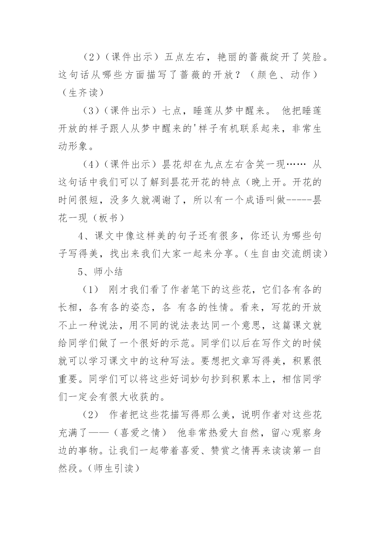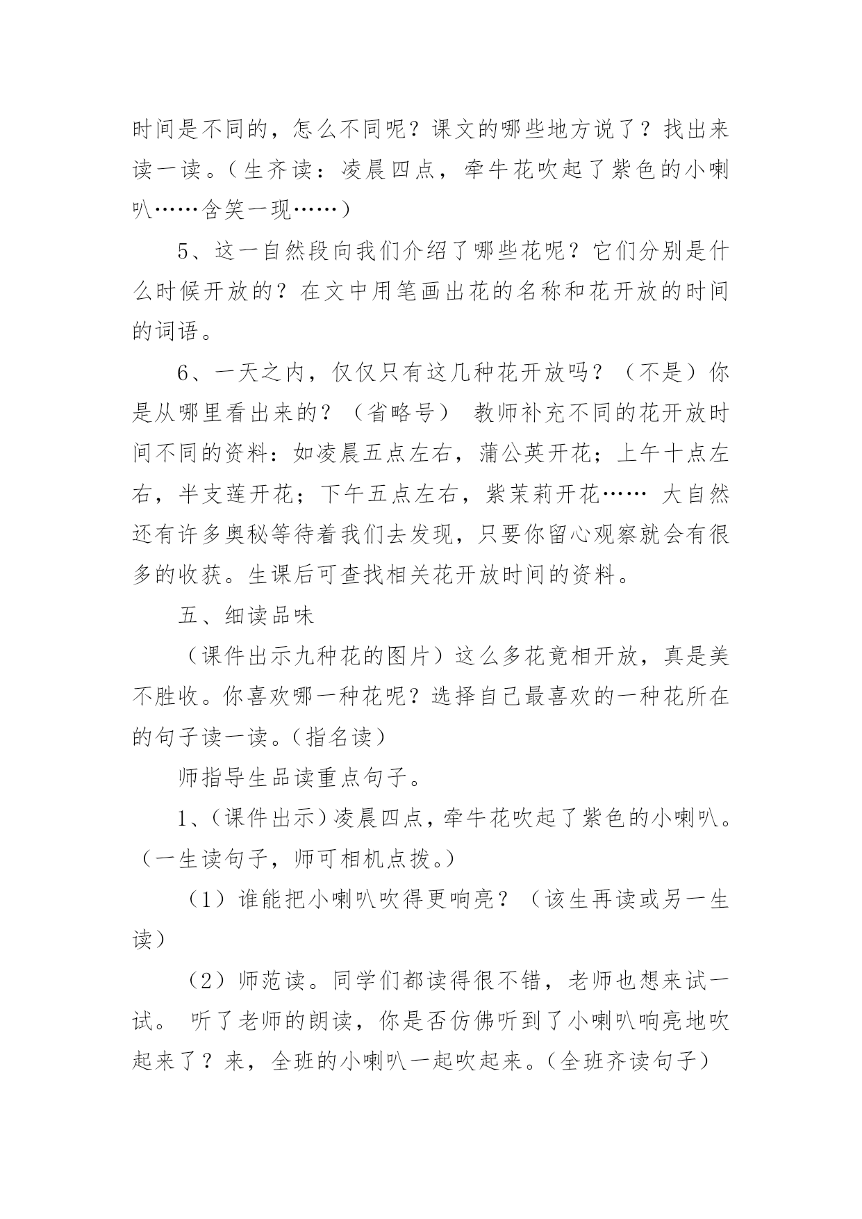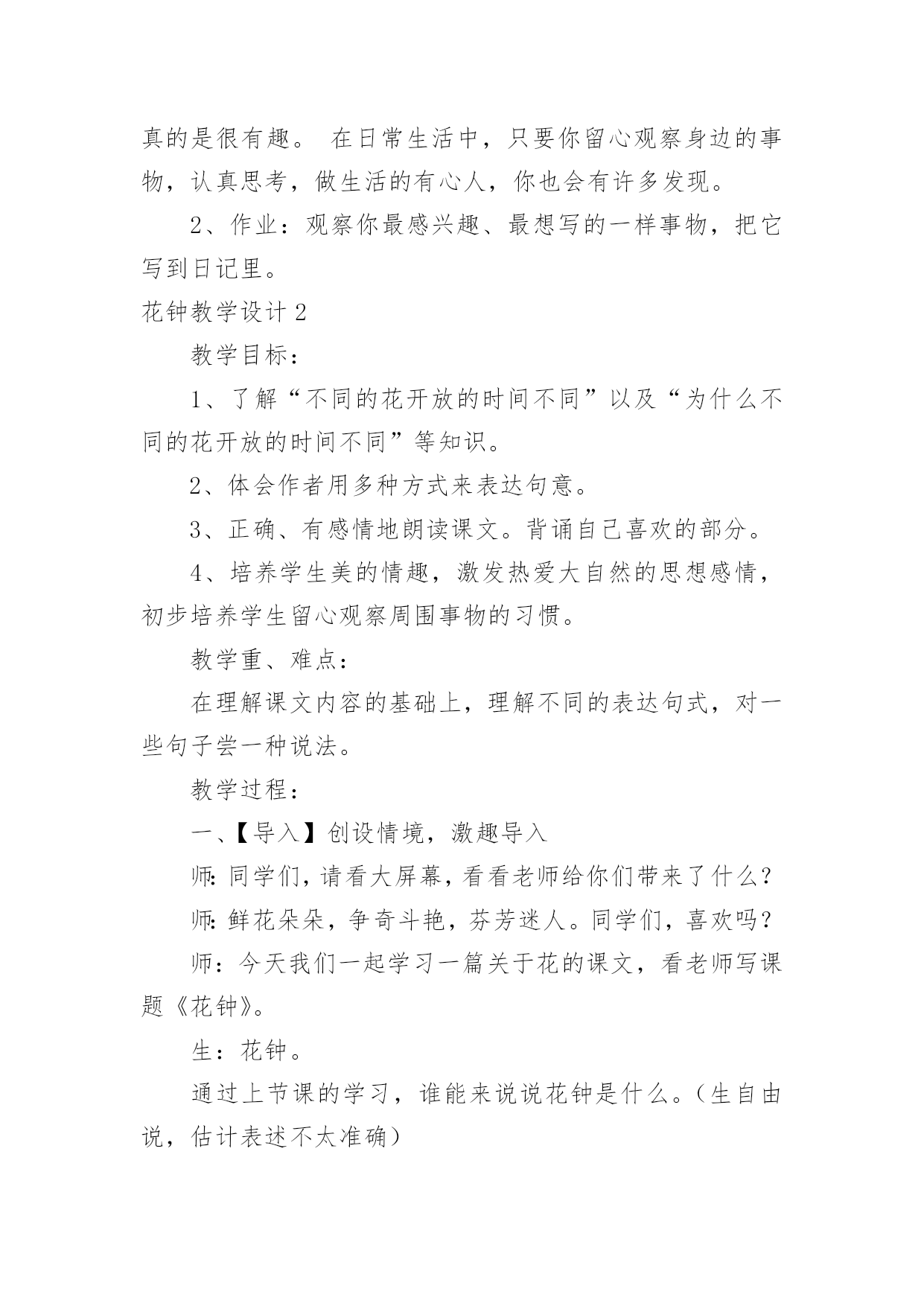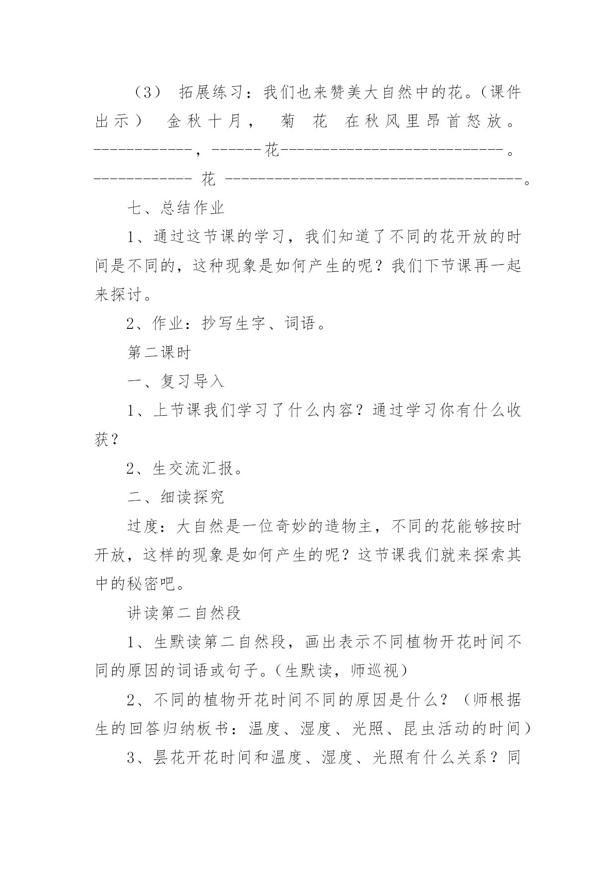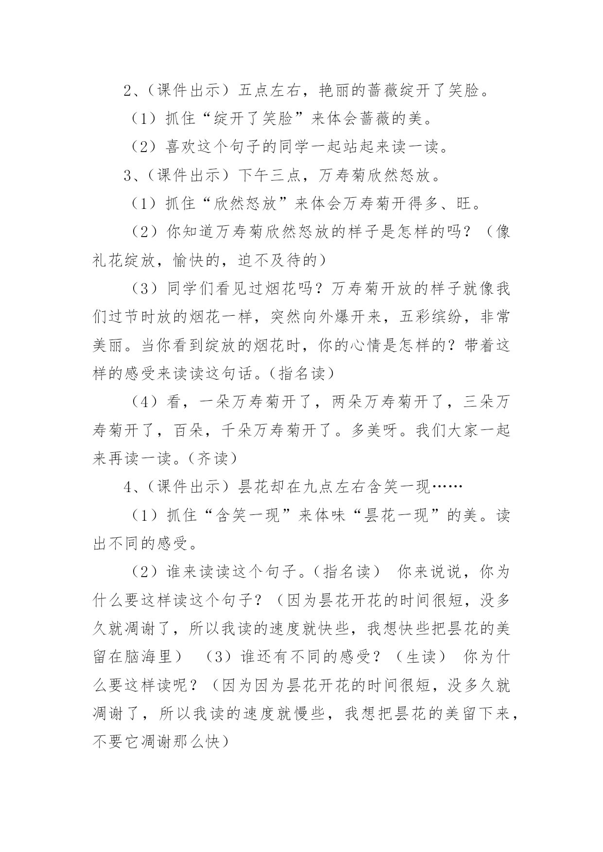花钟教学设计花钟教学设计在教学工作者实际的教学活动中,时常需要准备好教学设计,借助教学设计可以提高教学效率和教学质量。那么教学设计应该怎么写才合适呢?下面是小编整理的花钟教学设计,希望对大家有所帮助。花钟教学设计1教学目标:1、会认“怒”等8个生字,会写“斗”“艳”等14个生字,正确读写“争奇斗艳”等词语。2、正确、流利地朗读课文,结合语境理解词语,并用欣赏的心情朗读和背诵自己喜欢的部分。3、读懂课文内容,初步培养学生留心观察周围事物的习惯。4、学习运用多样的句式表达。教学重点:正确、流利地朗读课文,结合语境理解、品味词语。教学难点:在理解课文内容的基础上,理解不同的表达句式。课前准备:1、生字卡片。2、教师、学生搜集各种鲜花开放的资料。3、教师准备多媒体课件。课时安排:两课时。教学过程:第一课时一、谜语导入,激发兴趣。1、师出示谜语:一匹马儿三条腿,日夜奔跑不怕累。马蹄哒哒提醒你,时间一定要珍惜。2、揭谜底:钟(板书)3、给“钟”字组词。(生回答)“花钟”(课件出示或师板书)4、读词质疑:读了这个词语,你最想知道什么?你想说点什么?(生回答)5、这些问题的答案也许都在课文中藏着呢。今天我们就一起走进《花钟》这篇课文,一起去揭示其中的奥秘吧!二、学习生字、词语。1、师引出生字的学习。2、出示生字卡片,以全班读、开小火车读两种形式检查学生预习生字的情况。3、(课件出示词语)全班齐读。4、师重点强调①容易读错的字:嫩、致、燥②容易写错的字:醒、播、吻三、初读感知1、师提出读书要求:学生以自己喜欢的方式自由朗读课文,读的时候要注意读准字音,读通句子,难读的或自己喜欢的句子多读几遍。边读边思考:这篇课文的各个自然段主要讲了什么内容?2、生自由读课文,师巡视。3、交流总结:这篇课文的各个自然段主要讲了什么内容?(师根据生的回答归纳板书)①不同的花开放的时间是不同的。②不同植物开花时间不同的原因。③植物学家修建“花钟”,做法很奇妙。四、再读探究过渡:“不同的花开放的时间是不同的。”这句话出现在课文的哪一自然段?1、生齐读第一自然段。2、生齐读第一、二句话(鲜花朵朵,争奇斗艳,芬芳迷人。要是我们留心观察,就会发现,一天之内,不同的花开放的时间是不同的。)3、词语理解(1)争奇斗艳:奇、艳是形容词。奇,奇异;艳,色彩鲜艳;争、斗是动词。形容百花竟放,十分艳丽。(2)芬芳迷人:形容花的香味非常浓烈。(3)换词理解:留心(注意、仔细、细心)4、生再次齐读第一、二句话。过渡:不同的花开放的时间是不同的,怎么不同呢?课文的哪些地方说了?找出来读一读。(生齐读:凌晨四点,牵牛花吹起了紫色的小喇叭……含笑一现……)5、这一自然段向我们介绍了哪些花呢?它们分别是什么时候开放的?在文中用笔画出花的名称和花开放的时间的词语。6、一天之内,仅仅只有这几种花开放吗?(不是)你是从哪里看出来的?(省略号)教师补充不同的花开放时间不同的资料:如凌晨五点左右,蒲公英开花;上午十点左右,半支莲开花;下午五点左右,紫茉莉开花……大自然还有许多奥秘等待着我们去发现,只要你留心观察就会有很多的收获。生课后可查找相关花开放时间的资料。五、细读品味(课件出示九种花的图片)这么多花竟相开放,真是美不胜收。你喜欢哪一种花呢?选择自己最喜欢的一种花所在的句子读一读。(指名读)师指导生品读重点句子。1、(课件出示)凌晨四点,牵牛花吹起了紫色的小喇叭。(一生读句子,师可相机点拨。)(1)谁能把小喇叭吹得更响亮?(该生再读或另一生读)(2)师范读。同学们都读得很不错,老师也想来试一试。听了老师的朗读,你是否仿佛听到了小喇叭响亮地吹起来了?来,全班的小喇叭一起吹起来。(全班齐读句子)2、(课件出示)五点左右,艳丽的蔷薇绽开了笑脸。(1)抓住“绽开了笑脸”来体会蔷薇的美。(2)喜欢这个句子的同学一起站起来读一读。3、(课件出示)下午三点,万寿菊欣然怒放。(1)抓住“欣然怒放”来体会万寿菊开得多、旺。(2)你知道万寿菊欣然怒放的样子是怎样的吗?(像礼花绽放,愉快的,迫不及待的)(3)同学们看见过烟花吗?万寿菊开放的样子就像我们过节时放的烟花一样,突然向外爆开来,五彩缤纷,非常美丽。当你看到绽放的烟花时,你的心情是怎样的?带着这样的感受来读读这句话。(指名读)(4)看,一朵万寿菊开了,两朵万寿菊开了,三朵万寿菊开了,百朵,千朵万寿菊开了。多美呀。我们大家一起来再读一读。(齐读)4、(课件出示)昙花却在九点左右含笑一现……(1)抓住“含笑一现”来体味“昙花一现”的美。读出不同的感受。(2)谁来读读这个句子。(指名读)你来说说,你为什么要这样读这个句子?(因为昙花开花的时间很短,没多久就凋谢了,所以我读的速度就快些,我想快些把昙花的美留在脑海里)(3)谁还有不同的感受?(生读)你为什么要这样读呢?(因
