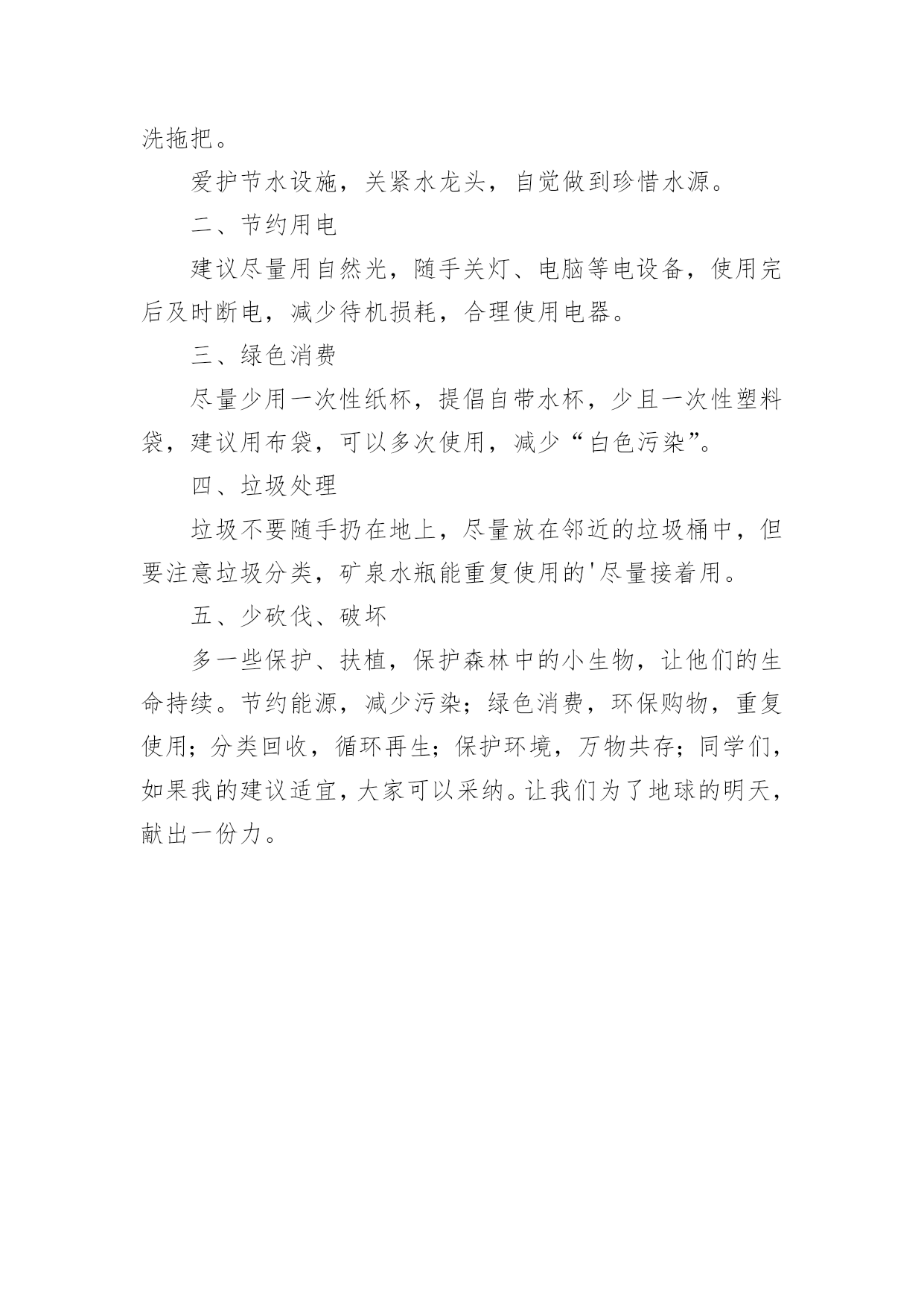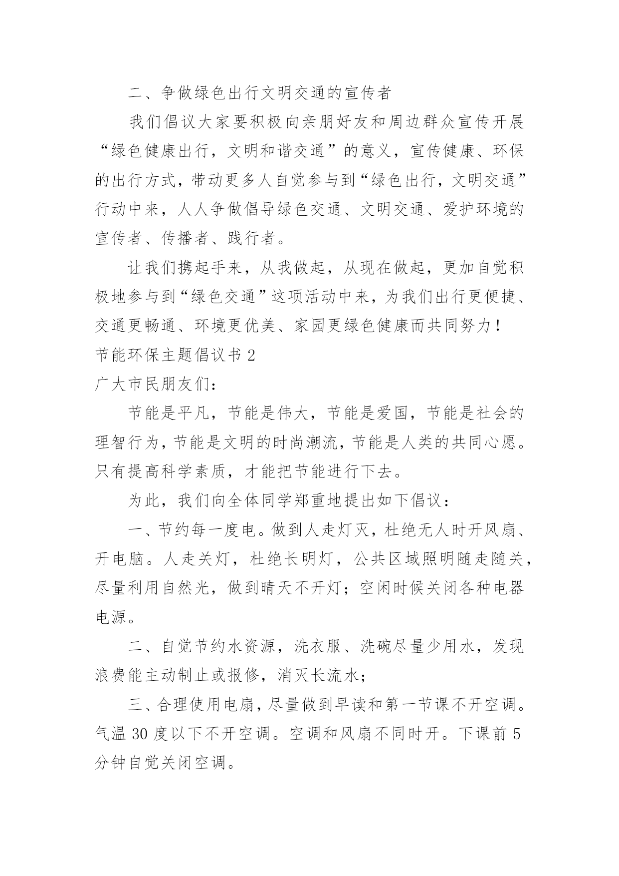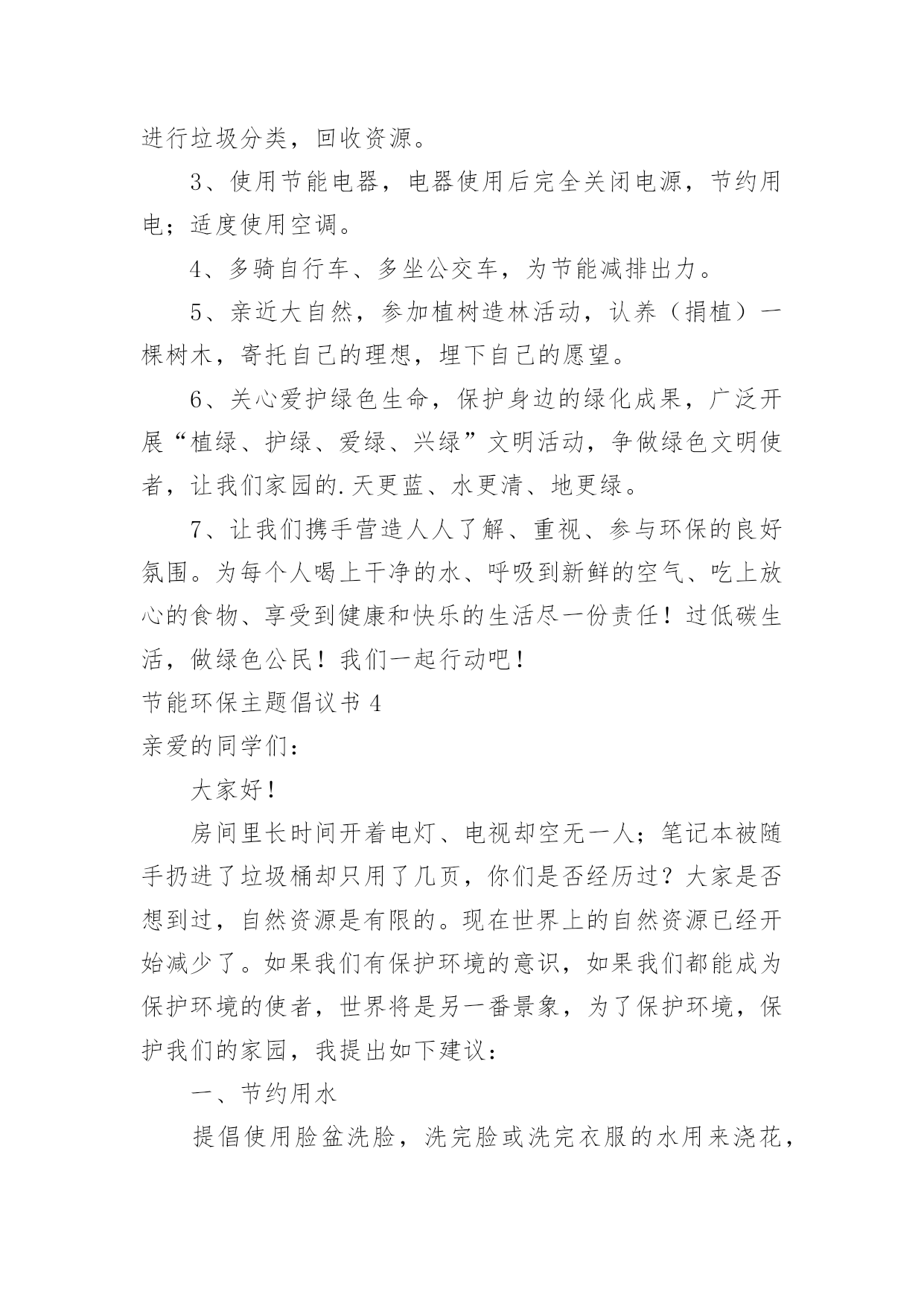 节能环保主题倡议书节能环保主题倡议书在现实社会中,越来越多人会去使用倡议书,通过倡议书倡议者可以更好地申明发布倡议的目的。如何写一份恰当的倡议书呢?以下是小编为大家收集的节能环保主题倡议书,希望能够帮助到大家。节能环保主题倡议书1全市交通运输系统的干部职工:低碳生活、绿色出行,减少碳排放是节能、环保、绿色、生态、健康的一种生活方式,是改善我们的生活环境,享受美好人生的`一种愿望。为了我们临汾更加靓丽,为了我们生活更加幸福、环境更加美好,我们向全市交通运输系统干部职工提出倡议:一、争做绿色出行文明交通的践行者我们倡议大家乘坐公共交通工具,或选用自行车、步行等绿色方式出行,形成“能走不骑,能骑不坐,能坐不开”的出行理念,尽量减少摩托车、小汽车的使用,要把步行和骑自行车出行作为缓解交通压力、促进节能减排、保护环境、强身健体的有效行动。若是要开车出行,大家要选择正规加油站品质好的国五标准汽油,坚决杜绝廉价劣质汽油对大气造成的污染。二、争做绿色出行文明交通的宣传者我们倡议大家要积极向亲朋好友和周边群众宣传开展“绿色健康出行,文明和谐交通”的意义,宣传健康、环保的出行方式,带动更多人自觉参与到“绿色出行,文明交通”行动中来,人人争做倡导绿色交通、文明交通、爱护环境的宣传者、传播者、践行者。让我们携起手来,从我做起,从现在做起,更加自觉积极地参与到“绿色交通”这项活动中来,为我们出行更便捷、交通更畅通、环境更优美、家园更绿色健康而共同努力!节能环保主题倡议书2广大市民朋友们:节能是平凡,节能是伟大,节能是爱国,节能是社会的理智行为,节能是文明的时尚潮流,节能是人类的共同心愿。只有提高科学素质,才能把节能进行下去。为此,我们向全体同学郑重地提出如下倡议:一、节约每一度电。做到人走灯灭,杜绝无人时开风扇、开电脑。人走关灯,杜绝长明灯,公共区域照明随走随关,尽量利用自然光,做到晴天不开灯;空闲时候关闭各种电器电源。二、自觉节约水资源,洗衣服、洗碗尽量少用水,发现浪费能主动制止或报修,消灭长流水;三、合理使用电扇,尽量做到早读和第一节课不开空调。气温30度以下不开空调。空调和风扇不同时开。下课前5分钟自觉关闭空调。四、要求节约每一张纸。要求学生将用过的'试卷、讲义装订一起,背面作草稿所用,既防止乱扔废纸,污染环境,又培养了学生节俭意识。学校打印纸要求双面使用。五、多走楼梯,老师少乘电梯,学生不乘电梯。强身健体又节能;六、回收废旧物品及各种可回收的物品,电池要集中到电池回收箱处回收。七、节约每一斤粮食。、教育学生“一粒米,一分钱当思来之不易”‘吃饭定时定量,不“看菜吃饭”不剩饭。八、相互督促,节能光荣。“成由勤俭败由奢”,节能是每个人对社会所作的贡献。请您从我做起,从身边做起,节约能源、保护环境。节能环保主题倡议书3广大市民们:地球气候变暖已日益成为危及人类生存的严重问题。频繁发生的灾害性气候所引发的泥石流、暴风雨雪、不断上升的海平面、逐渐消逝的冰川、洪水、干旱……已经给人类生存带来了巨大的威胁。面对同一片蓝天、身处同一个地球,我们每个人都有责任去保护环境和拯救地球。为此,我们向市民们发出“关爱地球、还我绿色”的倡议,倡导大家树立低碳理念,创造绿色家园。从现在开始:1、购买简单包装的商品,选购绿色产品、绿色食物,倡导绿色消费。2、少用一次性制品(木筷、纸杯、纸巾等),减少垃圾,进行垃圾分类,回收资源。3、使用节能电器,电器使用后完全关闭电源,节约用电;适度使用空调。4、多骑自行车、多坐公交车,为节能减排出力。5、亲近大自然,参加植树造林活动,认养(捐植)一棵树木,寄托自己的理想,埋下自己的愿望。6、关心爱护绿色生命,保护身边的绿化成果,广泛开展“植绿、护绿、爱绿、兴绿”文明活动,争做绿色文明使者,让我们家园的.天更蓝、水更清、地更绿。7、让我们携手营造人人了解、重视、参与环保的良好氛围。为每个人喝上干净的水、呼吸到新鲜的空气、吃上放心的食物、享受到健康和快乐的生活尽一份责任!过低碳生活,做绿色公民!我们一起行动吧!节能环保主题倡议书4亲爱的同学们:大家好!房间里长时间开着电灯、电视却空无一人;笔记本被随手扔进了垃圾桶却只用了几页,你们是否经历过?大家是否想到过,自然资源是有限的。现在世界上的自然资源已经开始减少了。如果我们有保护环境的意识,如果我们都能成为保护环境的使者,世界将是另一番景象,为了保护环境,保护我们的家园,我提出如下建议:一、节约用水提倡使用脸盆洗脸,洗完脸或洗完衣服的水用来浇花,洗拖把。爱护节水设施,关紧水龙头,自觉做到珍惜水源。二、节约用电建议尽量用自然光,随手关灯、电脑等电设备,使用完后及时断电,减少待机损耗,合理使用电器。三、绿色消费尽量少用一次性纸杯,提倡自带水杯,少且一次性塑料袋,建议用布袋,可以多次使用,减少“白色污染