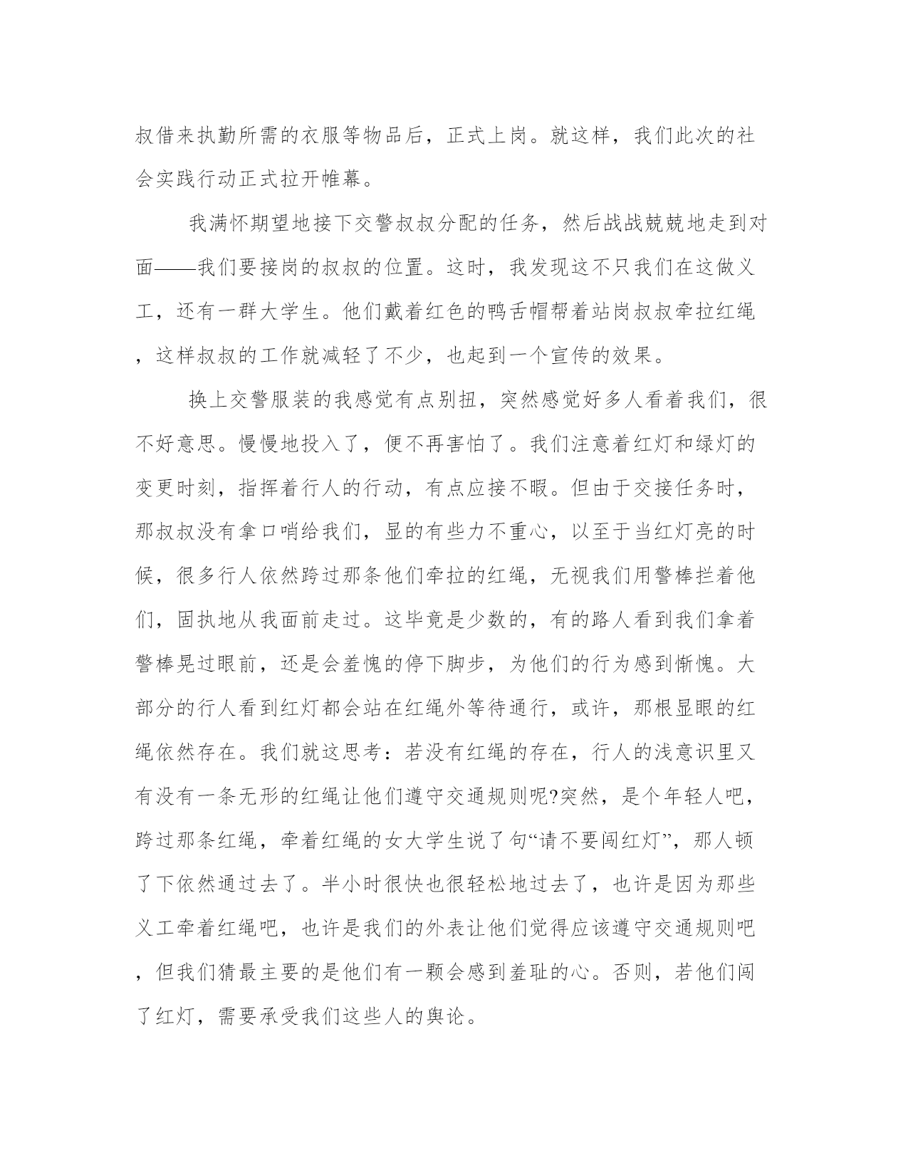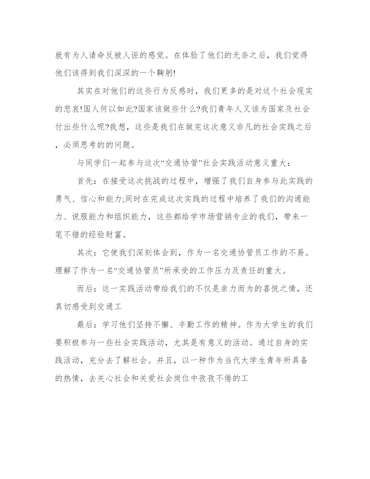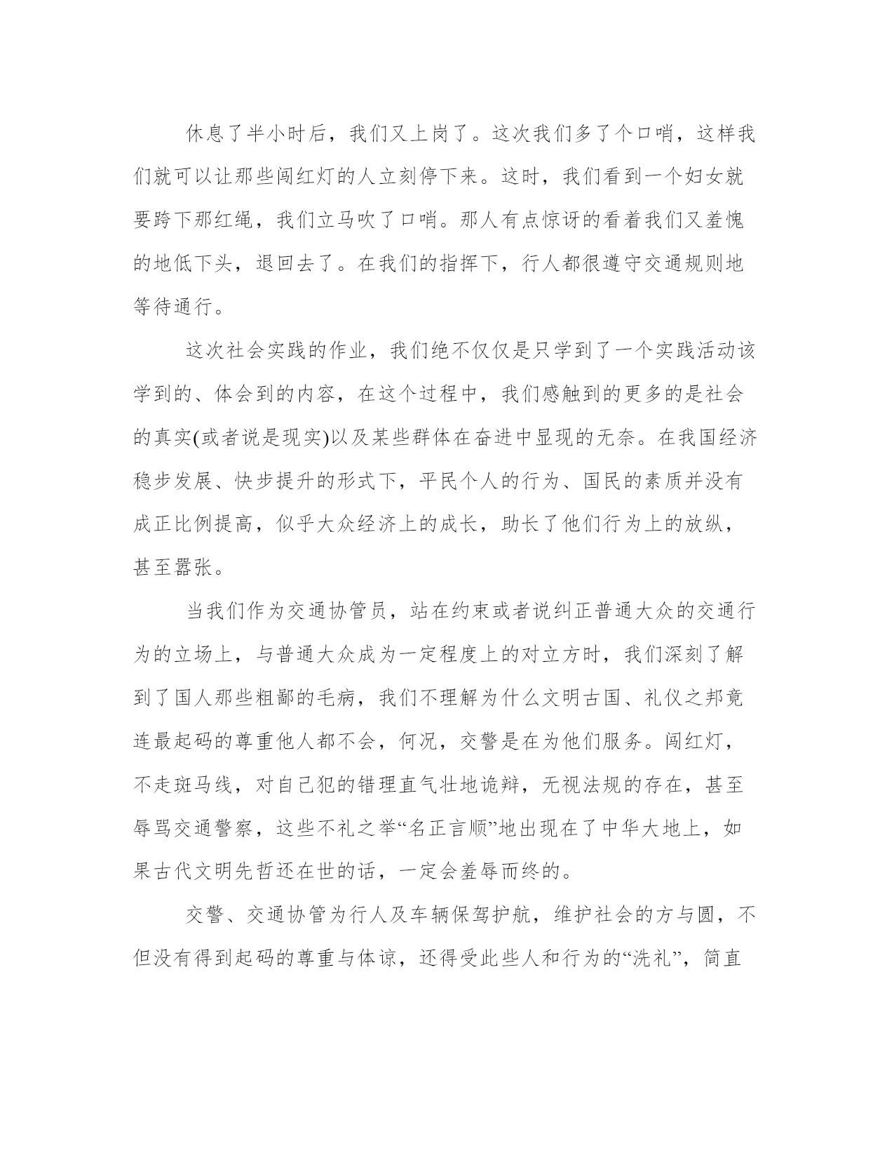 关于交通协管的社会实践报告我们此行的目的主要有以下几个方面:1、认真、优秀的完成老师给我们布置的任务。2走进交警生活,体验交警生活,体验人民交警工作的艰辛。3提升自己的责任心,是自己明白无论做什么事情都应该尽职尽责,不可大意。4积极的培养作为一名当代大学生的敢于吃苦、能够吃苦的精神,是自己能够在以后的人生中不畏艰难、努力学习、勤恳工作,为我们的国家建设贡献一份作为一名青年人应该贡献的力量。下面介绍一下我们此次社会实践的全过程:XX年4月24日,星期六,我们一行五人早早起床,带齐我们的物品,吃过早饭,乘坐220公交车赶往市区,进行社会实践,此时,我们内心早已兴奋不已,我们的心情如阳光一样明媚、灿烂,因为,我们每个人都知道,我们要做的是一件有挑战性的事情,是一件很有意义的事情!到了市区之后我们找到一位交警---张警官,向他说明了我们的来意之后,他很高兴也很欢迎我们做一次交通协管员。他将我们分成两个小组:肖玉红、彭秀文和我为一小组,在中山路路口执勤,姜慧芬、宋栋林为一小组,在沃尔玛超市街口执勤,在我们向正在执勤的叔叔借来执勤所需的衣服等物品后,正式上岗。就这样,我们此次的社会实践行动正式拉开帷幕。我满怀期望地接下交警叔叔分配的任务,然后战战兢兢地走到对面——我们要接岗的叔叔的位置。这时,我发现这不只我们在这做义工,还有一群大学生。他们戴着红色的鸭舌帽帮着站岗叔叔牵拉红绳,这样叔叔的工作就减轻了不少,也起到一个宣传的效果。换上交警服装的我感觉有点别扭,突然感觉好多人看着我们,很不好意思。慢慢地投入了,便不再害怕了。我们注意着红灯和绿灯的变更时刻,指挥着行人的行动,有点应接不暇。但由于交接任务时,那叔叔没有拿口哨给我们,显的有些力不重心,以至于当红灯亮的时候,很多行人依然跨过那条他们牵拉的红绳,无视我们用警棒拦着他们,固执地从我面前走过。这毕竟是少数的,有的路人看到我们拿着警棒晃过眼前,还是会羞愧的停下脚步,为他们的行为感到惭愧。大部分的行人看到红灯都会站在红绳外等待通行,或许,那根显眼的红绳依然存在。我们就这思考:若没有红绳的存在,行人的浅意识里又有没有一条无形的红绳让他们遵守交通规则呢?突然,是个年轻人吧,跨过那条红绳,牵着红绳的女大学生说了句“请不要闯红灯”,那人顿了下依然通过去了。半小时很快也很轻松地过去了,也许是因为那些义工牵着红绳吧,也许是我们的外表让他们觉得应该遵守交通规则吧,但我们猜最主要的是他们有一颗会感到羞耻的心。否则,若他们闯了红灯,需要承受我们这些人的舆论。休息了半小时后,我们又上岗了。这次我们多了个口哨,这样我们就可以让那些闯红灯的人立刻停下来。这时,我们看到一个妇女就要跨下那红绳,我们立马吹了口哨。那人有点惊讶的看着我们又羞愧的地低下头,退回去了。在我们的指挥下,行人都很遵守交通规则地等待通行。这次社会实践的作业,我们绝不仅仅是只学到了一个实践活动该学到的、体会到的内容,在这个过程中,我们感触到的更多的是社会的真实(或者说是现实)以及某些群体在奋进中显现的无奈。在我国经济稳步发展、快步提升的形式下,平民个人的行为、国民的素质并没有成正比例提高,似乎大众经济上的成长,助长了他们行为上的放纵,甚至嚣张。当我们作为交通协管员,站在约束或者说纠正普通大众的交通行为的立场上,与普通大众成为一定程度上的对立方时,我们深刻了解到了国人那些粗鄙的毛病,我们不理解为什么文明古国、礼仪之邦竟连最起码的尊重他人都不会,何况,交警是在为他们服务。闯红灯,不走斑马线,对自己犯的错理直气壮地诡辩,无视法规的存在,甚至辱骂交通警察,这些不礼之举“名正言顺”地出现在了中华大地上,如果古代文明先哲还在世的话,一定会羞辱而终的。交警、交通协管为行人及车辆保驾护航,维护社会的方与圆,不但没有得到起码的尊重与体谅,还得受此些人和行为的“洗礼”,简直就有为人请命反被人诬的感觉。在体验了他们的无奈之后,我们觉得他们该得到我们深深的一个鞠躬!其实在对他们的这些行为反感时,我们更多的是对这个社会现实的悲哀!国人何以如此?国家该做些什么?我们青年人又该为国家及社会付出些什么呢?我想,这些是我们在做完这次意义非凡的社会实践之后,必须思考的的问题。与同学们一起参与这次“交通协管”社会实践活动意义重大:首先:在接受这次挑战的过程中,增强了我们自身参与此实践的勇气、信心和能力;同时在完成这次实践的过程中培养了我们的沟通能力、说服能力和组织能力,这些都给学市场营销专业的我们,带来一笔不错的经验财富。其次:它使我们深刻体会到,作为一名交通协管员工作的不易。理解了作为一名“交通协管员”所承受的工作压力及责任的重大。而后:这一实践活动带给我们的不仅是亲力而为的喜悦之情,还真切感受到交通工最后:学习他们坚持不懈、辛勤工作的精神。作为大
